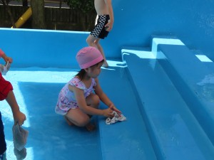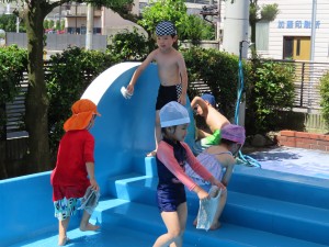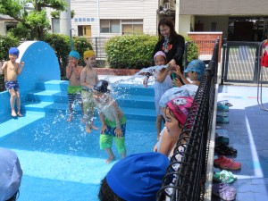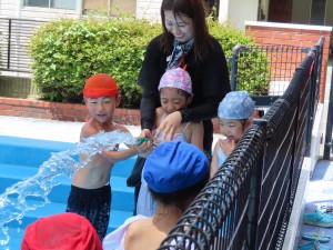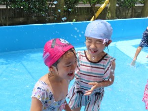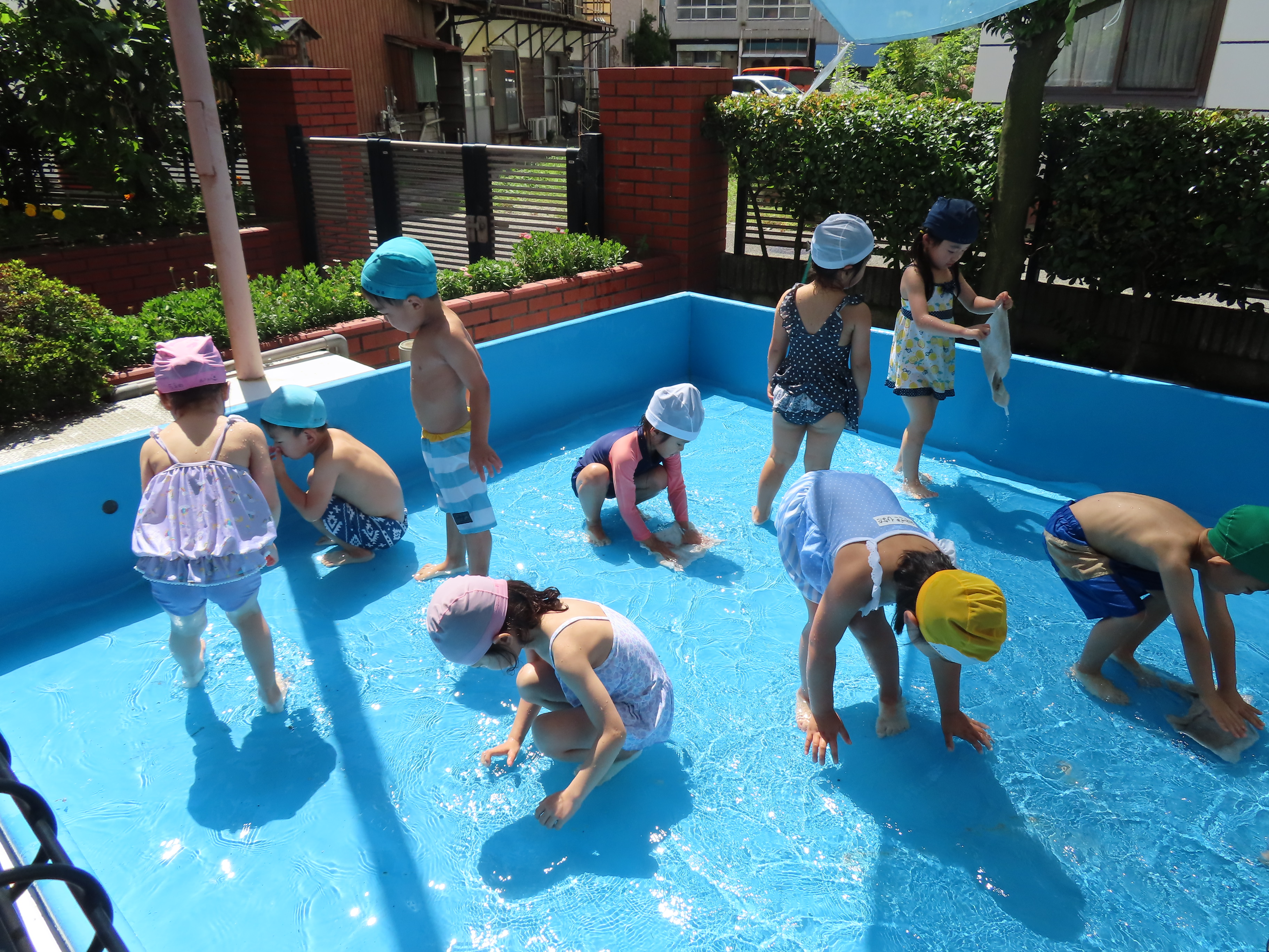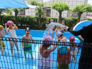 さあ!!始まりました!!プール遊び!!プールをみんなできれいにしてから、水遊びを楽しむ予定でしたが、いつのまにか、水遊びに夢中なひまわり組さんたちでした(笑)水がかかると、キャーキャーと大はしゃぎ♪この夏も安全第一で、思いっきり満喫したいと思います。