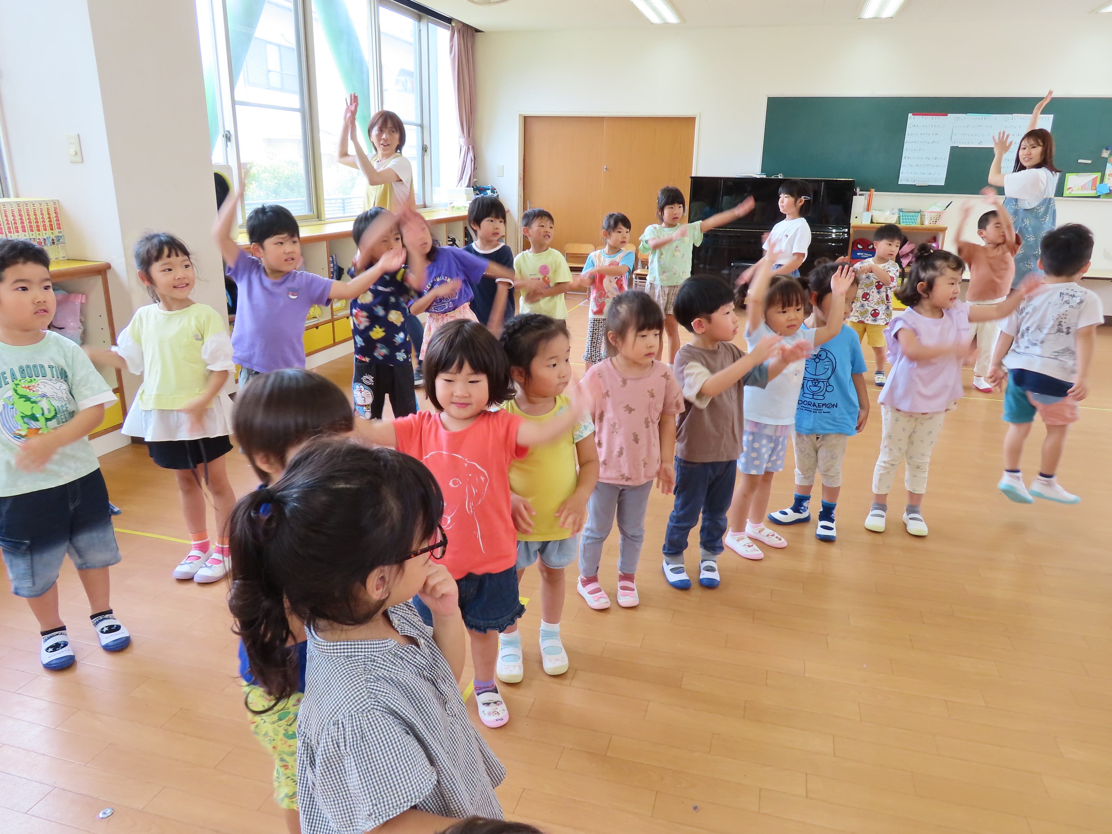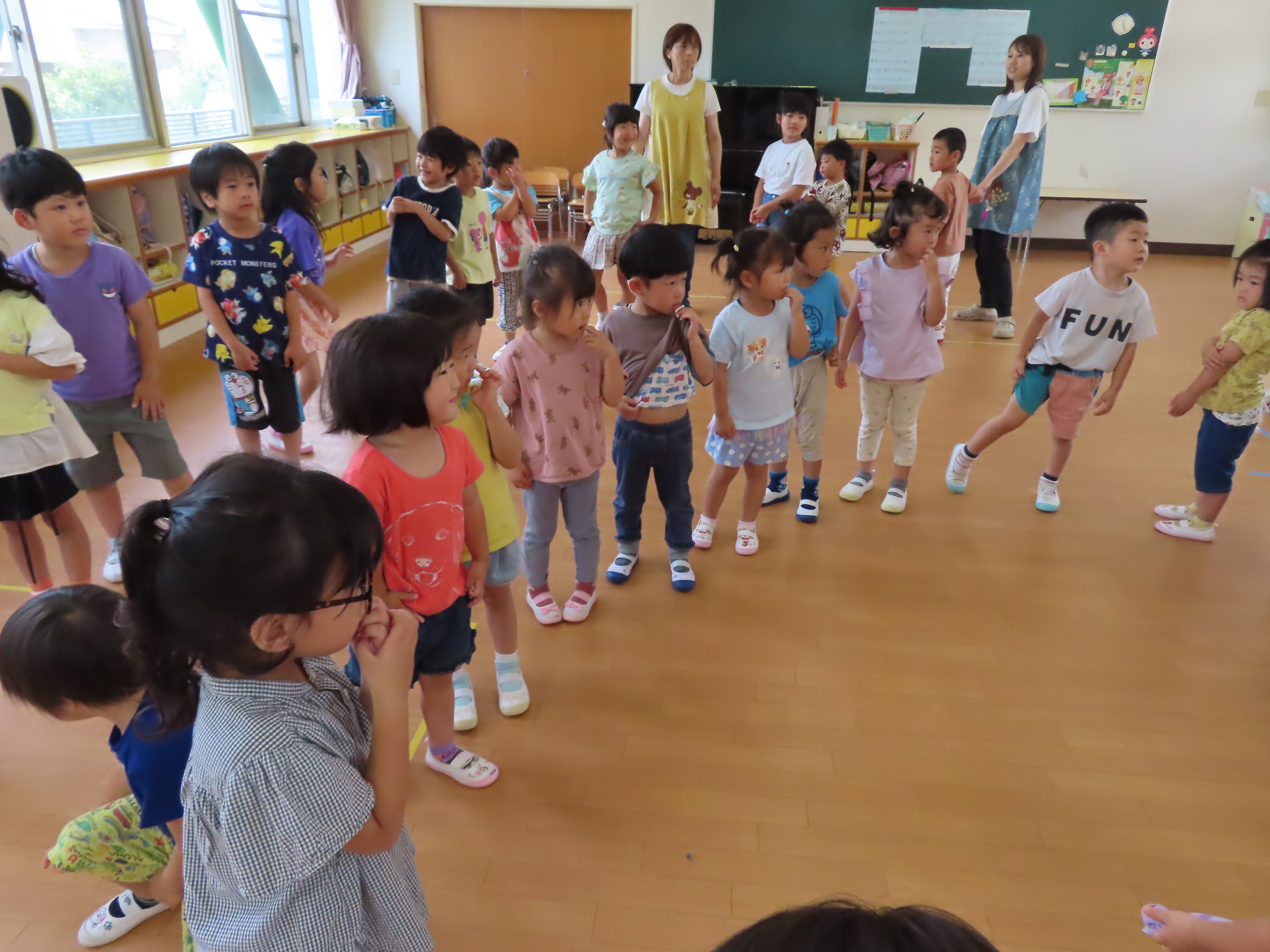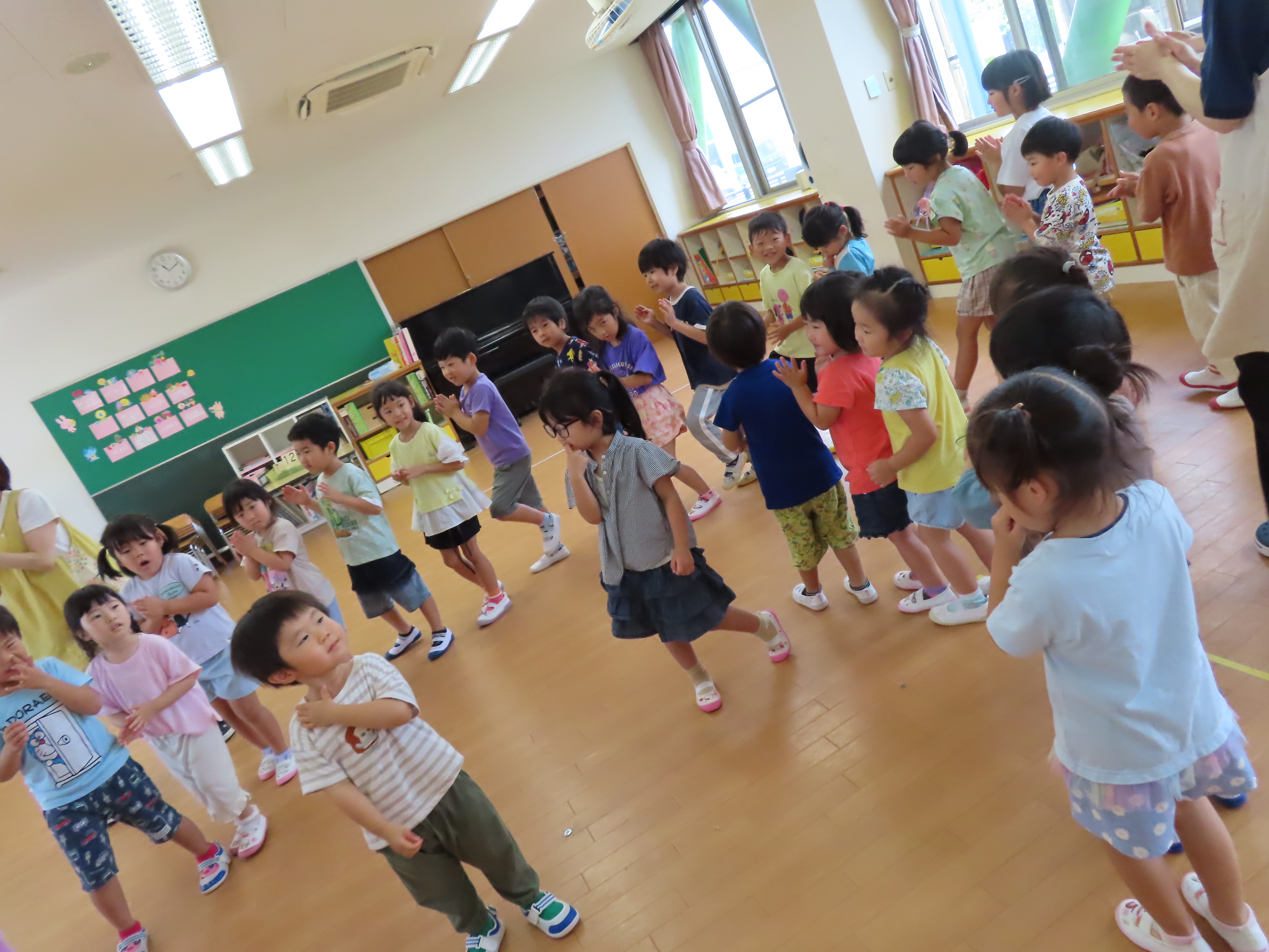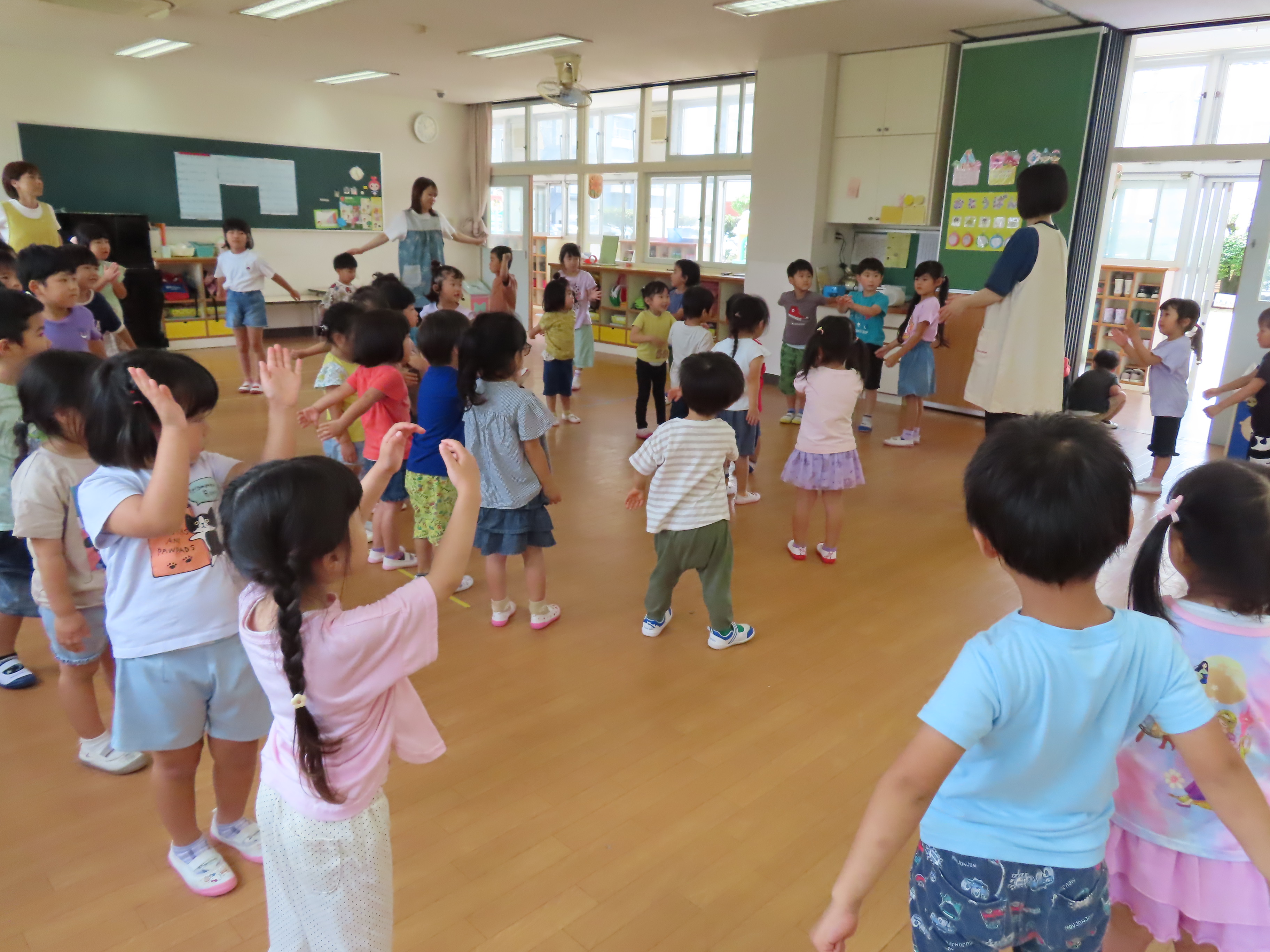 幼児クラスで、盆踊りの練習中~(*^_^*) 『ドラえもん音頭』の曲で盆踊りを楽しんでいます。保育士を真似ながら練習中! 少しずつ上達しています!!