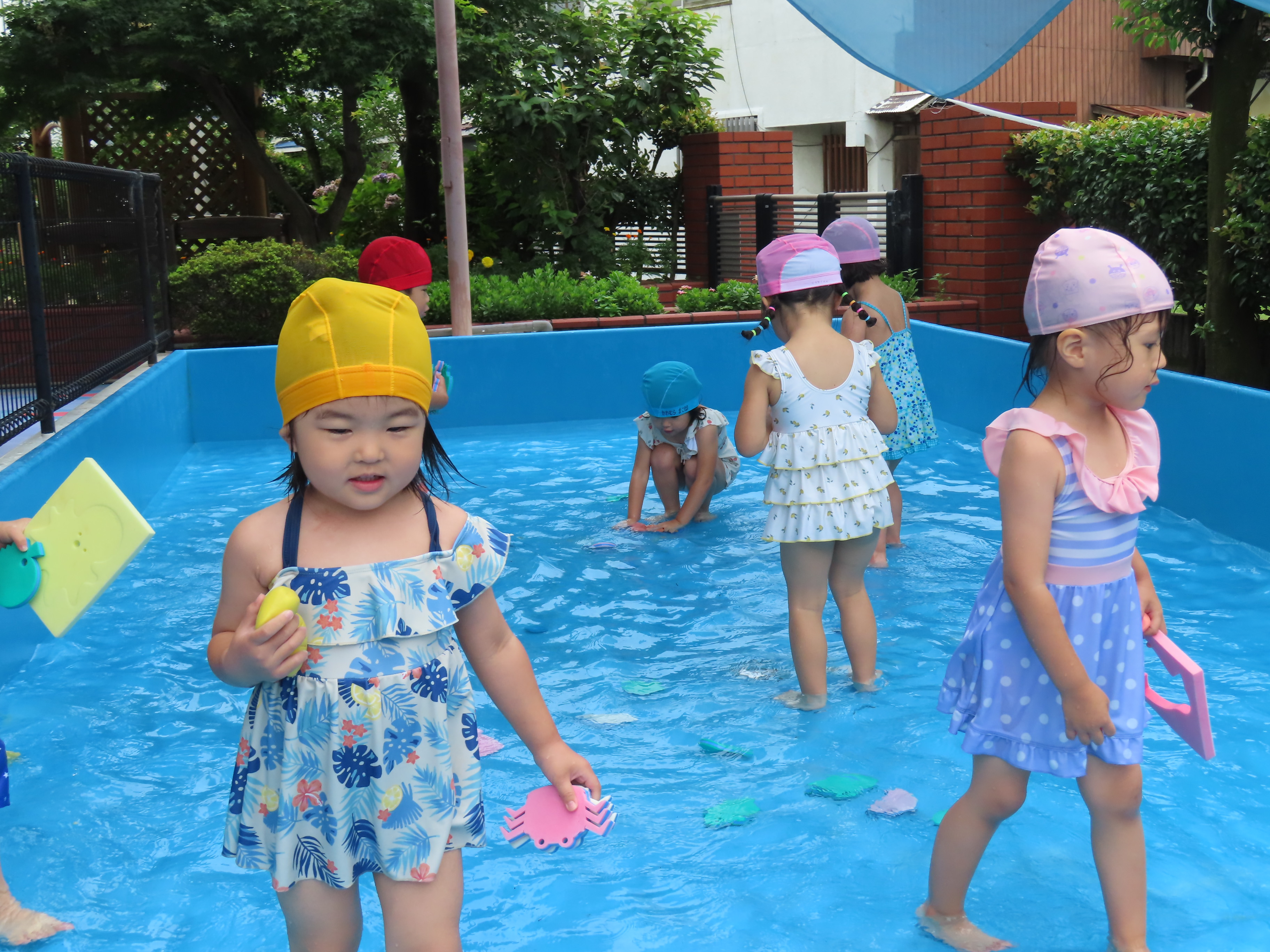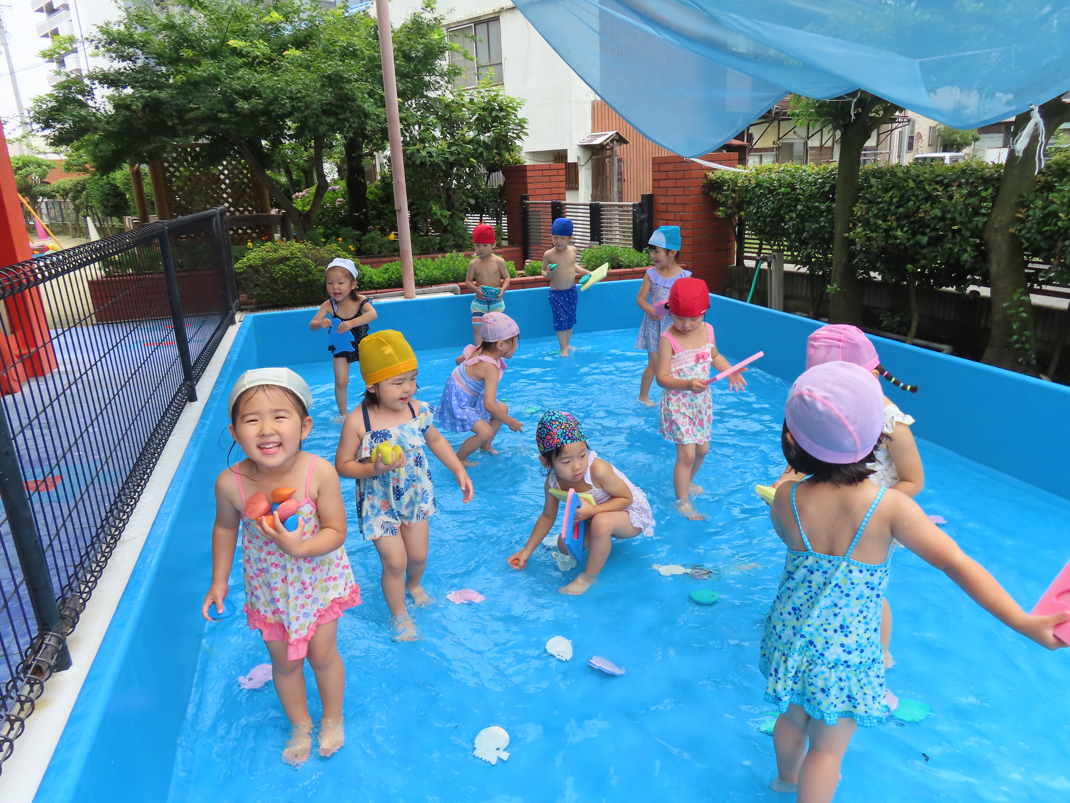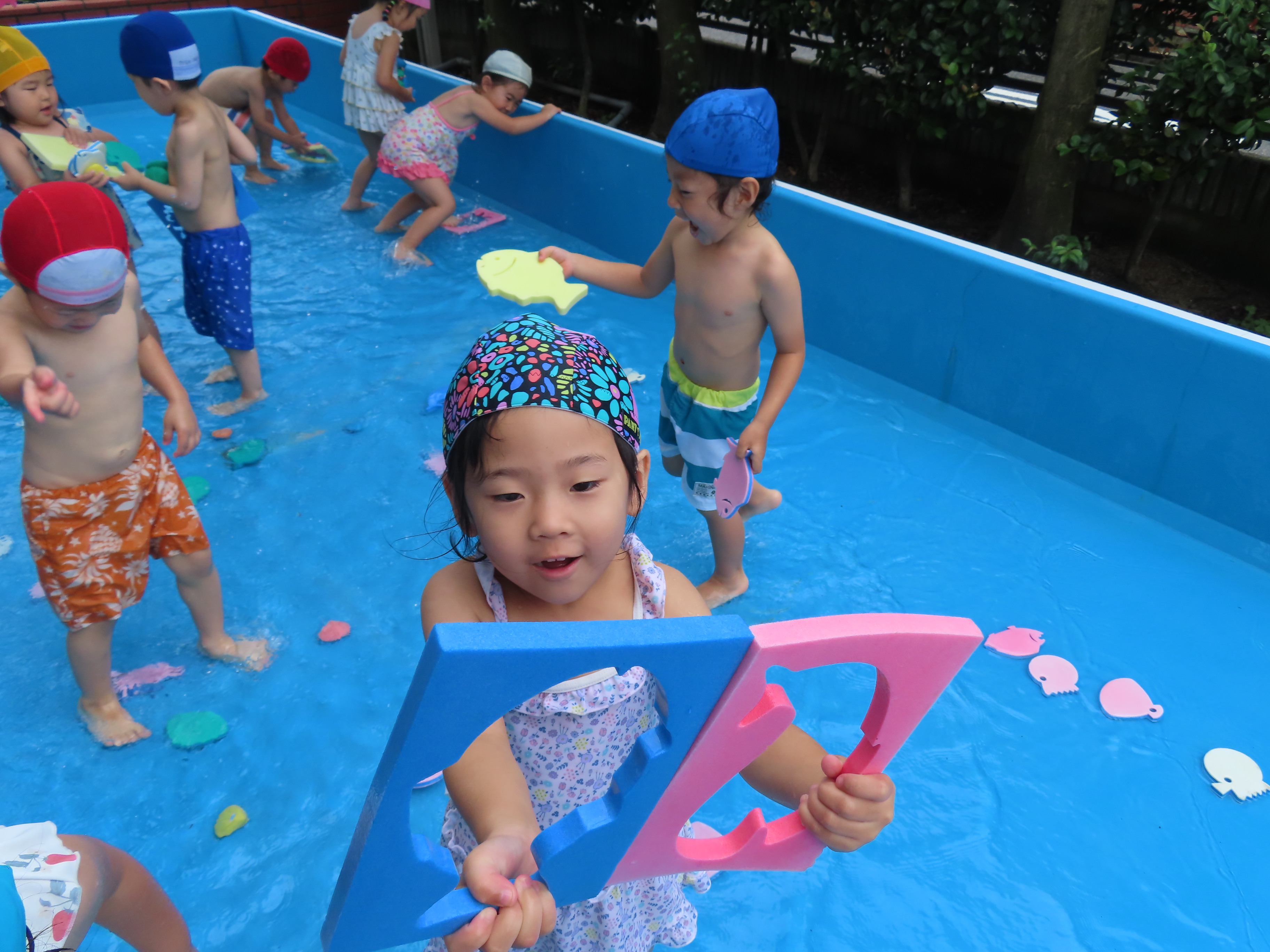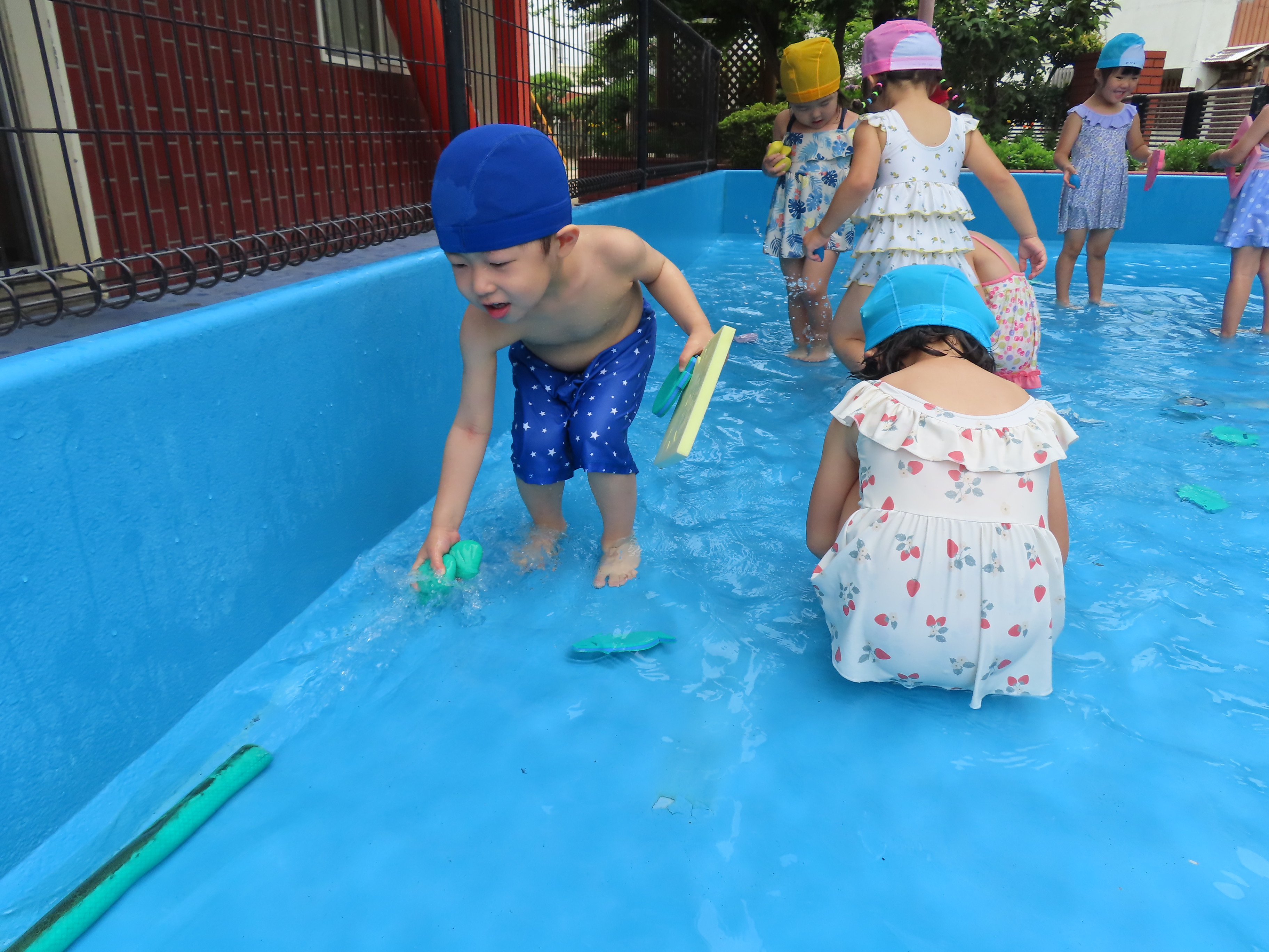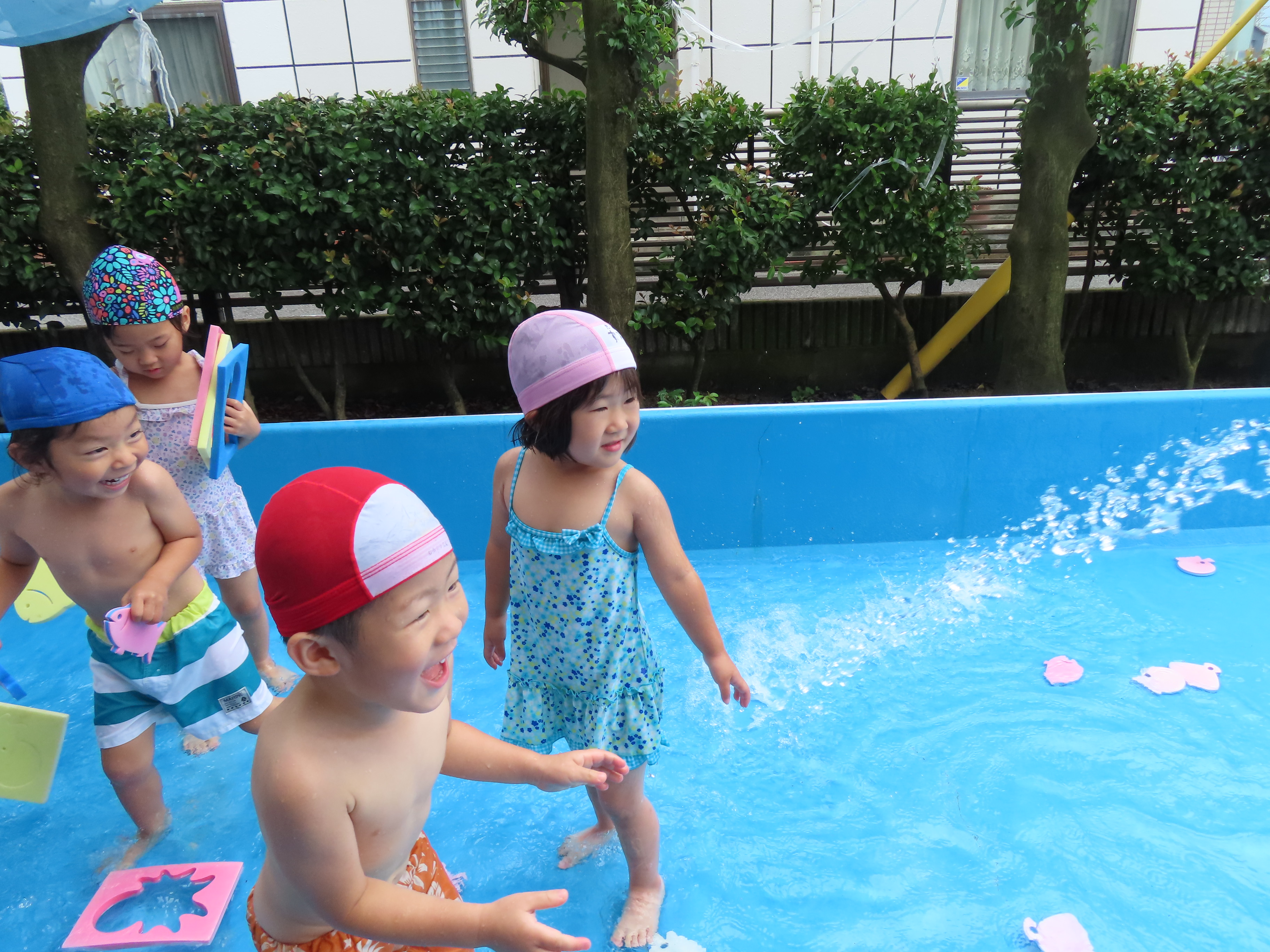 ばら組さん達も、水遊びが大好き~(*^_^*)この日は、浅めで水遊びを楽しんだのですがそれでも子どもたちはワ~キャ~と大はしゃぎ♪ ホースから出る水に立ち向かっていったりと、行動も大胆になりつつあります!どのクラスもこの暑い夏を満喫しながら毎日元気に楽しんでいます(*^_^*)