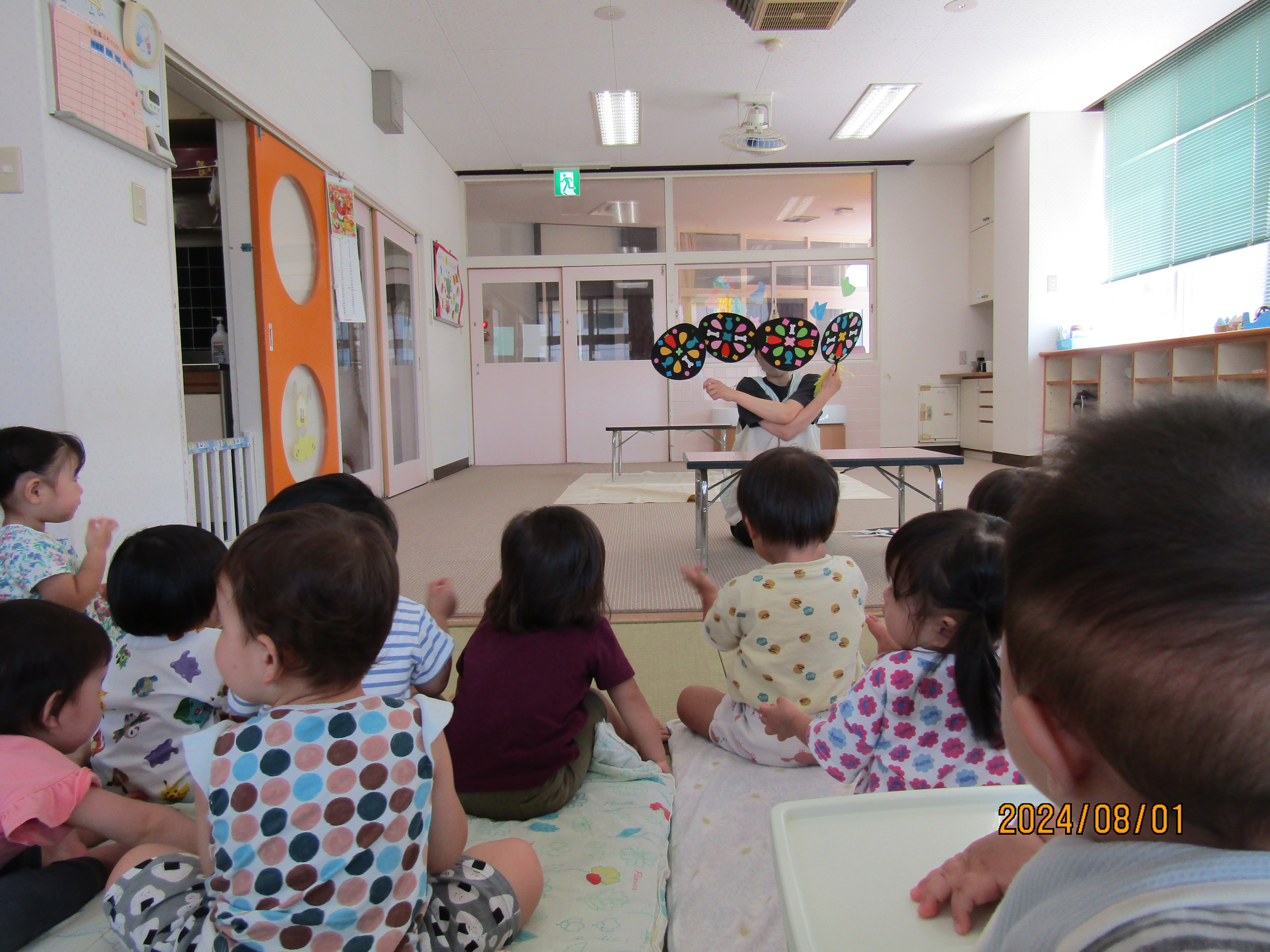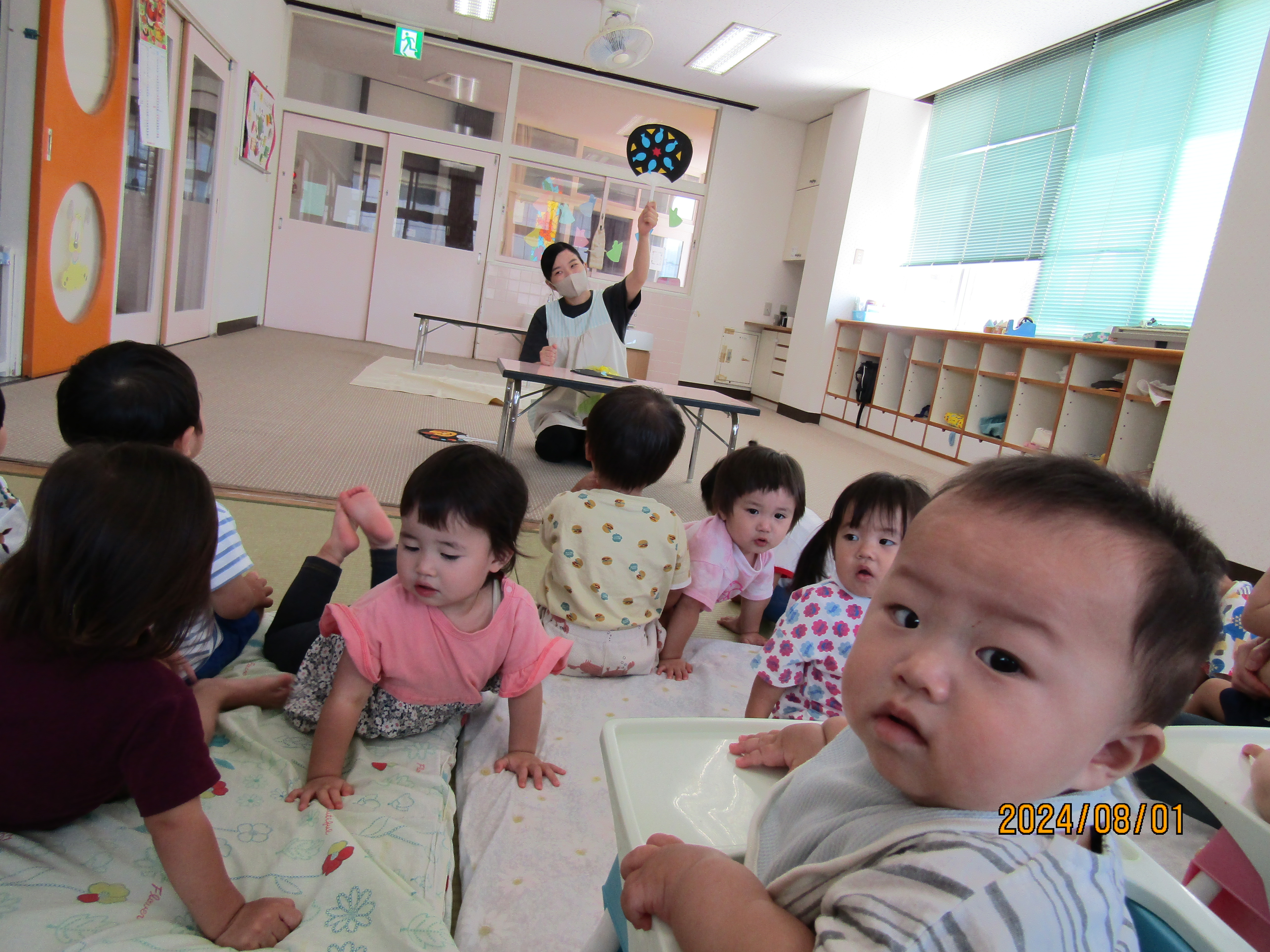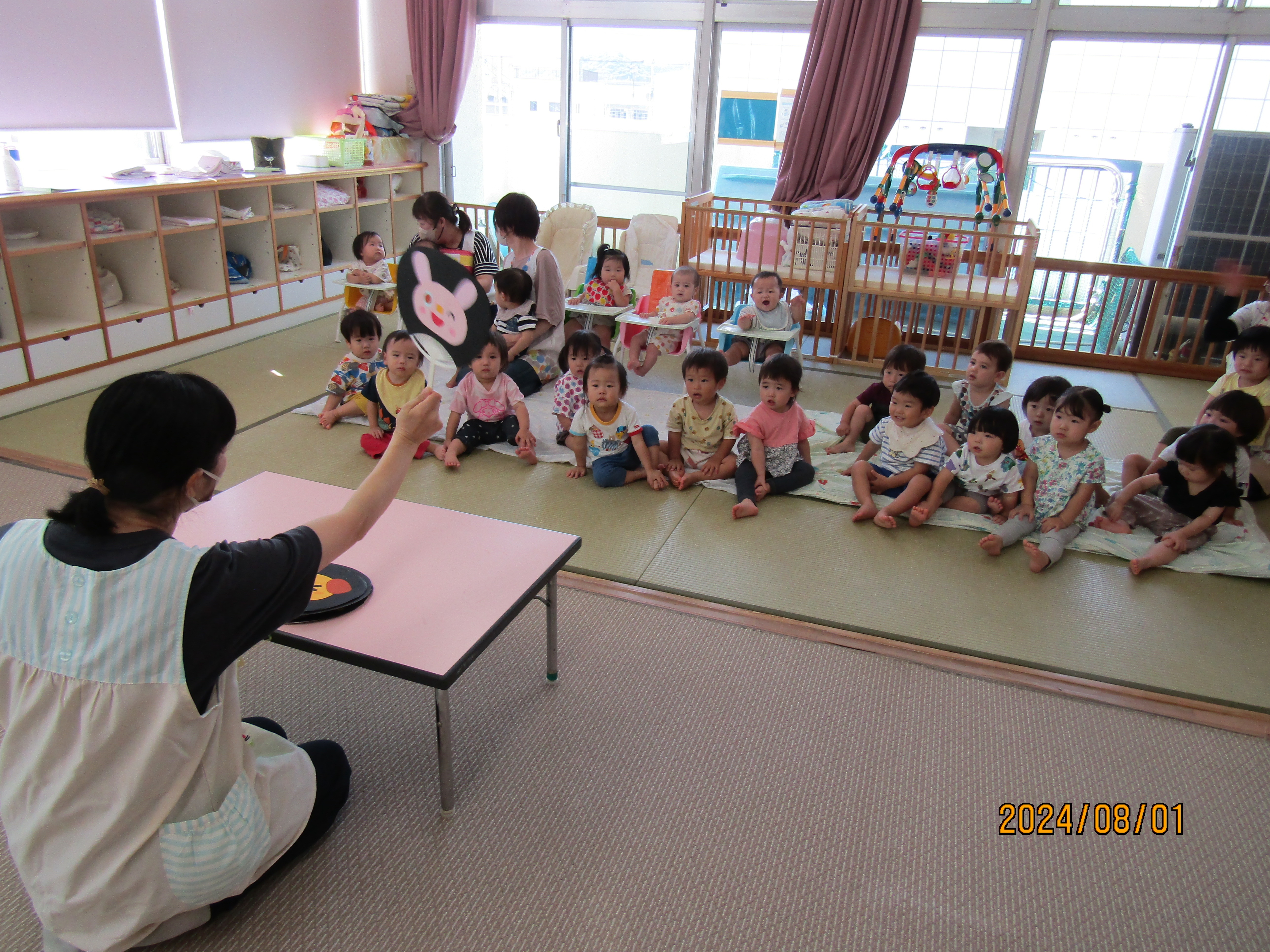 乳児クラスの誕生会の様子です(*^_^*) 春の頃は、とっても小さくて寝て過ごすことが多かった赤ちゃんたちも、今ではしっかりと椅子に座れるようになってきて、みんなと一緒に楽しい時間を過ごせるようになってきました!!みんなちゃんと座ってお話も聞けていてすごいでしょ!?(*^_^*) 保育士によるうちわシアターに集中して最後までよく見てくれました♪