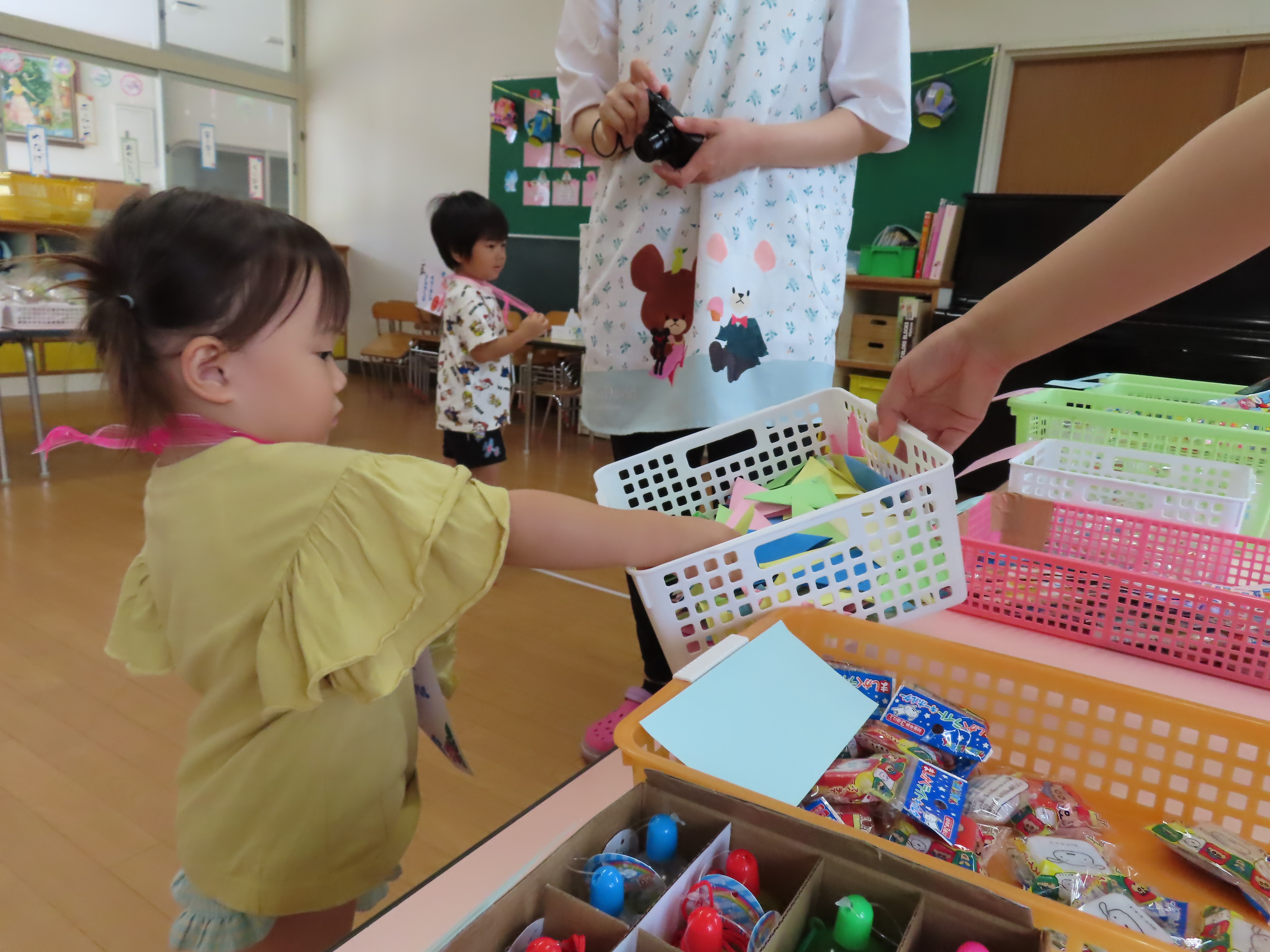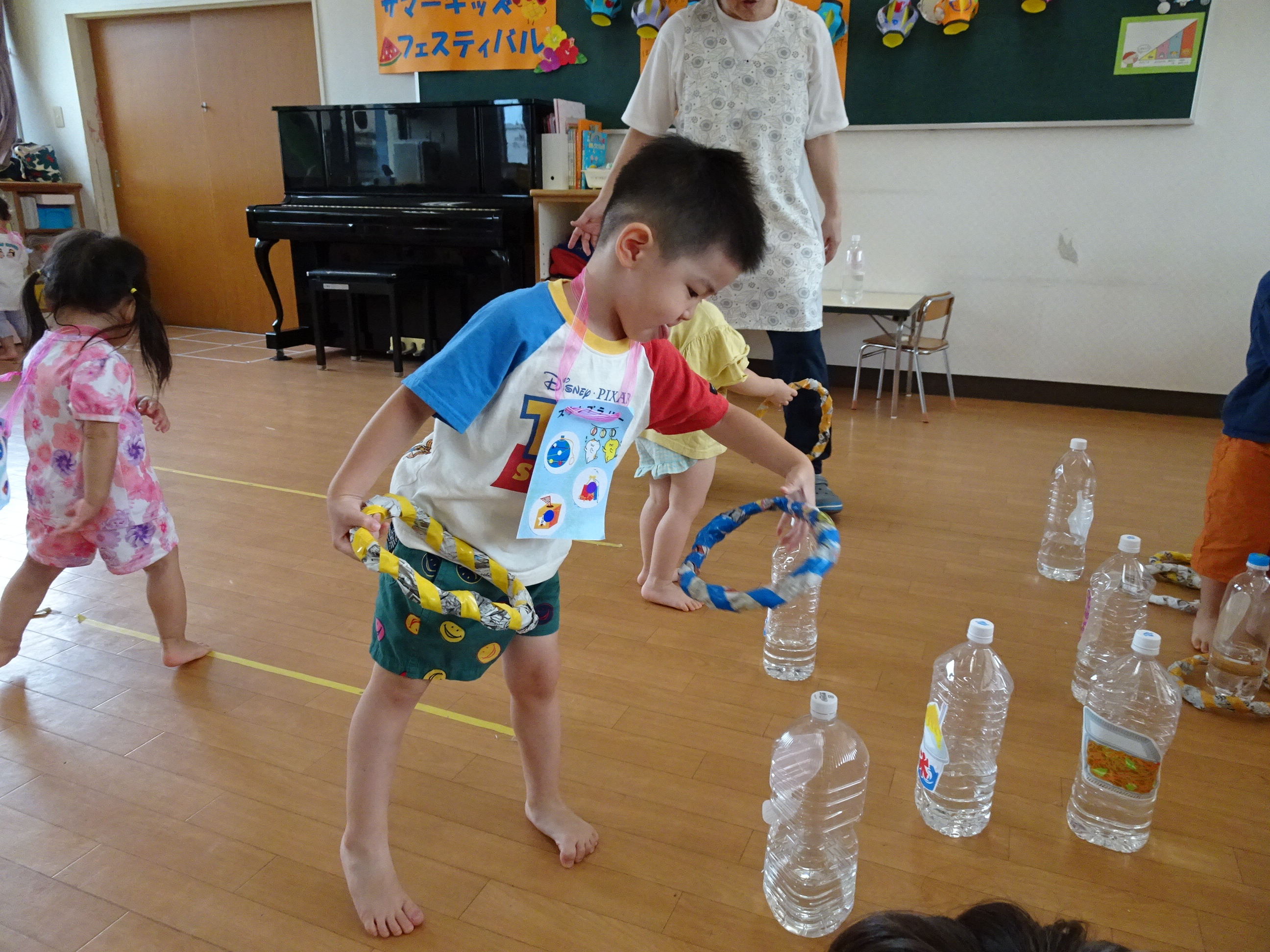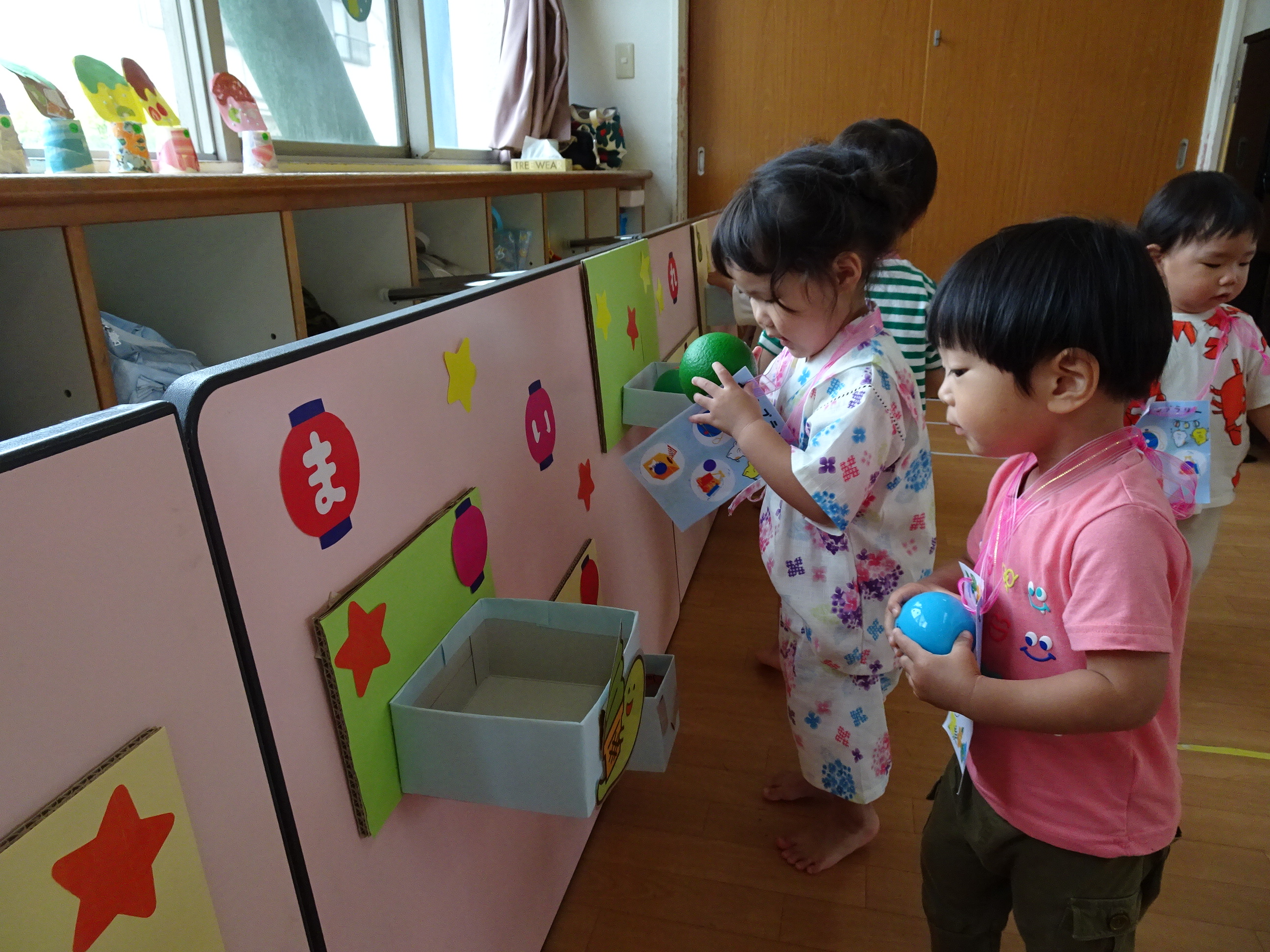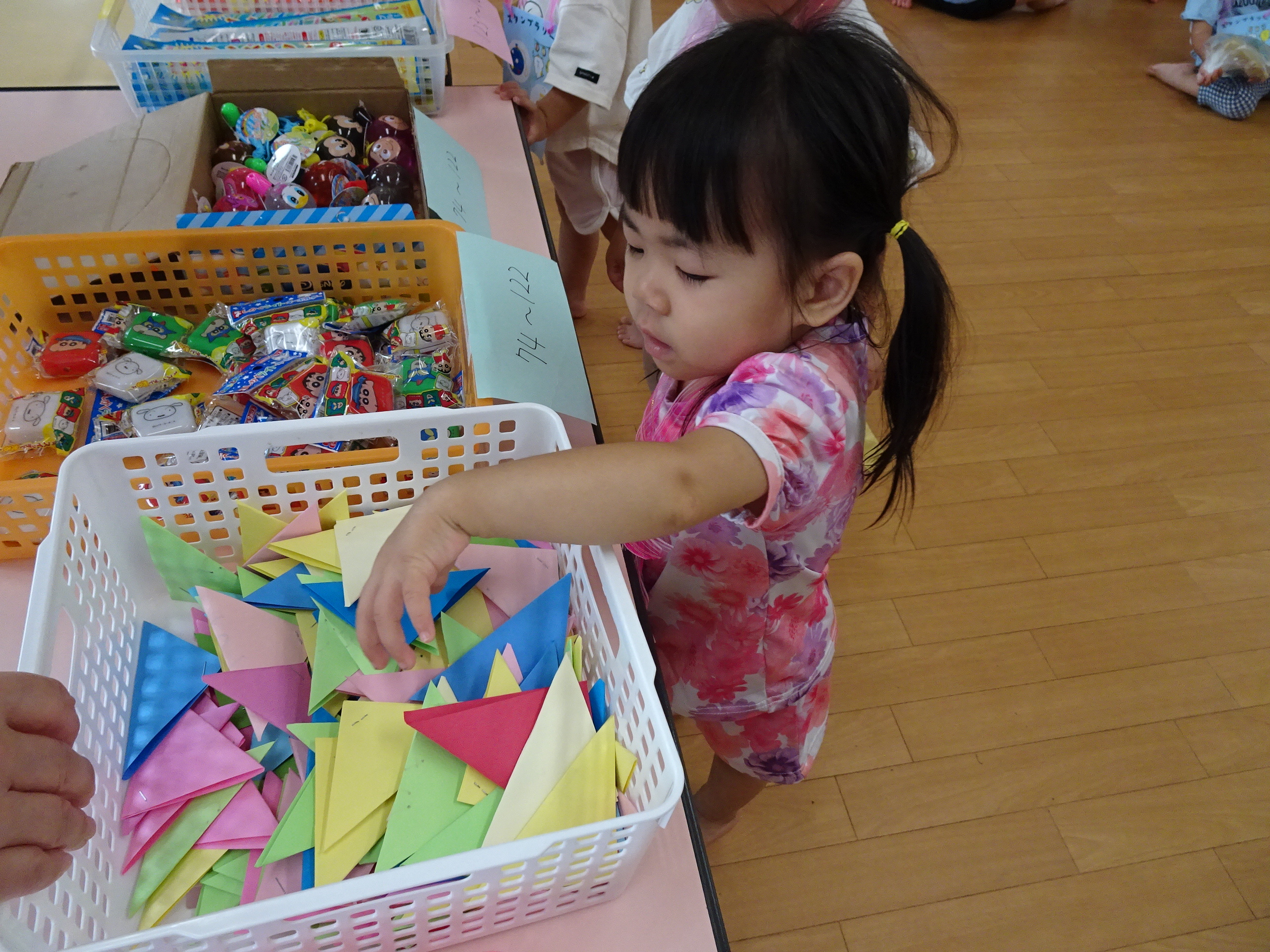 夏祭り~!!ということで園内にて「サマーキッズフェスティバル」を行いました(*^_^*) くじ引きや輪なげ、ボール投げ、おかしひろいなど、たくさんのコーナーを準備して、夏を楽しみました♪ 小さなお友だちも、雰囲気を味わいながら、この笑顔(*^_^*) 1,2歳児さんたちも、くじ引きにも挑戦しておもちゃが当たると嬉しくてニッコリ~でした♡ 楽しい時間を過ごすことができました!