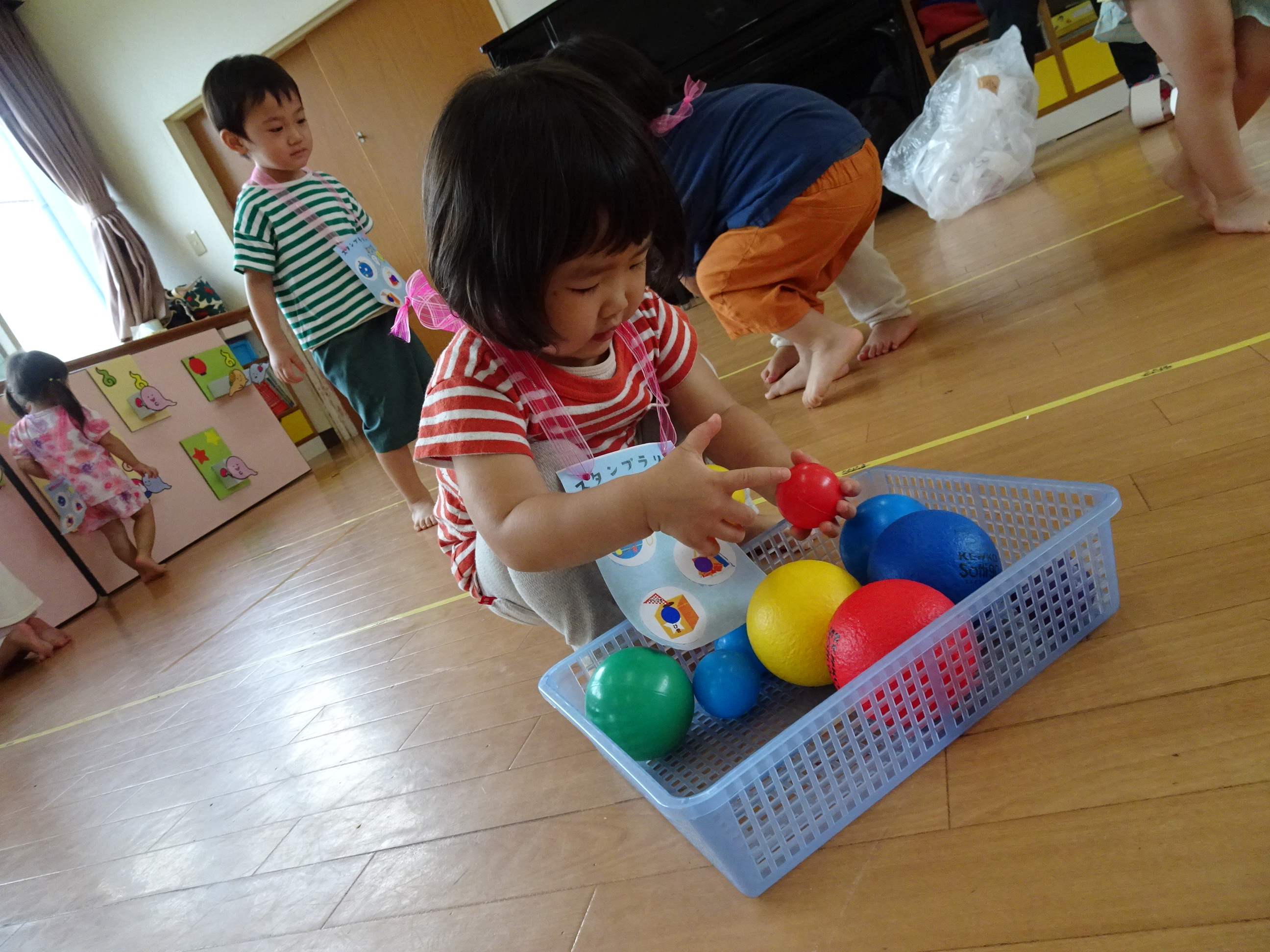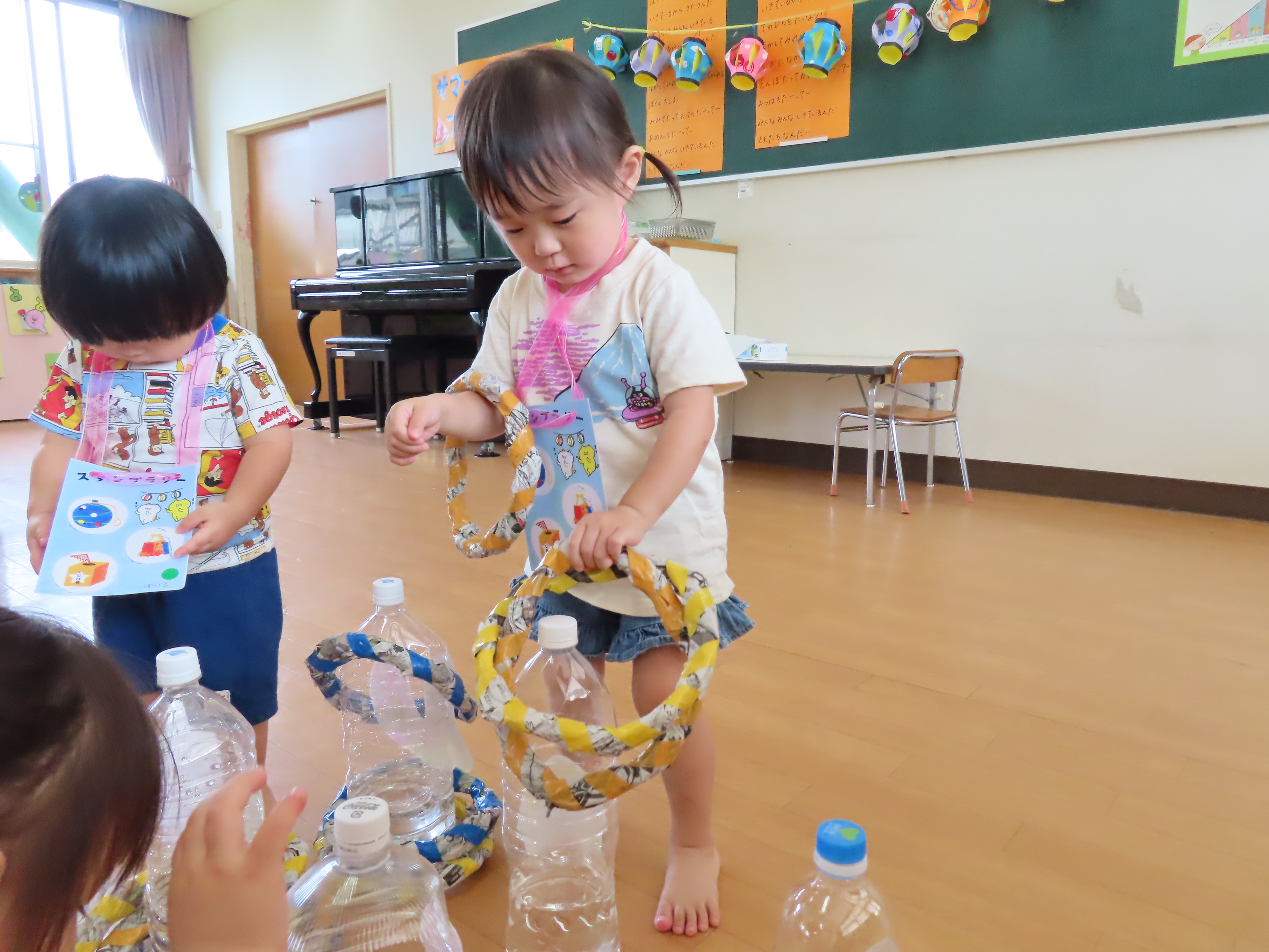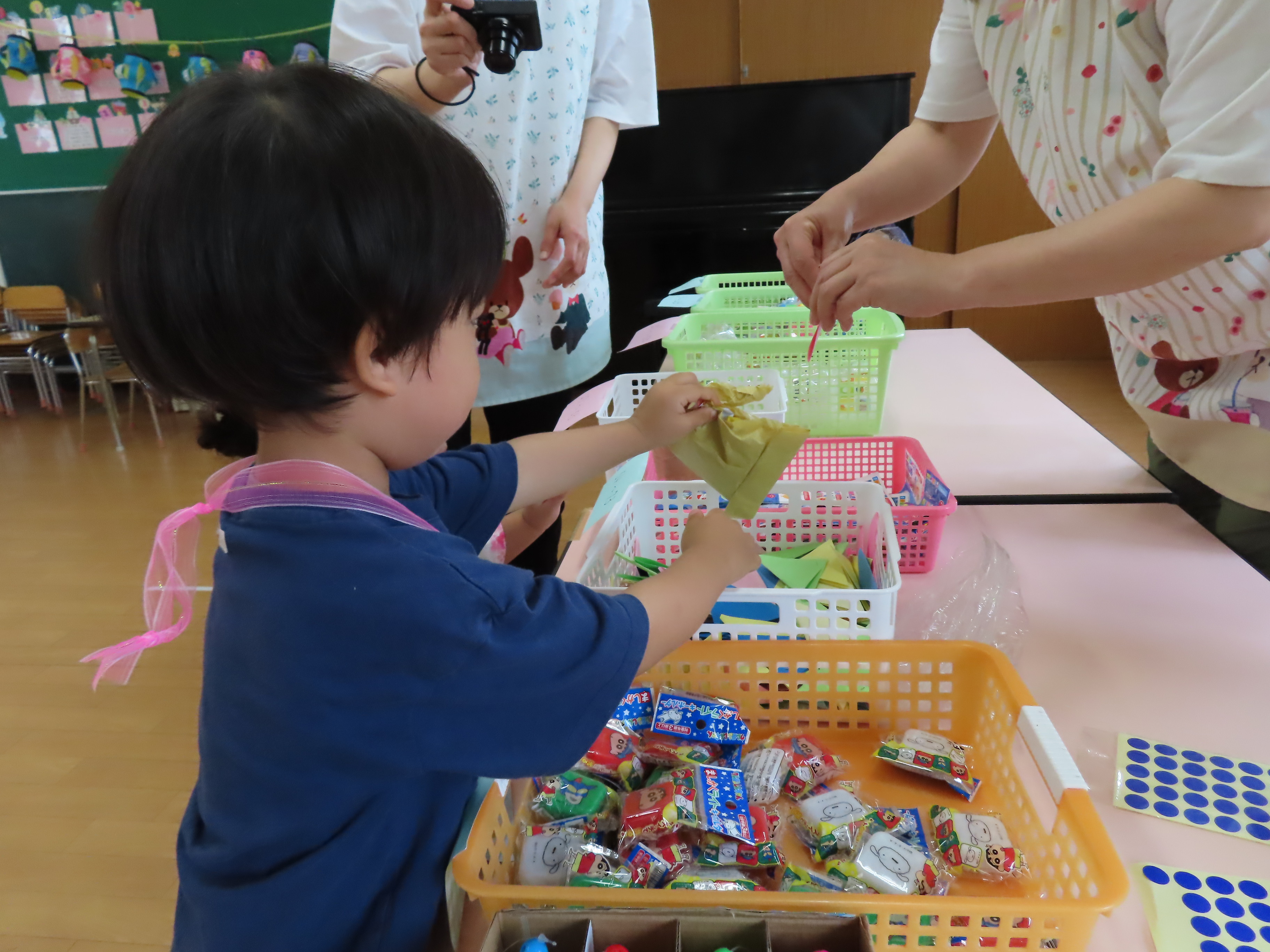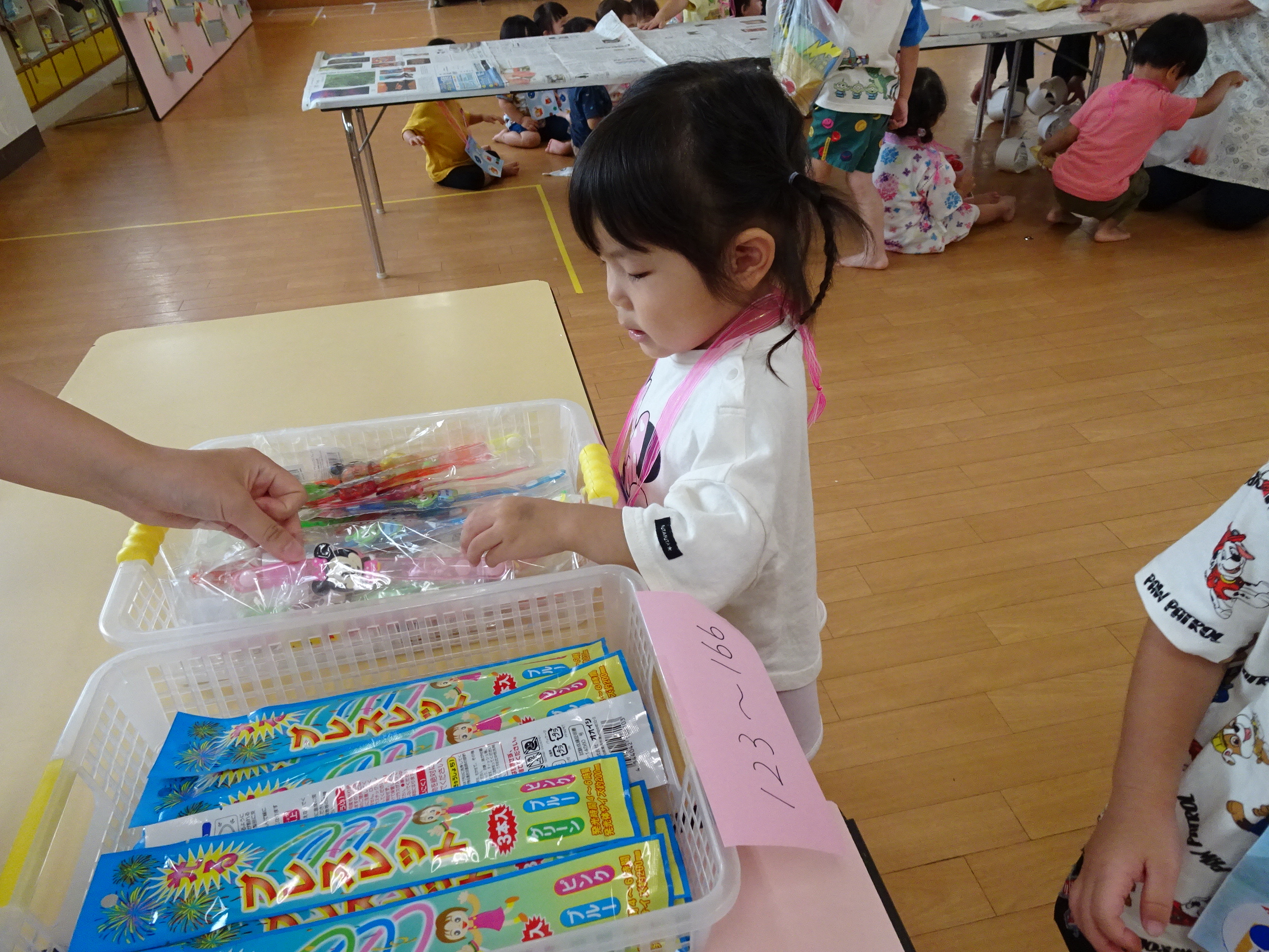 夏祭り~!!ということで園内にて「サマーキッズフェスティバル」を行いました(*^_^*) くじ引きや輪なげ、ボール投げ、おかしひろいなど、たくさんのコーナーを準備して、夏を楽しみました♪ 小さなお友だちも、雰囲気を味わいながら、この笑顔(*^_^*) 1,2歳児さんたちも、くじ引きにも挑戦しておもちゃが当たると嬉しくてニッコリ~でした♡ 楽しい時間を過ごすことができました!