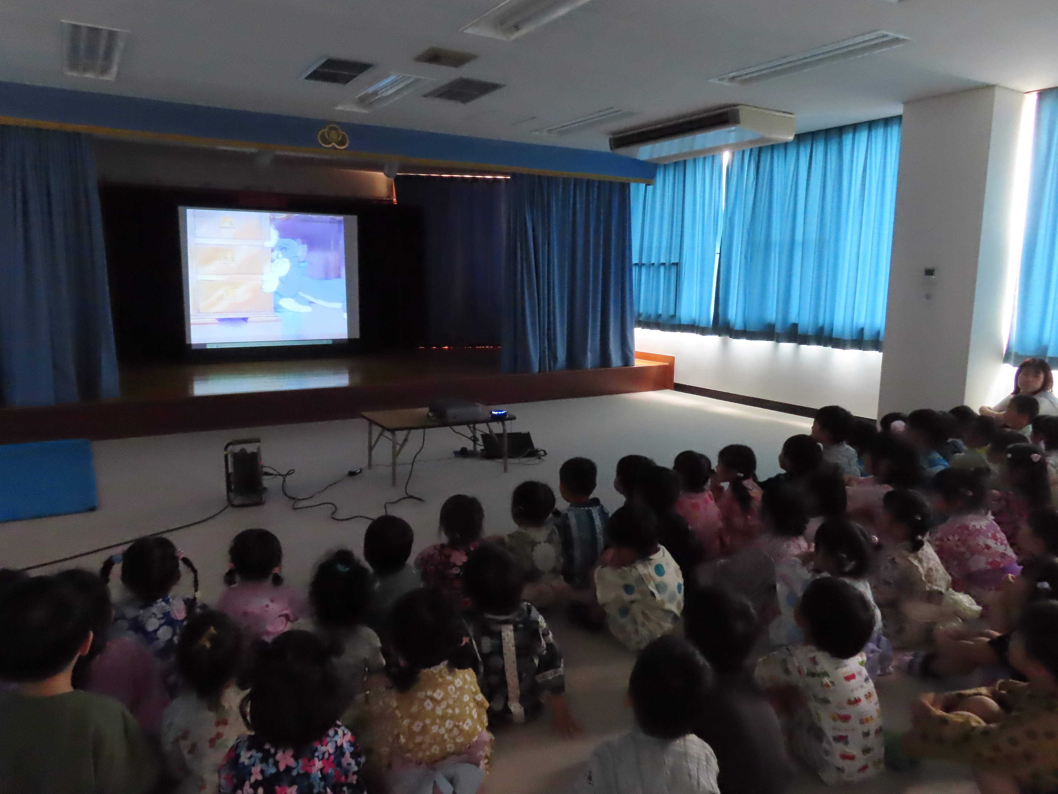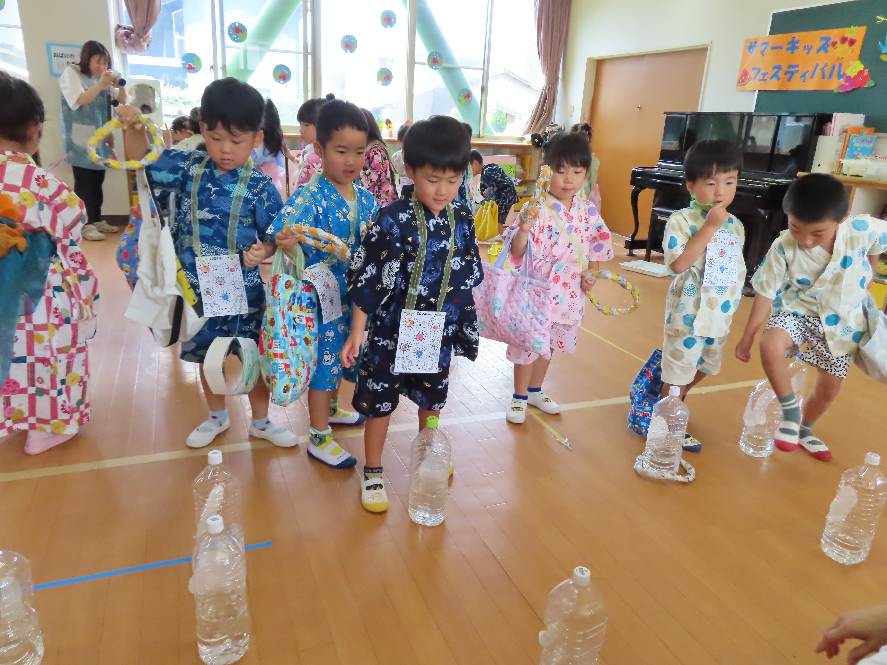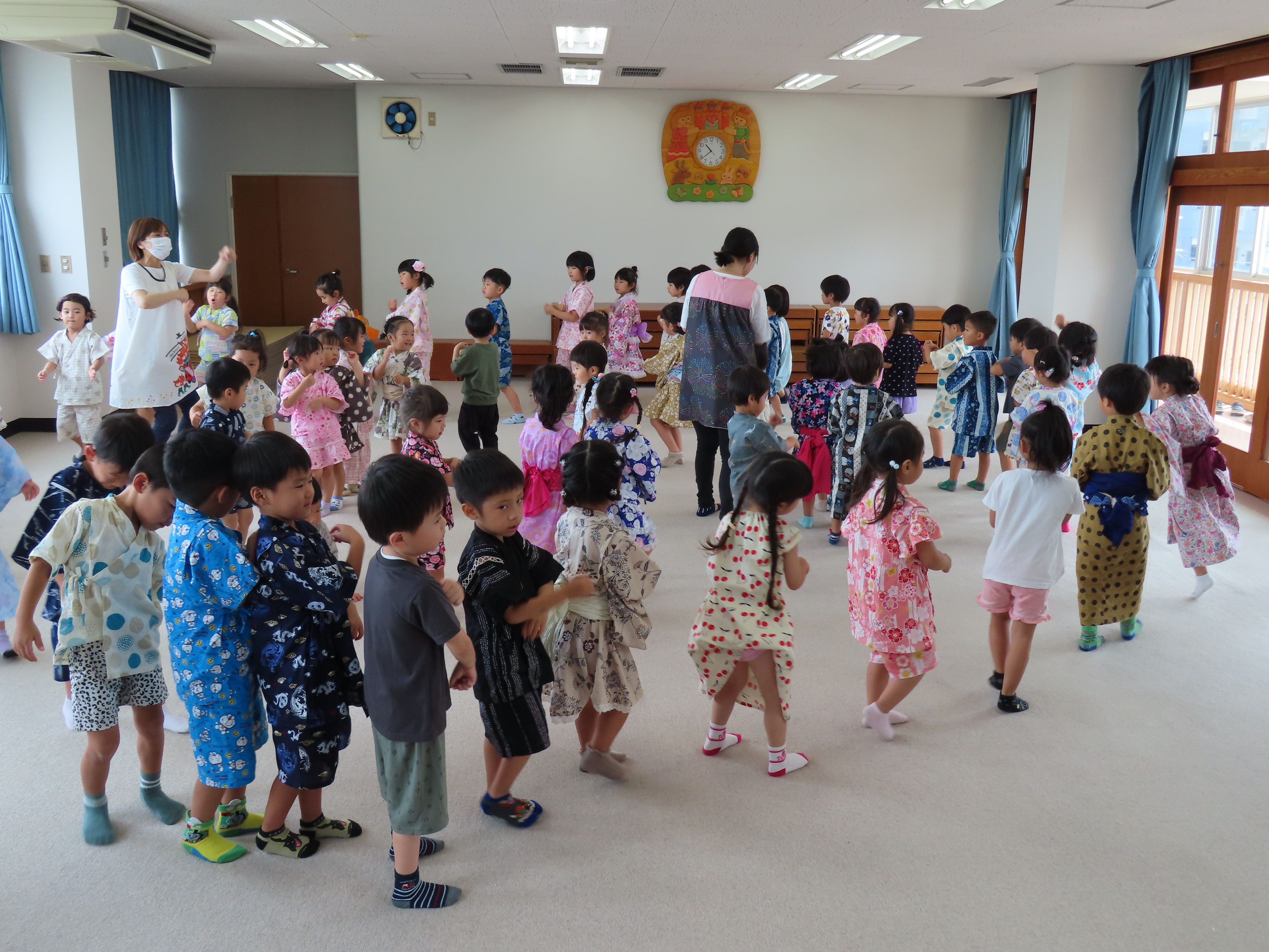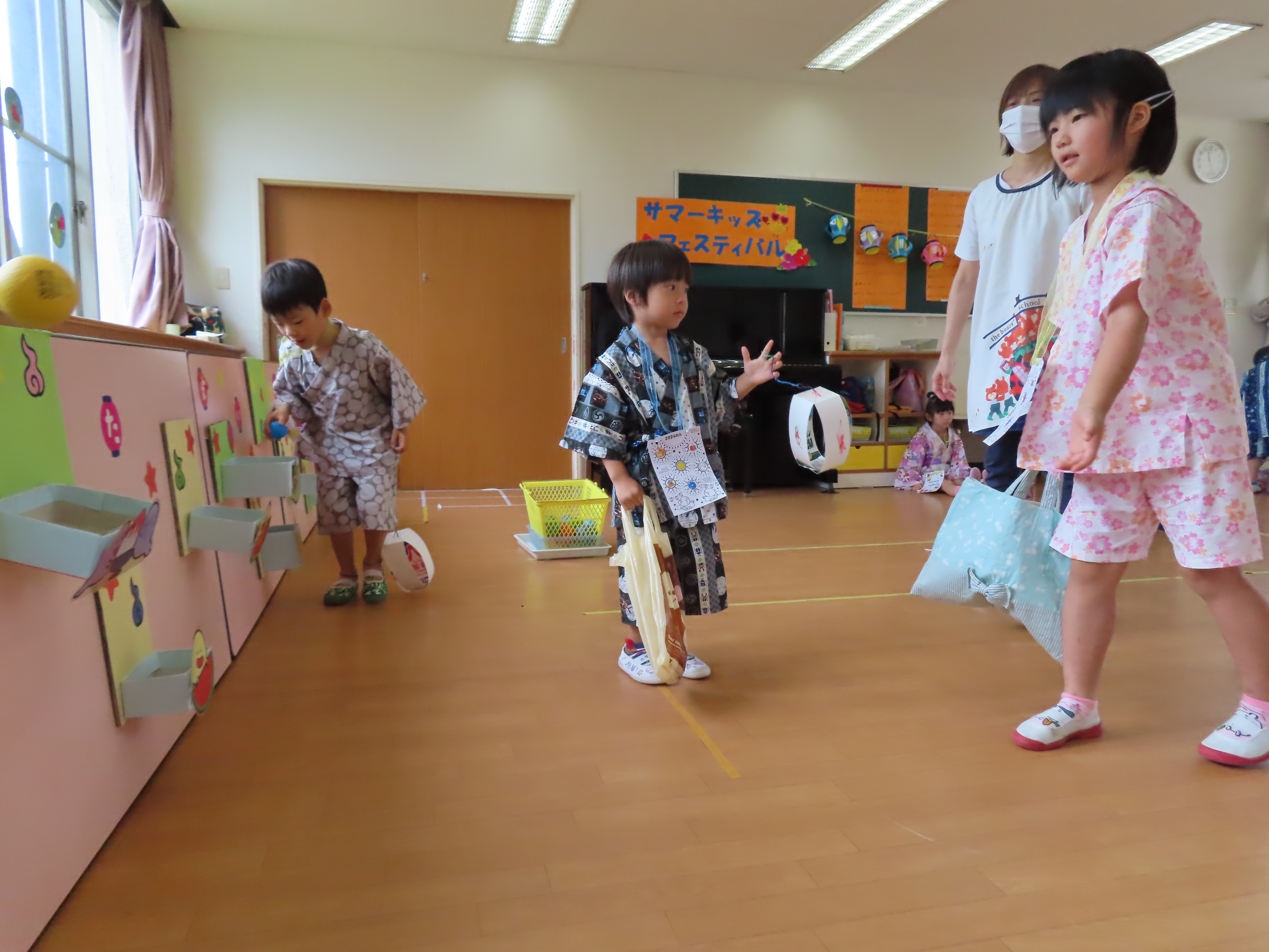 「サマーキッズフェスティバル」幼児クラスの様子です(*^_^*) 幼児さん達は、15分ほどDVD鑑賞もしてみました。「映画みたい~♡」と大喜び!!その後は、みんなで盆踊り~♪この日に向けて、練習もしていたのでみんなバッチリ!!でした(*^^)v くじ引きやおかしすくい、ヨーヨーづくりなどたくさんのコーナー遊びを楽しみました。給食は、屋台メニューをだしてもらって、夏祭り気分をより味わいました♪