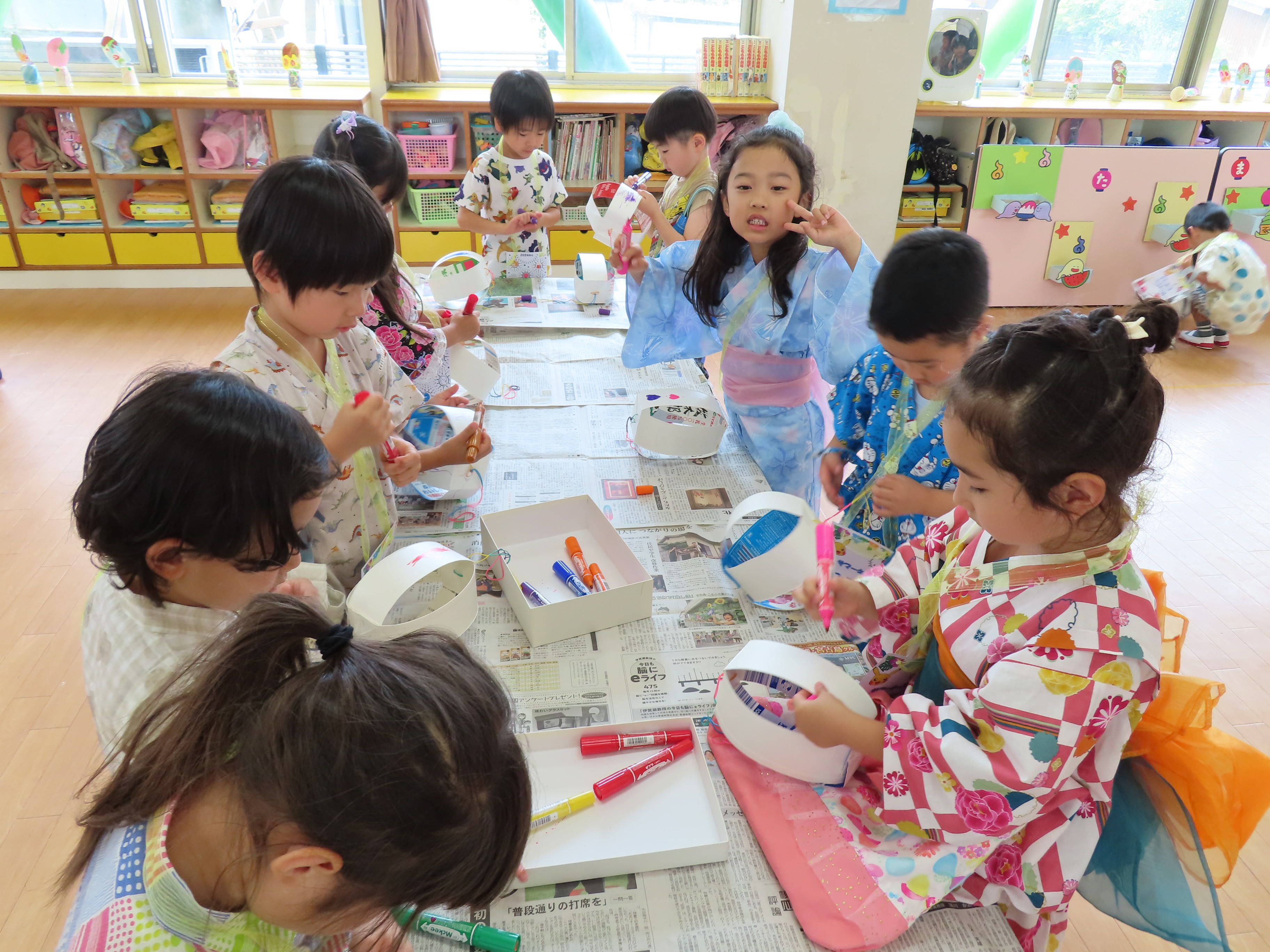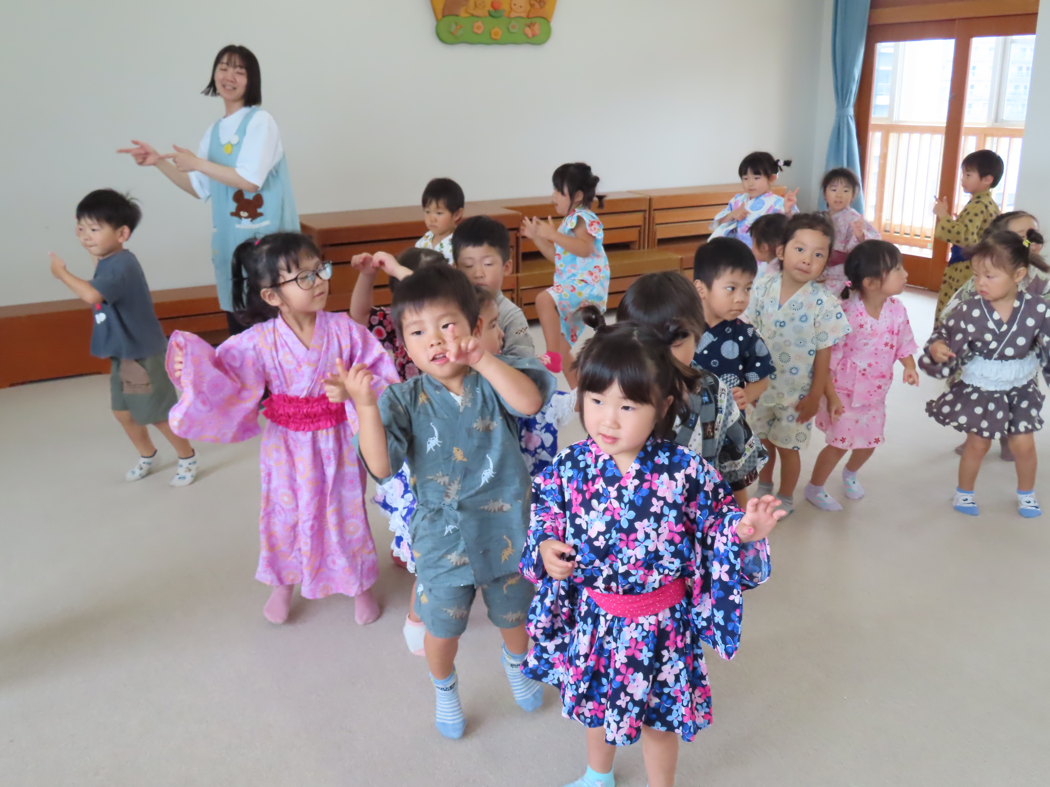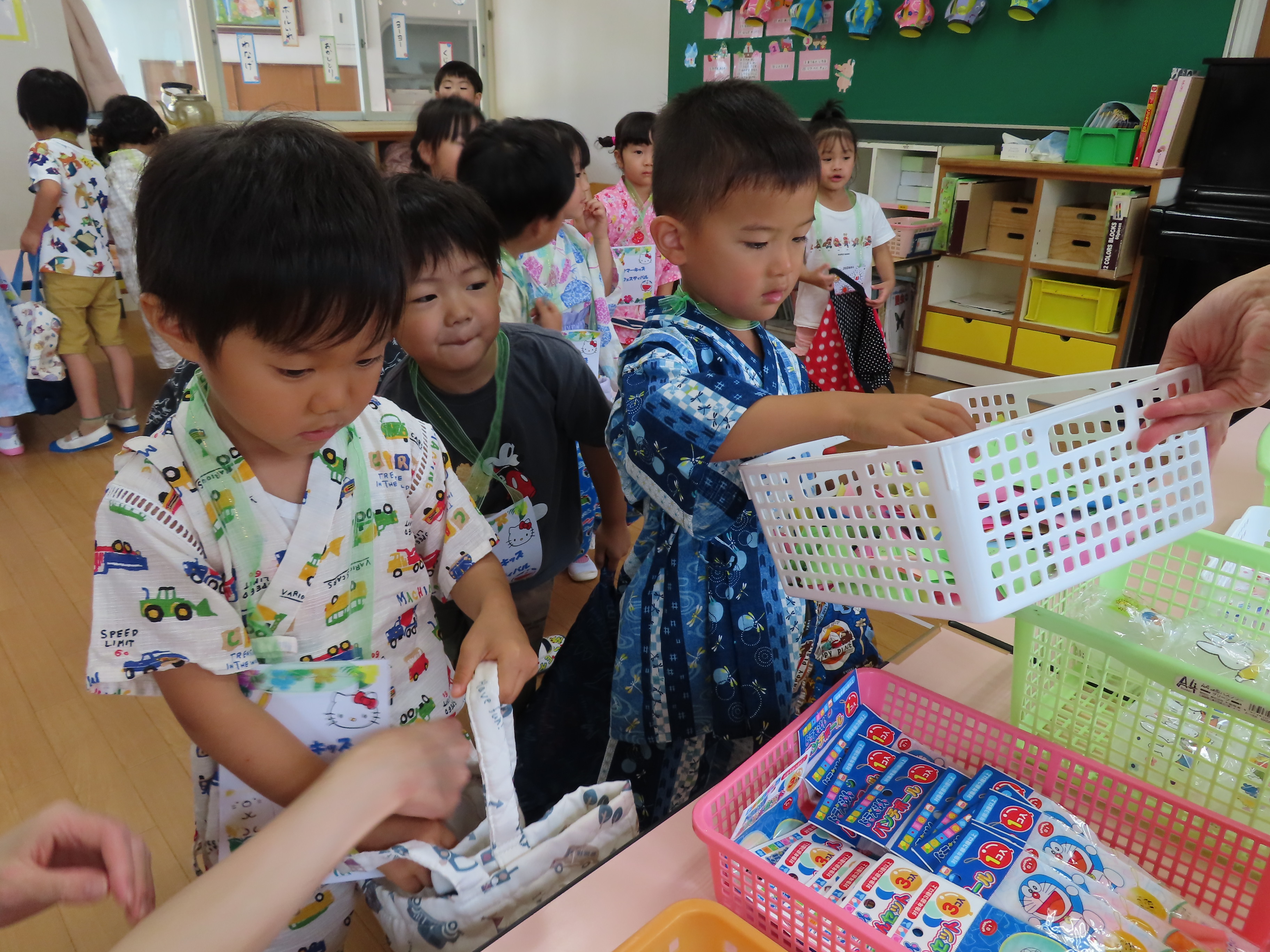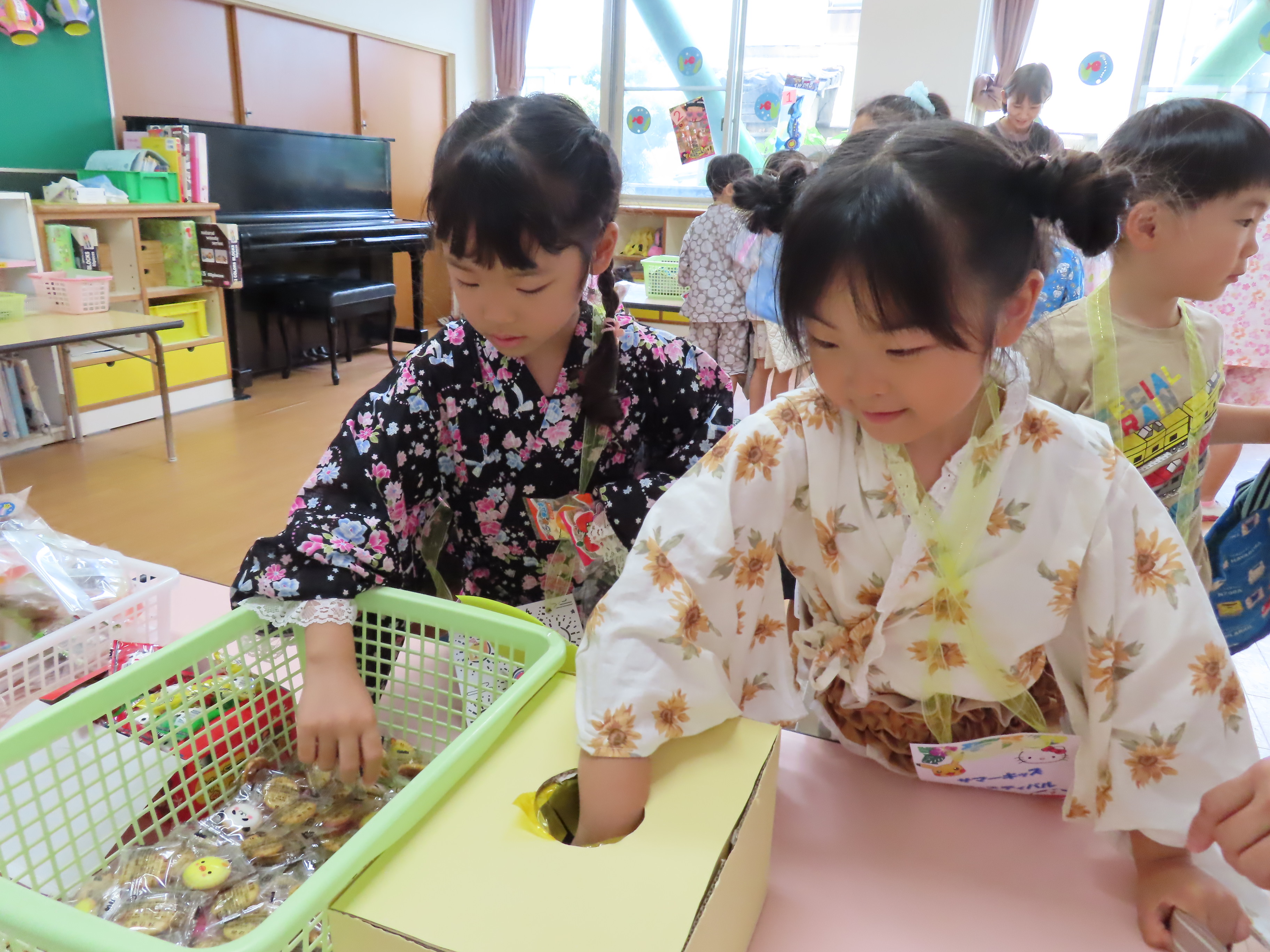 「サマーキッズフェスティバル」幼児クラスの様子です(*^_^*) 幼児さん達は、15分ほどDVD鑑賞もしてみました。「映画みたい~♡」と大喜び!!その後は、みんなで盆踊り~♪この日に向けて、練習もしていたのでみんなバッチリ!!でした(*^^)v くじ引きやおかしすくい、ヨーヨーづくりなどたくさんのコーナー遊びを楽しみました。給食は、屋台メニューをだしてもらって、夏祭り気分をより味わいました♪