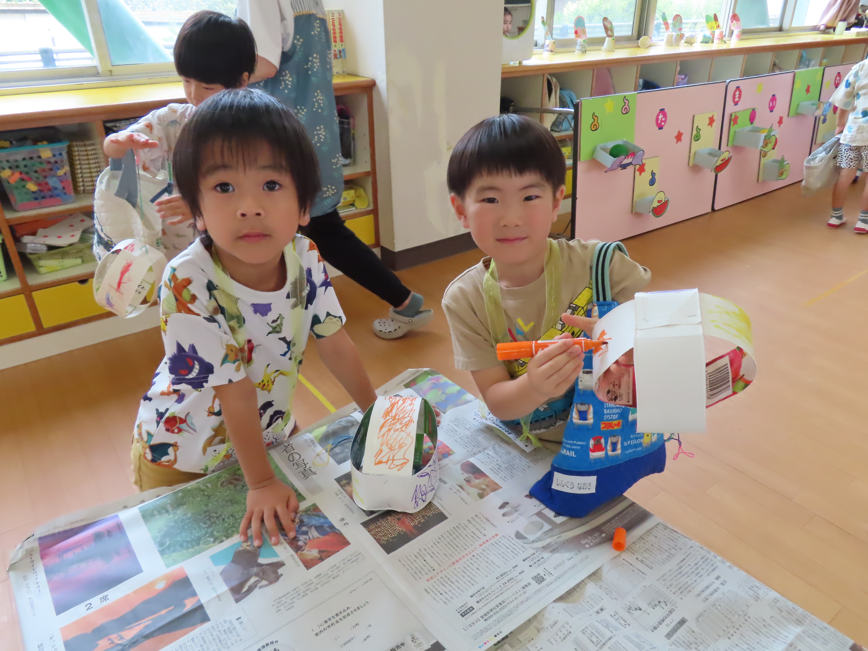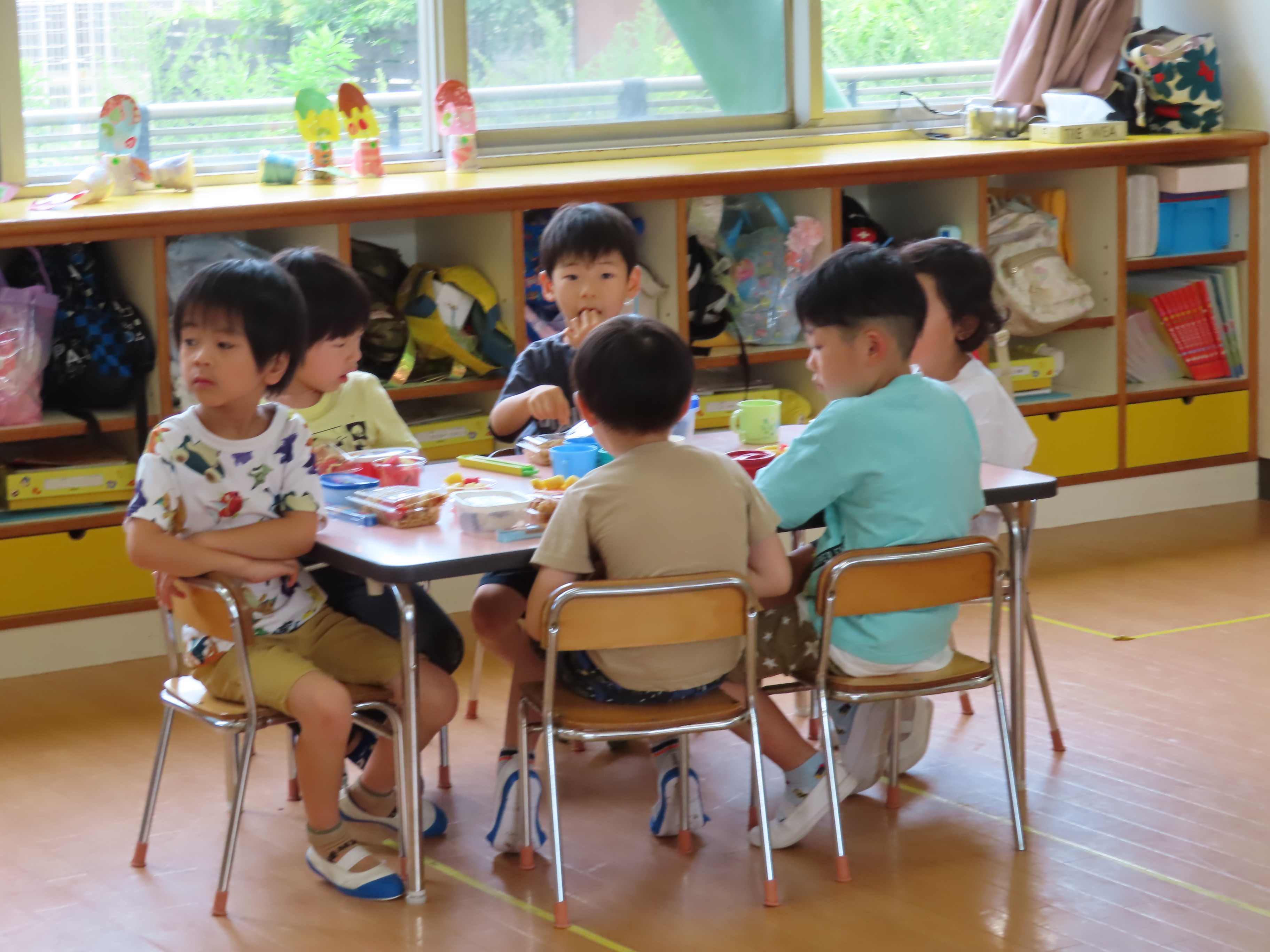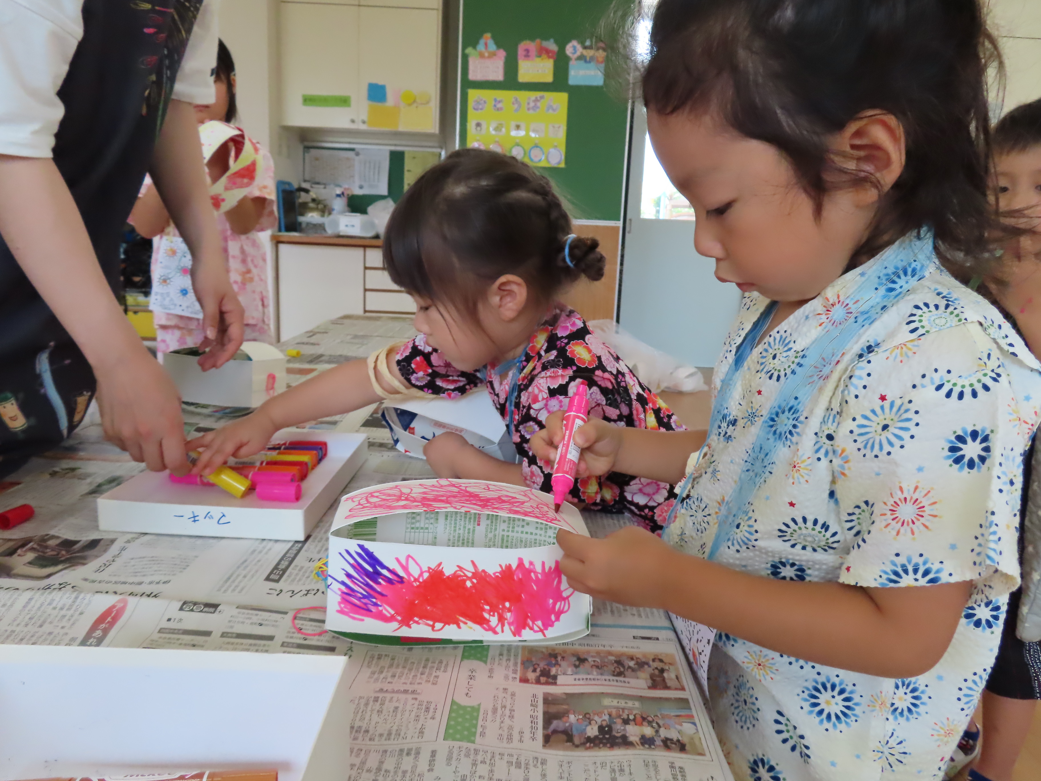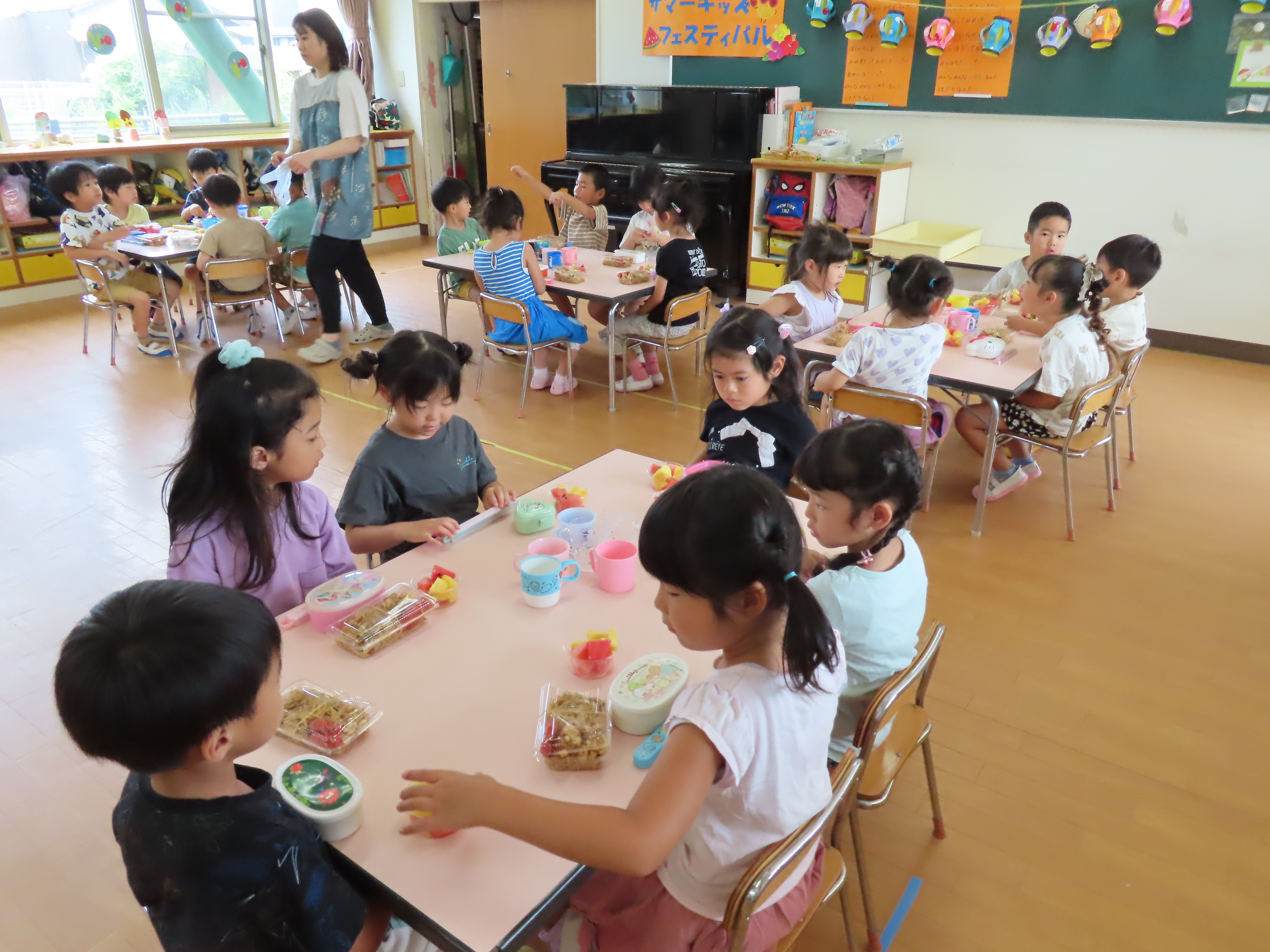 「サマーキッズフェスティバル」幼児クラスの様子です(*^_^*) 幼児さん達は、15分ほどDVD鑑賞もしてみました。「映画みたい~♡」と大喜び!!その後は、みんなで盆踊り~♪この日に向けて、練習もしていたのでみんなバッチリ!!でした(*^^)v くじ引きやおかしすくい、ヨーヨーづくりなどたくさんのコーナー遊びを楽しみました。給食は、屋台メニューをだしてもらって、夏祭り気分をより味わいました♪