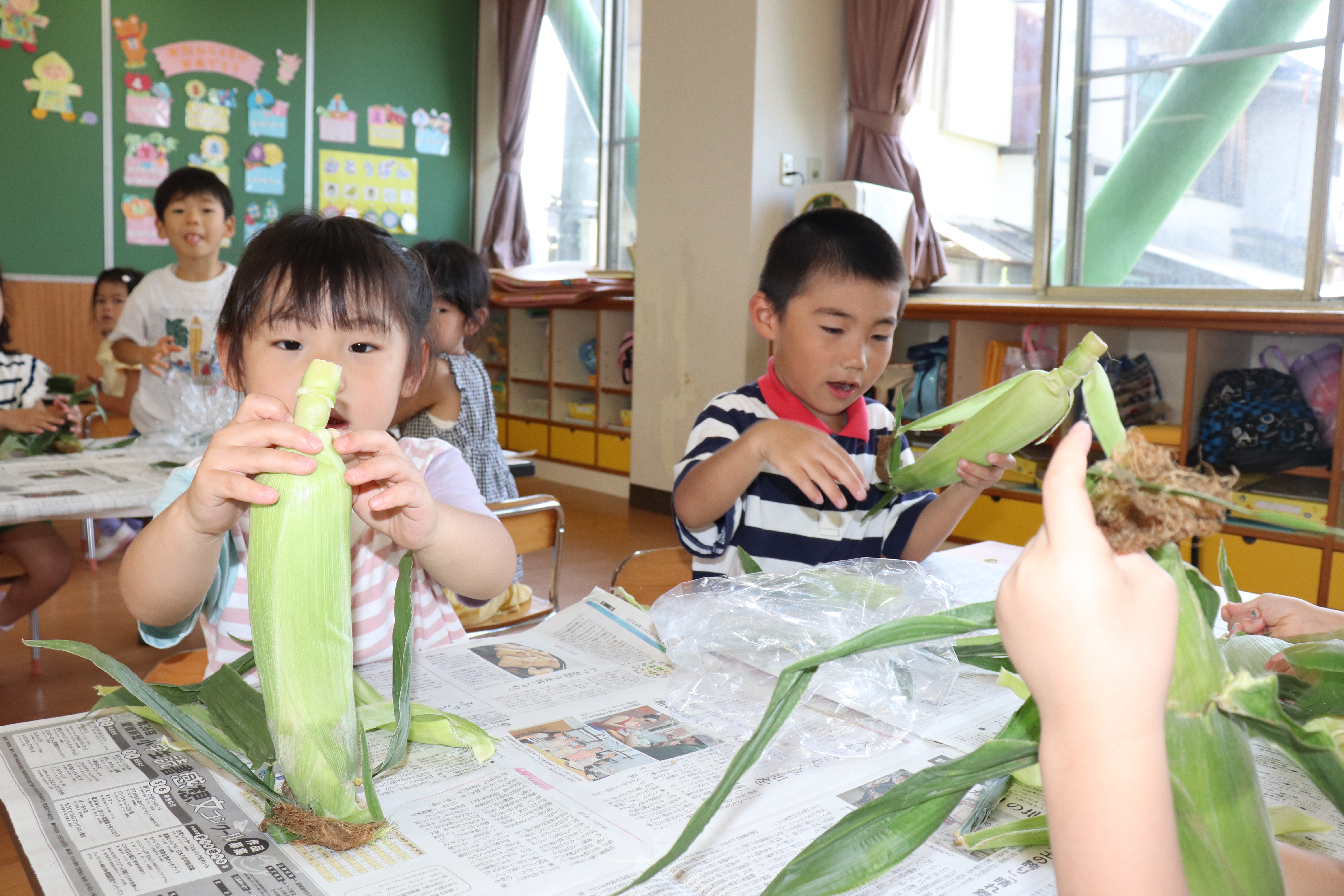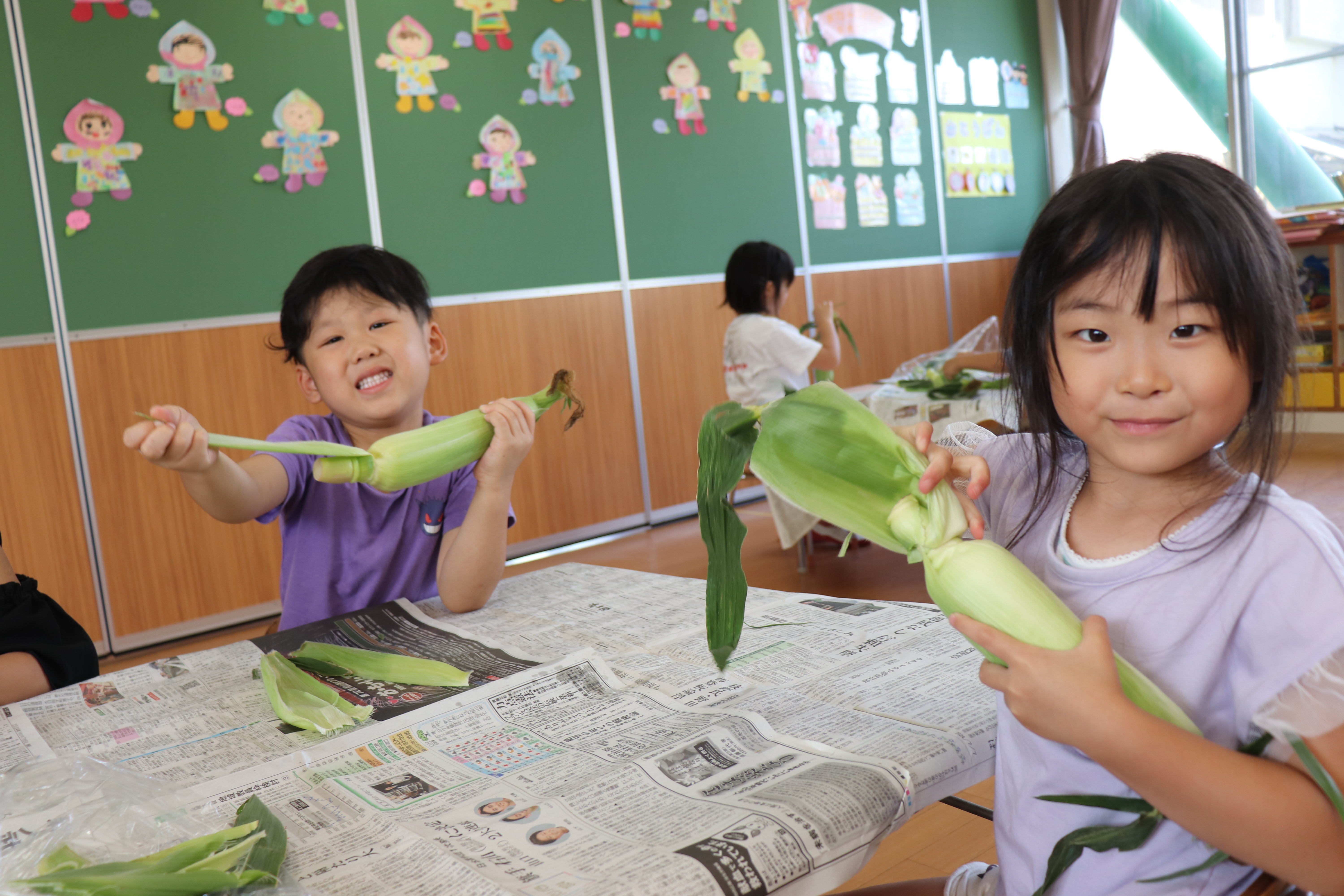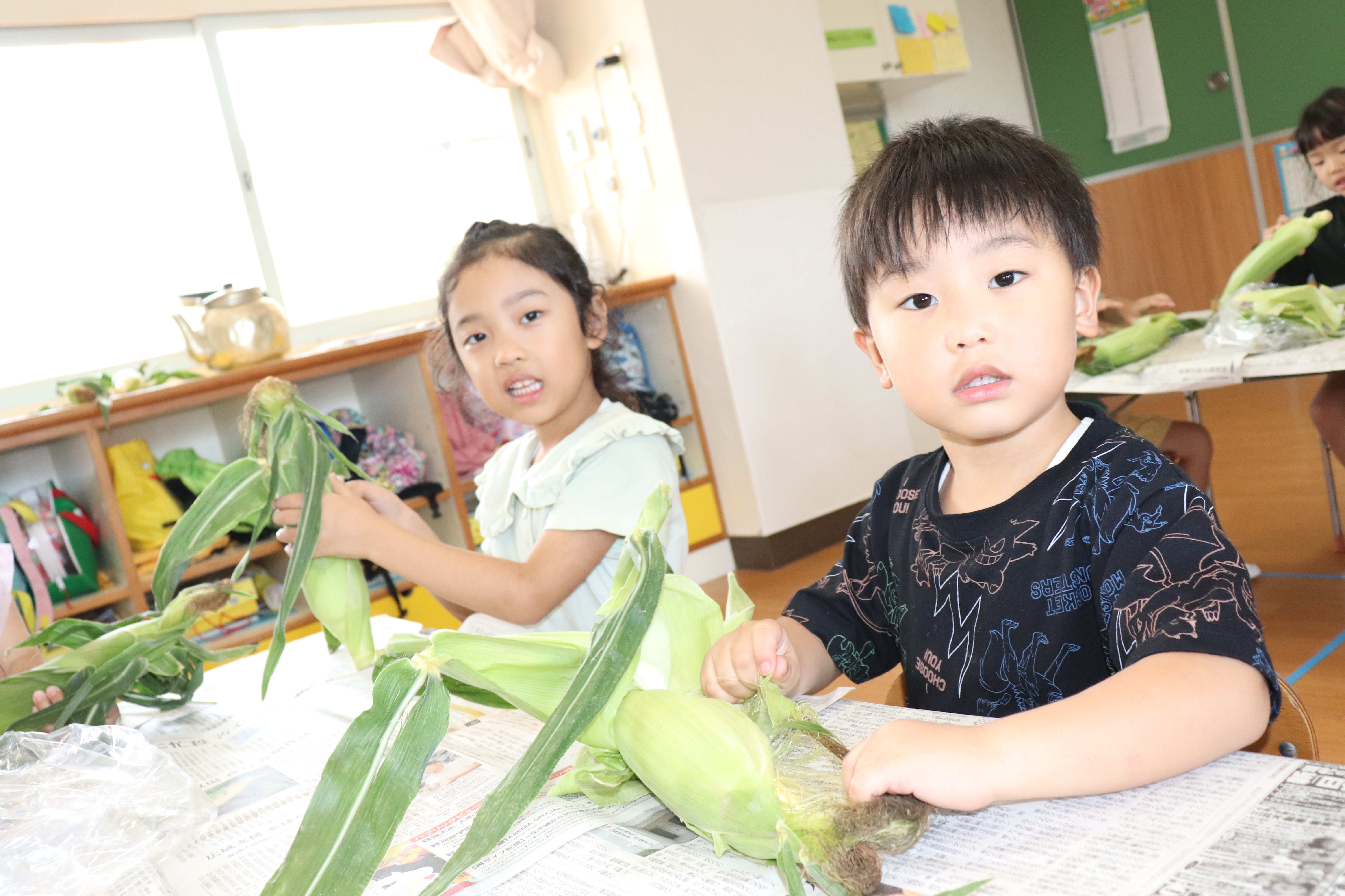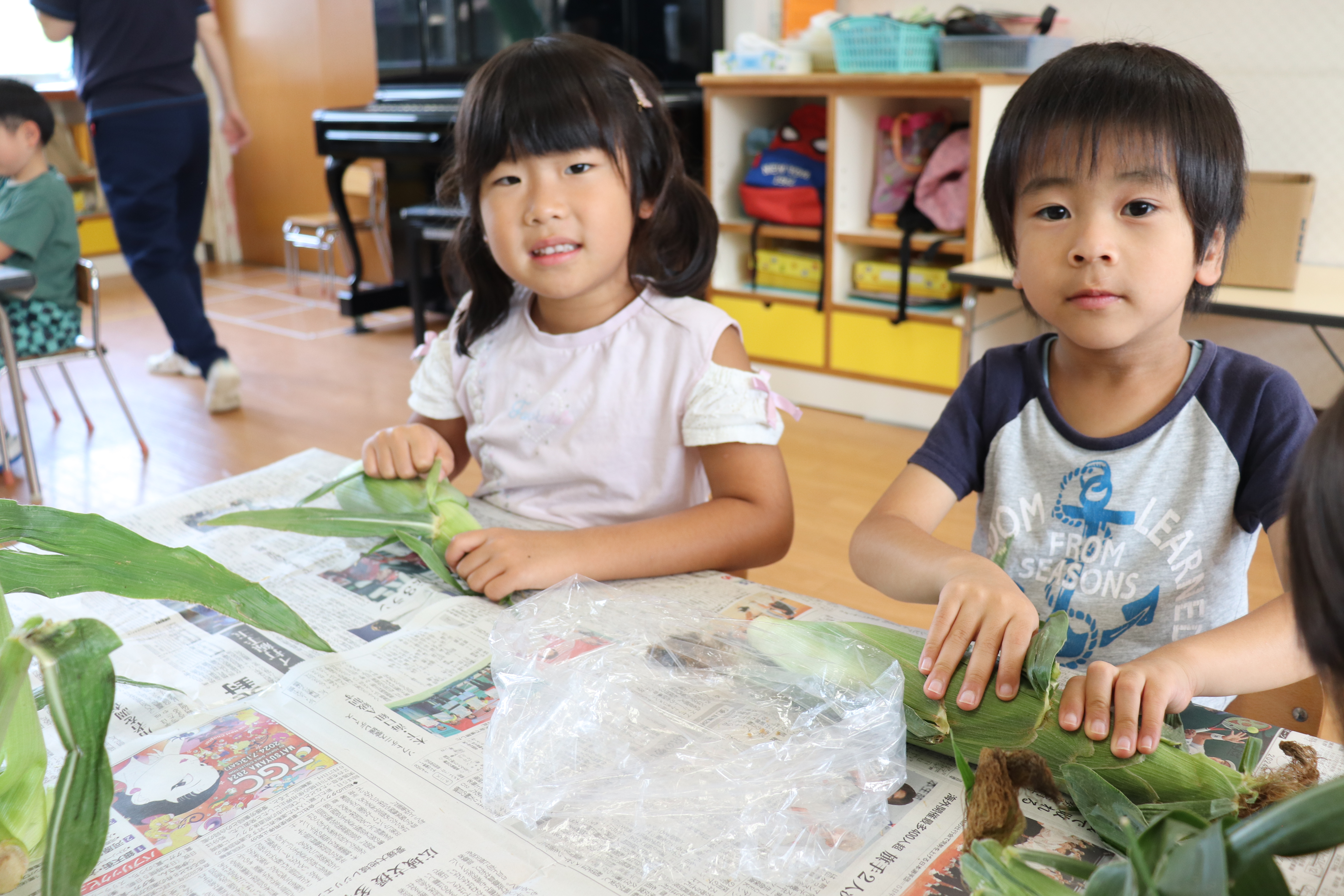 少し前の活動の様子にはなりますが…。トウモロコシの皮むきをしました(*^_^*) 皮がついている状態のトウモロコシを見るのは初めての子も多かったようで、皮をむいていくと絹糸がでてくることに「ひげみたい~!」「フワフワしとるね~!」など、初めて触る感触に喜びながら皮むきを楽しみ良い経験ができたようです♪ 皮むきしたトウモロコシは、おやつでおいしくいただきました(*^_^*)