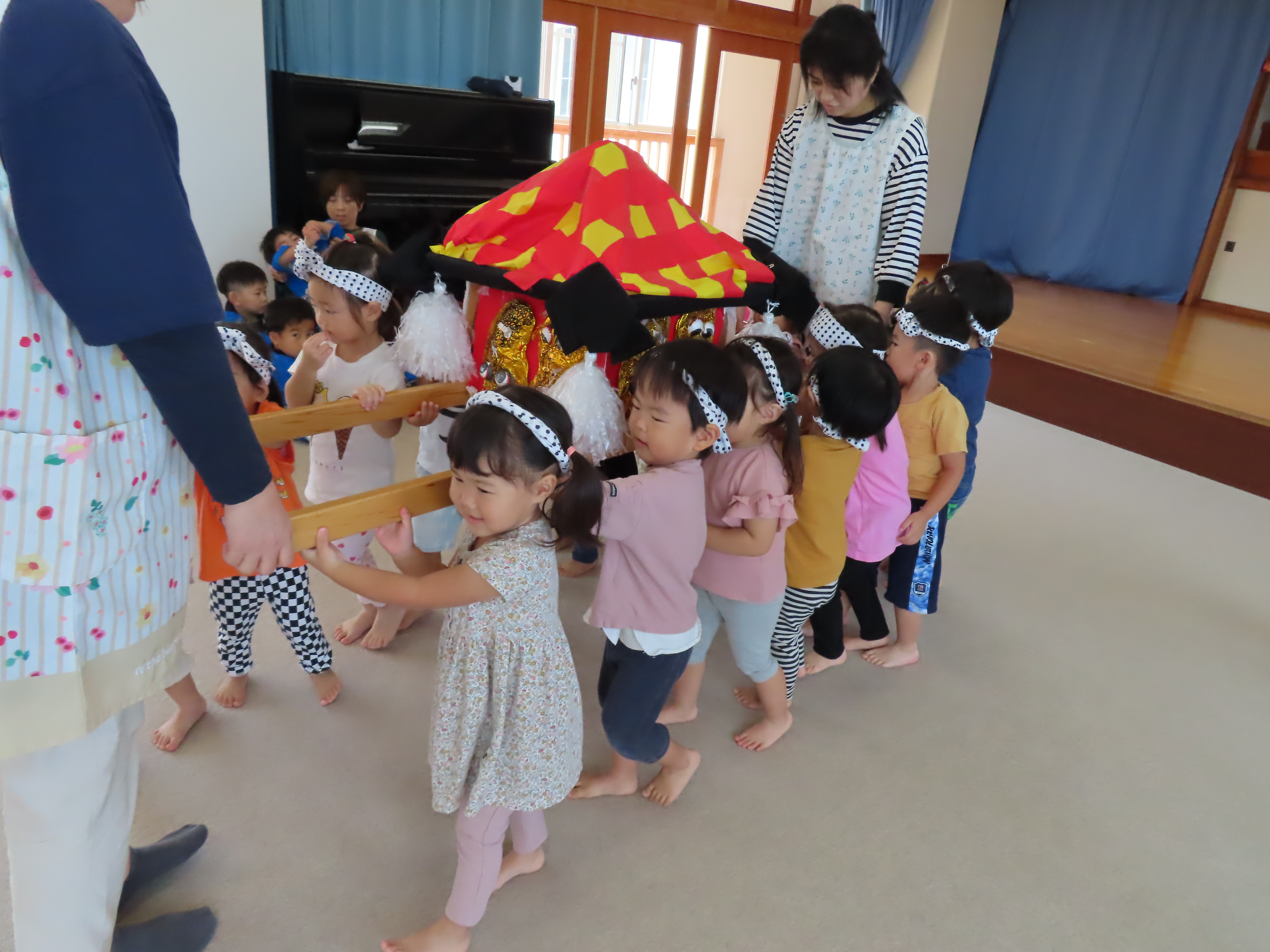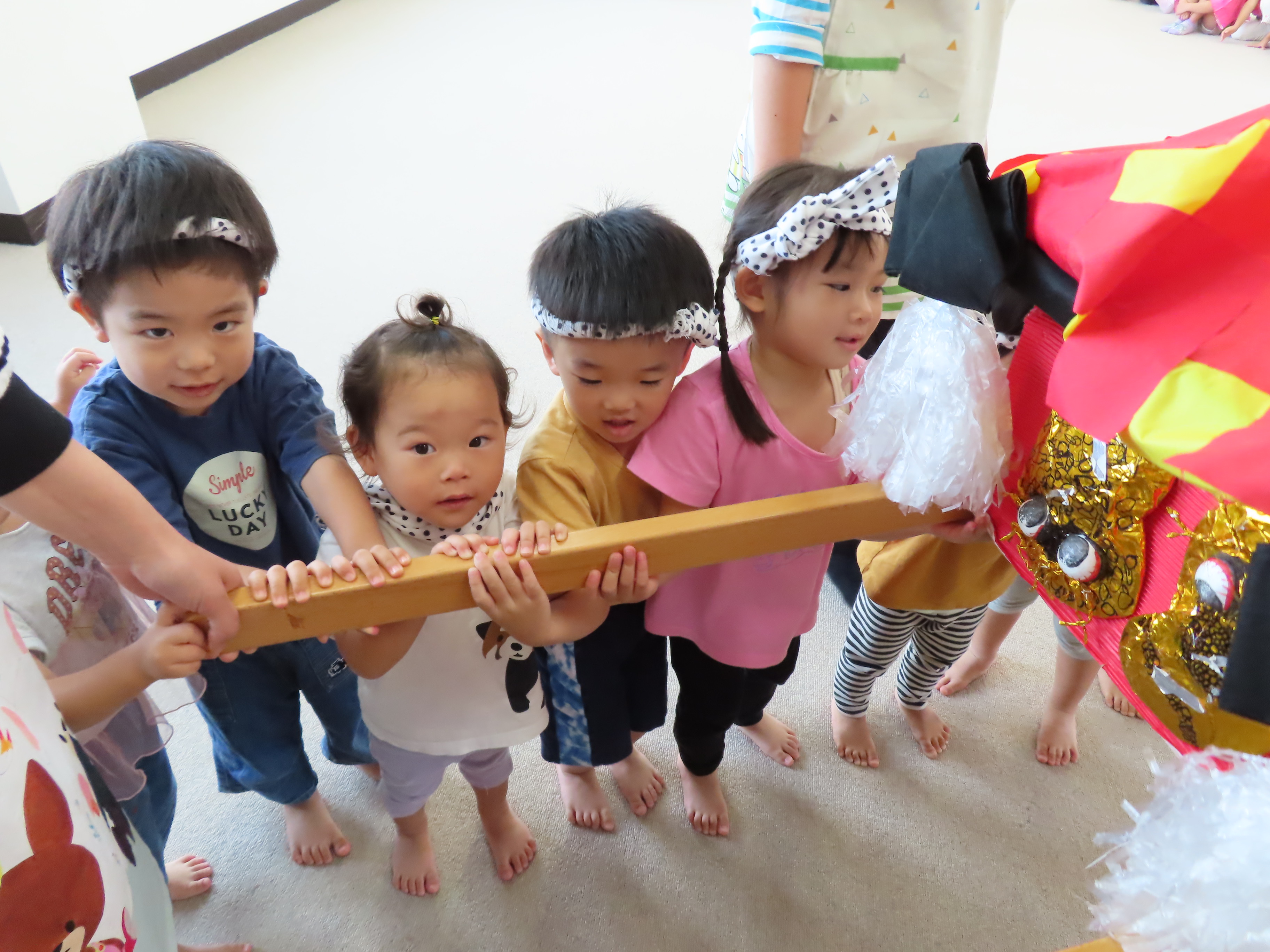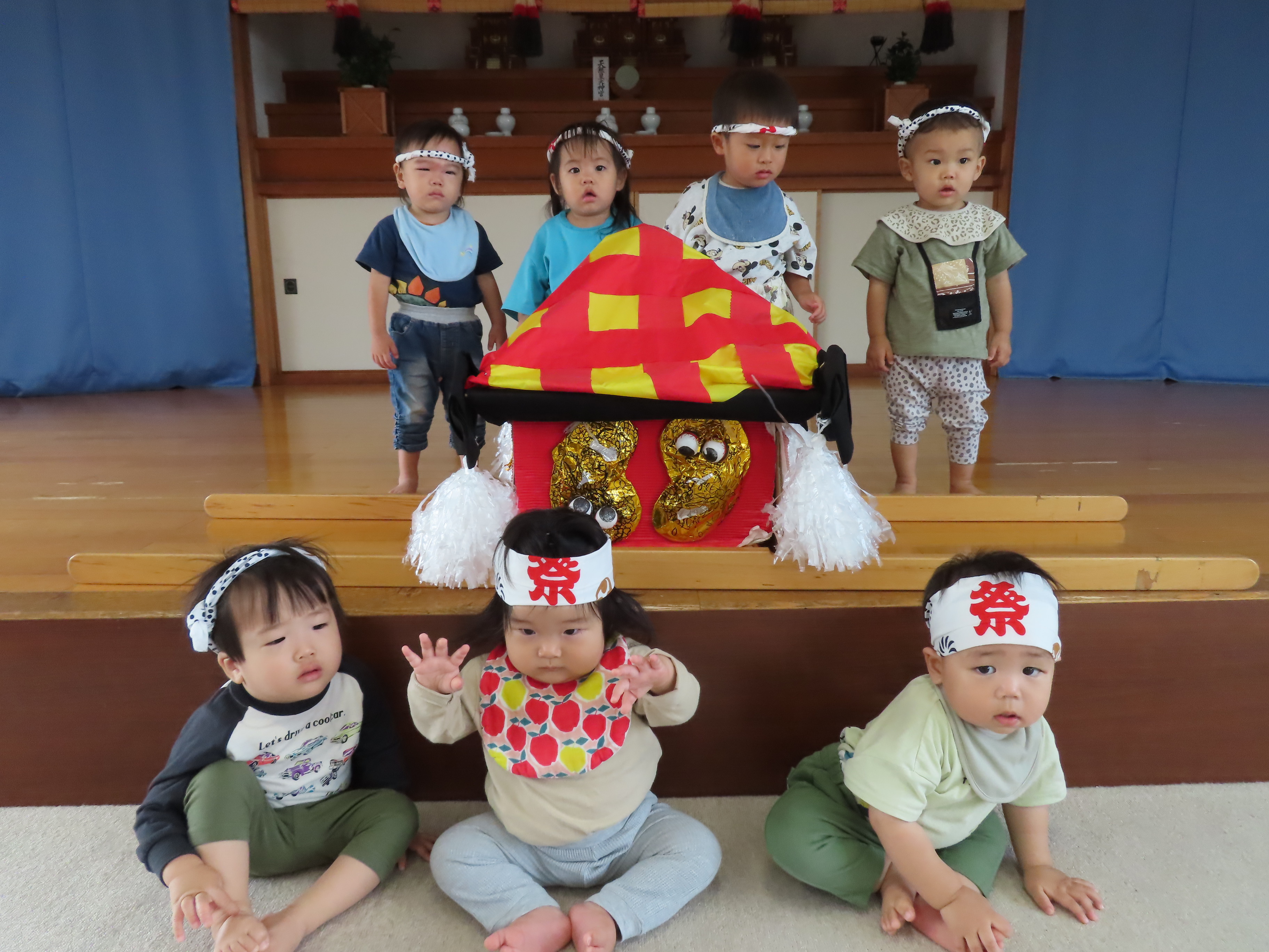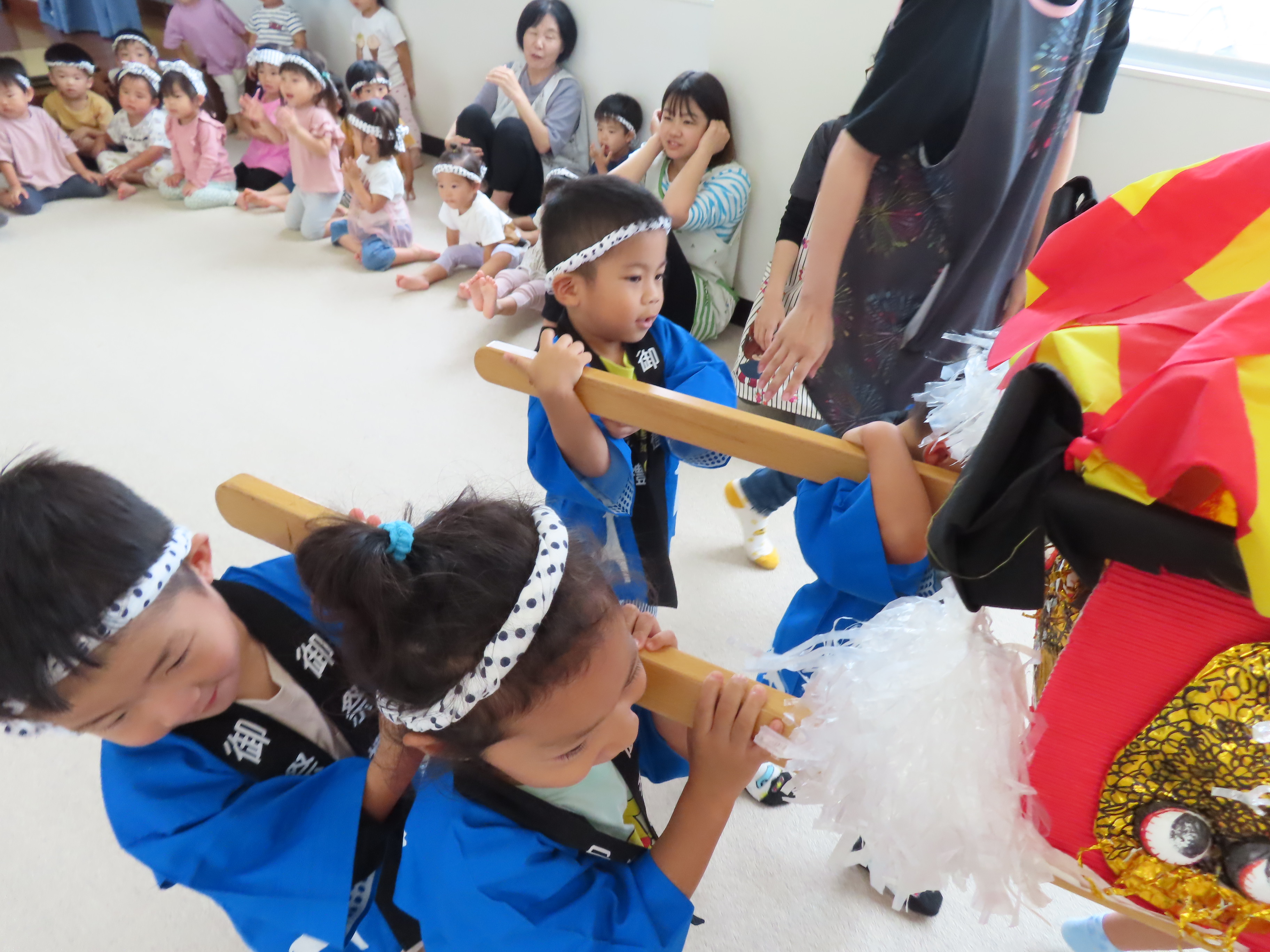 お祭り集会の様子です。ひまわり組さんが、太鼓を担ぎながら入場し盛り上げてくれました。乳児さんたちも、笛や太鼓のリズムに体を揺らしたり、一緒に「そ~りゃ~そぉ~りゃ~」と掛け声をかけてくれたりしながら、みんなでお祭りの雰囲気を楽しみました♪ ハッピも似合ってるでしょ!?