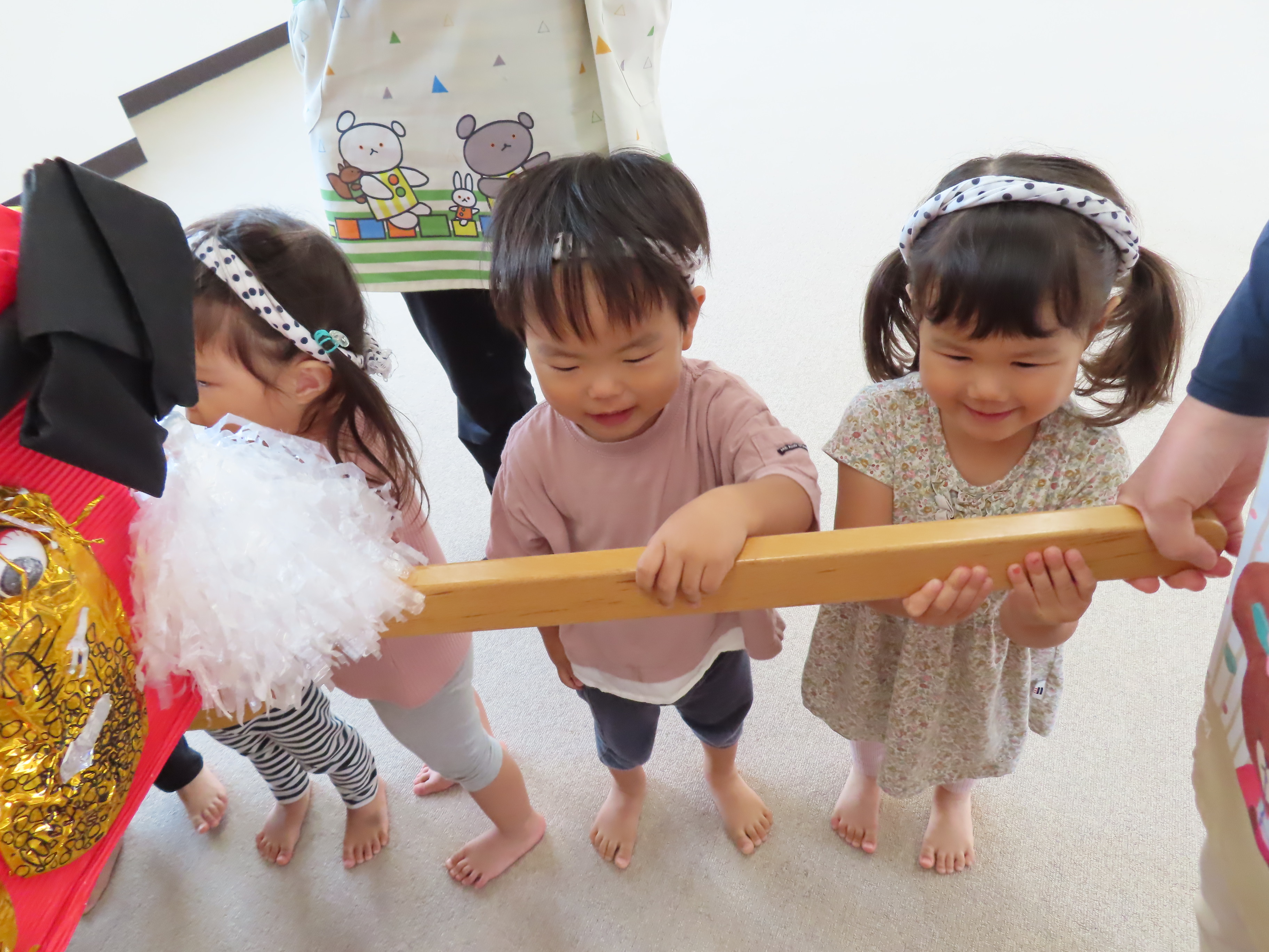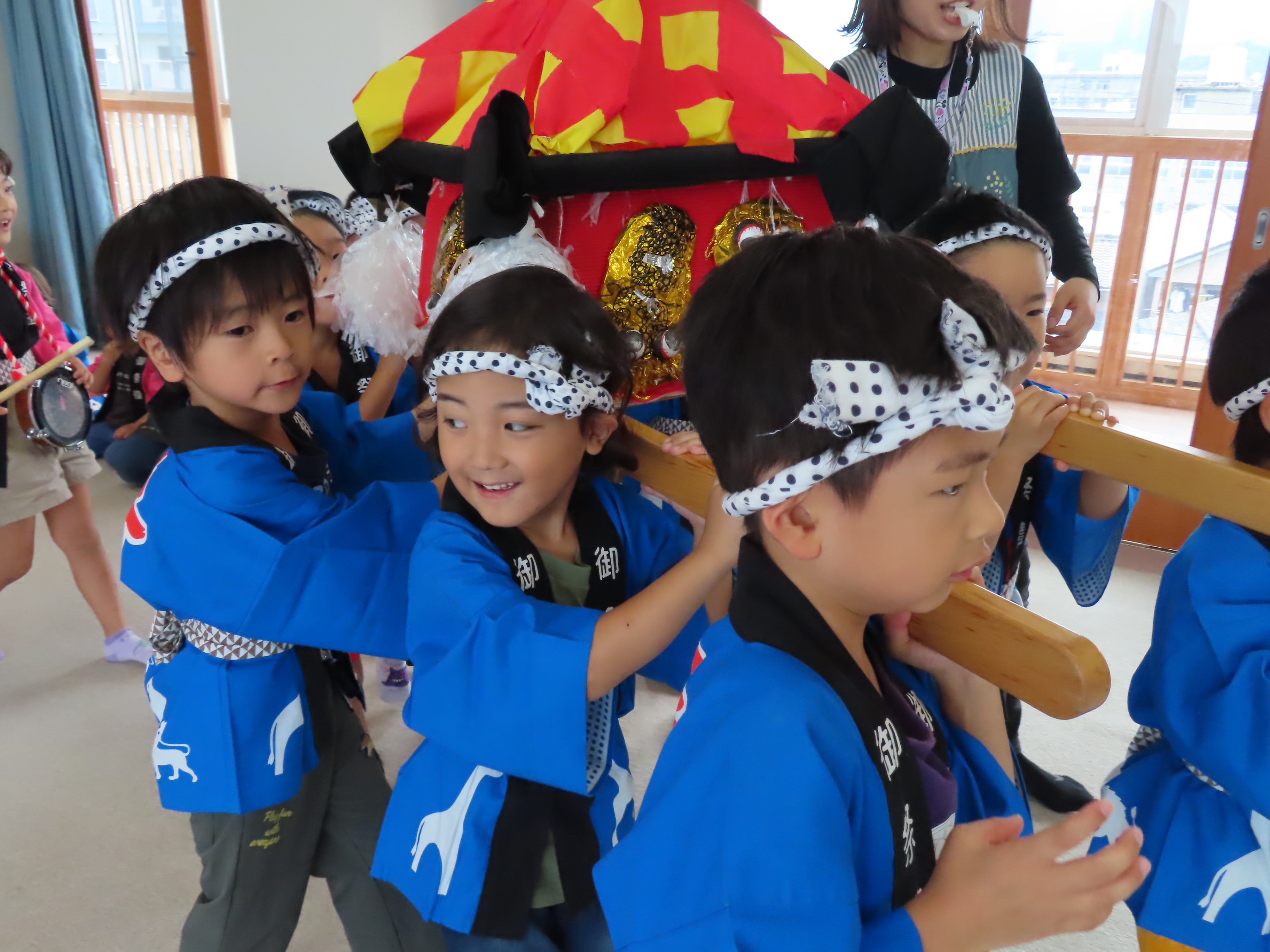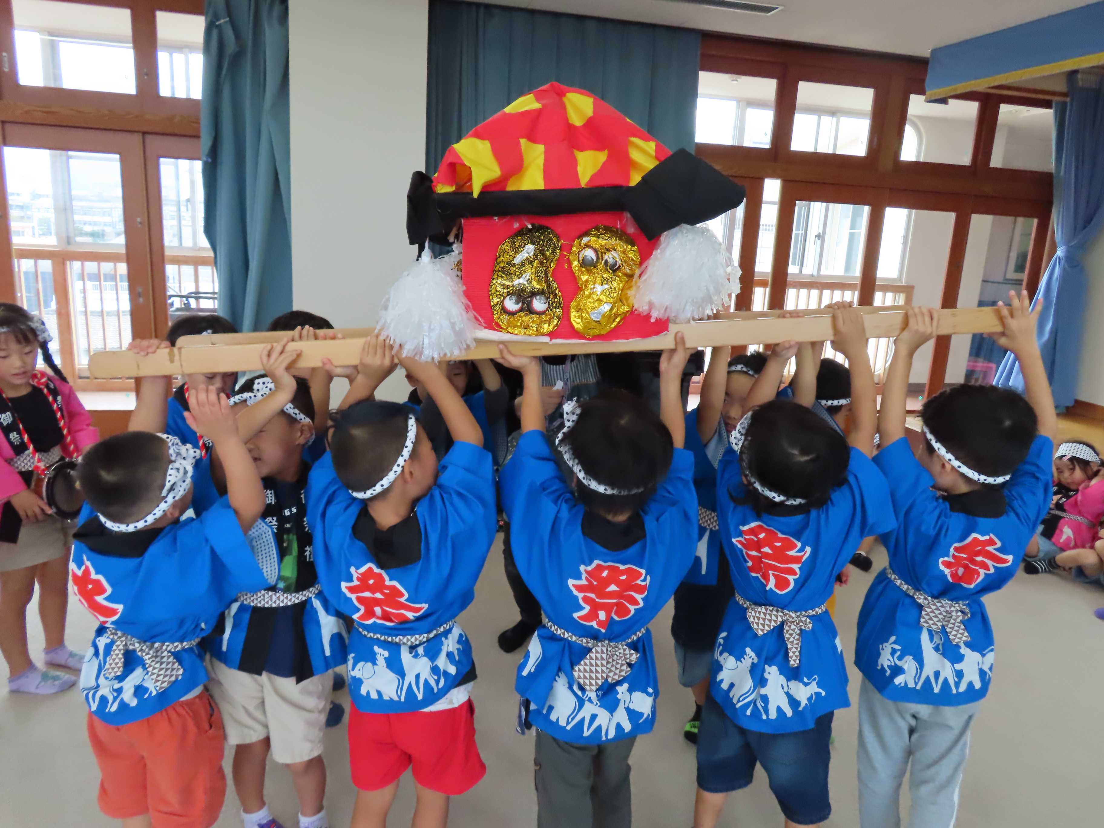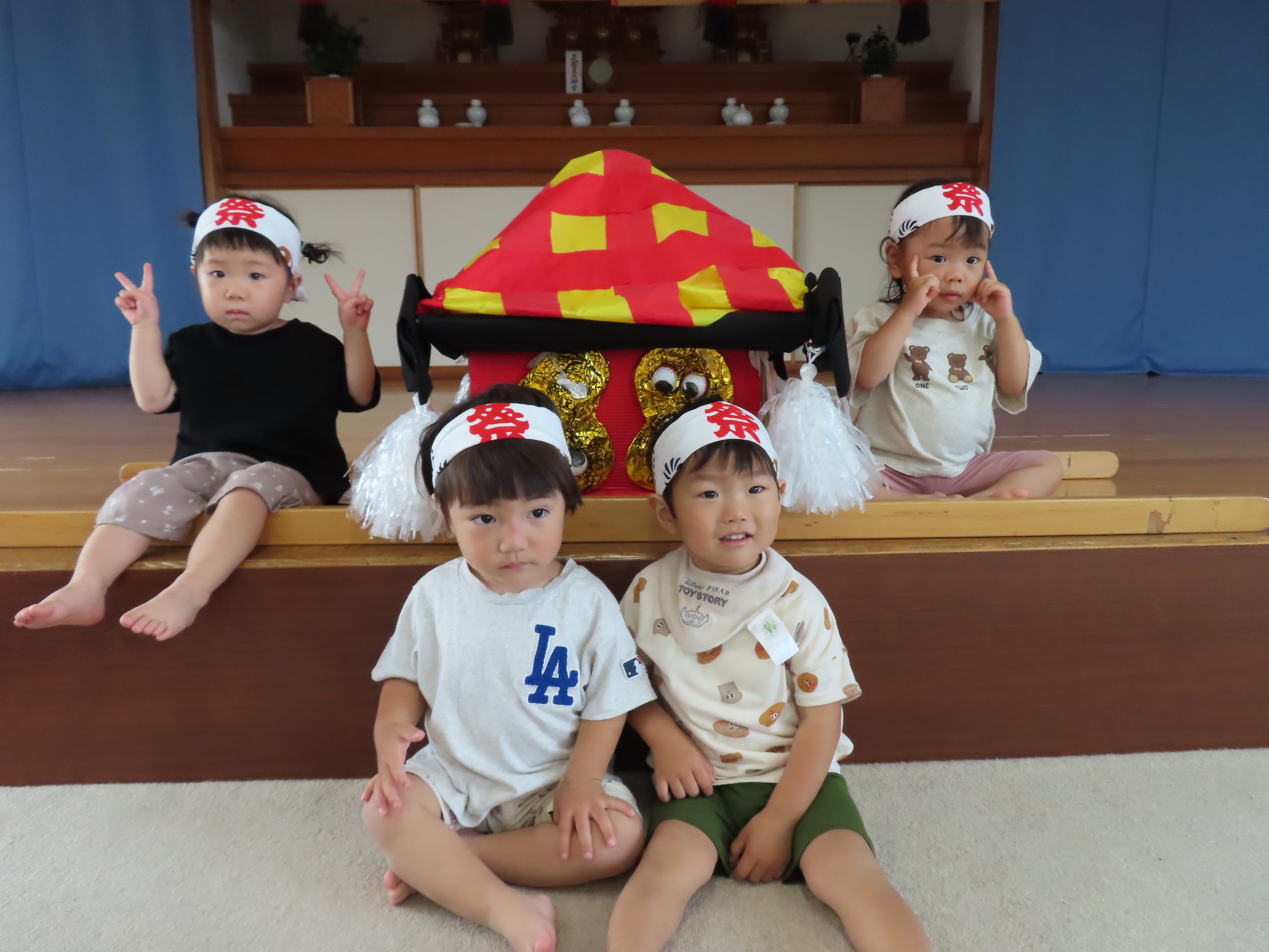 お祭り集会の様子です。ひまわり組さんが、太鼓を担ぎながら入場し盛り上げてくれました。乳児さんたちも、笛や太鼓のリズムに体を揺らしたり、一緒に「そ~りゃ~そぉ~りゃ~」と掛け声をかけてくれたりしながら、みんなでお祭りの雰囲気を楽しみました♪ ハッピも似合ってるでしょ!?