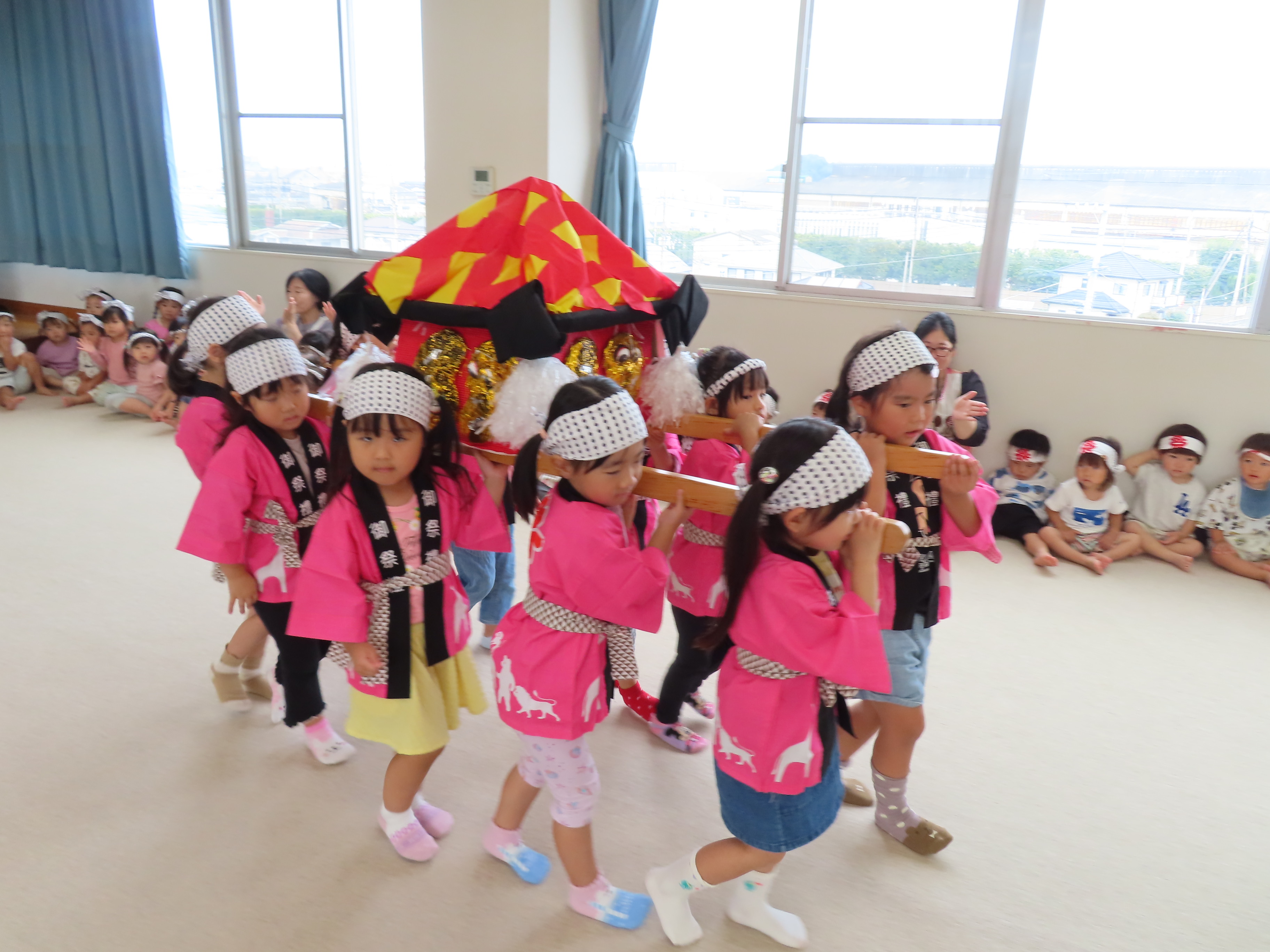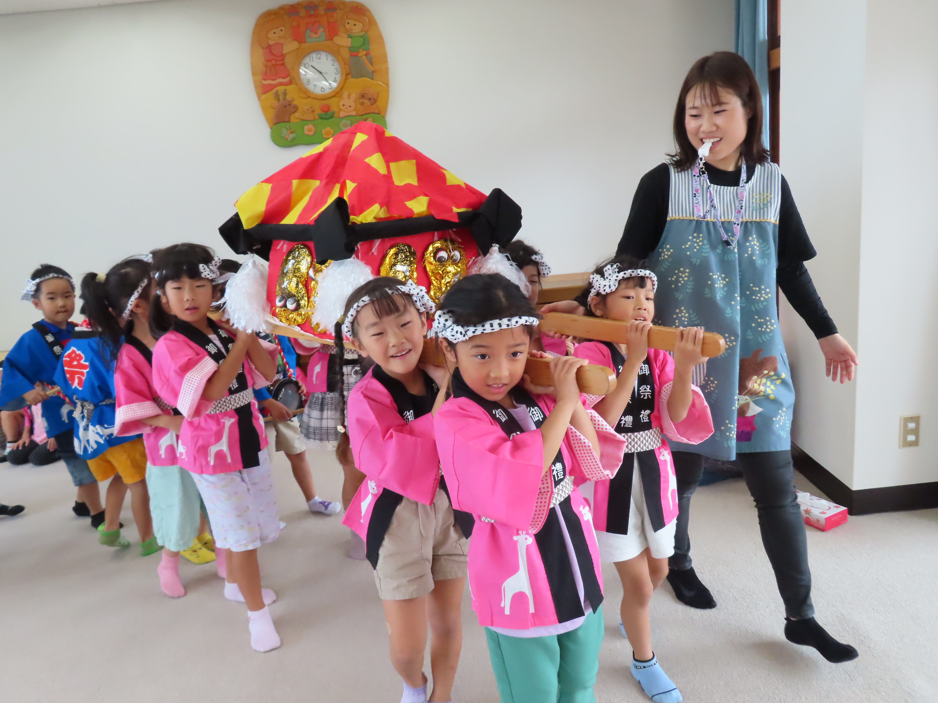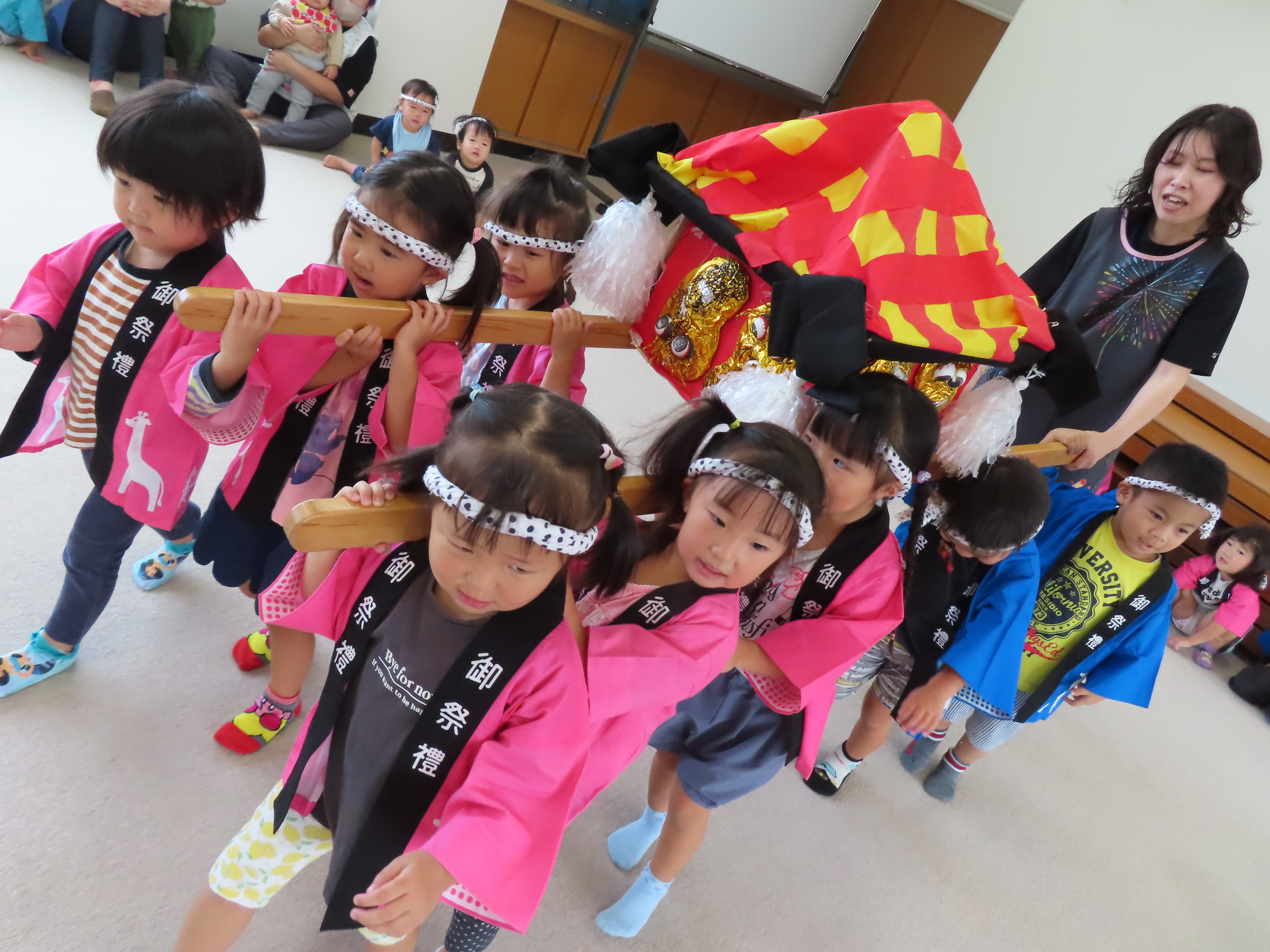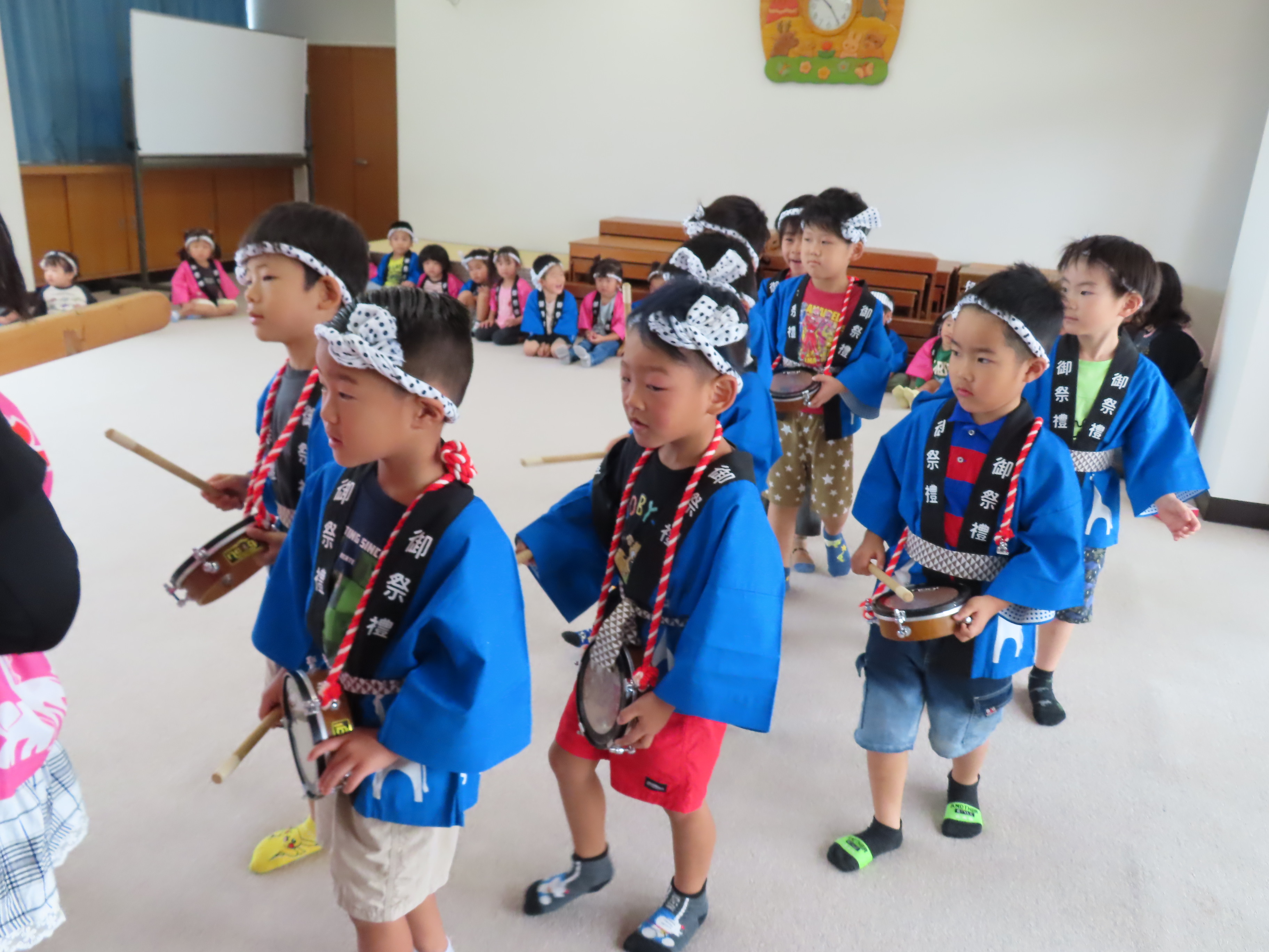 お祭り集会の様子です。ひまわり組さんが、太鼓を担ぎながら入場し盛り上げてくれました。乳児さんたちも、笛や太鼓のリズムに体を揺らしたり、一緒に「そ~りゃ~そぉ~りゃ~」と掛け声をかけてくれたりしながら、みんなでお祭りの雰囲気を楽しみました♪ ハッピも似合ってるでしょ!?