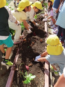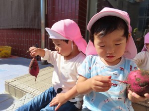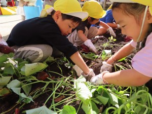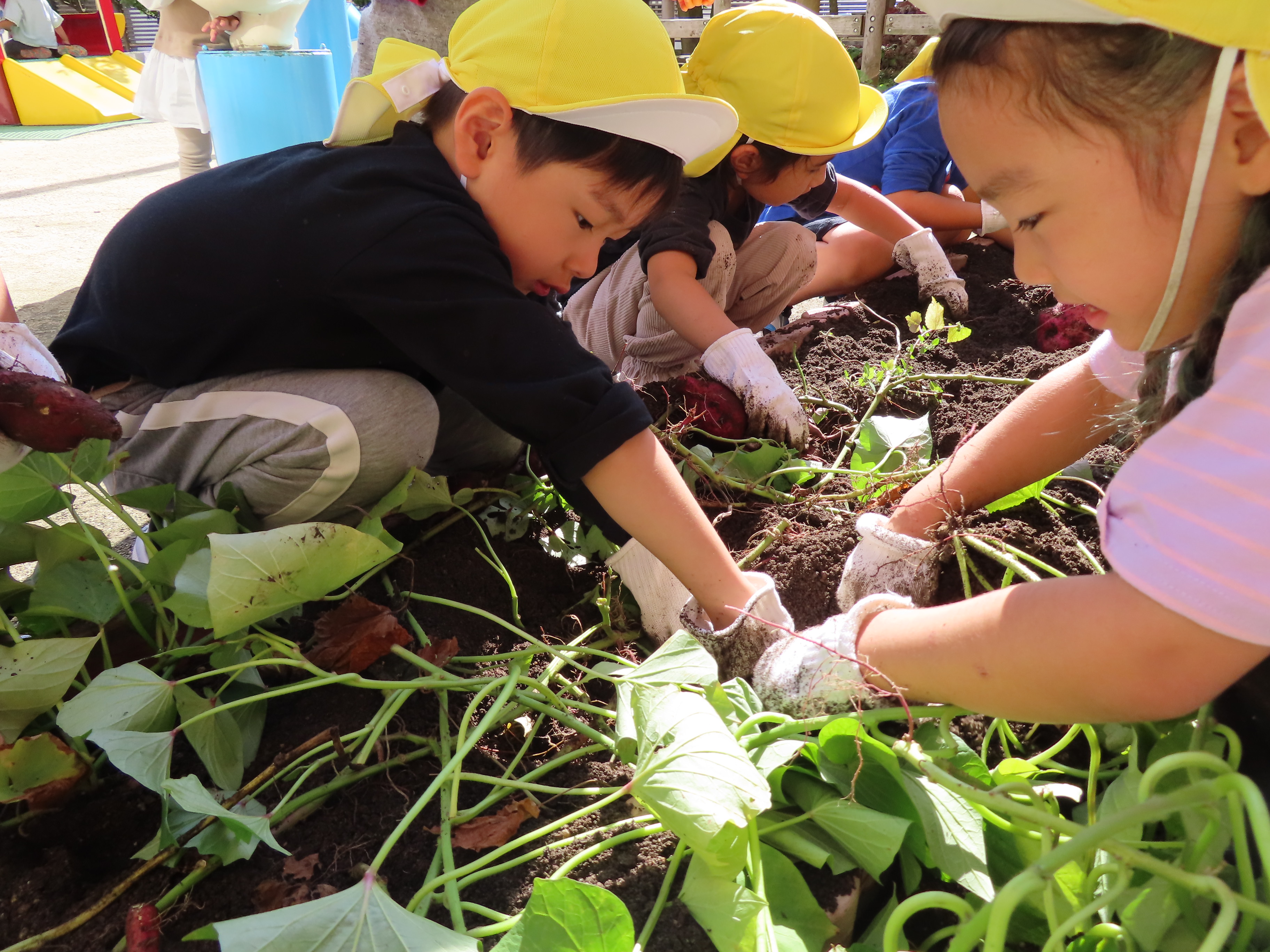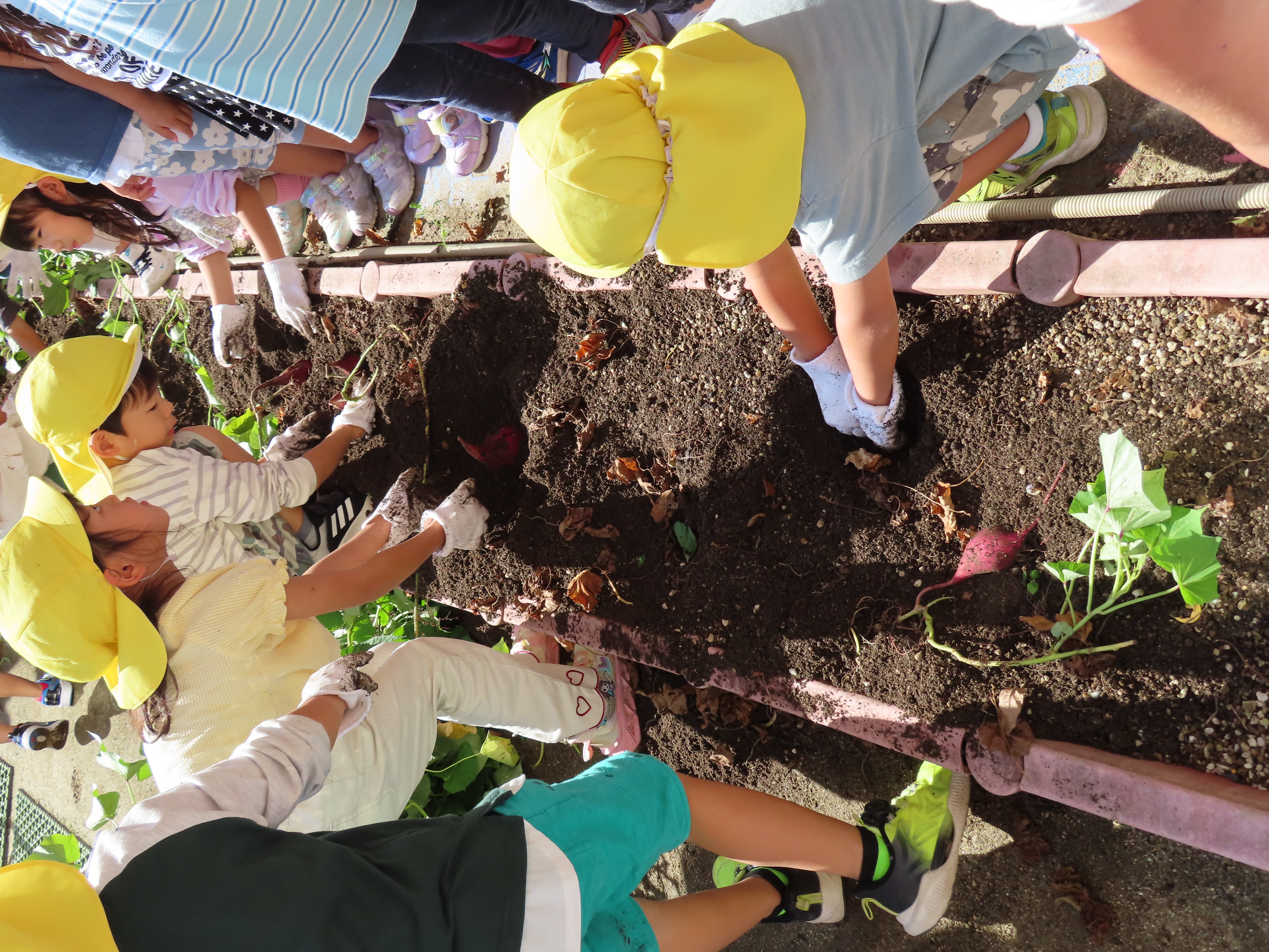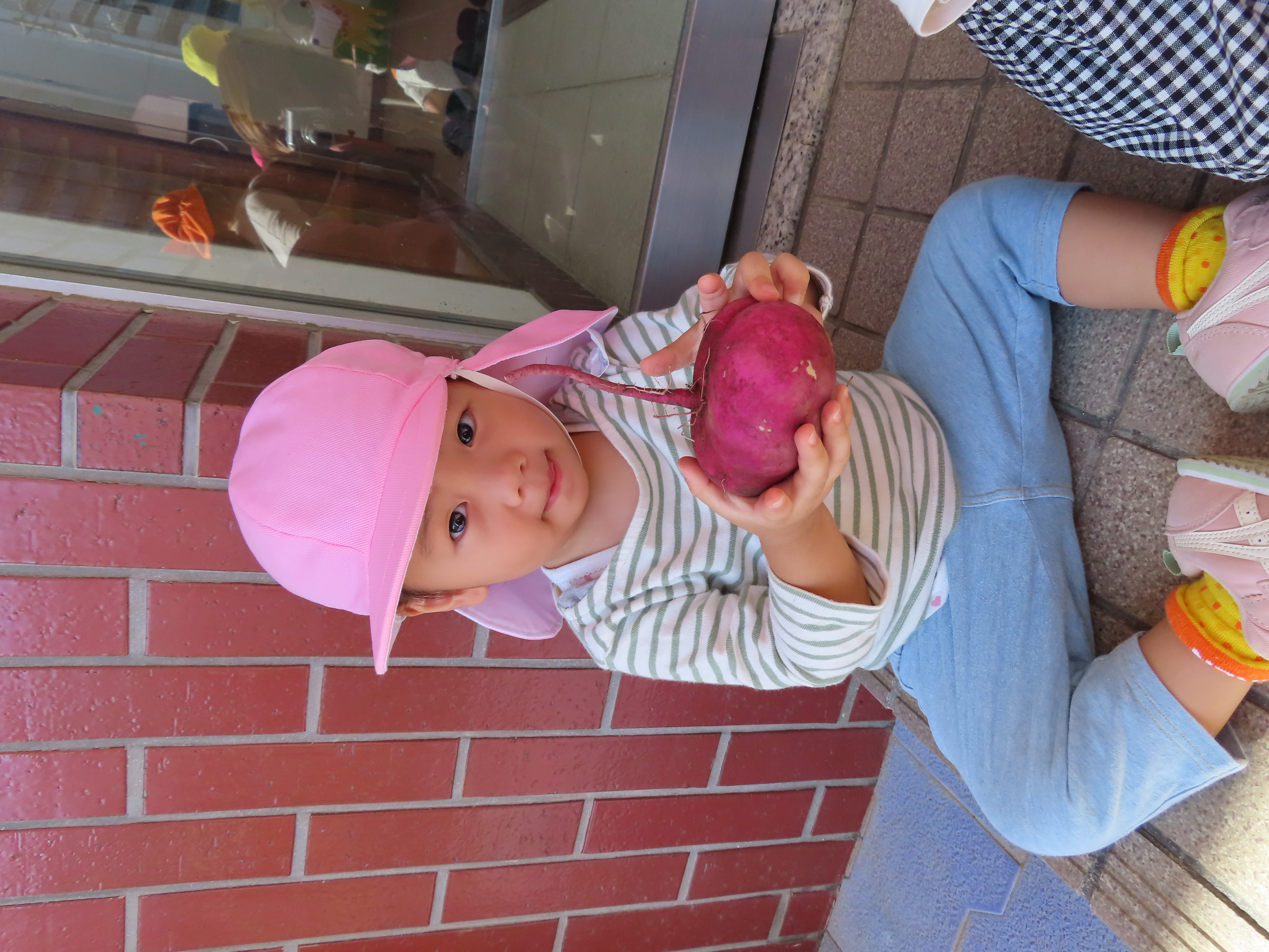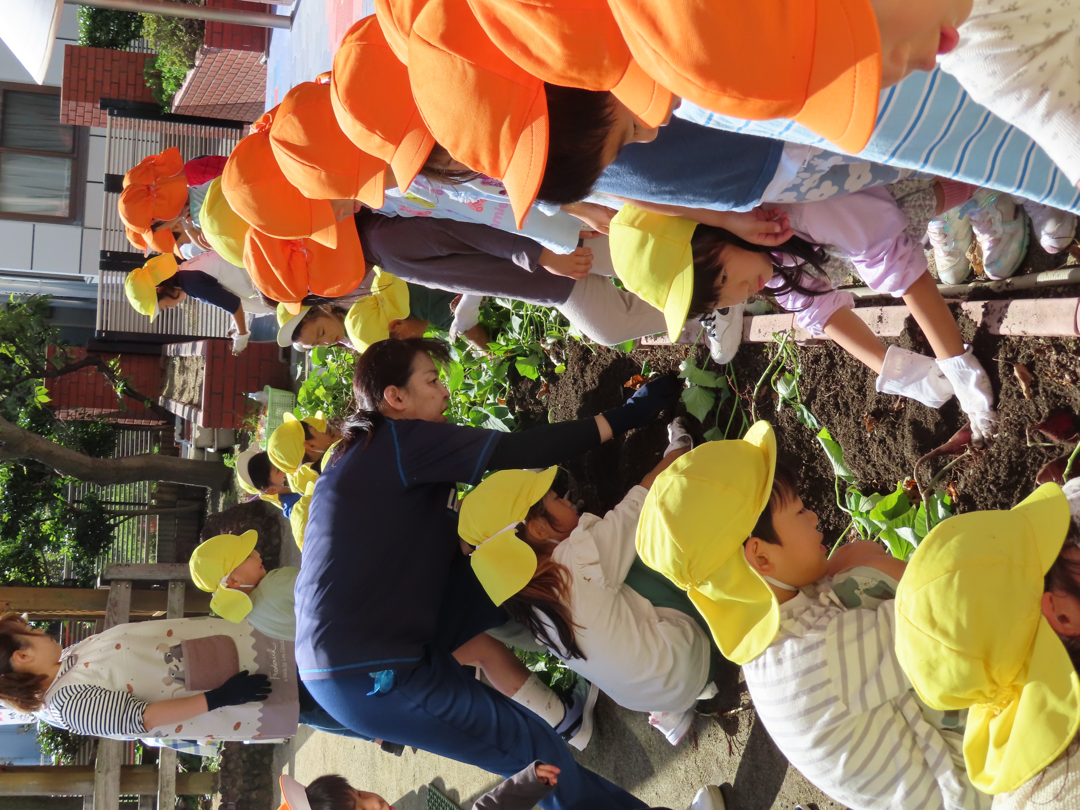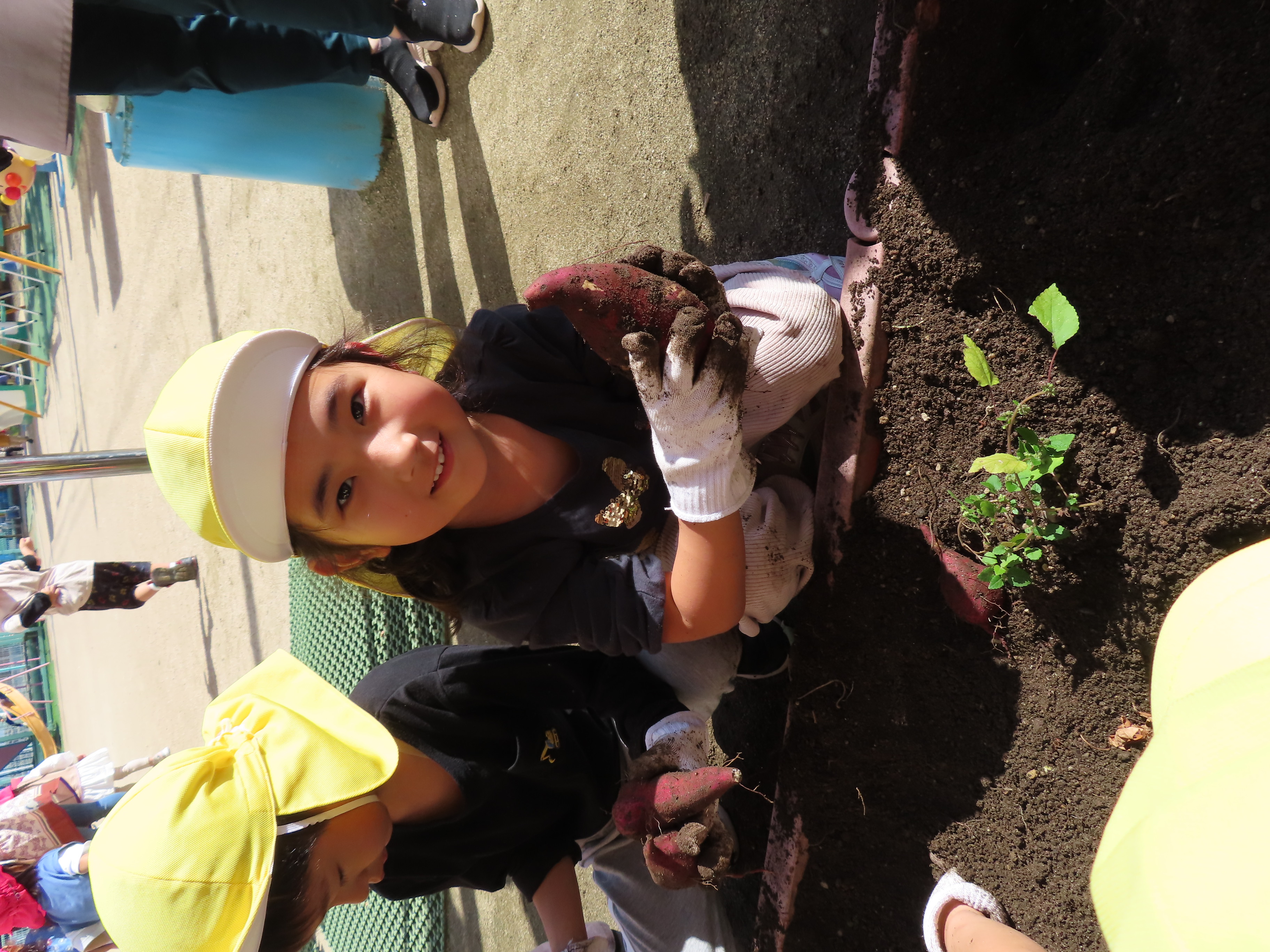 春に苗を植えたさつま芋が育ったので、お芋ほりをしました(*^_^*) どれだけさつま芋が育っているか保育士にも見当がつかず、ドキドキしながらの収穫でしたが、大きなさつま芋が獲れて、保育士は一安心!子どもは、大喜び!な芋ほりとなりました(*^_^*)