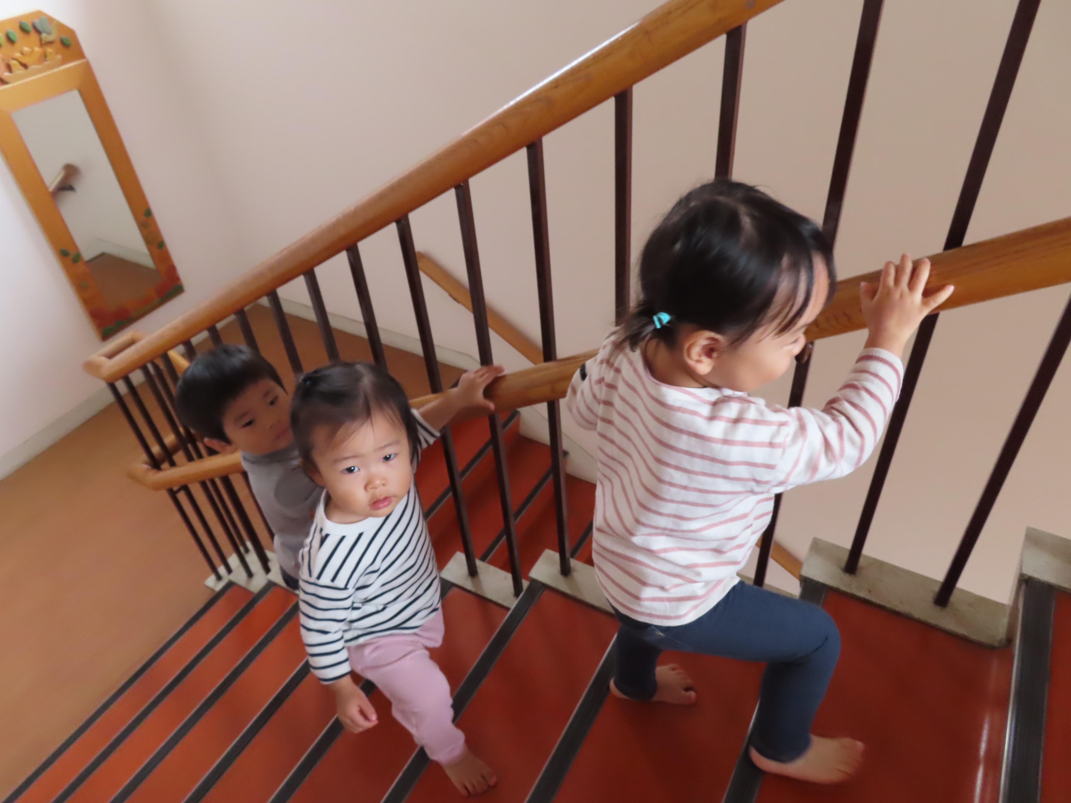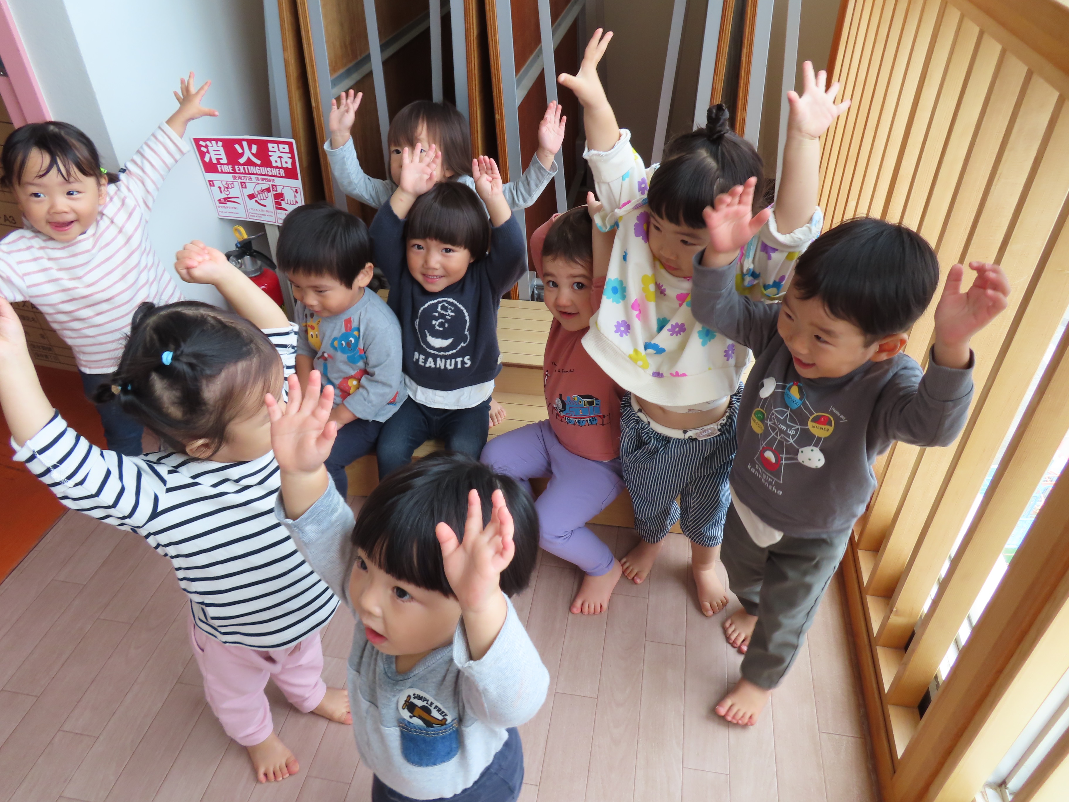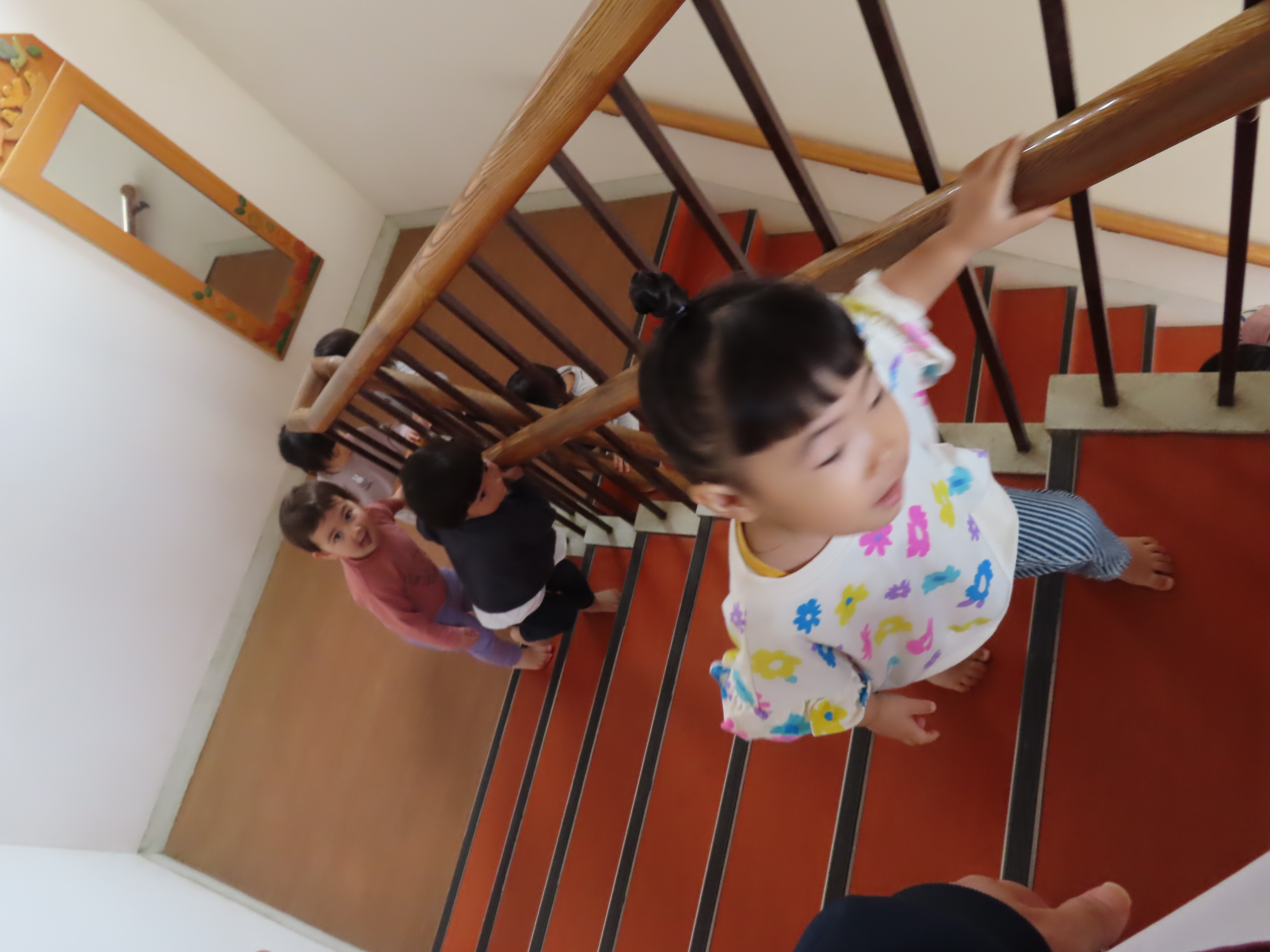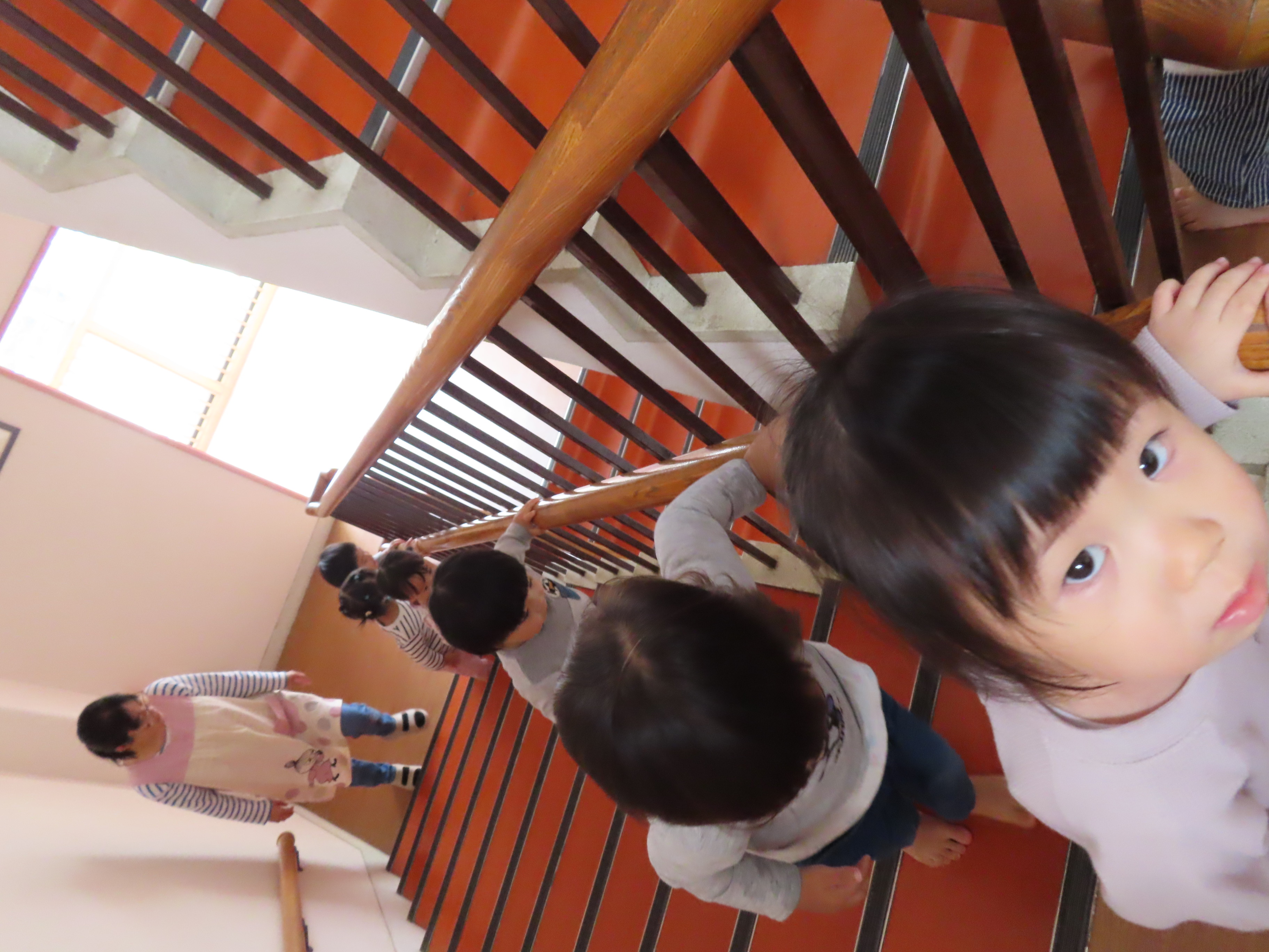もも組、階段練習をしてきました~!!1階から4階までの距離をなんなくクリア~☆先に4階にゴールしたお友だちが、まだ階段途中のお友だちに「がんばれ~!!」と応援してあげたりする姿も♡ 全員が4階まで上がりきって、最後はみんなで「バンザ~イ!!」しましたっ(笑)