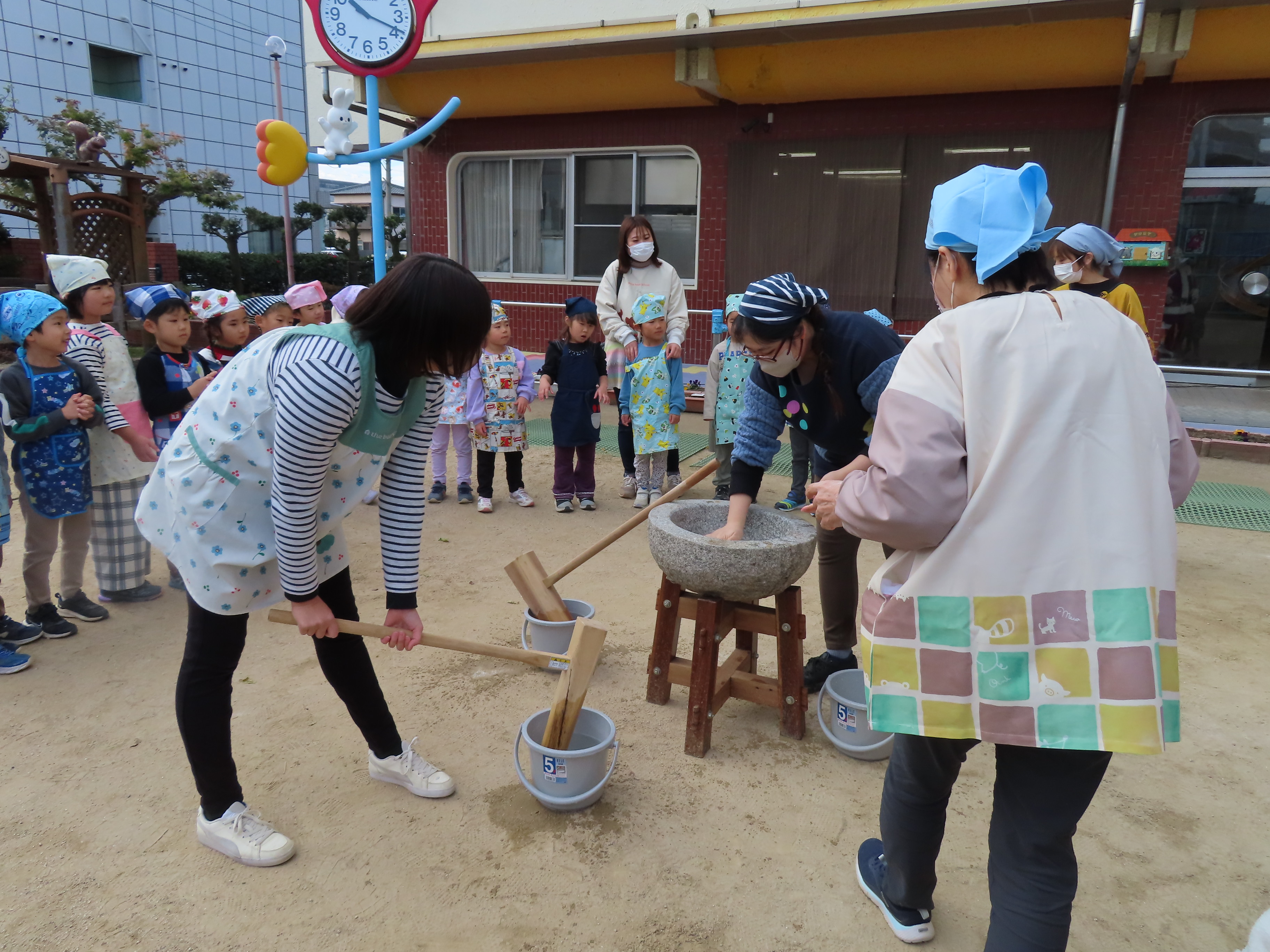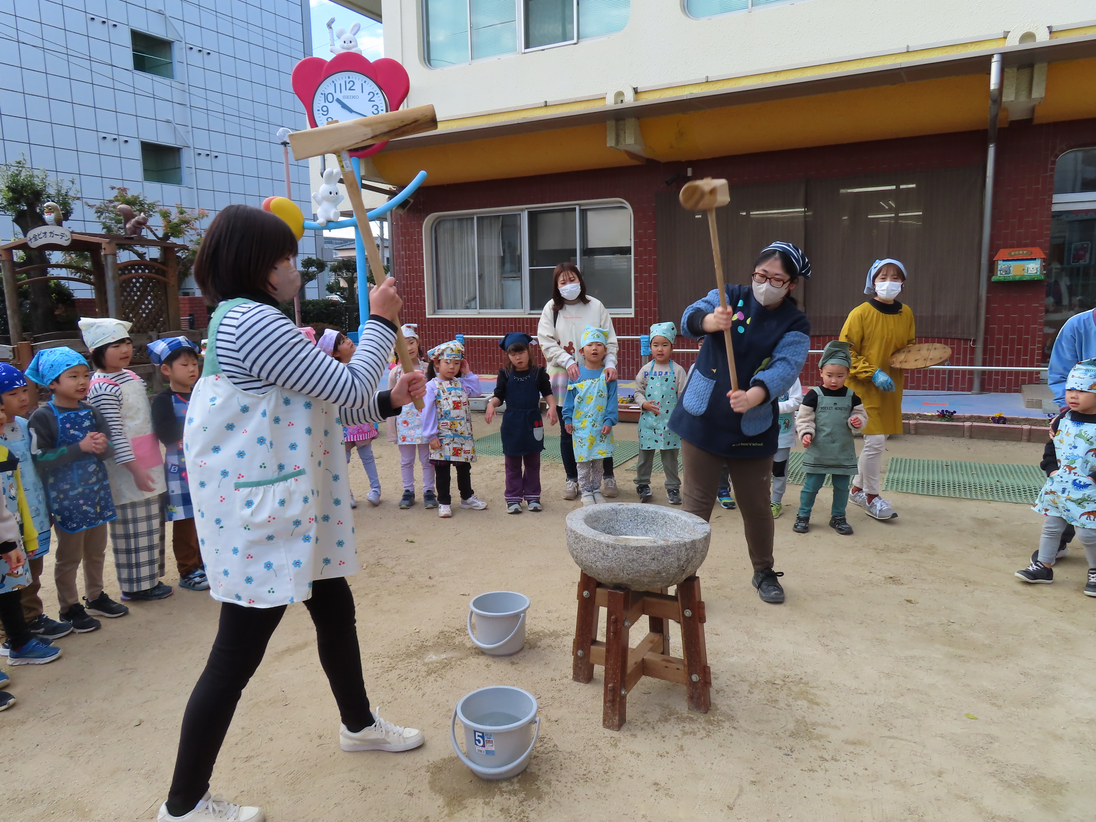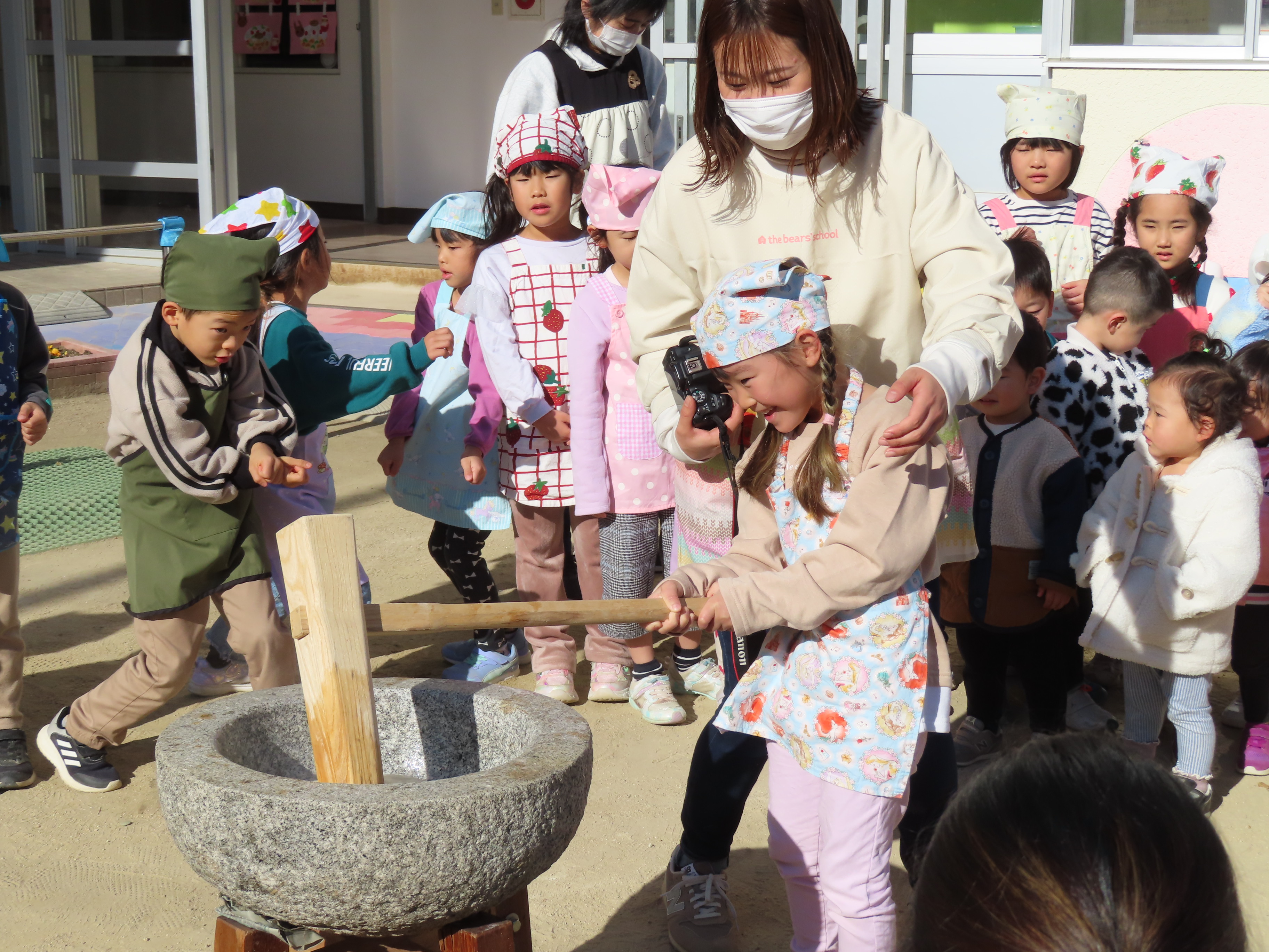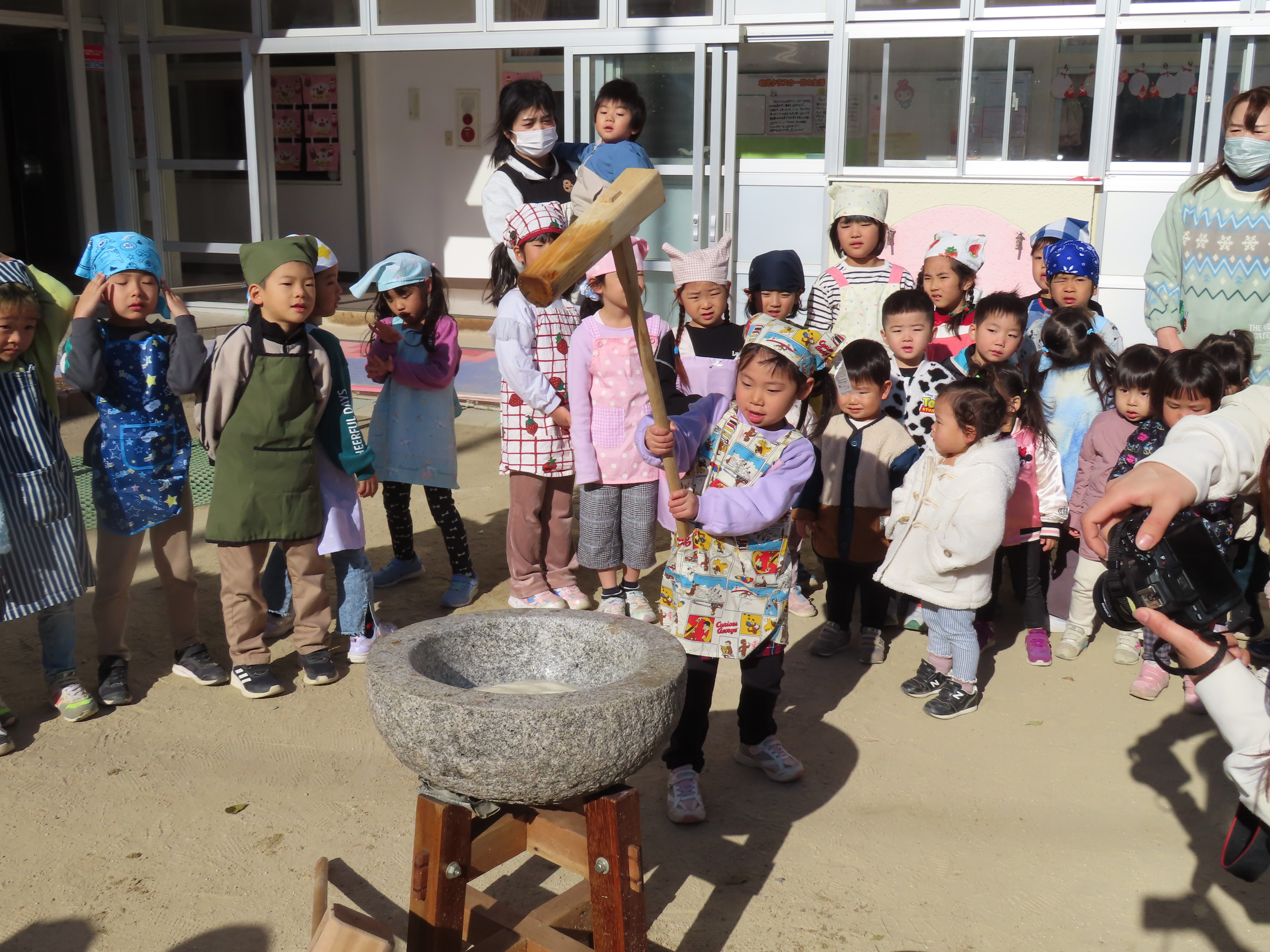 おもちつきをしました!保育士たち、子どもたちからの「がんばれ~」の声援を力に変えて、ぺったんぺったんと頑張ってお餅をつきました!! 年長児さんは、実際に杵を持っておもちつきを体験しましたよ♪ 子どもたちは、お餅ではなく・・・丸めたあんこを食べましたぁ~!!「おもちたべたぁ~い!!」と残念がってはいましたが・・・ おもちが出来上がっていく様子を、子どもたちに実際に見せてあげることができて良かったです☆
