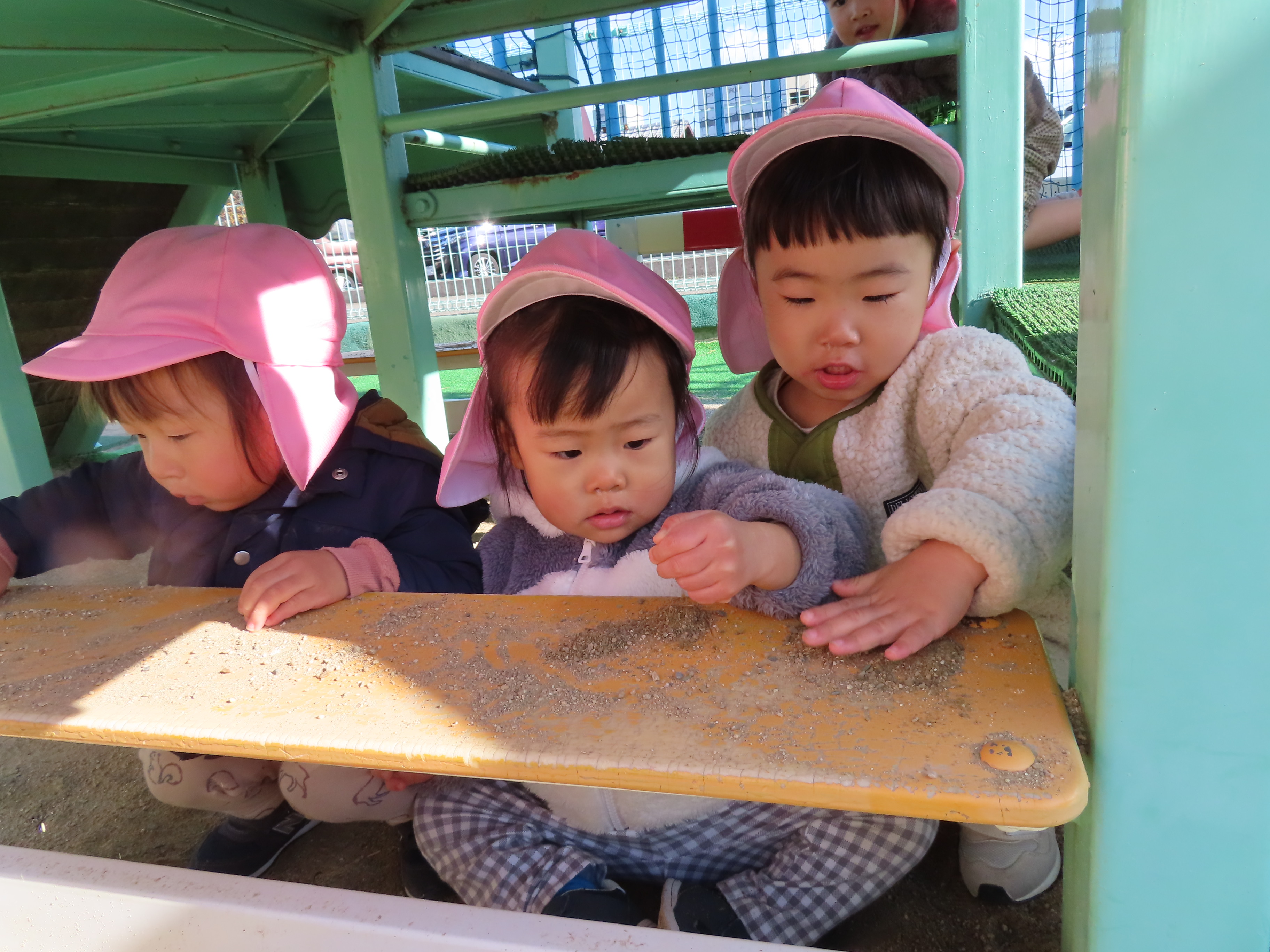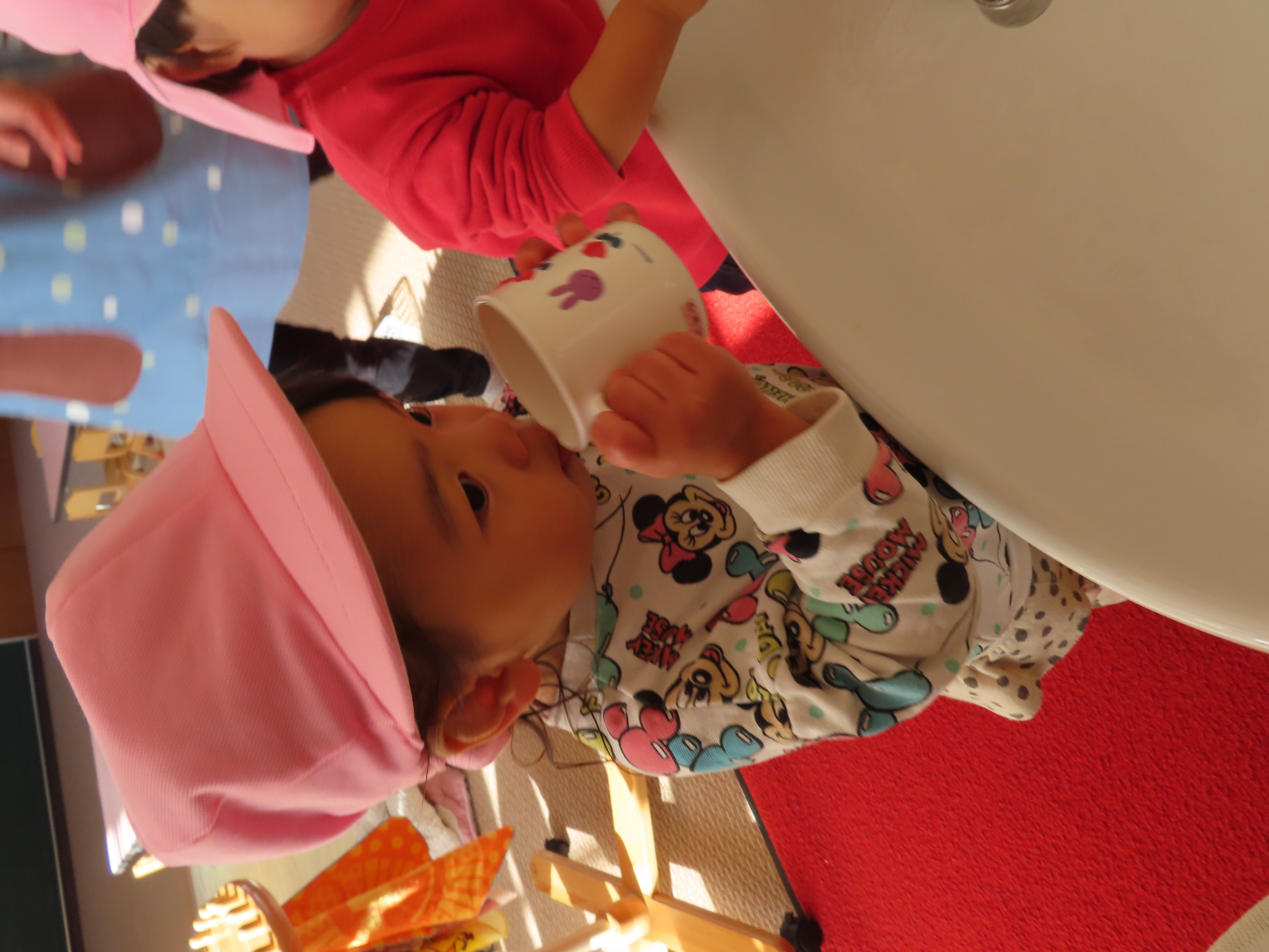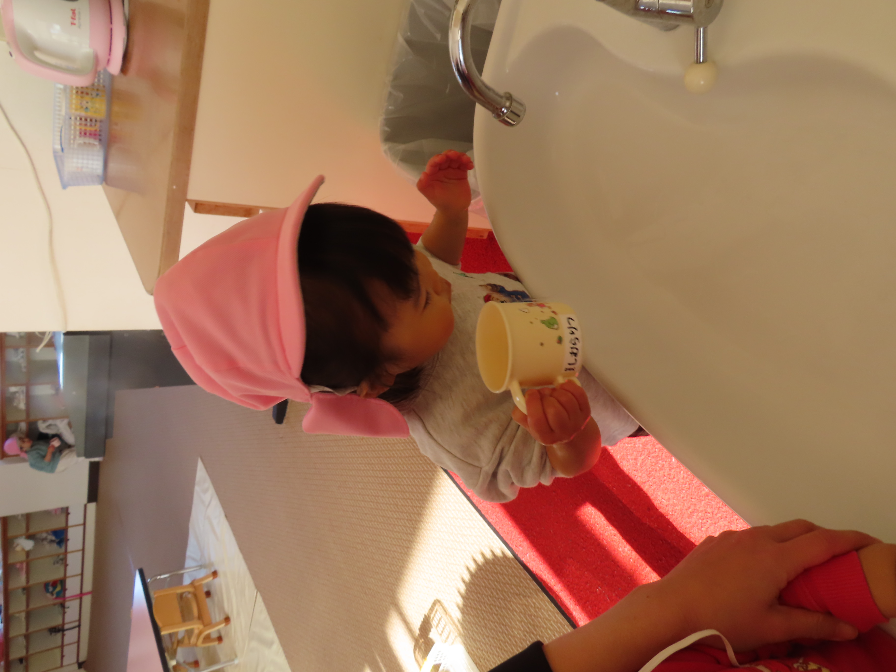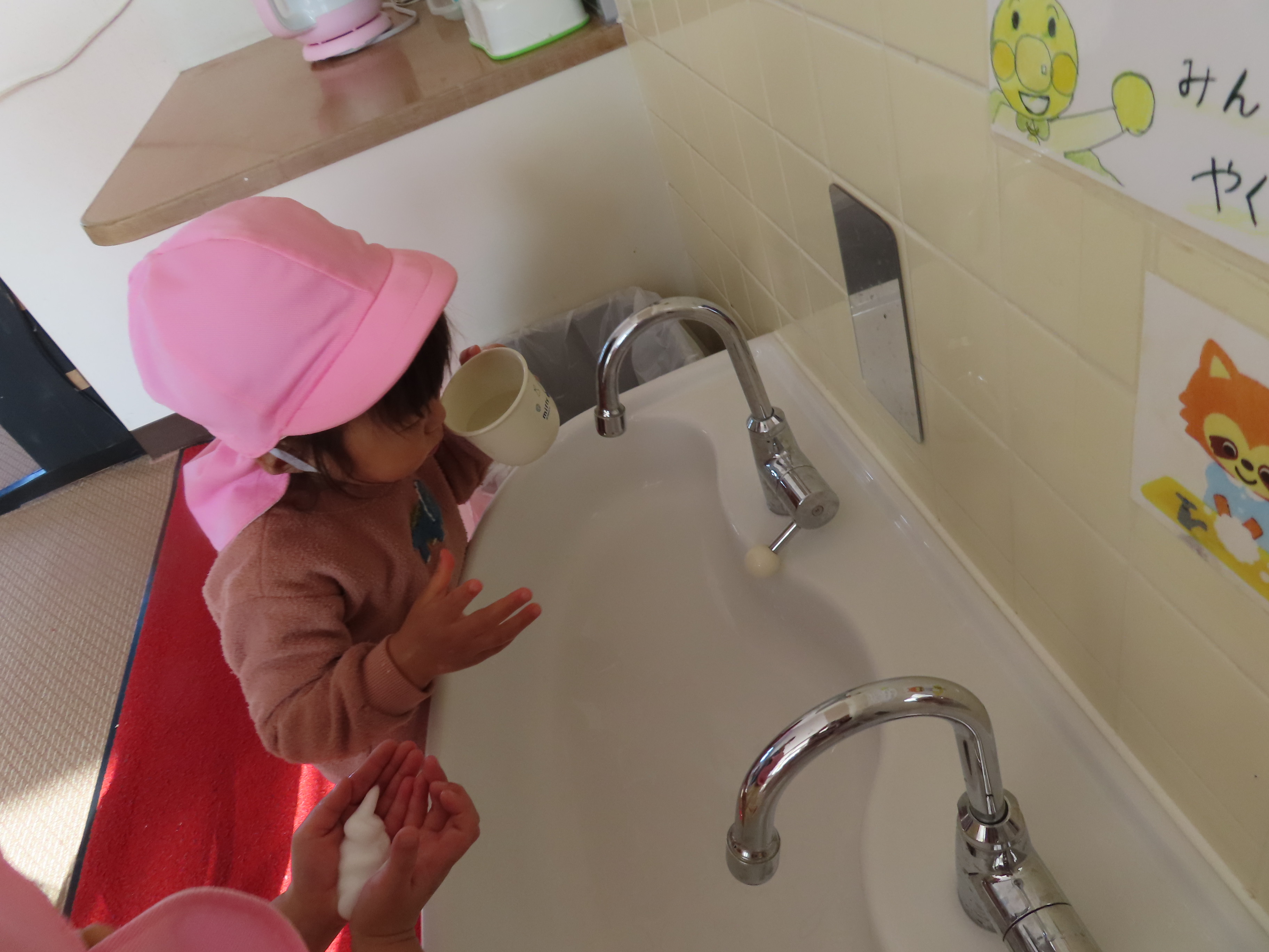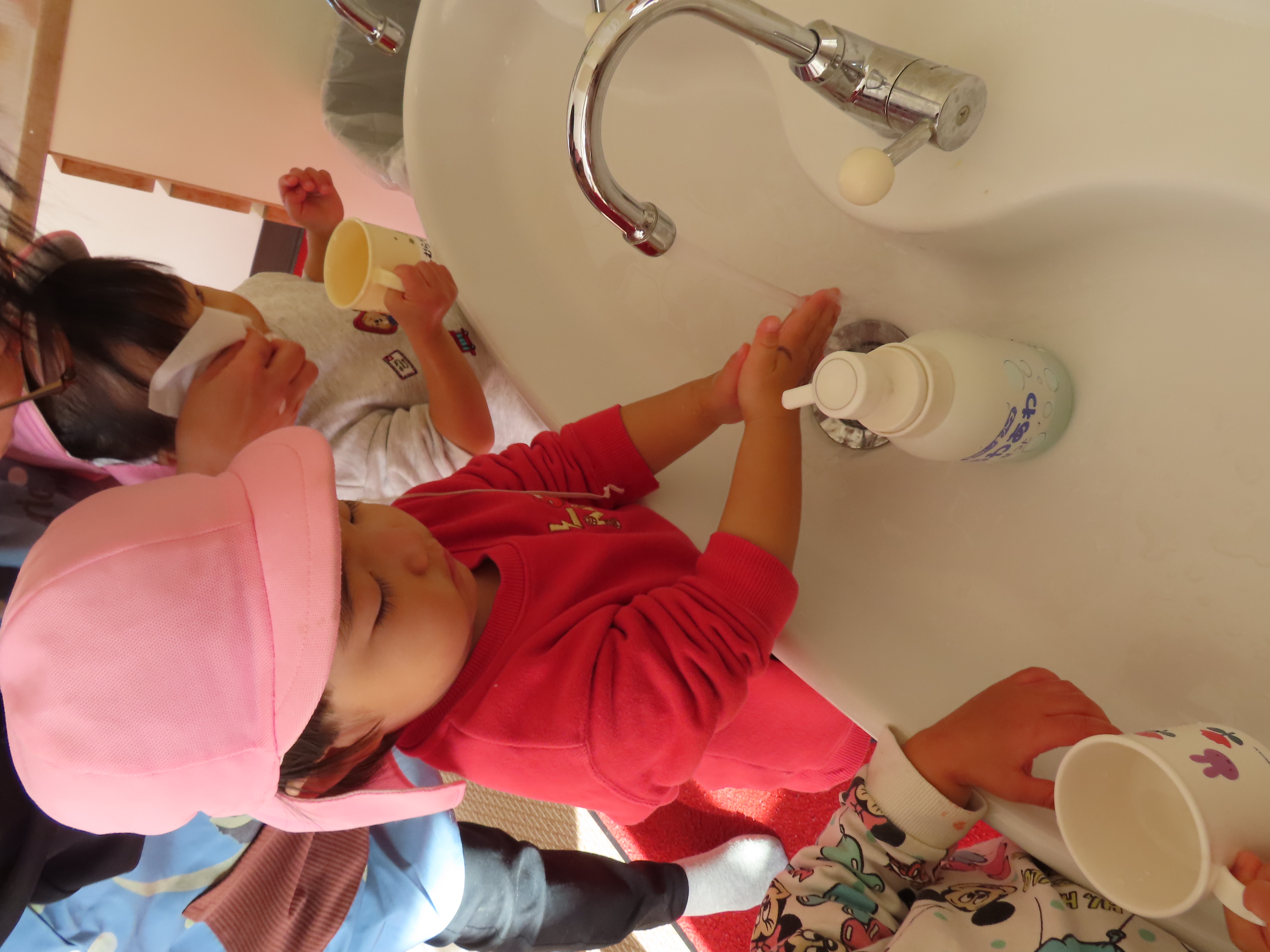 ある日の、もも組の様子です~(*^_^*) この日は、お天気が良かったので園庭へ遊びに行ってきました。おおきな滑り台に、子どもたちは夢中で上がっては滑って、上がっては滑ってを何度も繰り返して楽しみました♪ 外で遊んだ後は、お部屋に帰って手洗いとうがいです!手洗いもうがいも子どもたちは、とっても積極的に取り組んでくれています♪ これで、バイキンとはさよならだぁ~!!