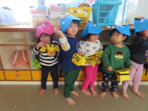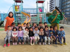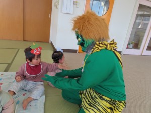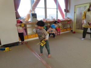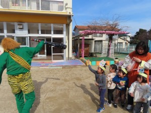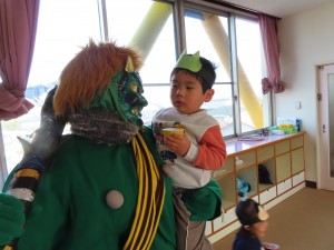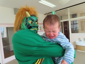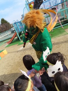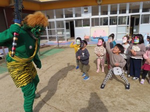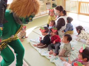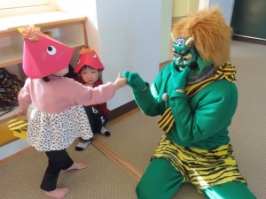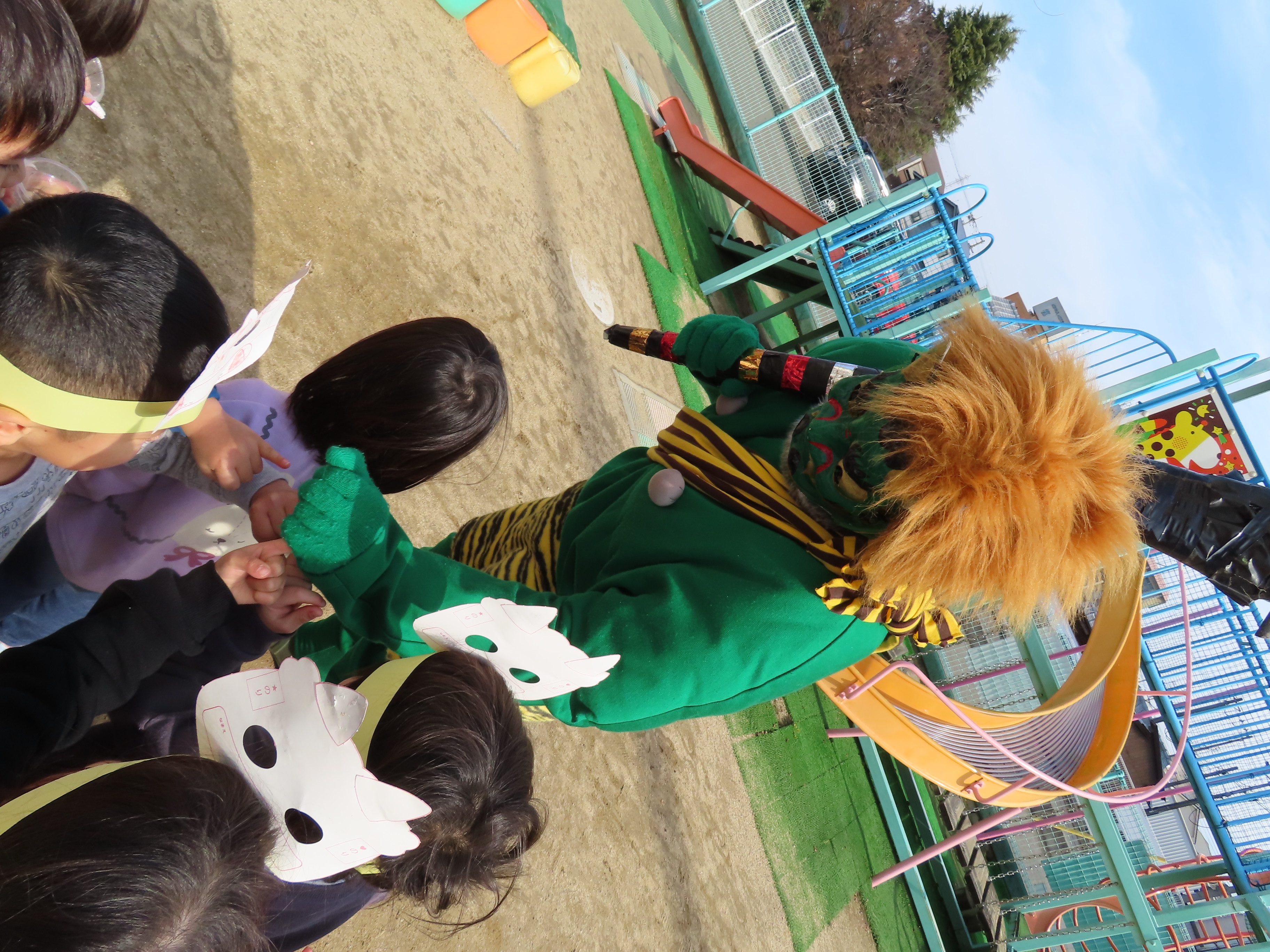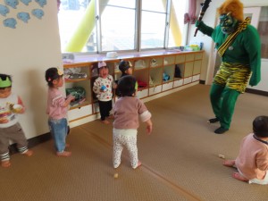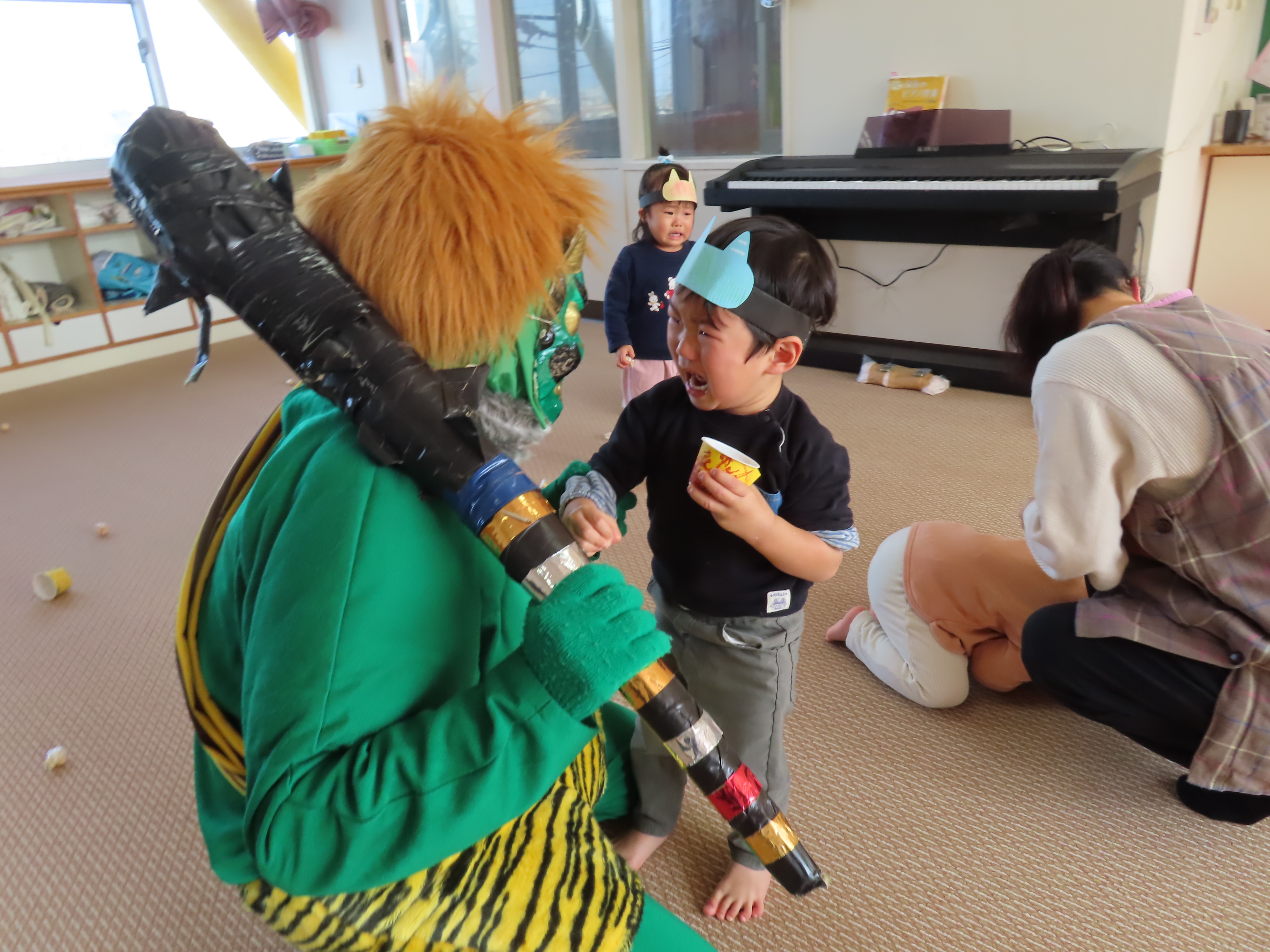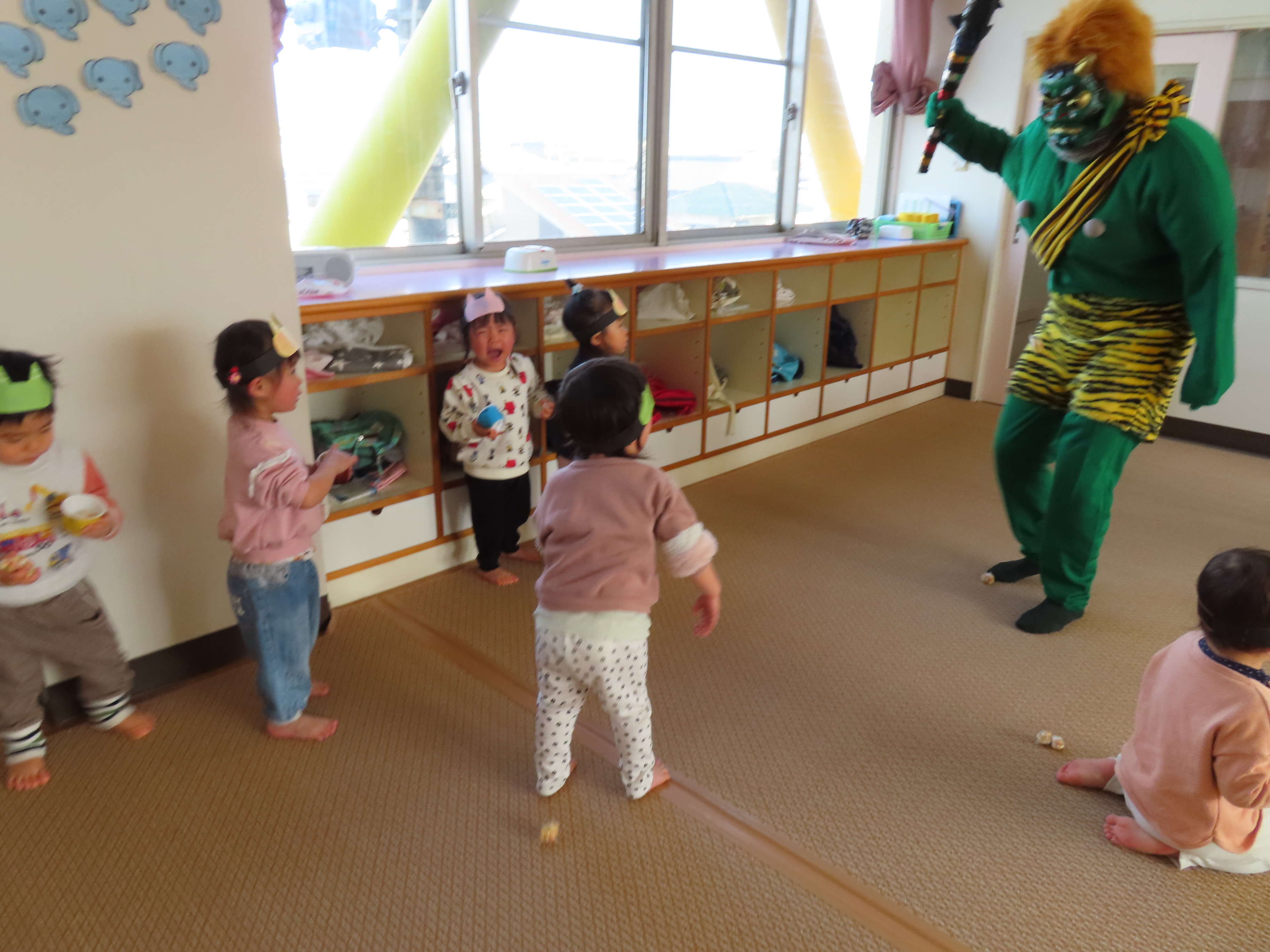 今年もやってきました(*^_^*) 鬼さんが~!!「今日は、何色の鬼がくるんだろうねぇ!?赤だと思う!」「いや!僕は黒鬼だと思う!!」「鬼の中は先生じゃない?」などと幼児さんは会話しながら朝からなんだかソワソワしておりました(笑)乳児さんは、いきなり入ってきた鬼にびっくりしてギャー(;_:) それでも、鬼に向けてあられを投げる勇敢な子もいました!幼児さんは、逃げ回りつつも「鬼は外~福はうち~!」と頑張って豆まき!これで、悪いものを追い払い福を呼び込めたはず!!みんなが健康で幸せにすごせますように~!