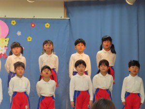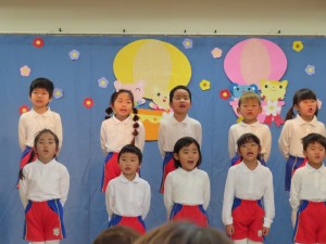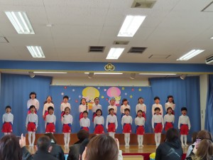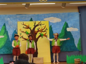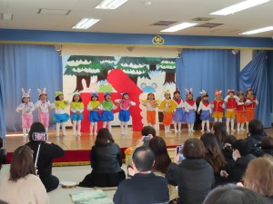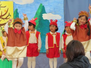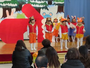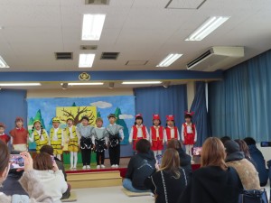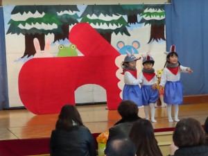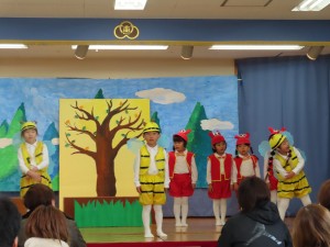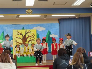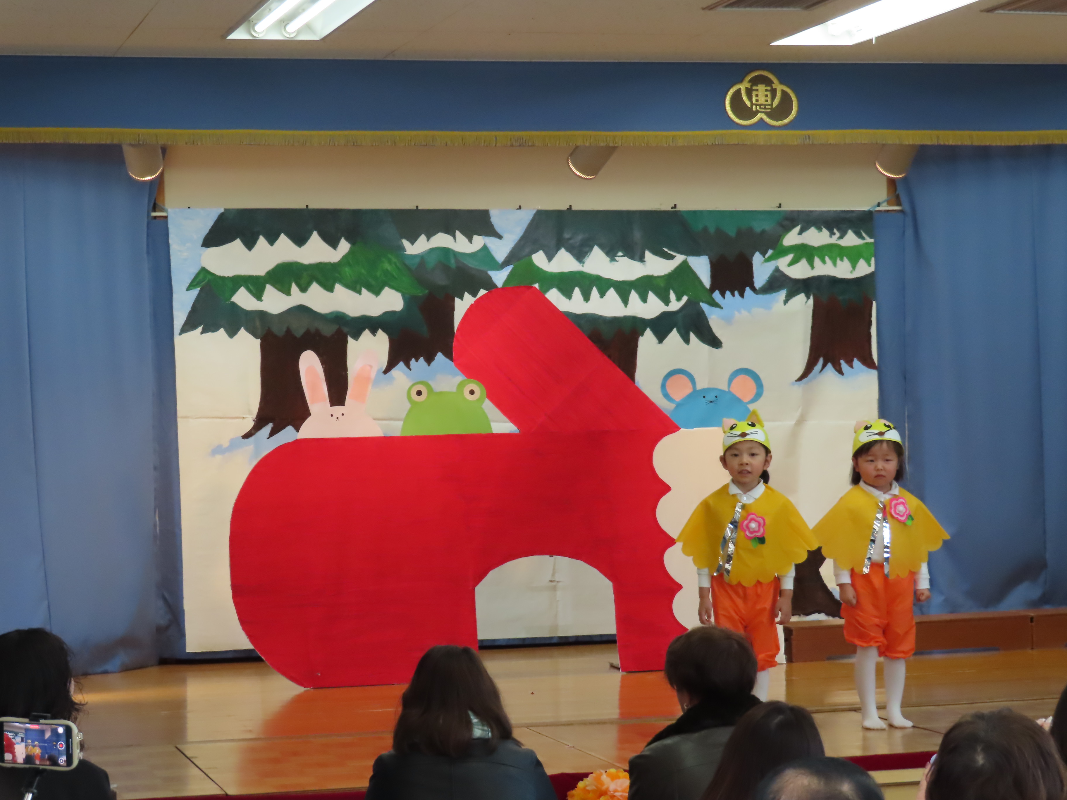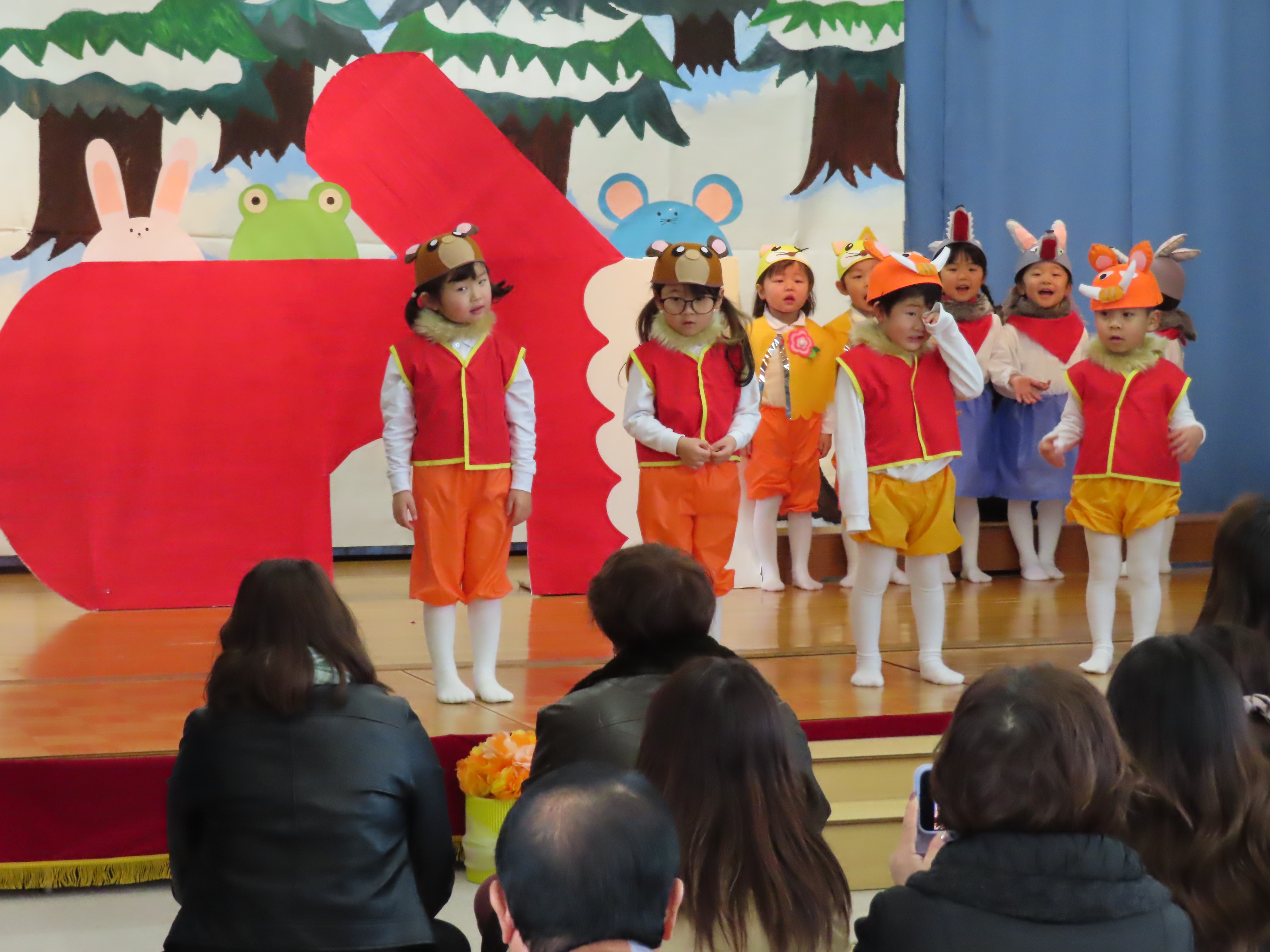 3歳児ばら組はオペレッタ「てぶくろ」。5歳児ひまわり組は劇「さるかに」のお話を披露しました。ばら組さんは、セリフもあったけど大きな声でセリフも言うことができとっても楽しみながら舞台の上に立てていました!!ひまわり組さんは、緊張という感情、気持ちも芽生え舞台裏では、「先生、緊張する~!!どうしよう~!」という声も聞かれていましたが、いざ幕が開くとその緊張に打ち勝ちながら堂々とセリフを発する姿はとってもたくましく感じました(*^_^*)たくさんの温かい拍手をありがとうございました♪