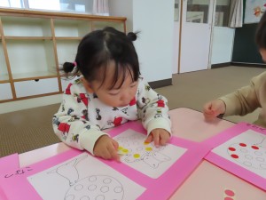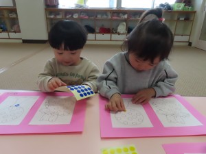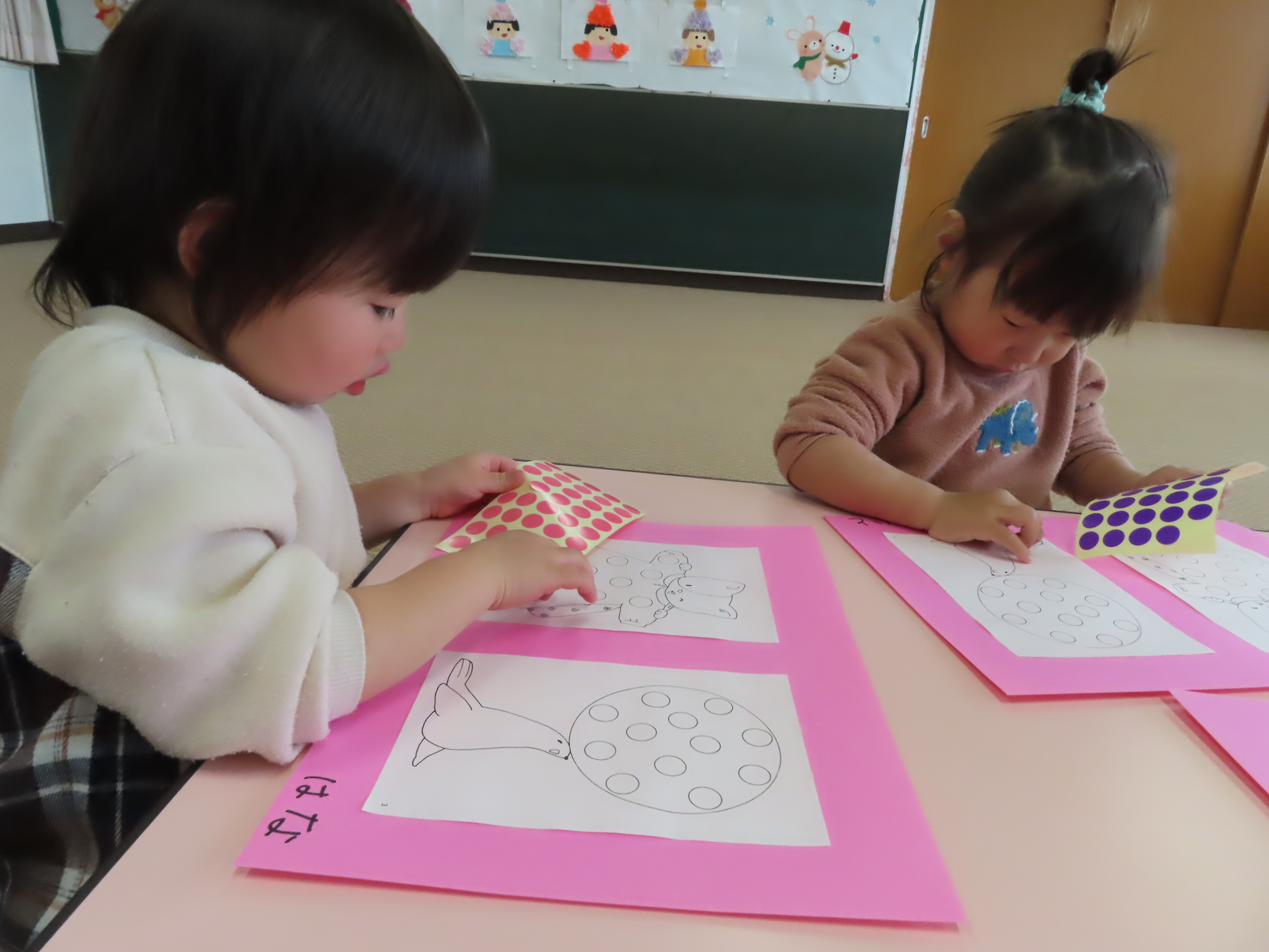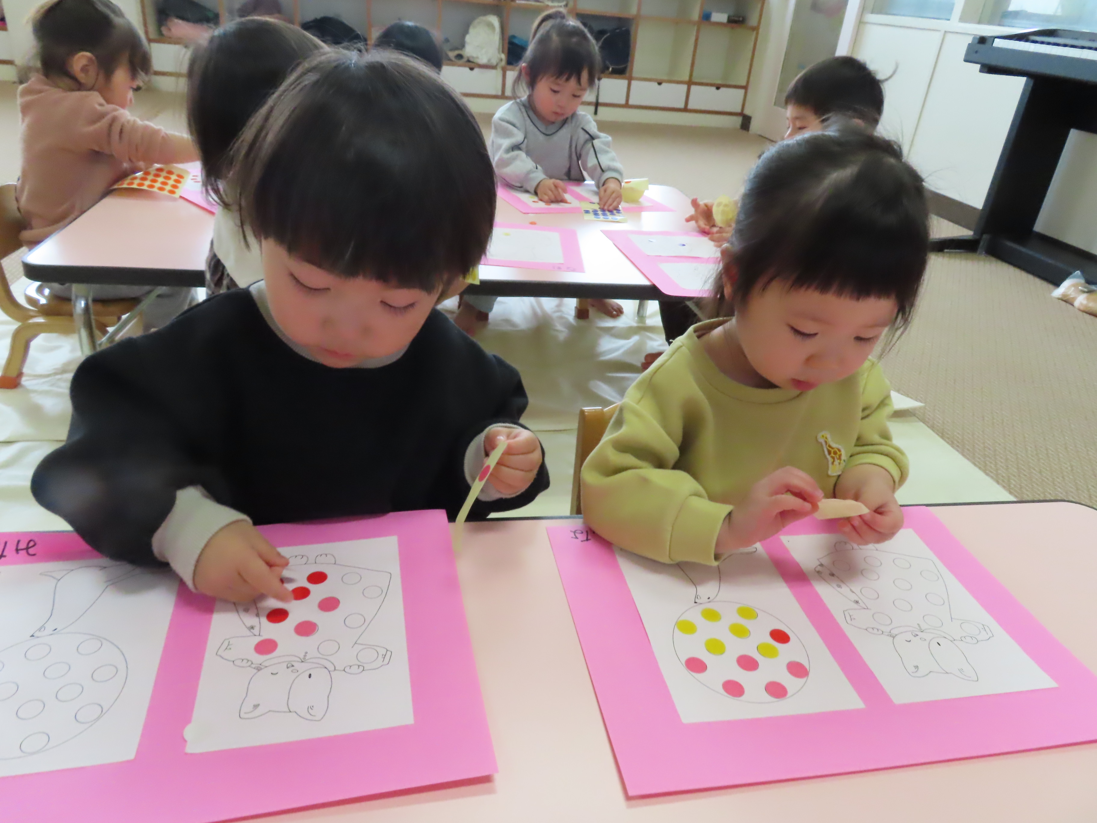 シール貼りを楽しんでいます(*^_^*) ただ貼るだけではなくて、〇印に合わせてまるいシールを貼っていきました!!「〇はどこにある~!?」と声をかけると「ここにあった~!」など〇を探すことも楽しみながら、みんなちゃんとまるいシールを貼ることができました(*^^)v