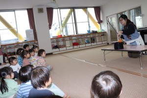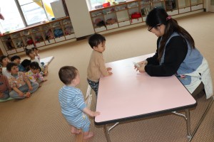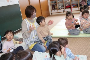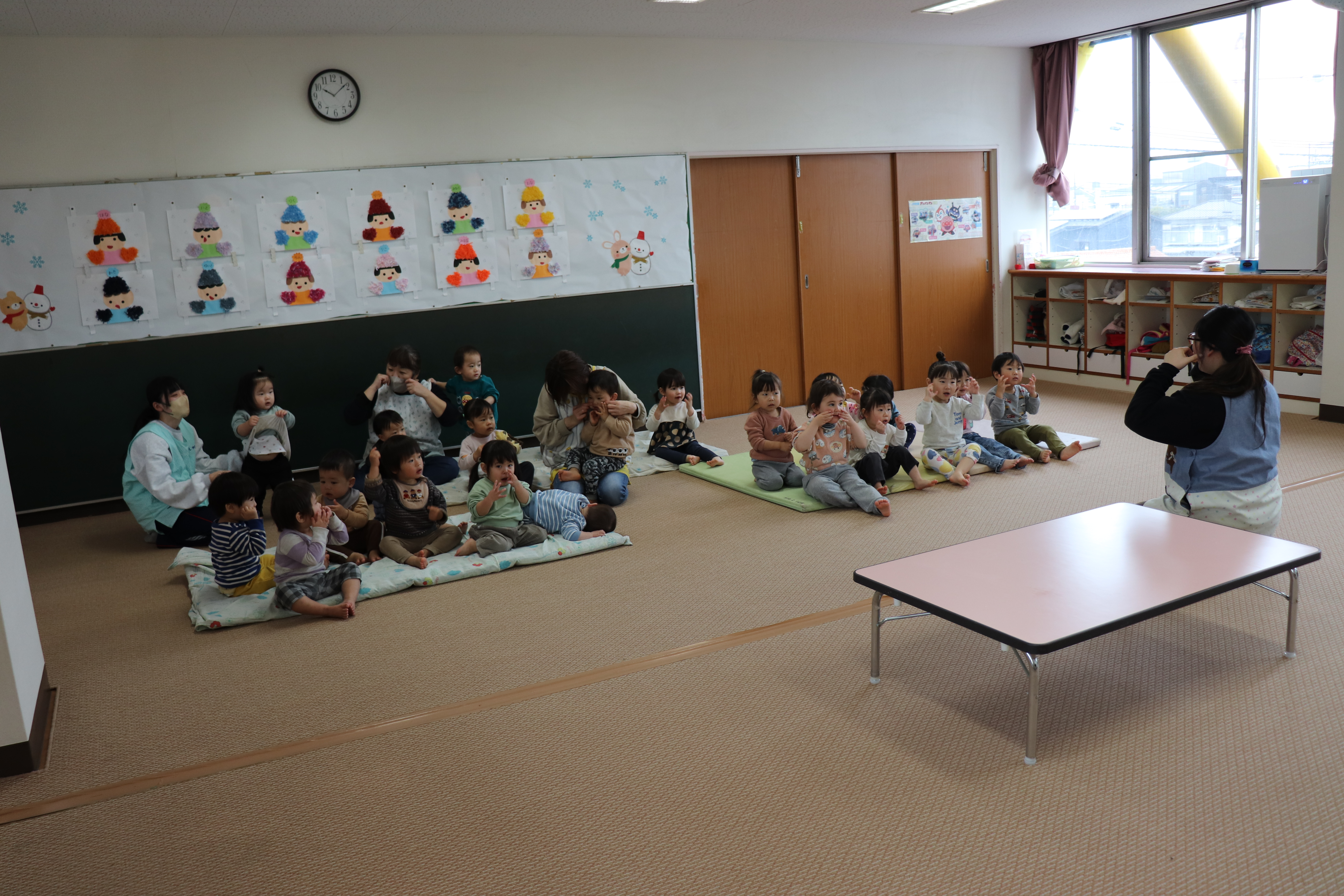 乳児クラスの誕生会の様子です(*^_^*) みんなで元気に歌のプレゼントをしたあとは、楽しい出し物タイム♪種をまいてお水をあげるとかわいいお花が咲いたり、帽子からスカーフが出てくる手品などなど盛りだくさんで子ども達も大喜びでした!