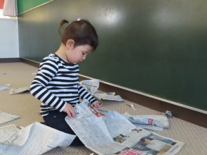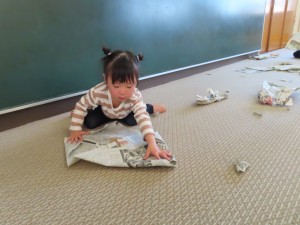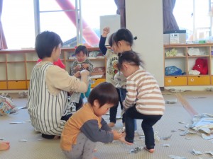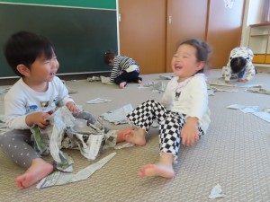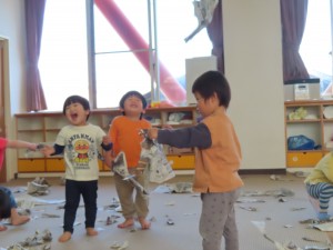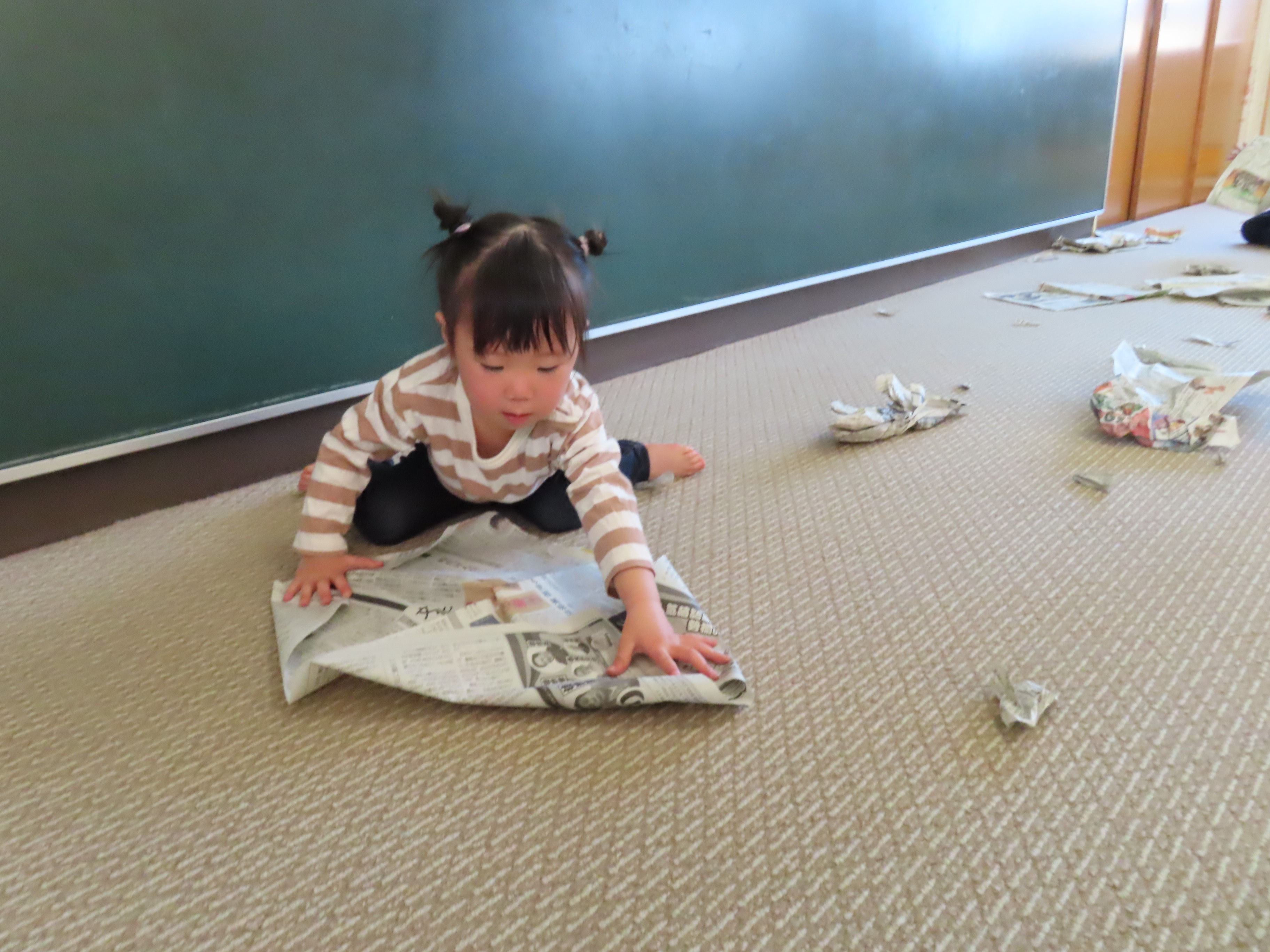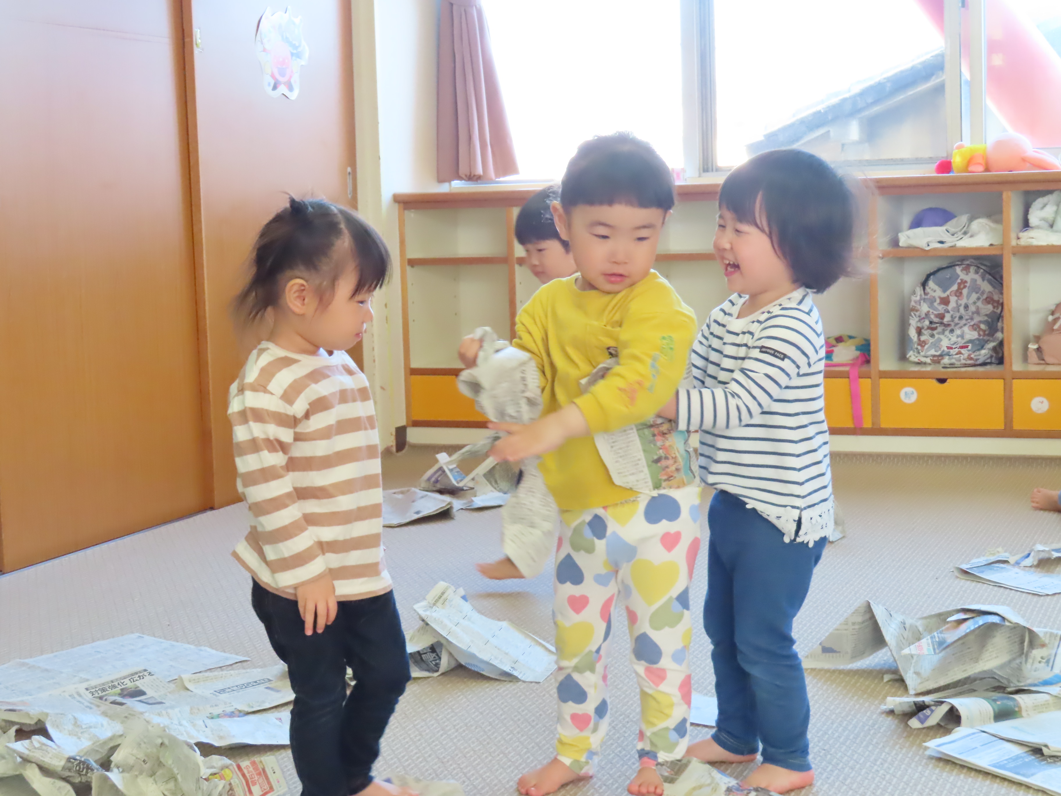 すみれ組のある日の様子(*^_^*) 新聞紙遊びを楽しみました!保育室いっぱいに新聞紙が~(笑)ちぎったり、まるめたり、保育士の真似をして折ってみたり、はちまきにしてみたり…とにかく、思い思いに新聞紙で遊びました!!だんだんと遊びは大胆になり、新聞紙シャワーに大はしゃぎ♪ もう一回!もう一回!と何度も何度も新聞紙シャワーを楽しんだ子ども達でした(*^^)v