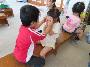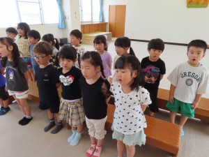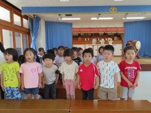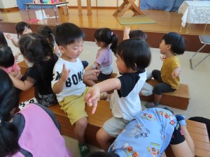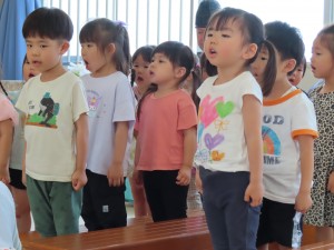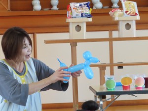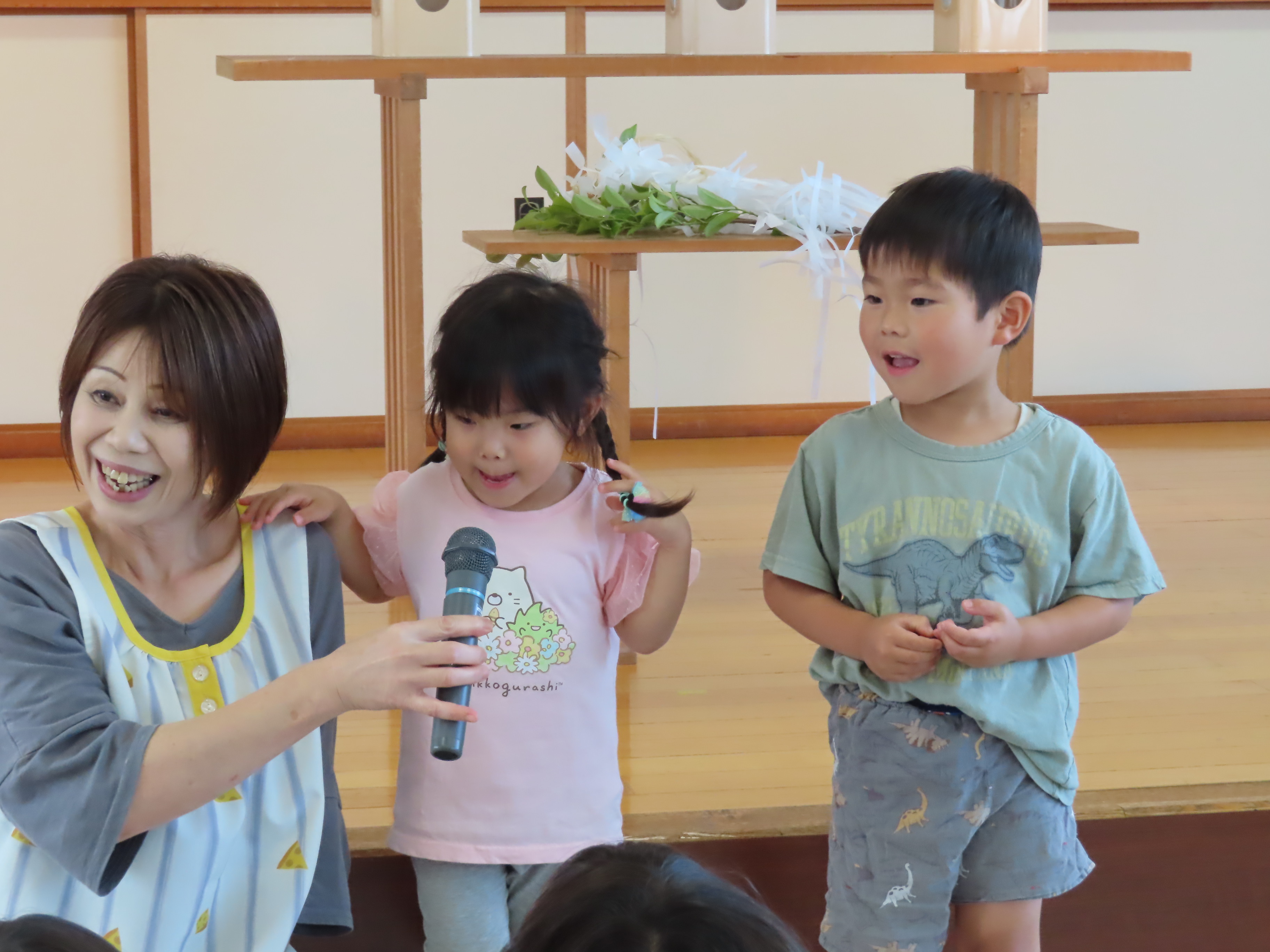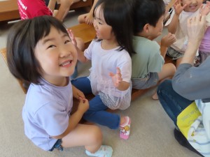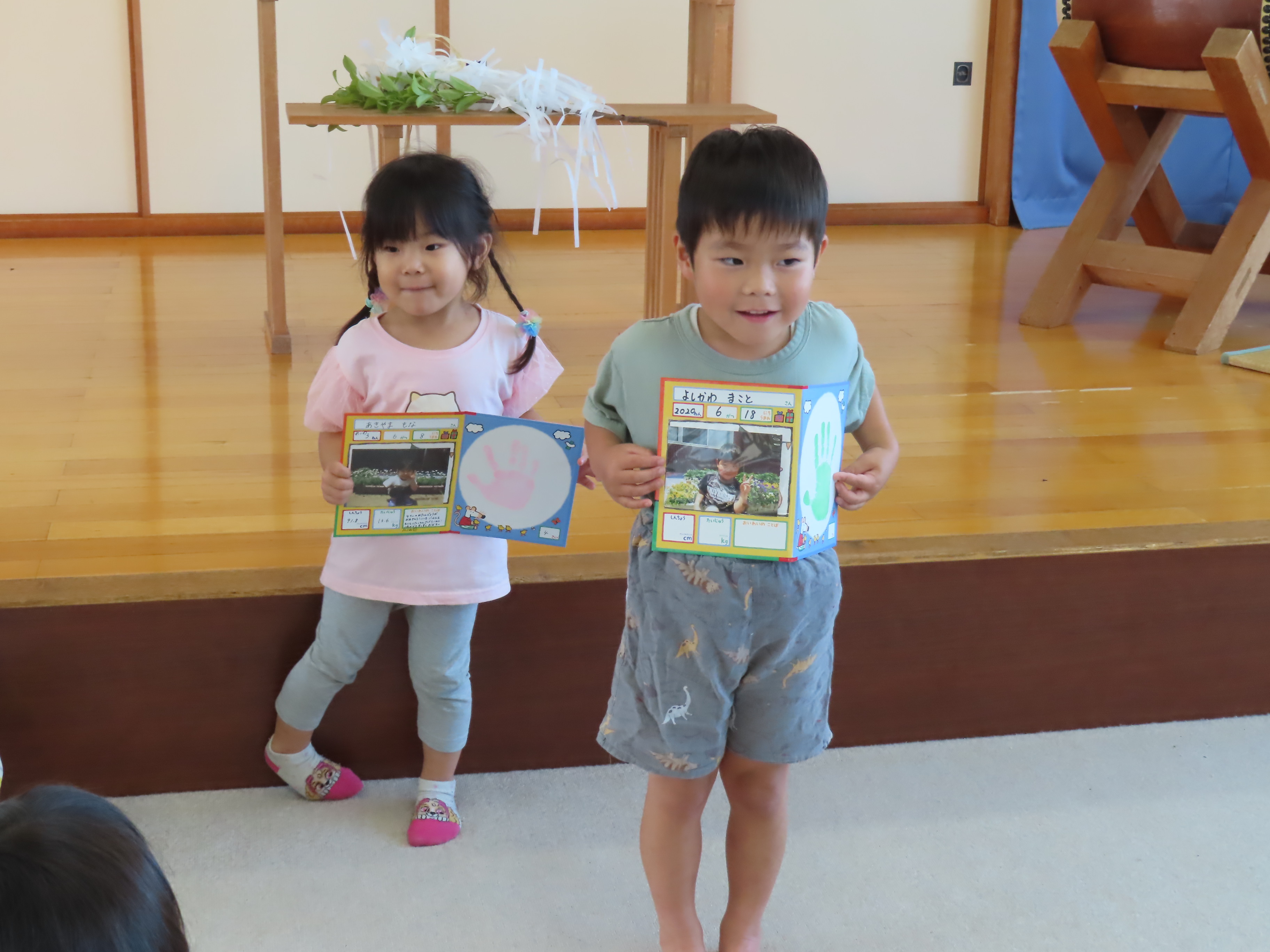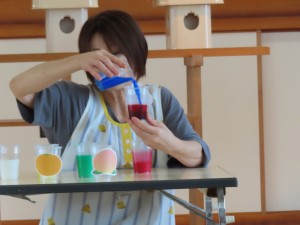 6月、幼児クラスの誕生会の様子です(*^_^*) 今月は、2名のお友達が誕生日を迎えます♪おめでとう~!(^^)!恥ずかしそうにしながらも、みんなの前で、名前と年齢、好きな色を答えてくれましたよ! 保育士による出し物は、色水遊びとバルーン♪ 色と色を混ぜ合わせて、いろんなジュースが出来上がっていくのを楽しみました!