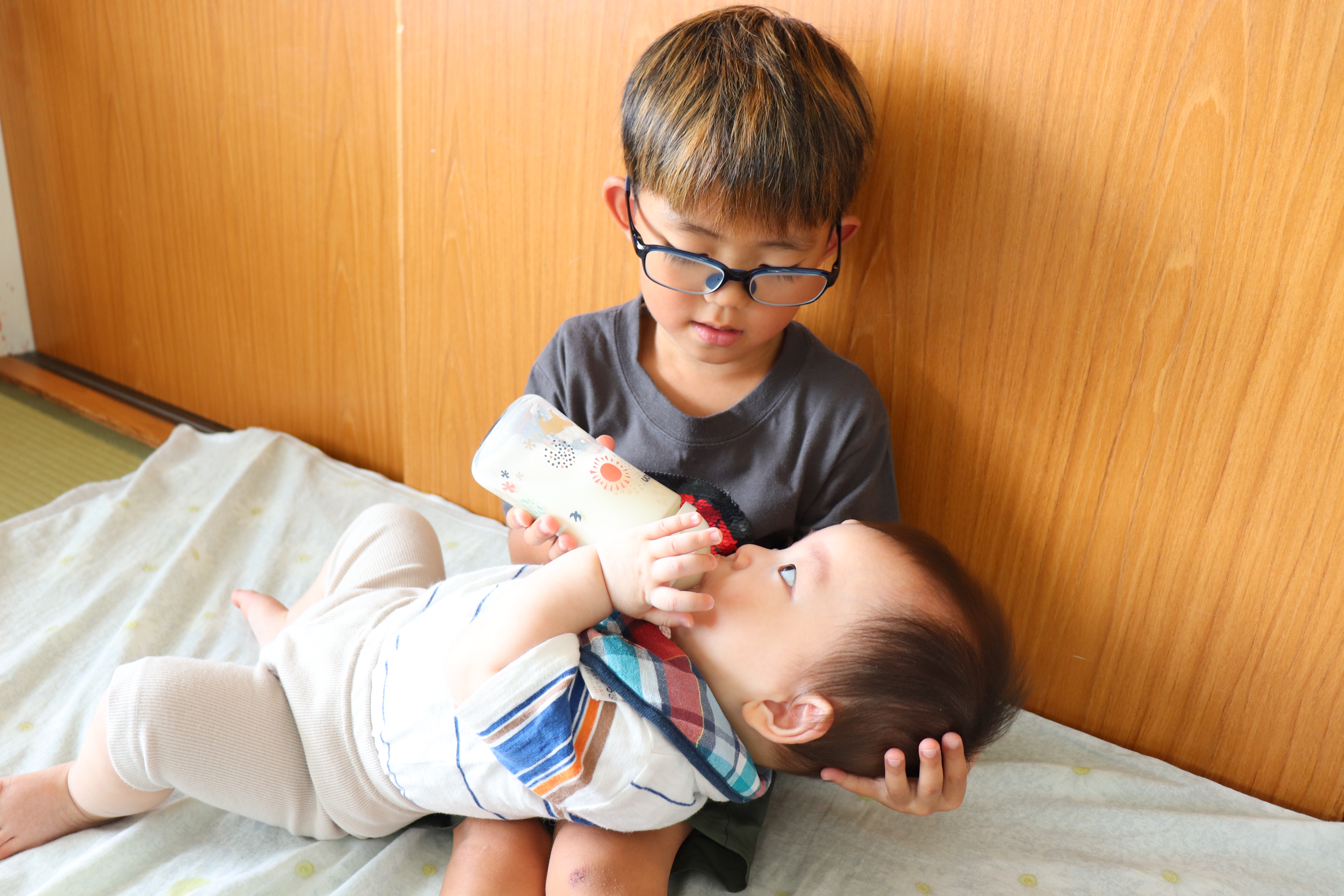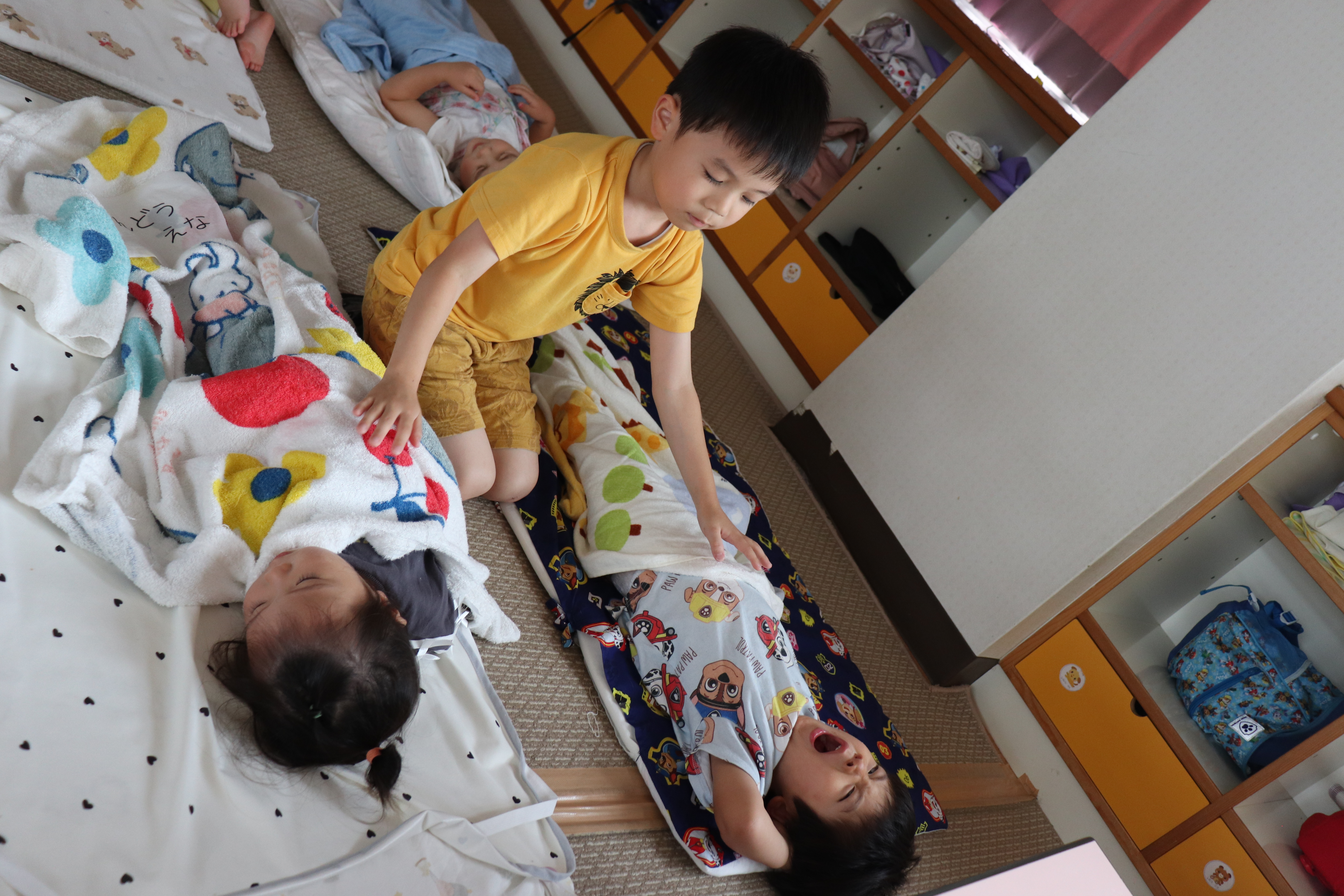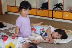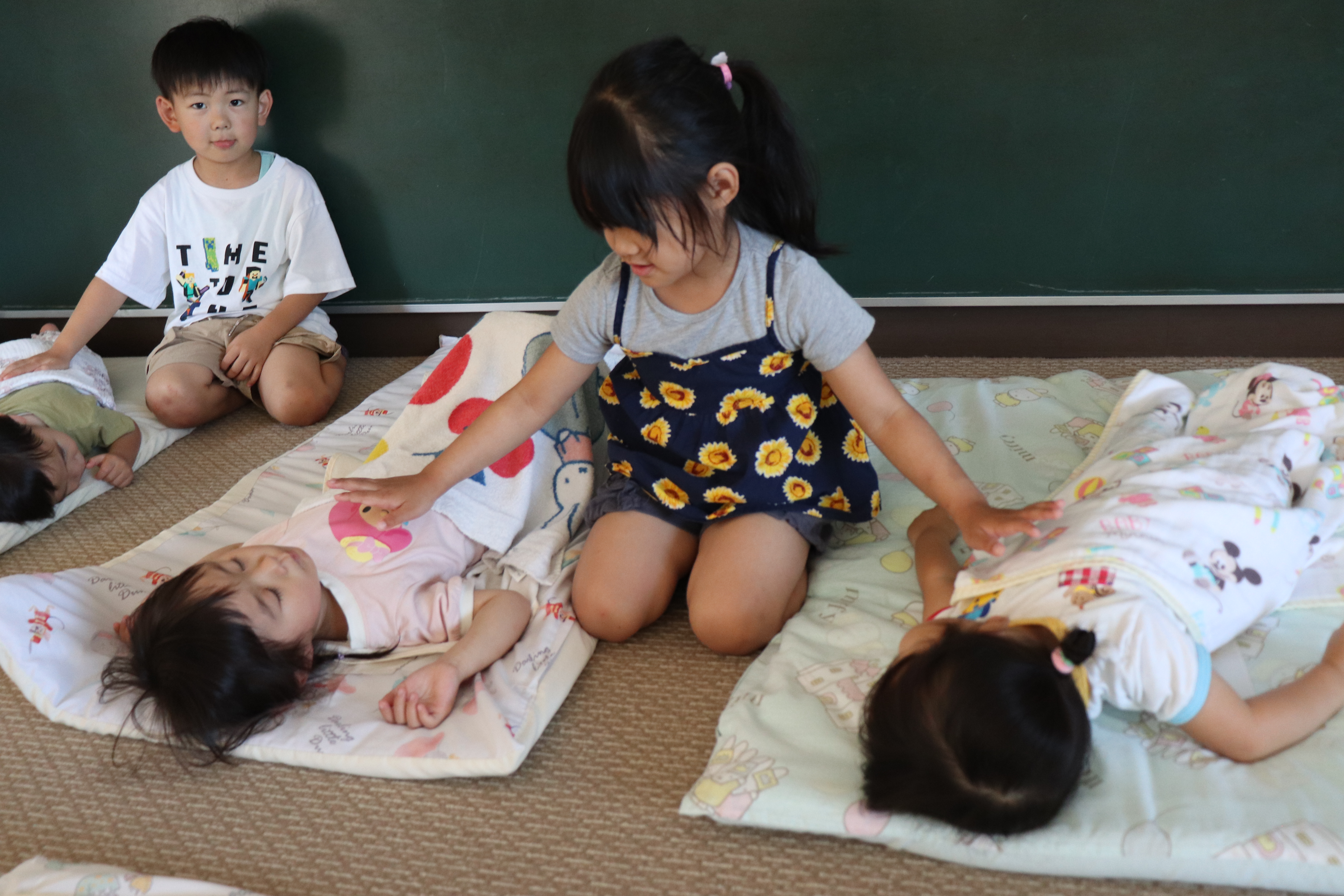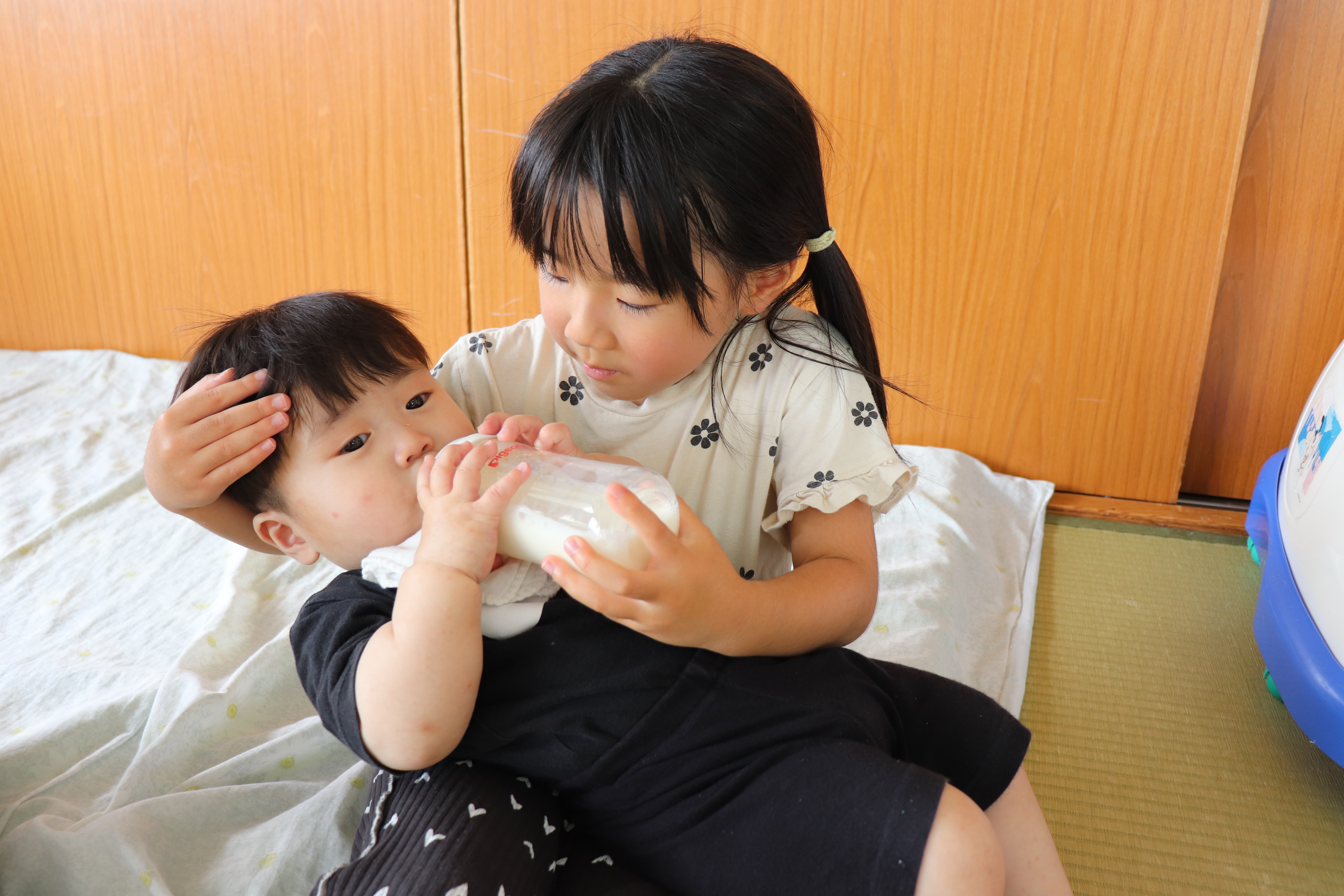 日常の中で、もう少し異年齢との関わりがもてたら…と思い、年長児さんたちがミルクを飲ませてあげたり、お昼寝のトントンをしにいってあげたりと、じっくりゆっくりと直接関わる時間を持ちました。保育士の見守りの元、緊張しつつもミルクをあげる仕草は、ぎこちなけれど一生けんめいで、見ていてもほんわか♡ ミルクをもらうつぼみ組の赤ちゃんたちも、「誰だ!?(笑)」と顔をみつめつつも泣くことなく飲んでくれています♪ 2歳児クラスには、トントンをしにお昼寝のお手伝いへ♪ いわずとも、優しくお腹をさすってあげる子ども達でした! こういった関わりを通して、優しさや責任感、社会性や協調性が育むことができたら良いなと思っています。また、普段見せない一面を発見できたりと保育士も見守ることが楽しいです(*^_^*)