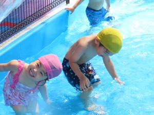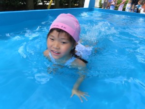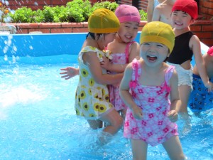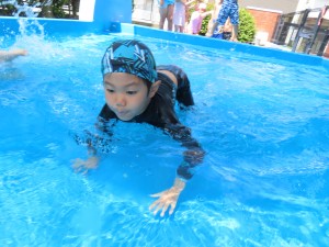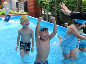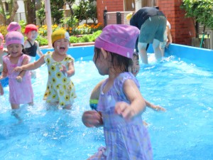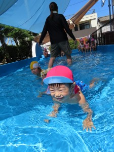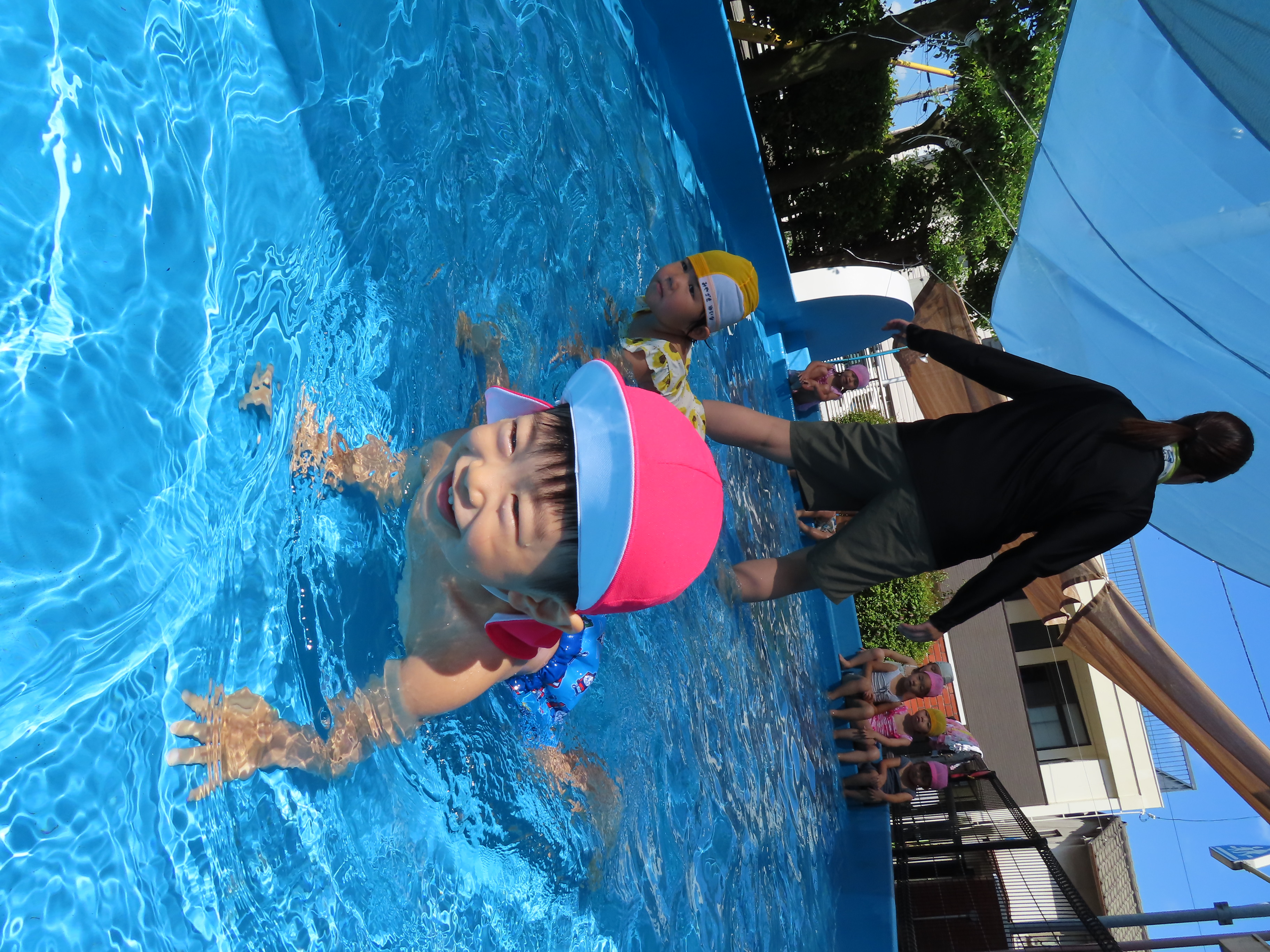 毎日、プール遊びを楽しみに登園する子どもたち(*^_^*) 雷注意報で、思うように夏の遊びを楽しむことができない毎日ではありますが… プールができる日には、存分に水遊びを楽しんでいる子ども達です!! 年長児さんは、潜って泳ぐ子もいて、遊び方もダイナミックで、保育士もビショビショになりながら一緒に楽しんでいます♪