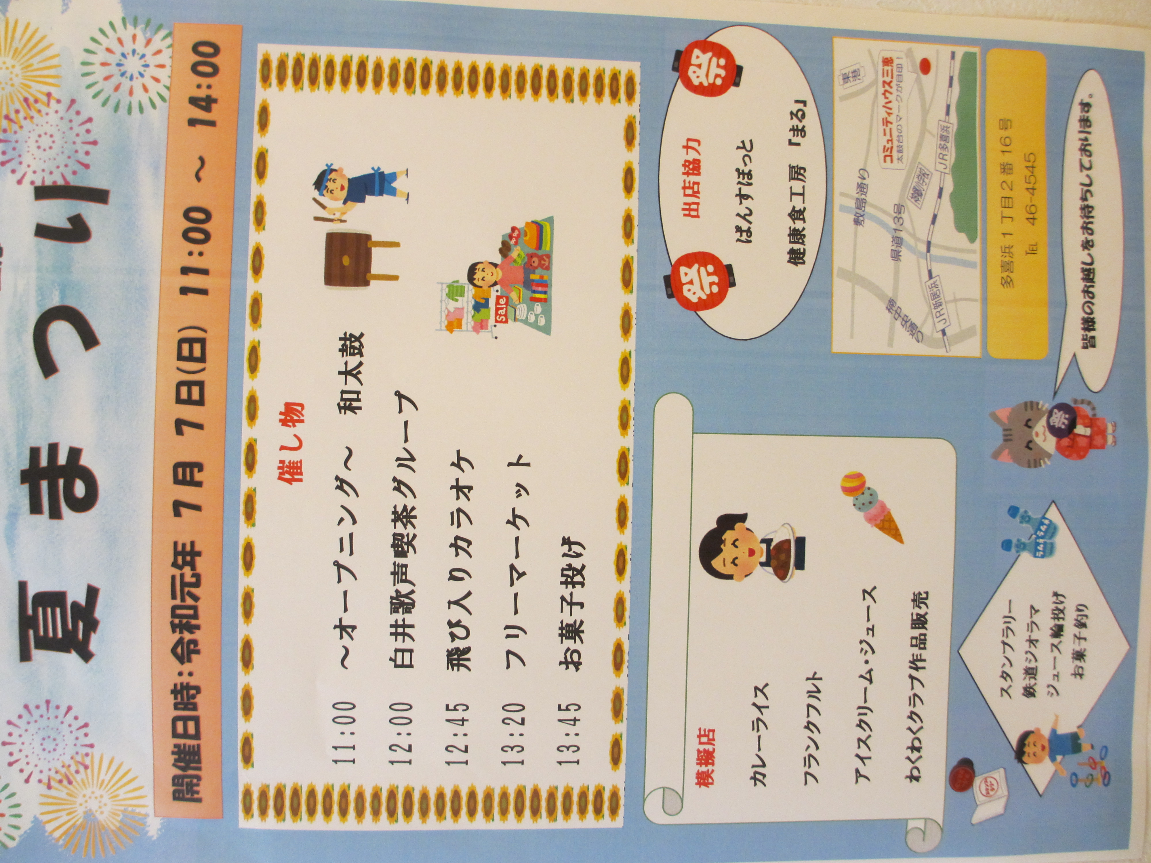 令和元年7月7日日曜日、11時~14時に夏まつりが開催されます。お友だち、ご近所さん、お誘いあわせの上お越しください♪スタンプラリー、鉄道ジオラマなど、色々なコーナーがあります!楽しんでくださいね♪