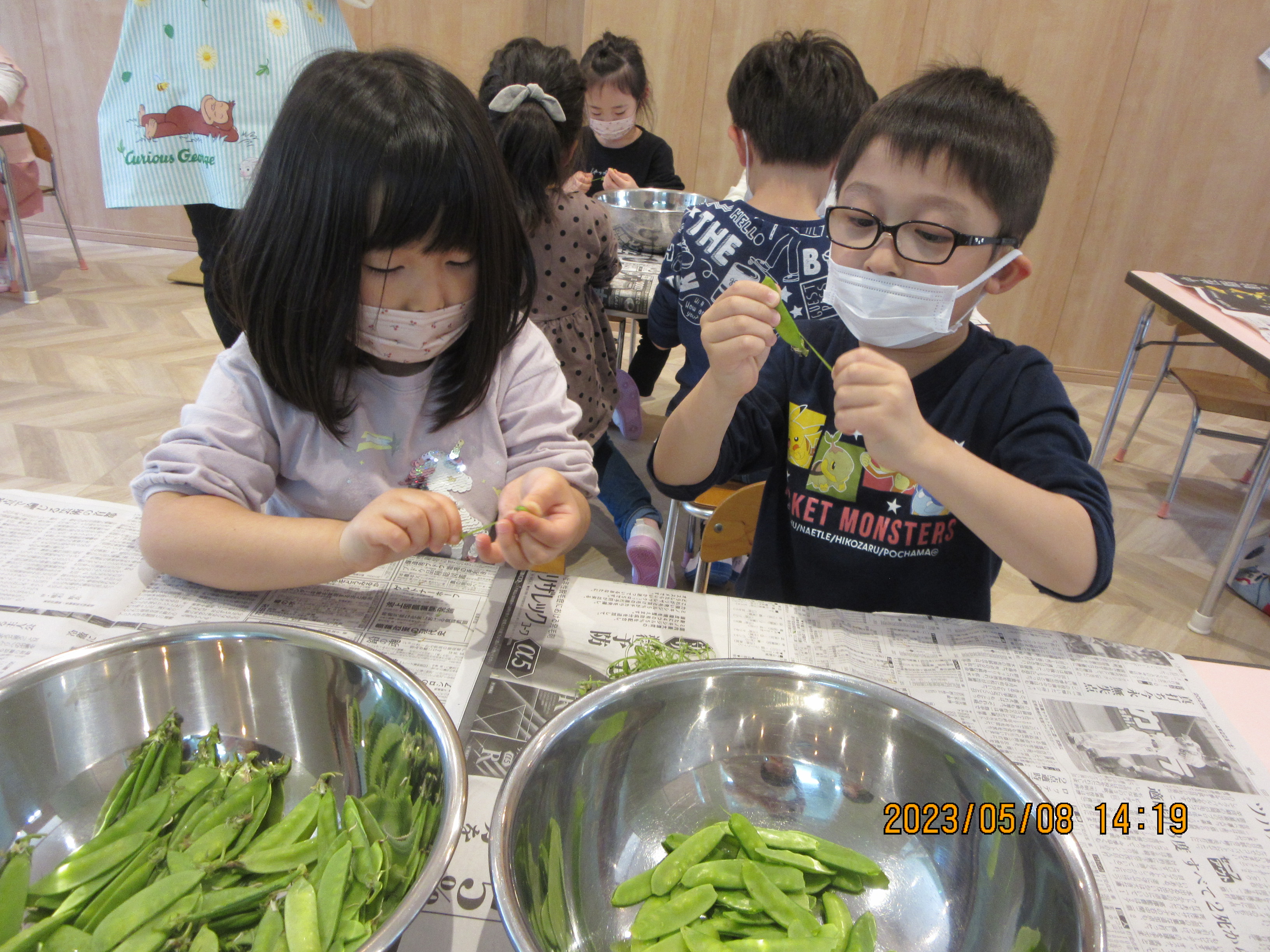 きりんぐみ、らいおんぐみが、給食で使用するきぬさやの筋取りのお手伝いをしてくれました!!