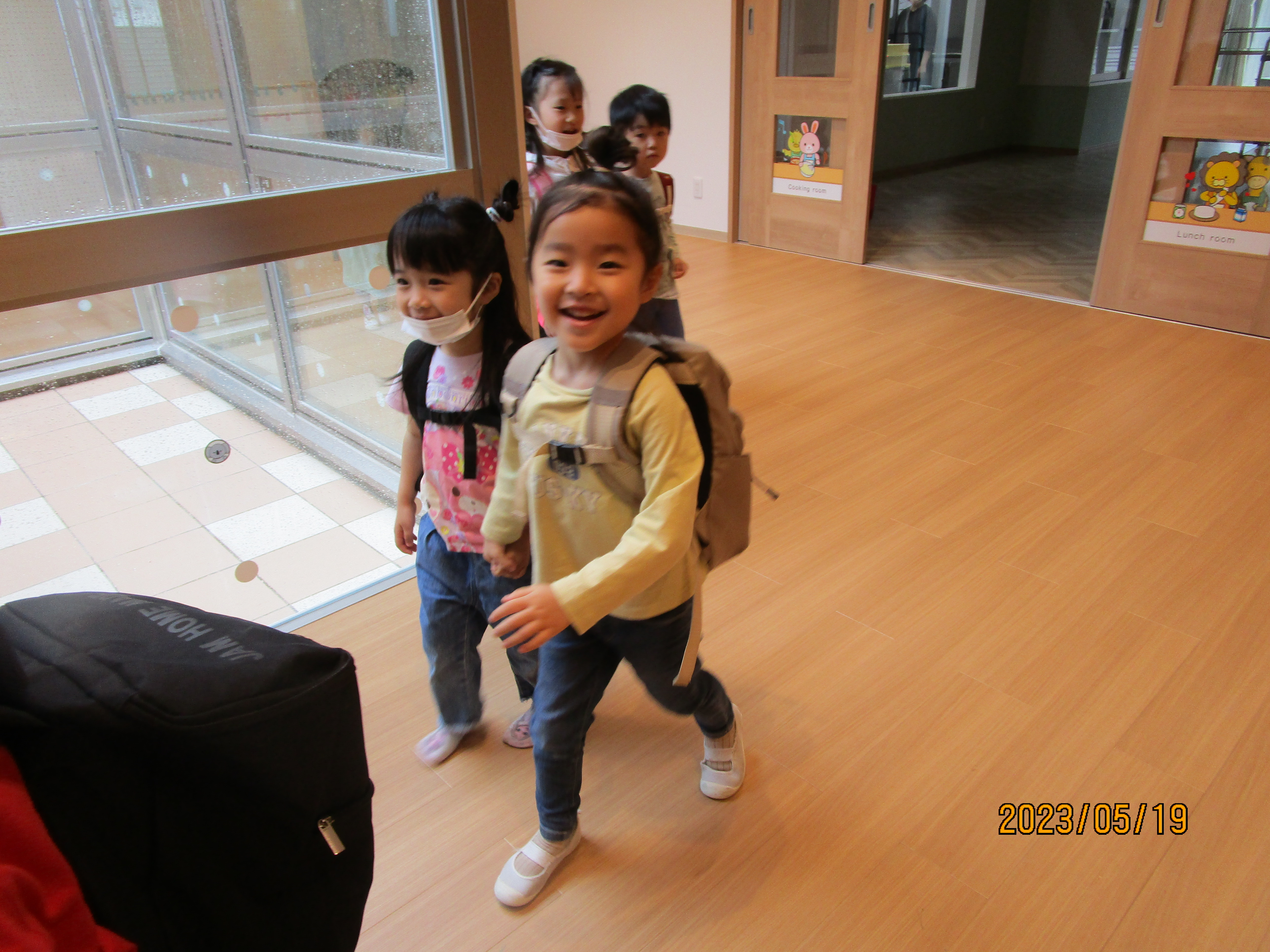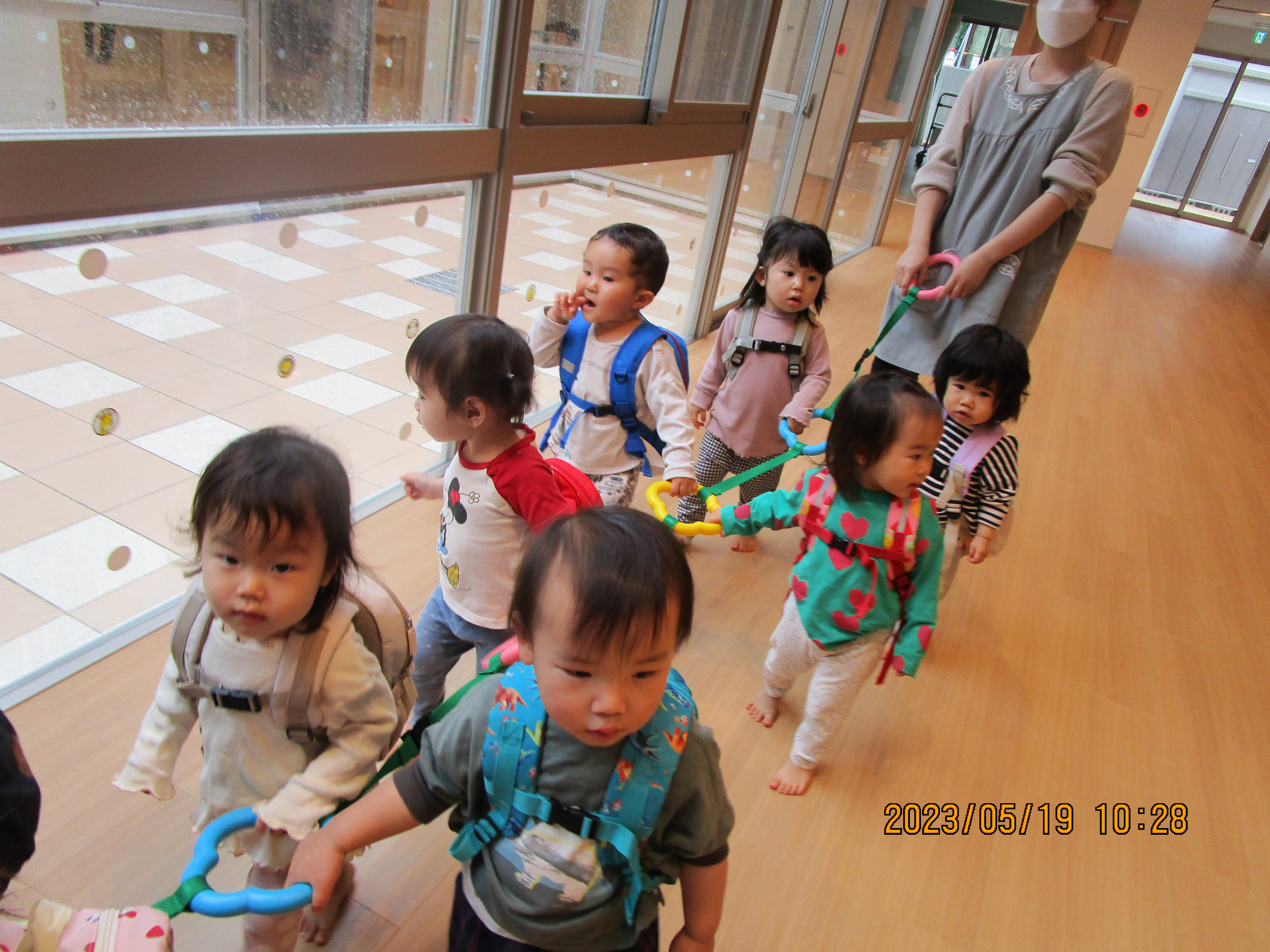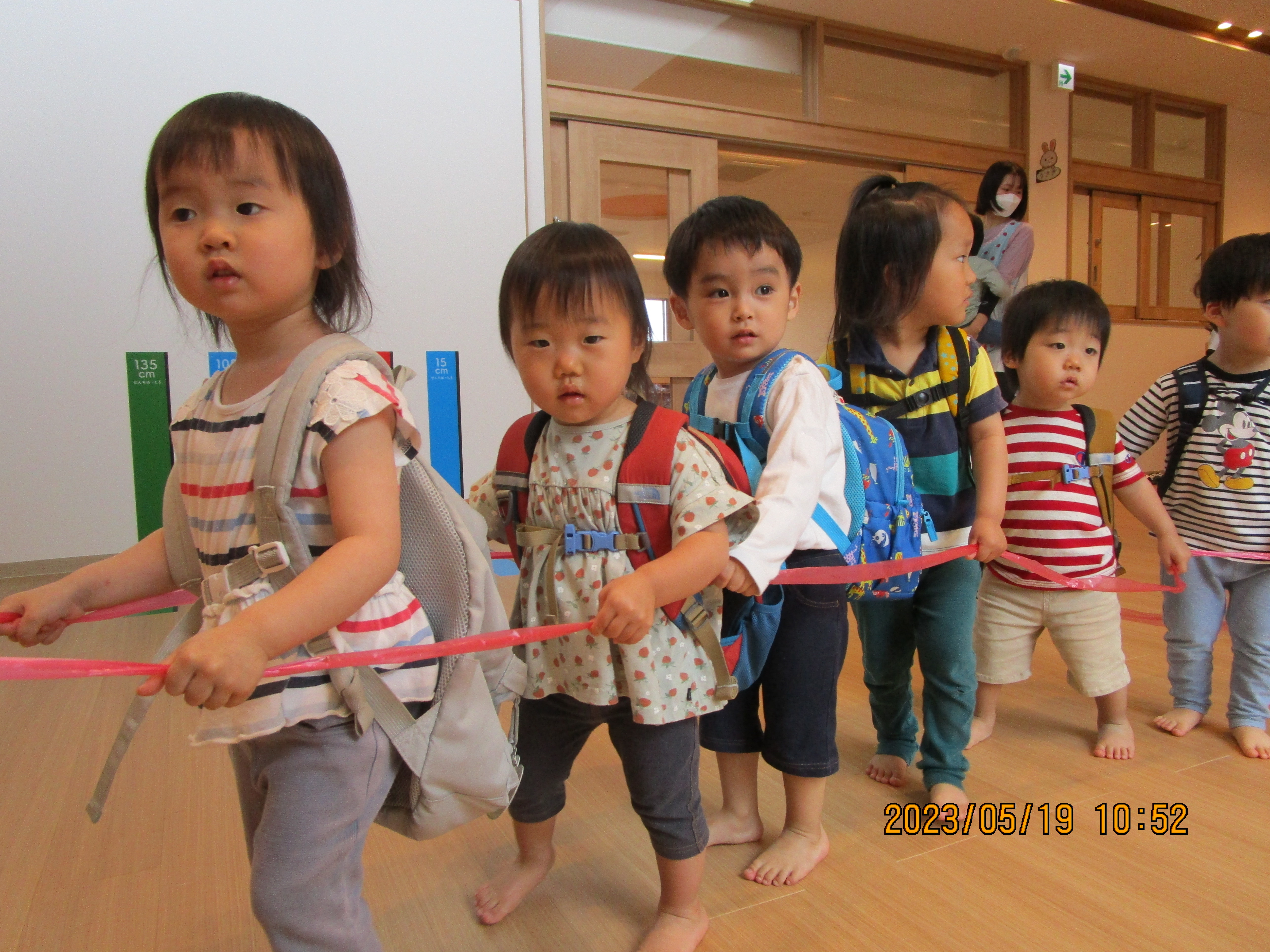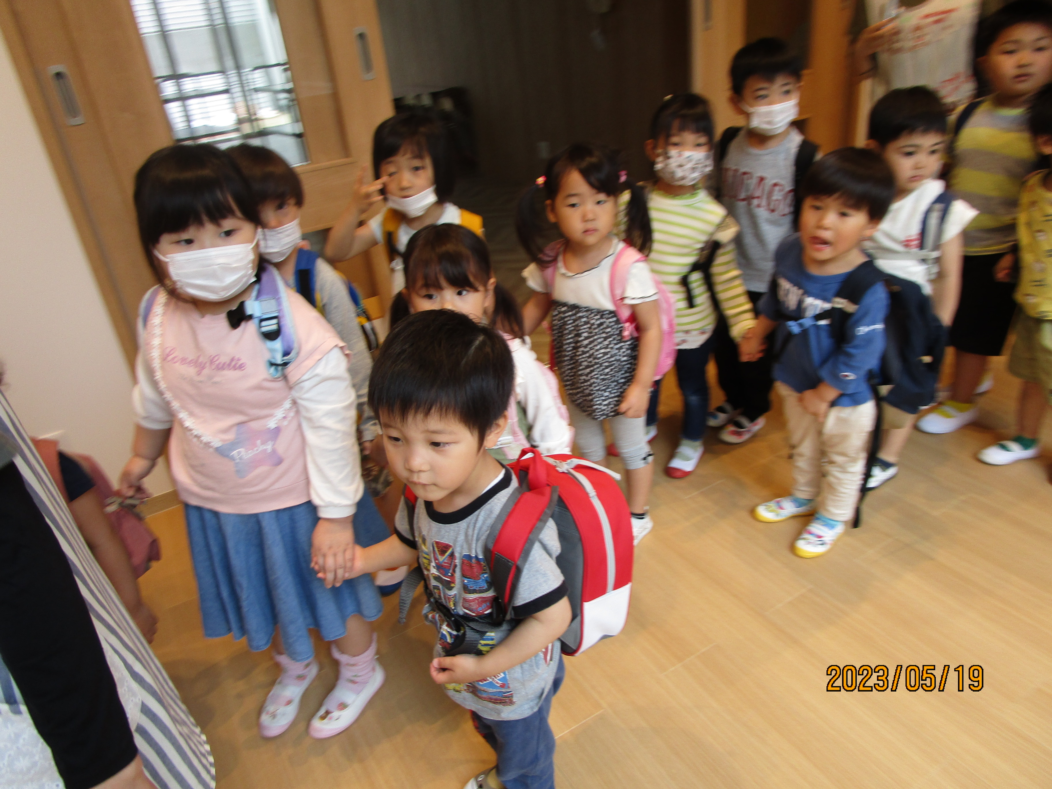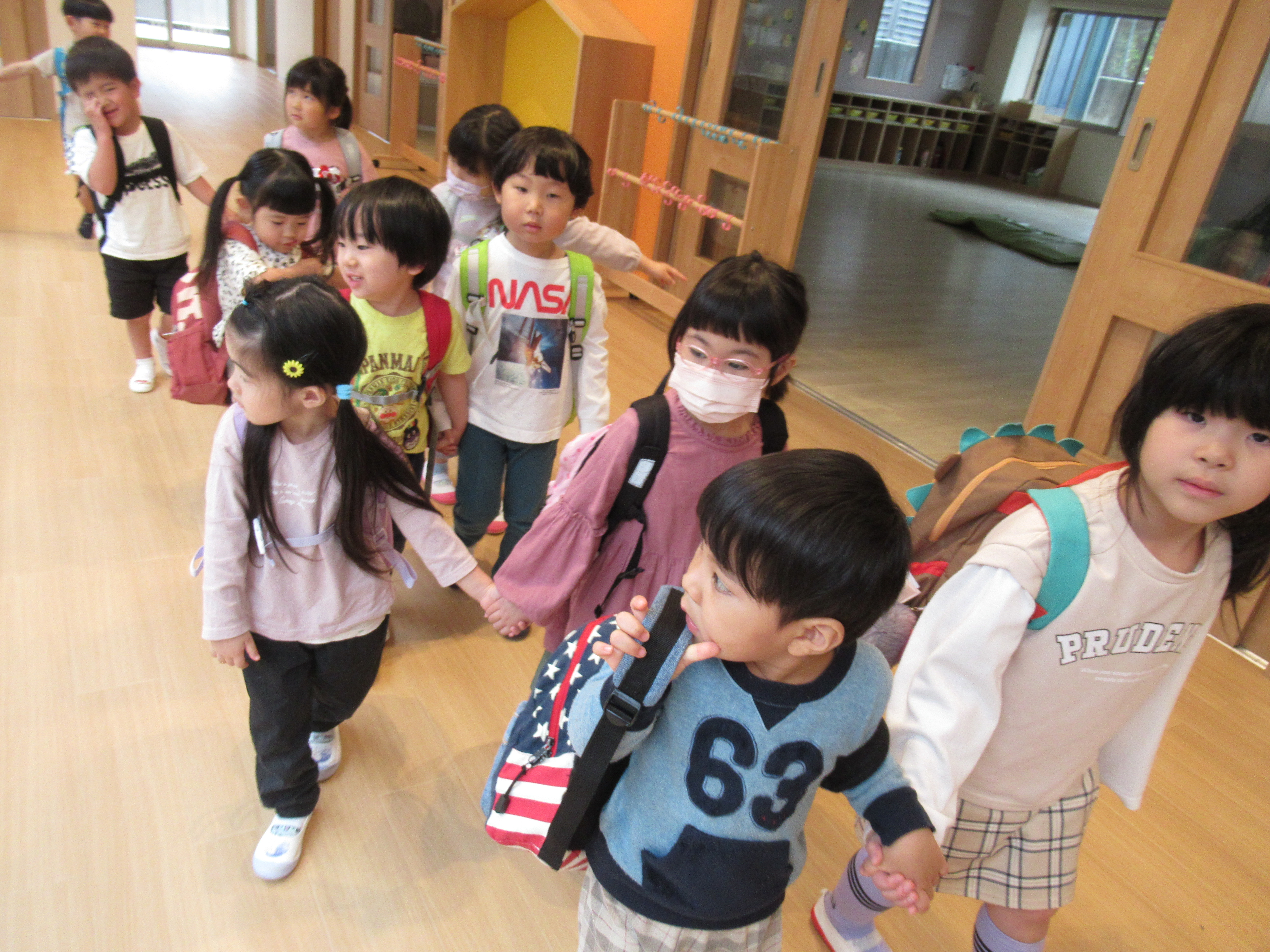 年長児と年少児で手をつないで歩いたり、クラスの友達同士で
