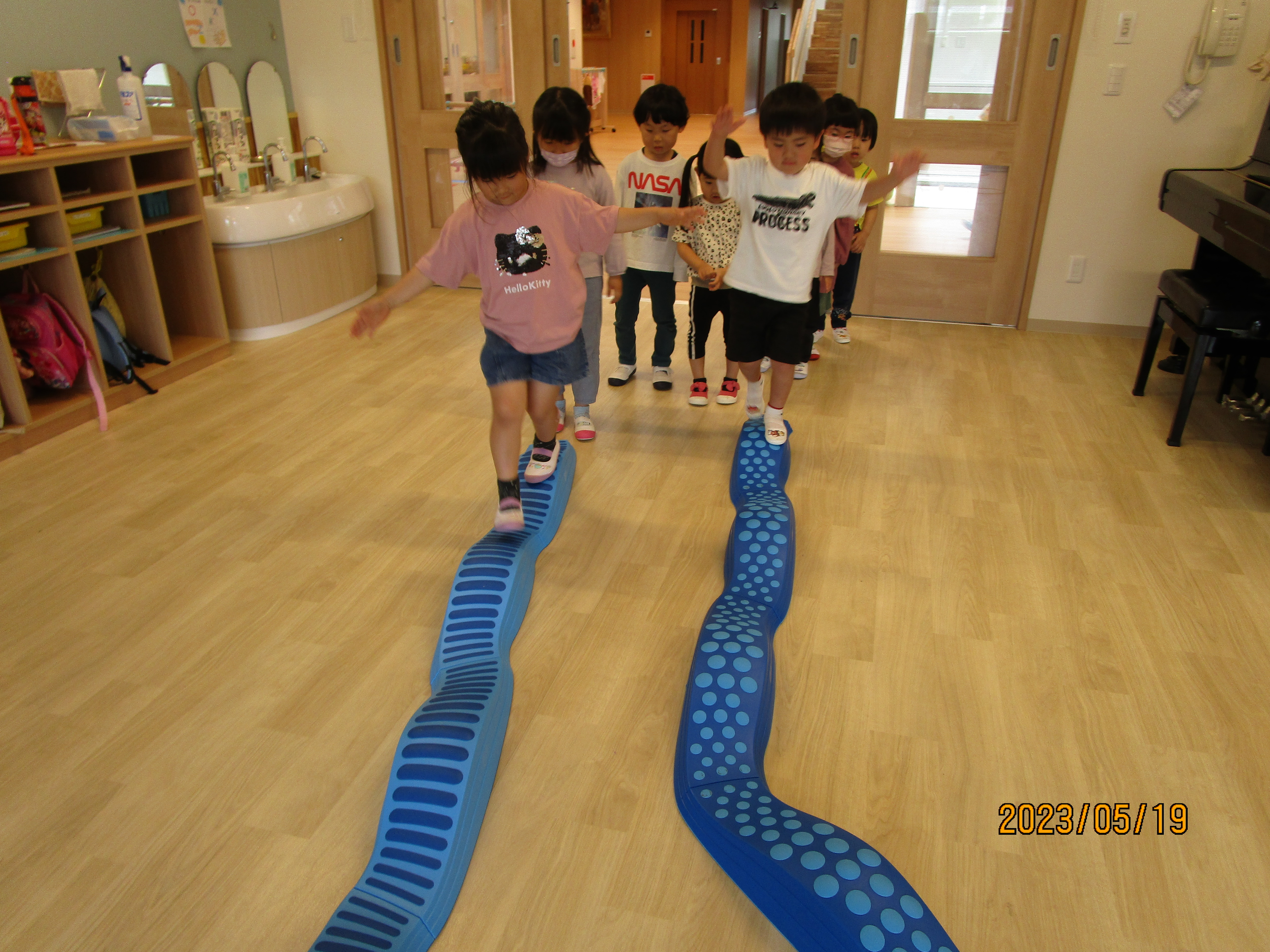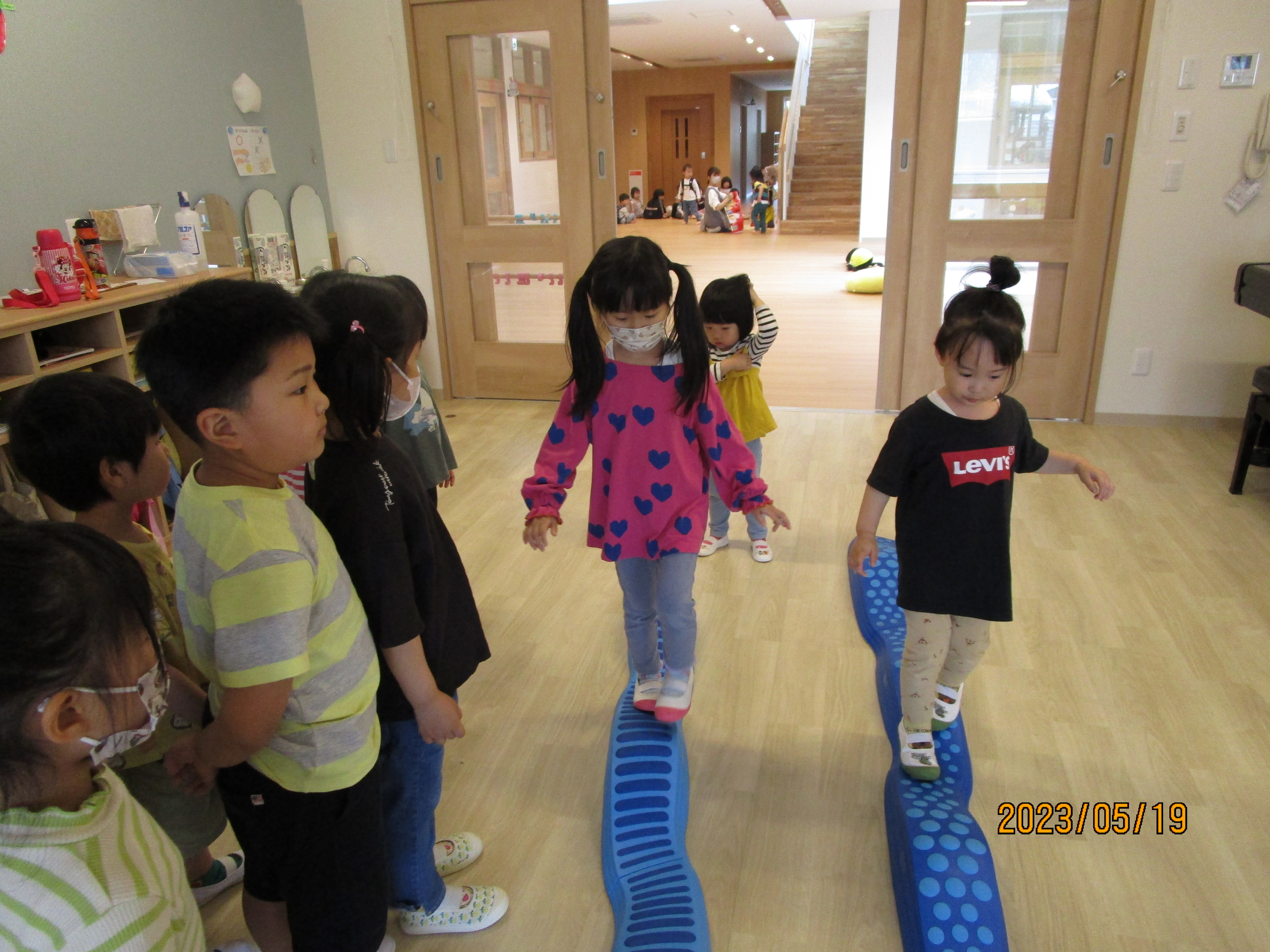 保育室ごとに用意された平均台、輪投げ、マット運動遊び、トンネルなど