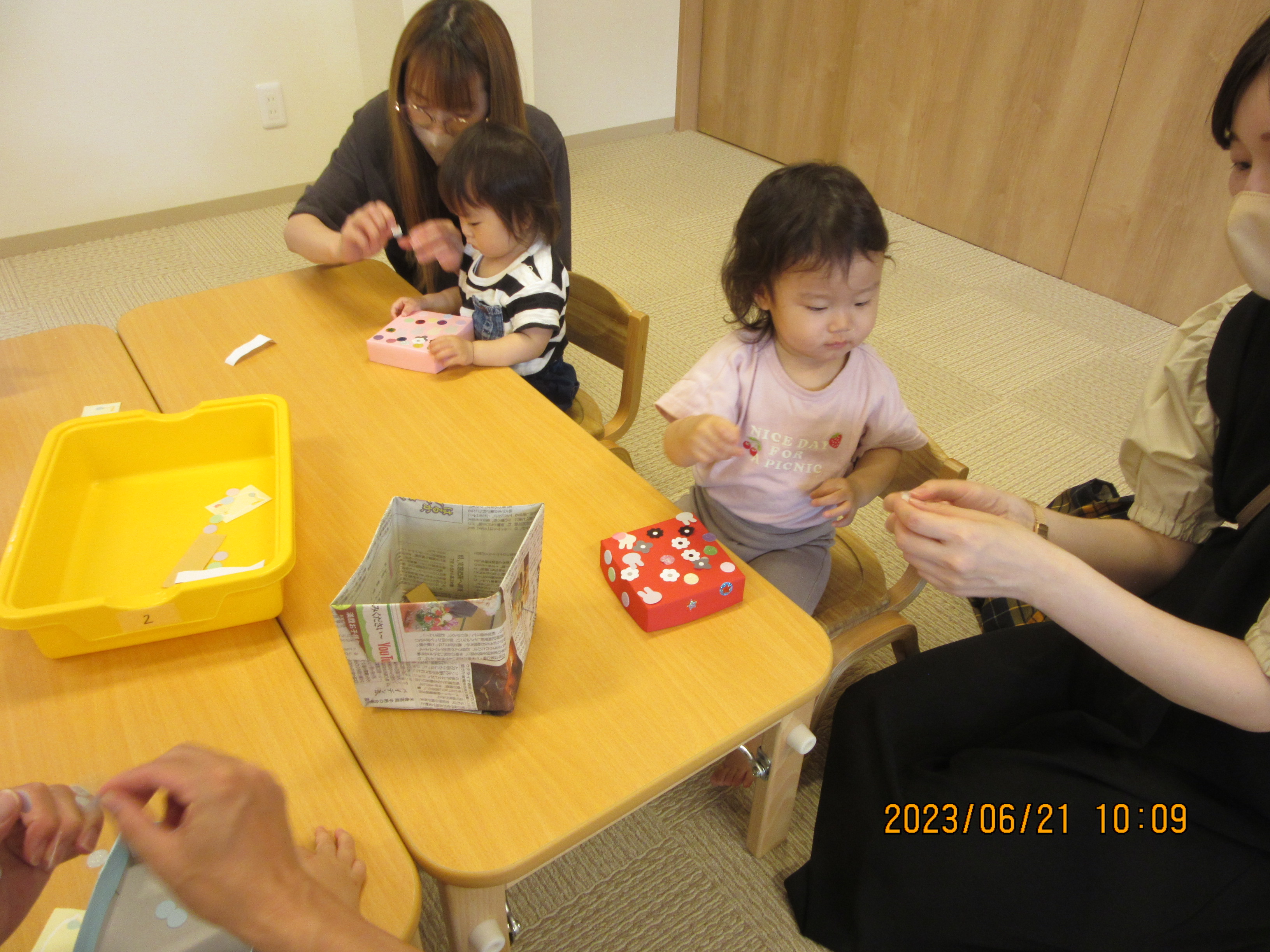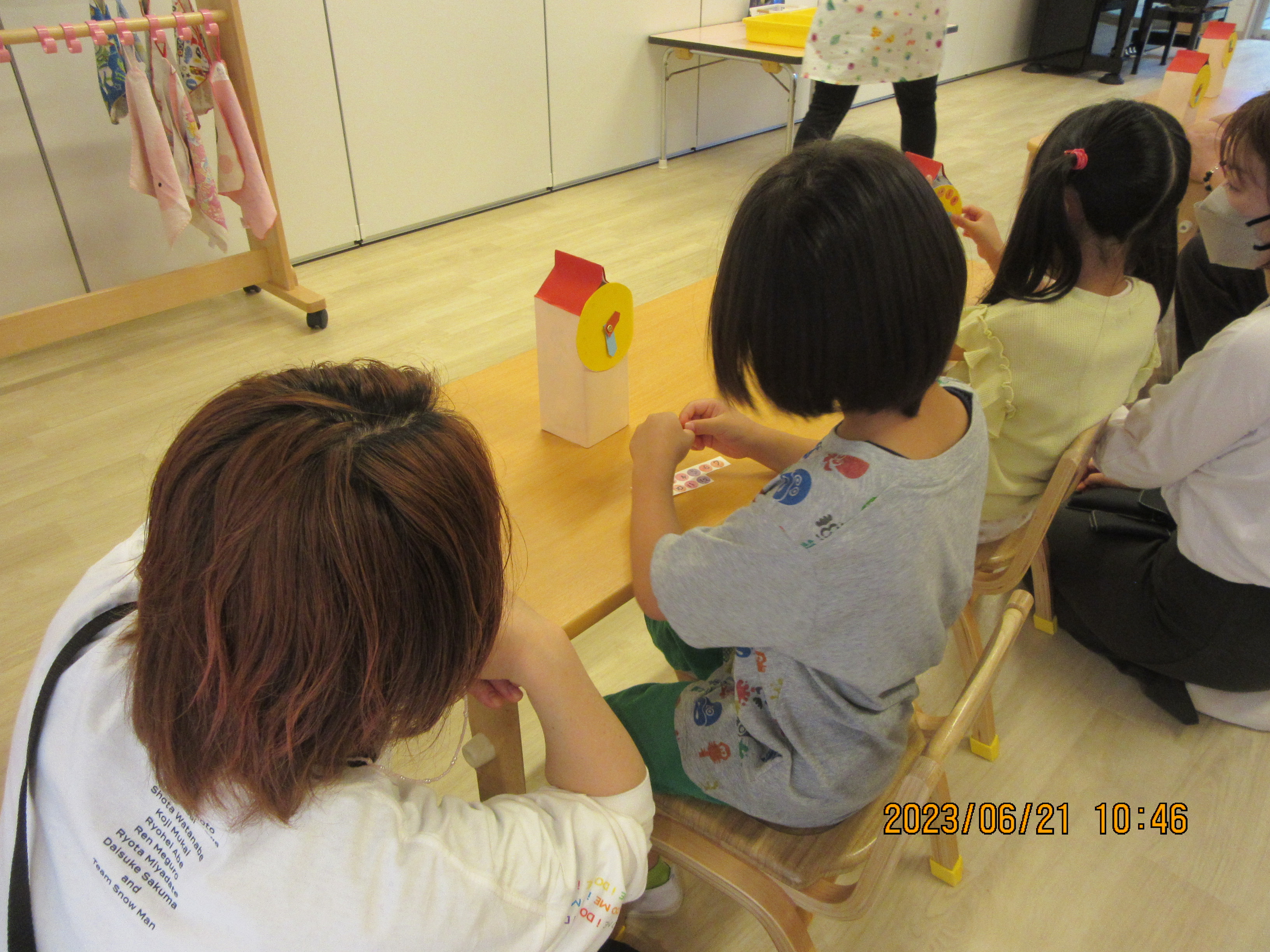 〈ひよこ組〉~牛乳パックにシールを貼り、音を鳴らして遊ぼう!~