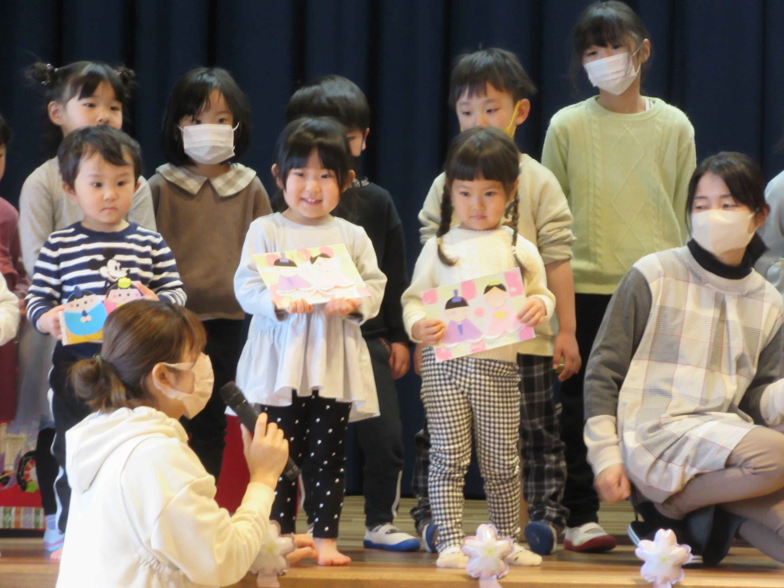 みんなの健やかな成長を願い、ひなまつり集会を行いました。今年も可愛い手作りおひなさまたちが勢ぞろい♡