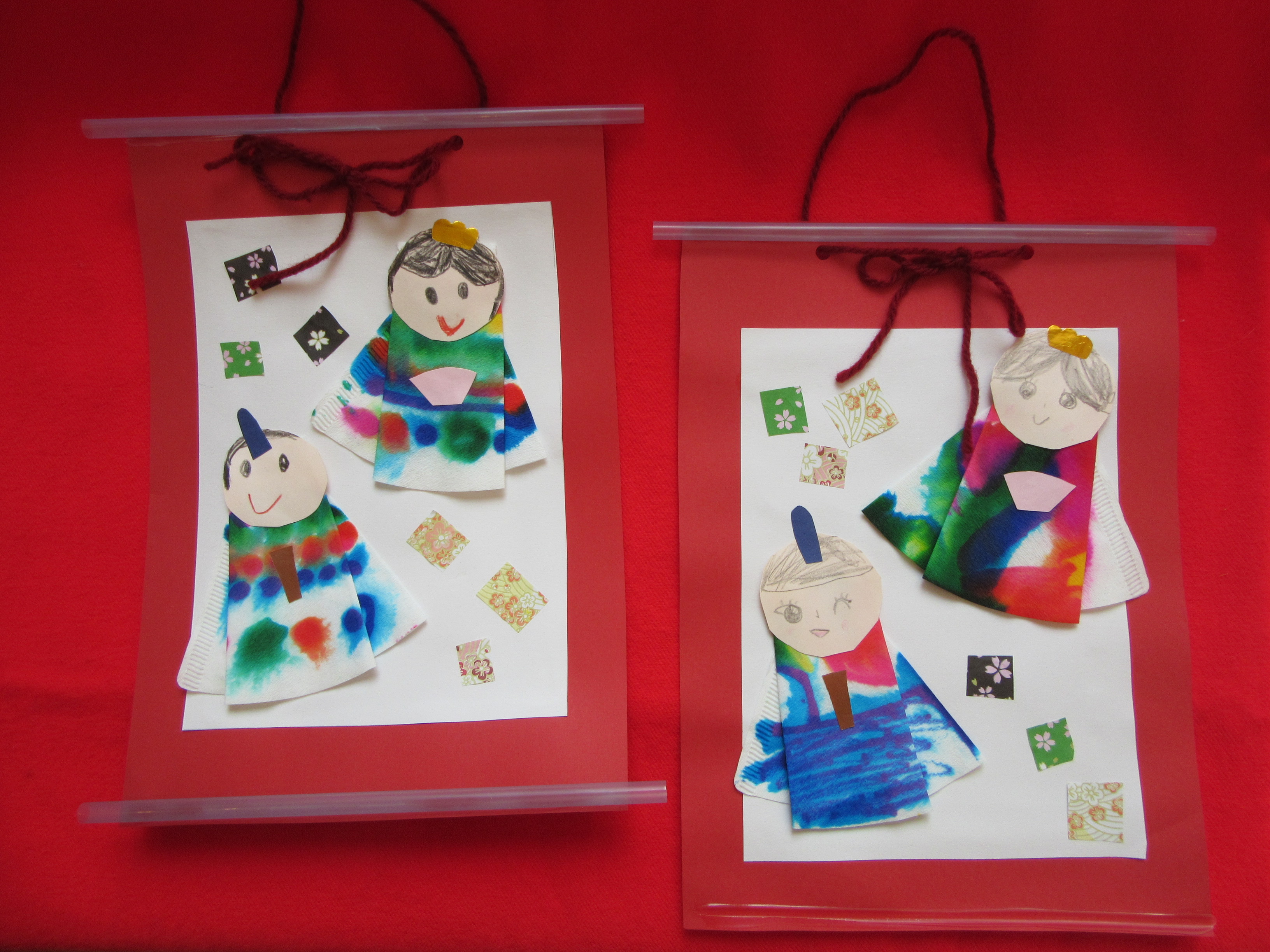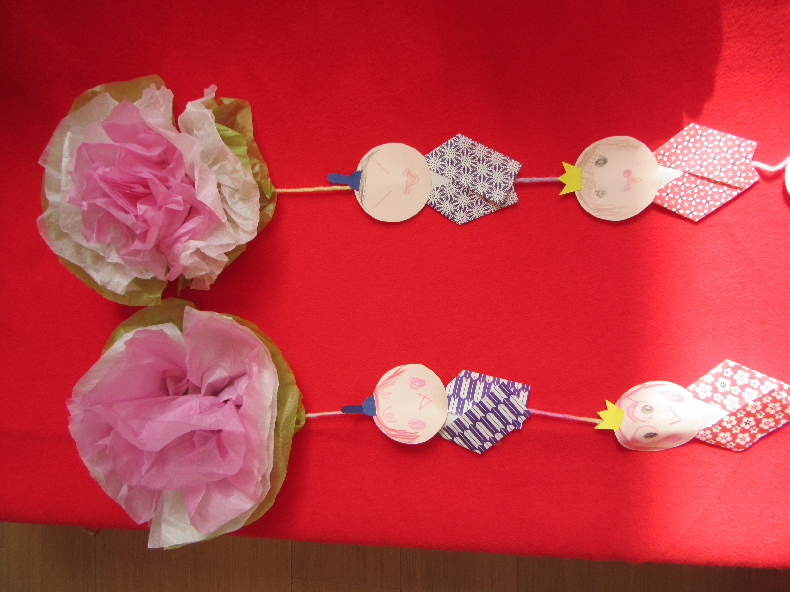 お花紙を自分で広げて吊るし飾りにしたよ! にじみ絵で着物を作ったよ。千代紙の飾りもステキ!