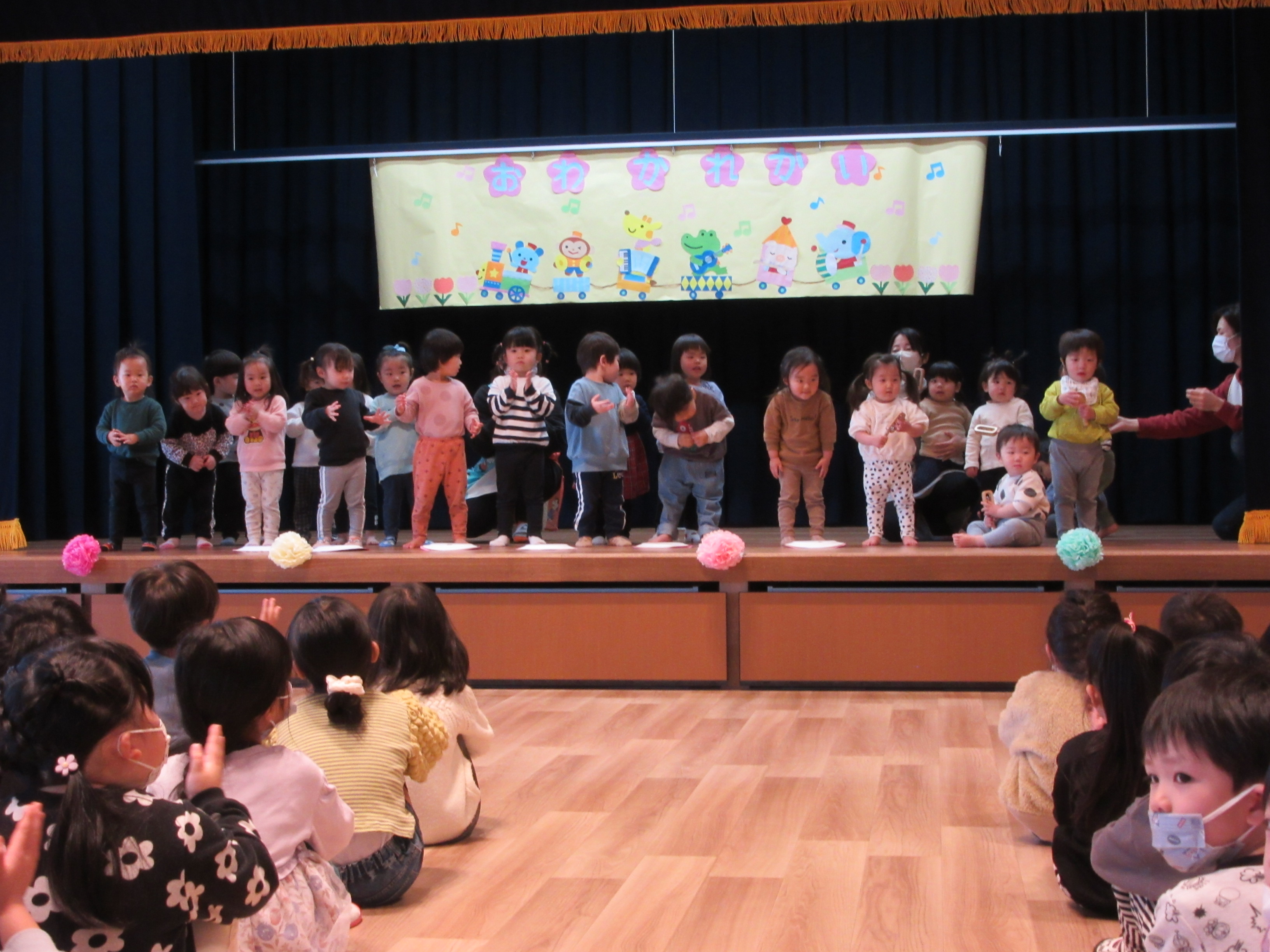「おもちゃのチャチャチャ」に合わせて、0歳児さんは楽器をフリフリ!1歳児さんは可愛いダンスを披露しました。