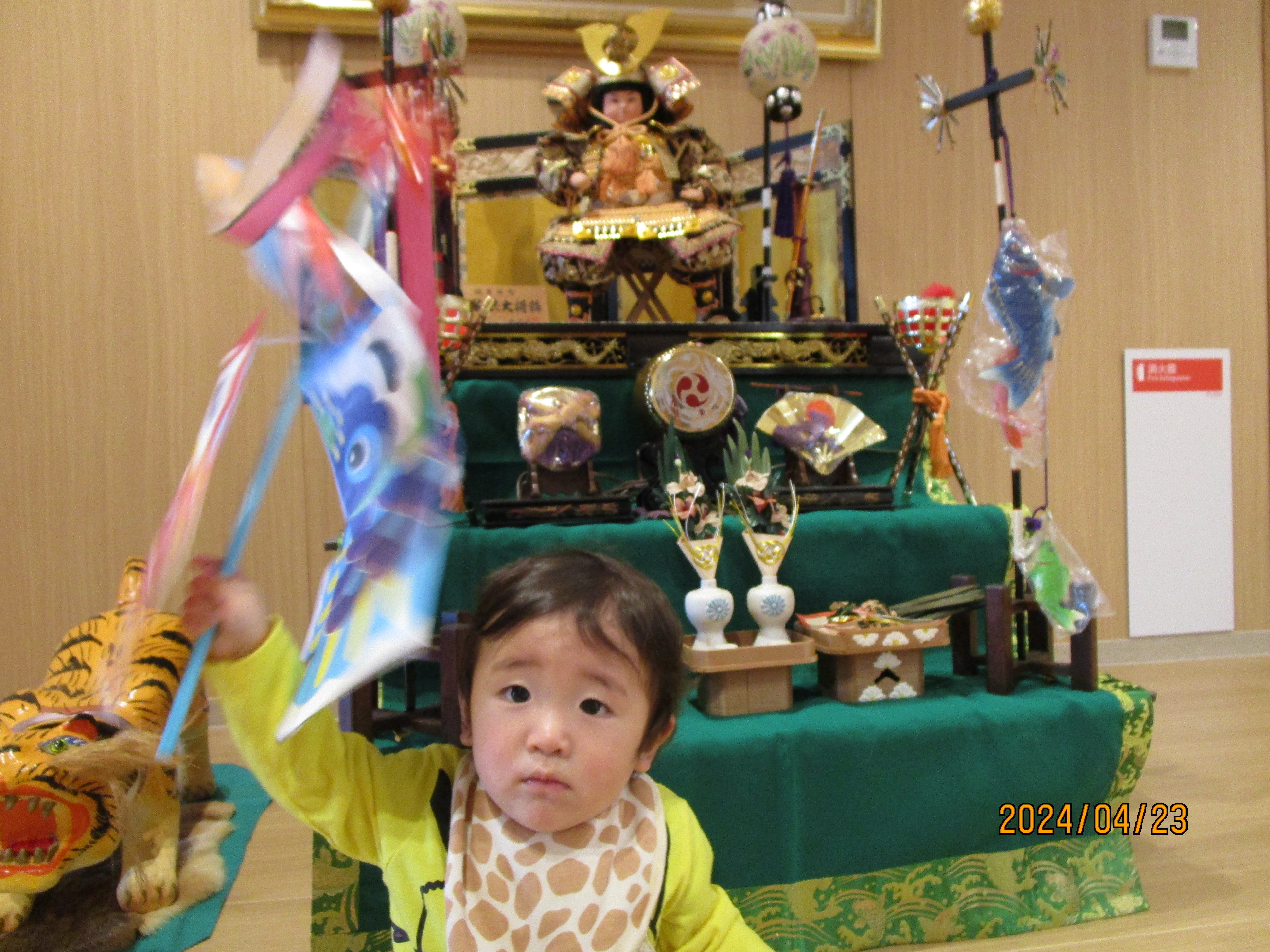 5月人形の前で「ハイポーズ!」 おもちゃで遊ぶの楽しいね♡