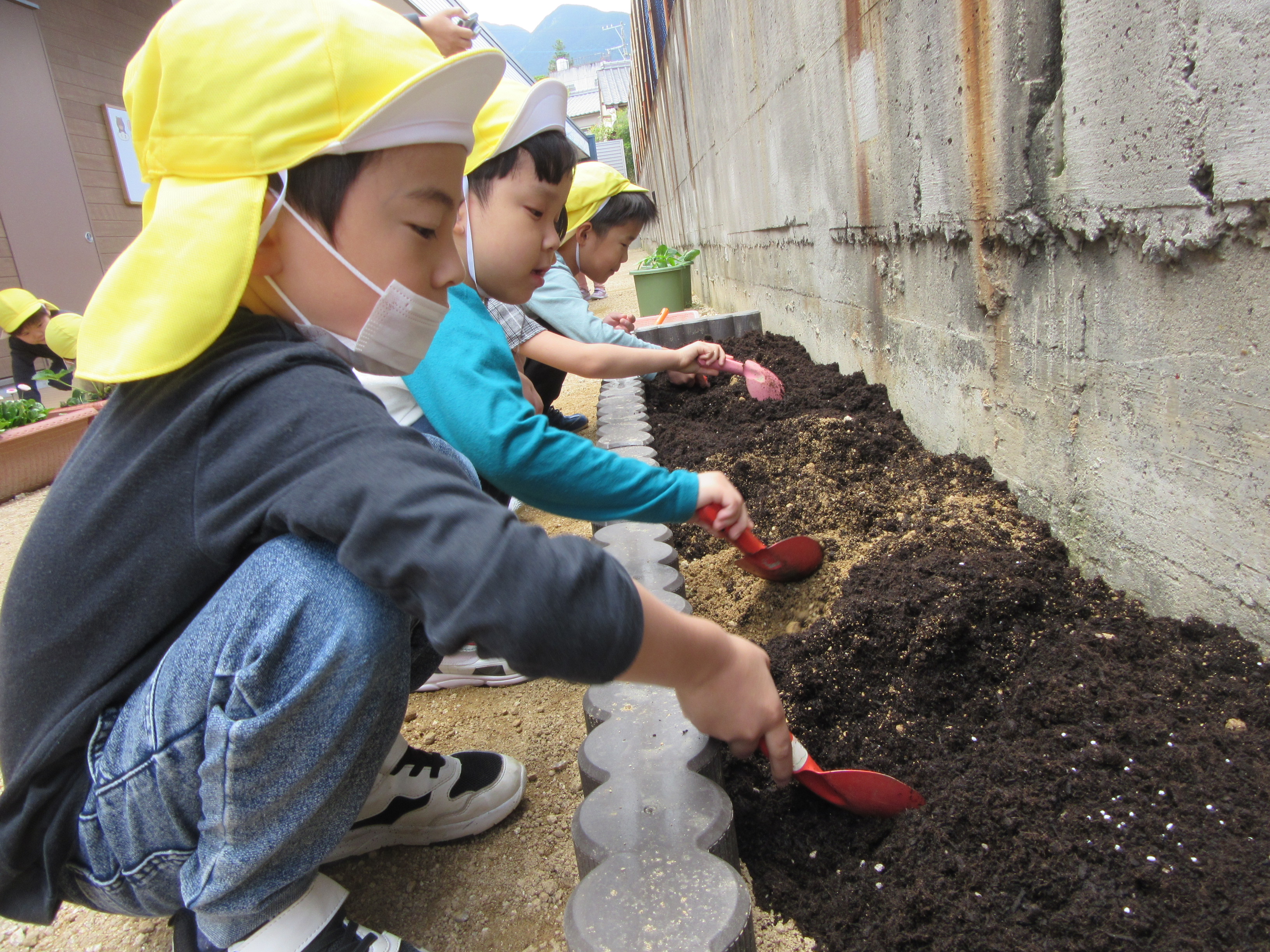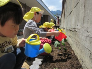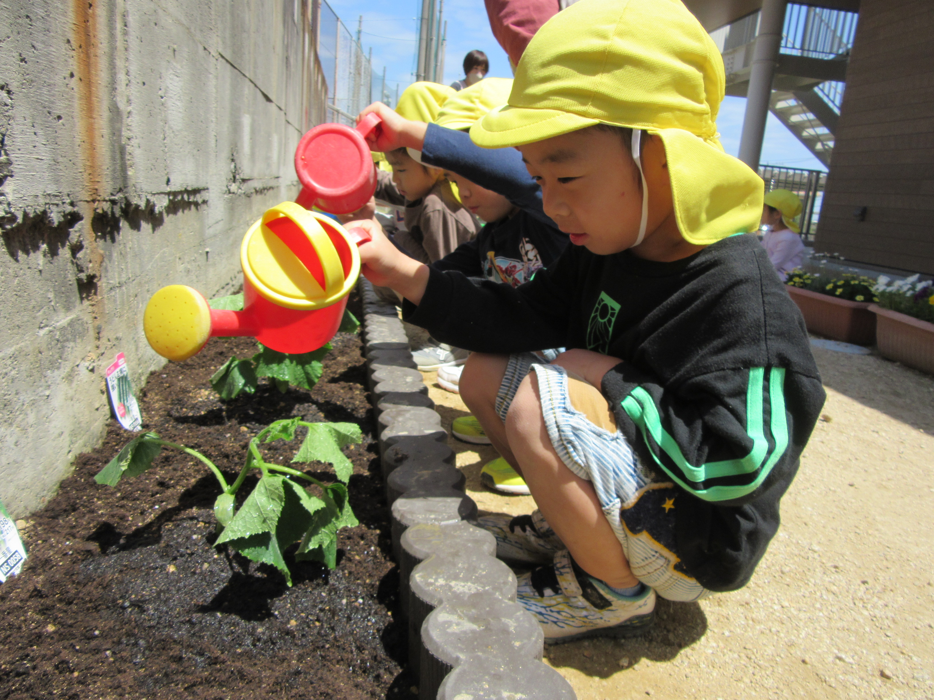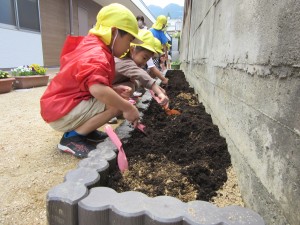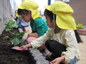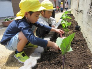 夏野菜の苗植え(5月9日実施)2024年5月17日新しい菜園ができました☆ 年長児が、夏野菜『きゅうり、なす、ピーマン、オクラ、ズッキーニ』の苗を植えてくれました!! それぞれの苗の説明と、どんな風に植えるのかをしっかり聞いて、 まずは、土作りから始めていきます☆ 『野菜がよく育ついい土になりますように』 『耕した土に、野菜を植えて、やさしく土をかけてあげました』 『はやく大きくなぁれとお願いしながら、たっぷり水をあげました』 野菜が実る日を楽しみに、毎日観察をしたり、お世話をしながら、大切に育てていきたいと思います。 施設情報愛媛県新居浜市にある児童福祉施設中萩保育園あいさつのできる子 つよい体のやさしい子 話の聞ける子 自分で考えできる子児童福祉施設 中萩保育園〒792-0045愛媛県新居浜市中萩町8番1号TEL:0897-41-7233 FAX:0897-41-7209中萩保育園WEBサイト最近の記事2025年9月25日敬老の日 はがき作り児童福祉施設 中萩保育園2025年9月25日誕生会(9月5日実施)児童福祉施設 中萩保育園2025年8月25日防災集会(8月21日実施)児童福祉施設 中萩保育園2025年8月25日プール大会(8月6日実施)児童福祉施設 中萩保育園2025年8月25日誕生会(8月1日実施)児童福祉施設 中萩保育園2025年7月31日アイス屋さんごっこ(7月22日実施)児童福祉施設 中萩保育園中萩保育園の記事一覧