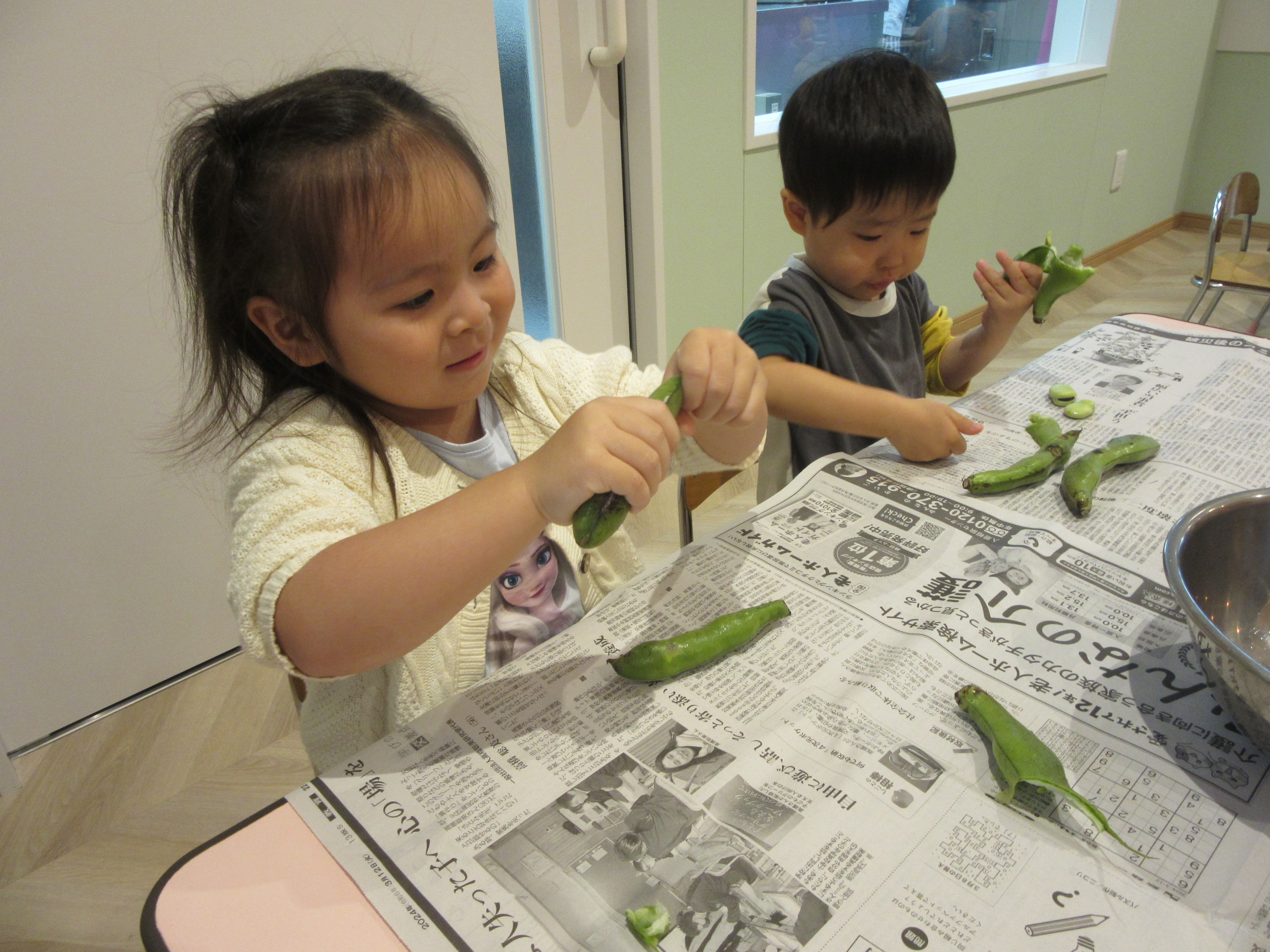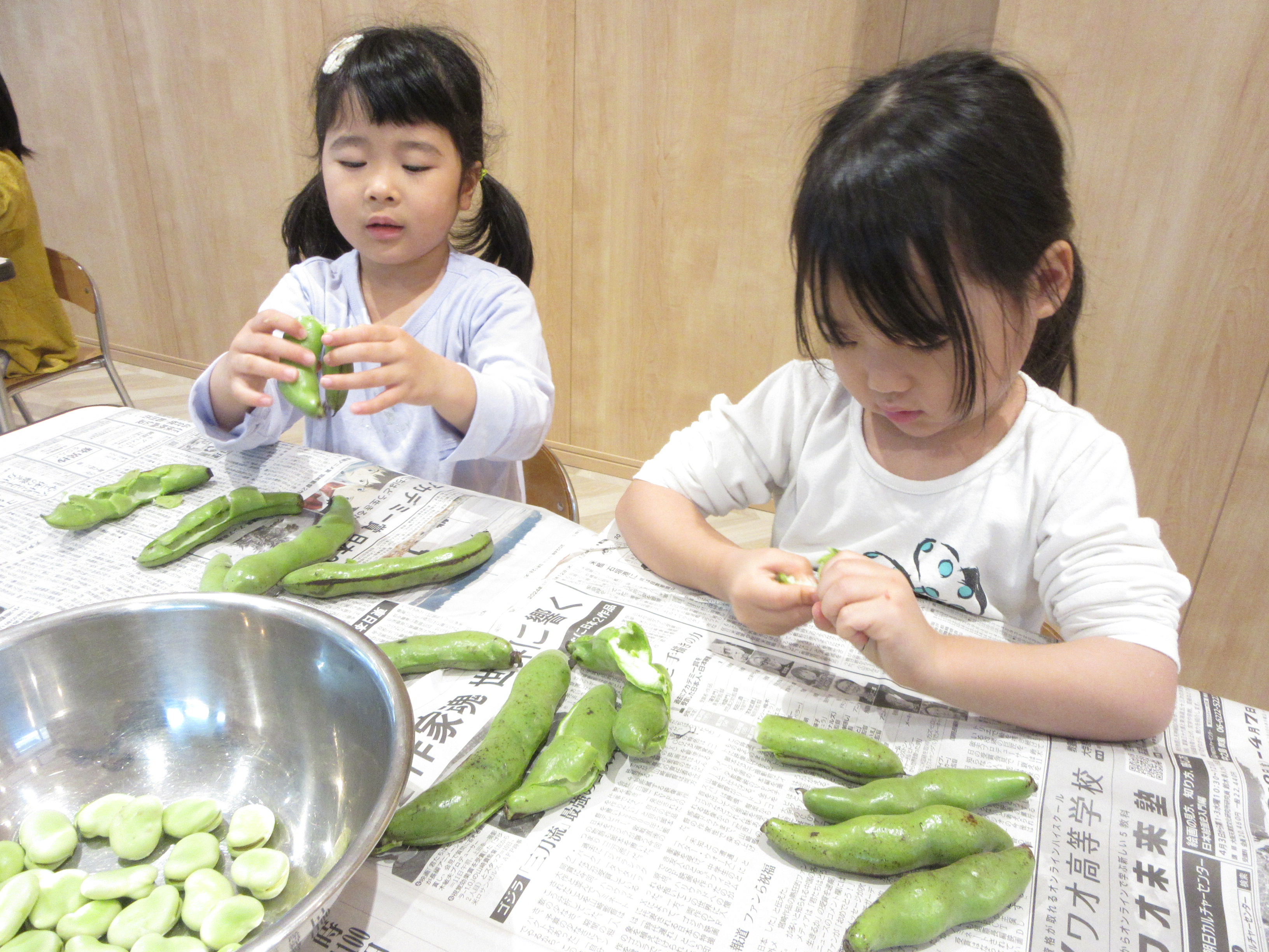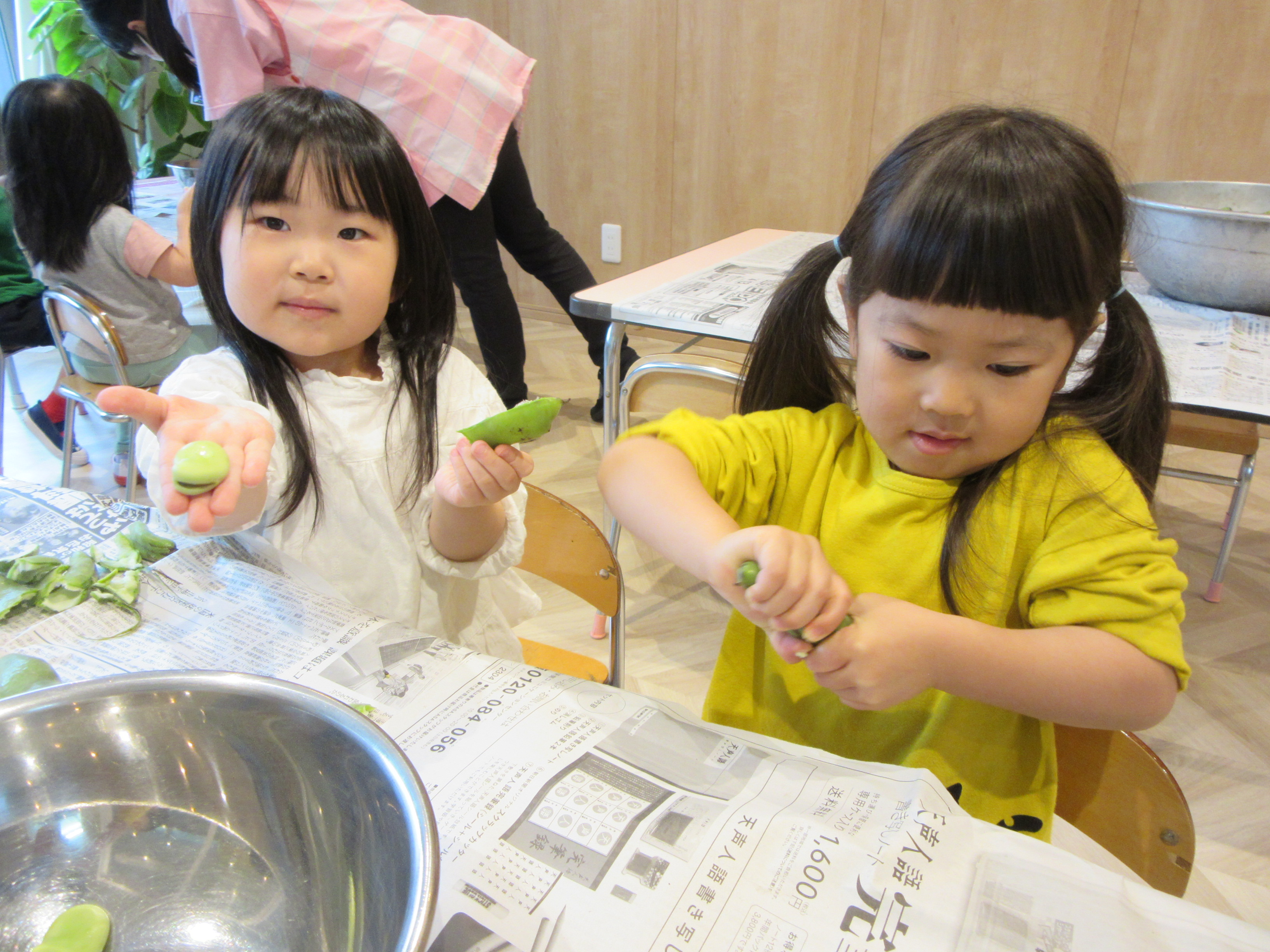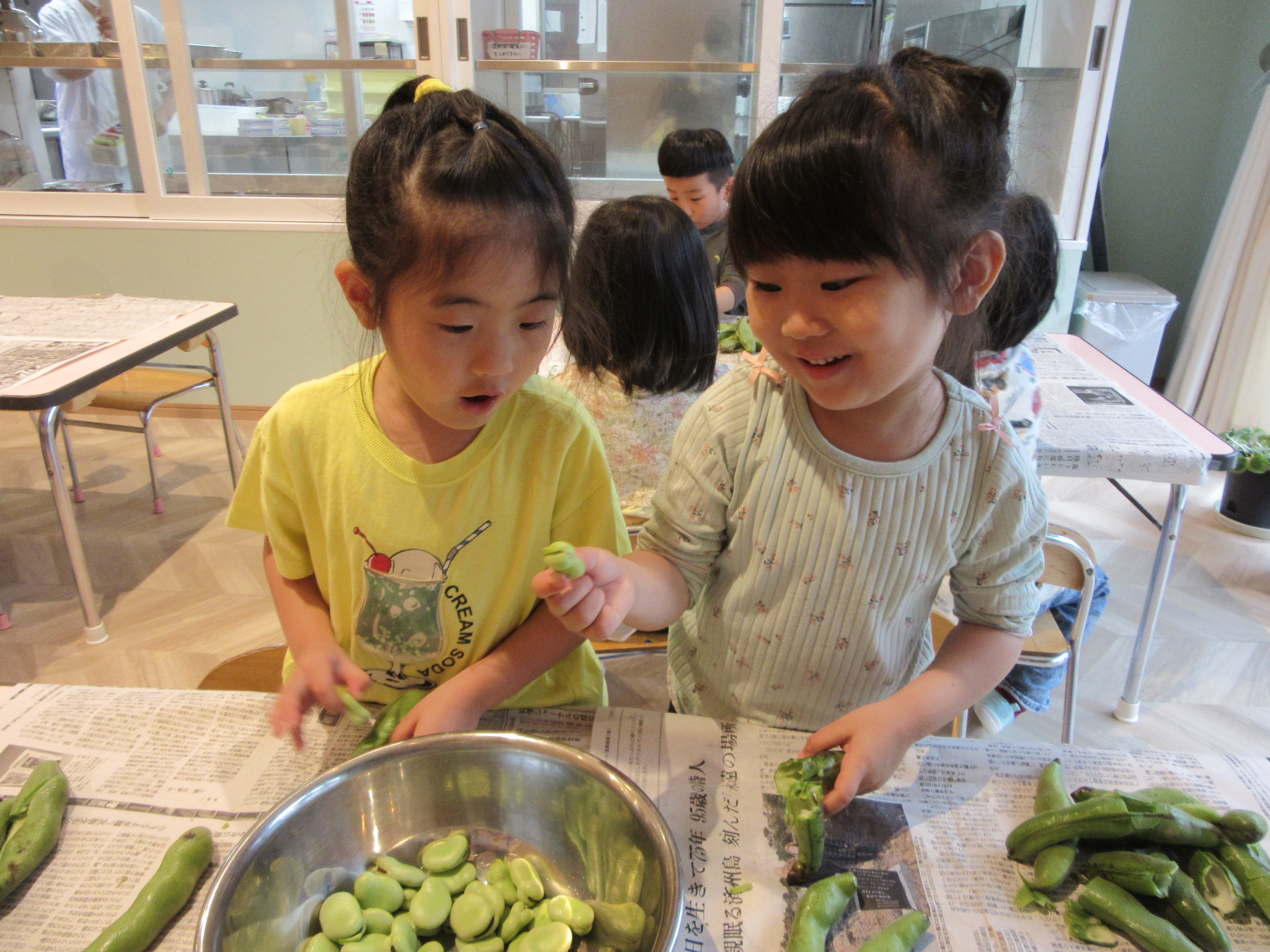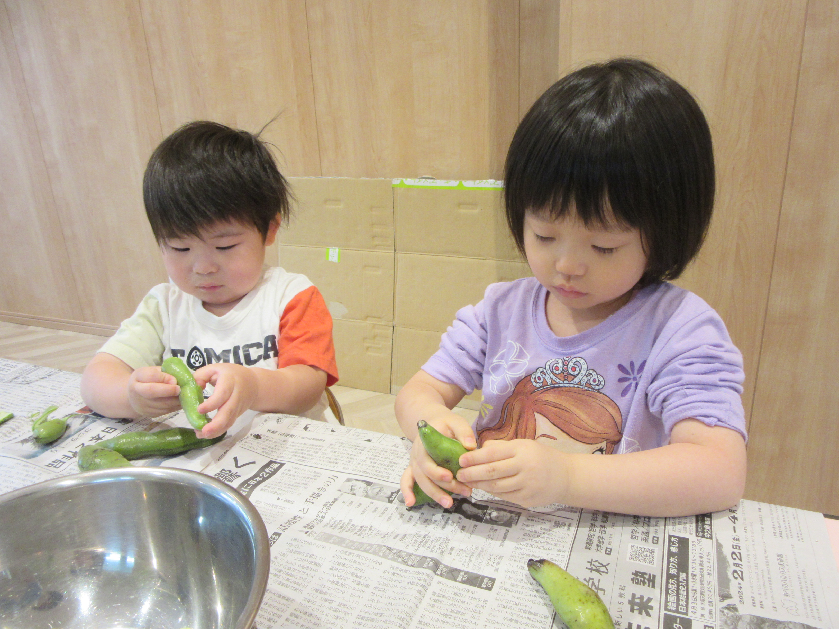 年少児、年中児が空豆の皮むきのお手伝いをしてくれました!!