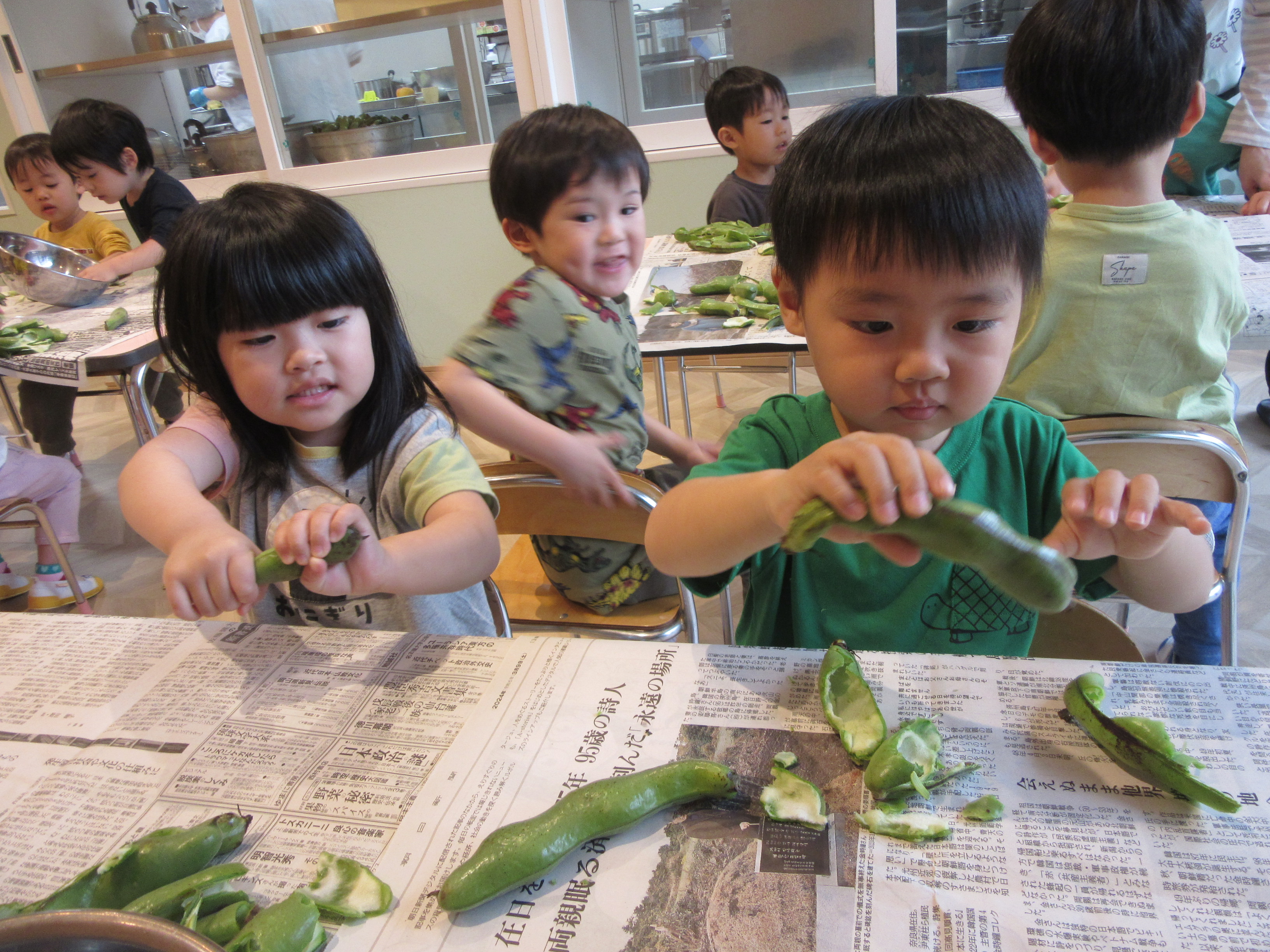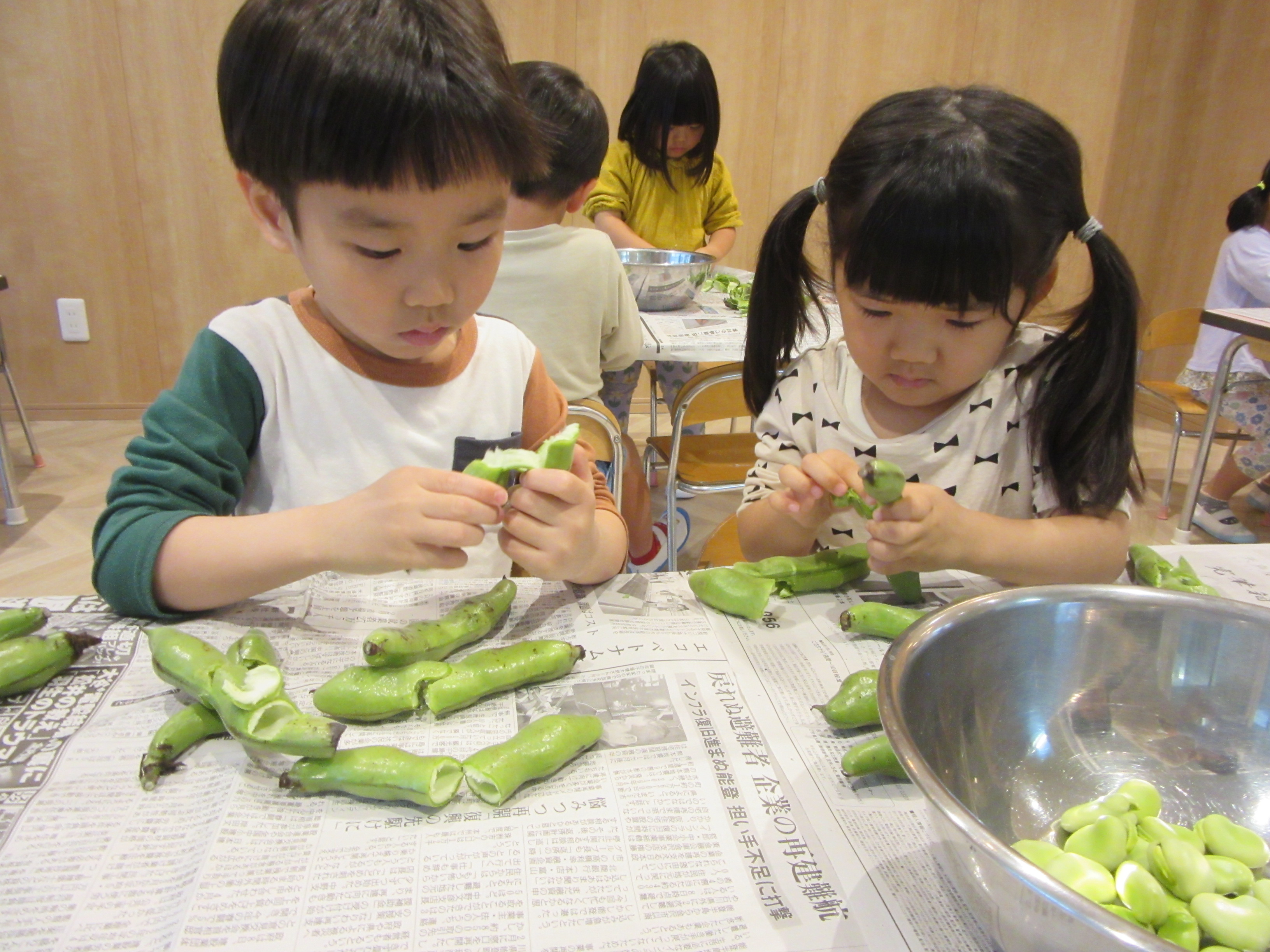 皮が固くて、どうしていいかわからないと戸惑う様子もありましたが、ぽきっと折って、皮の中から空豆が出てくると、感動して、うれしくて、最後は、まだまだやりたいと意欲的になっていく子どもたちでした。