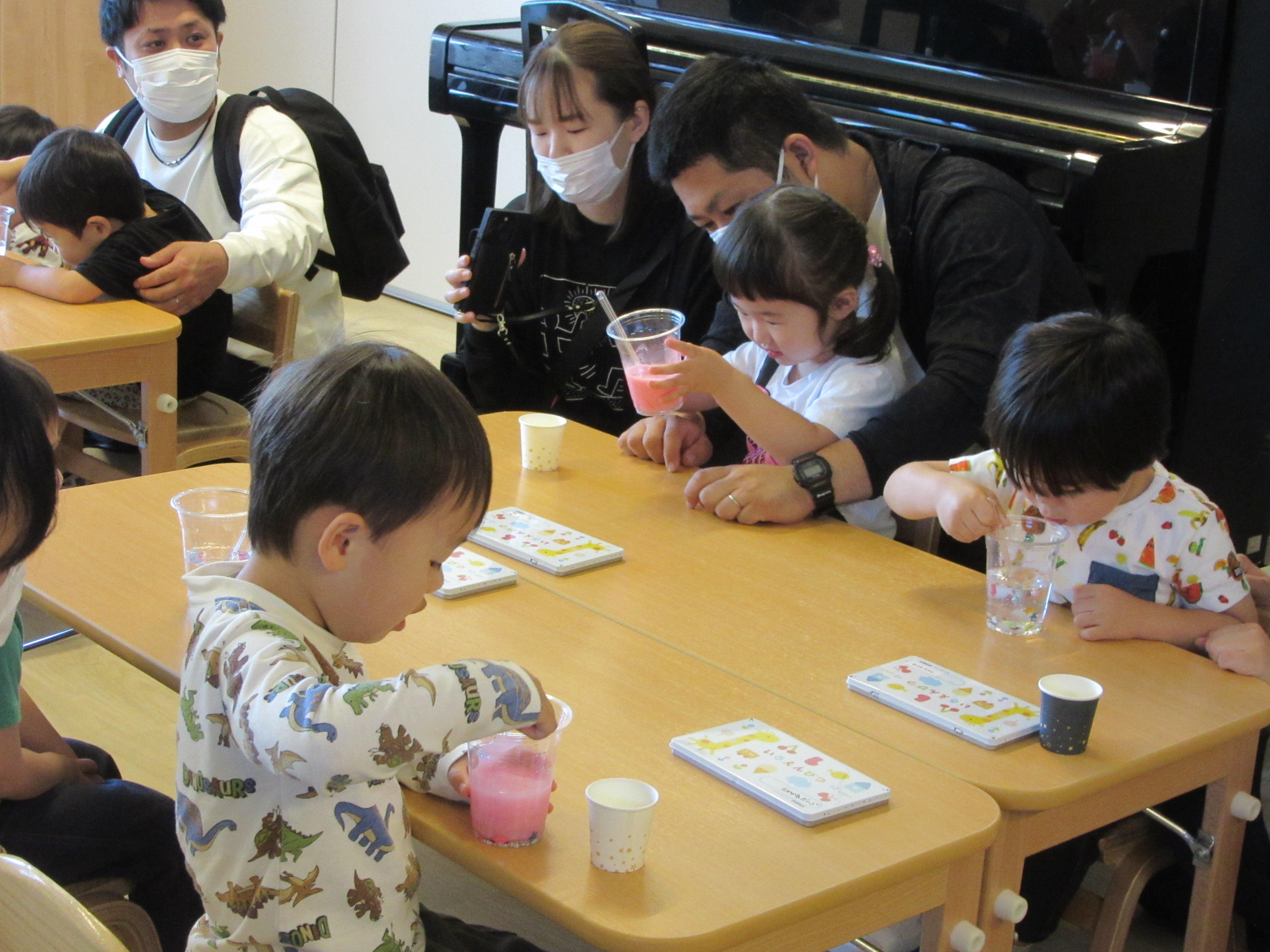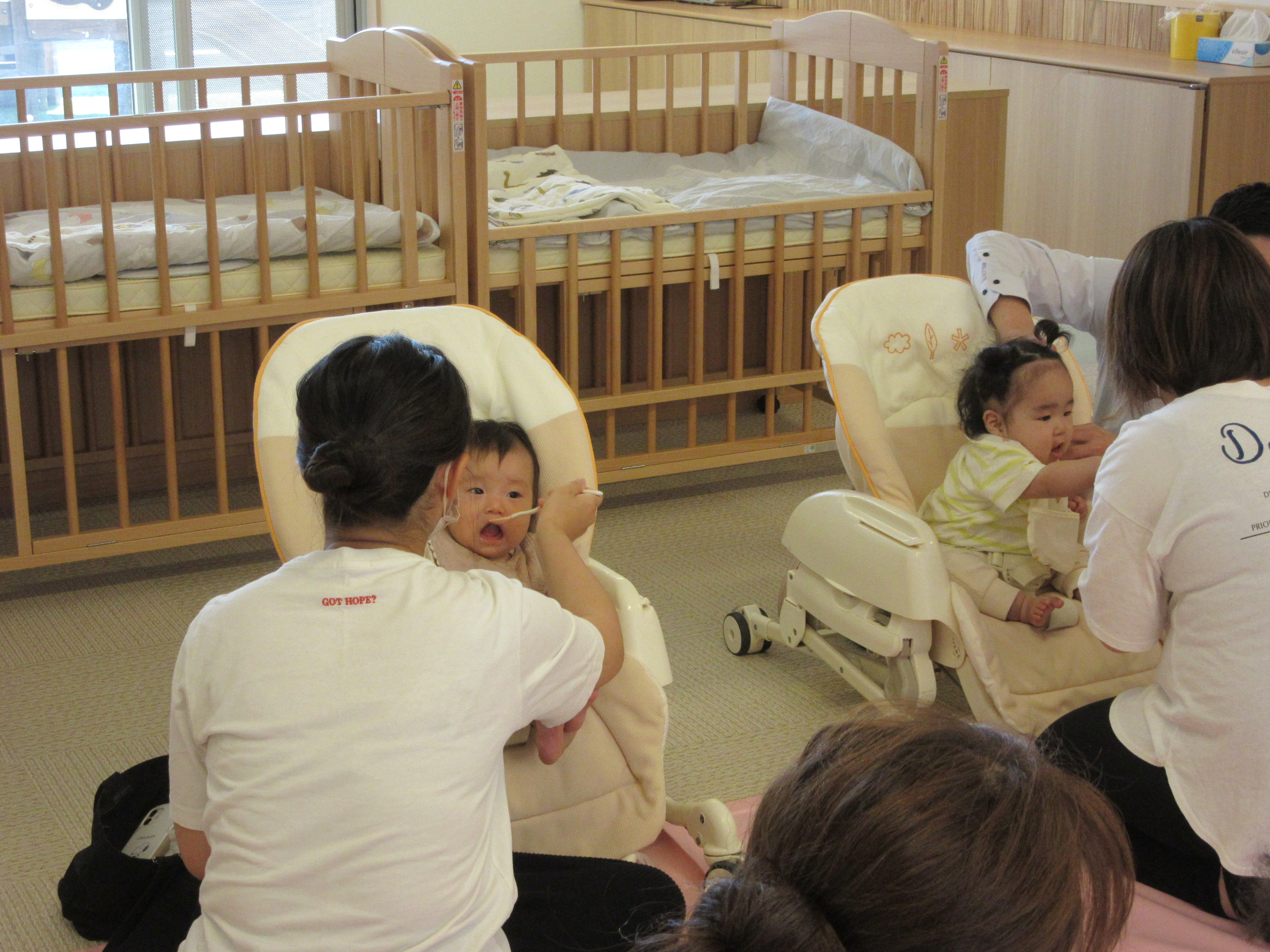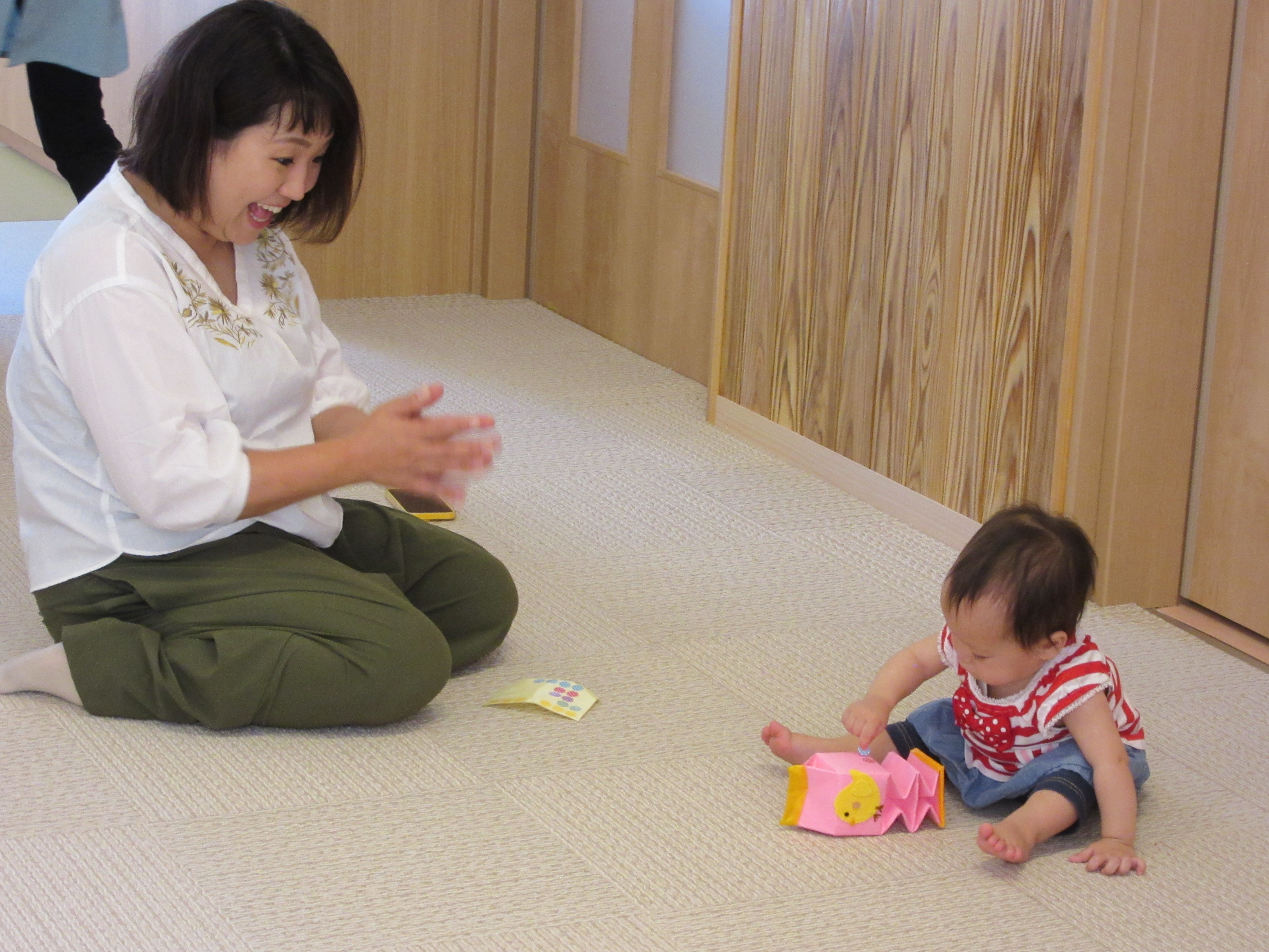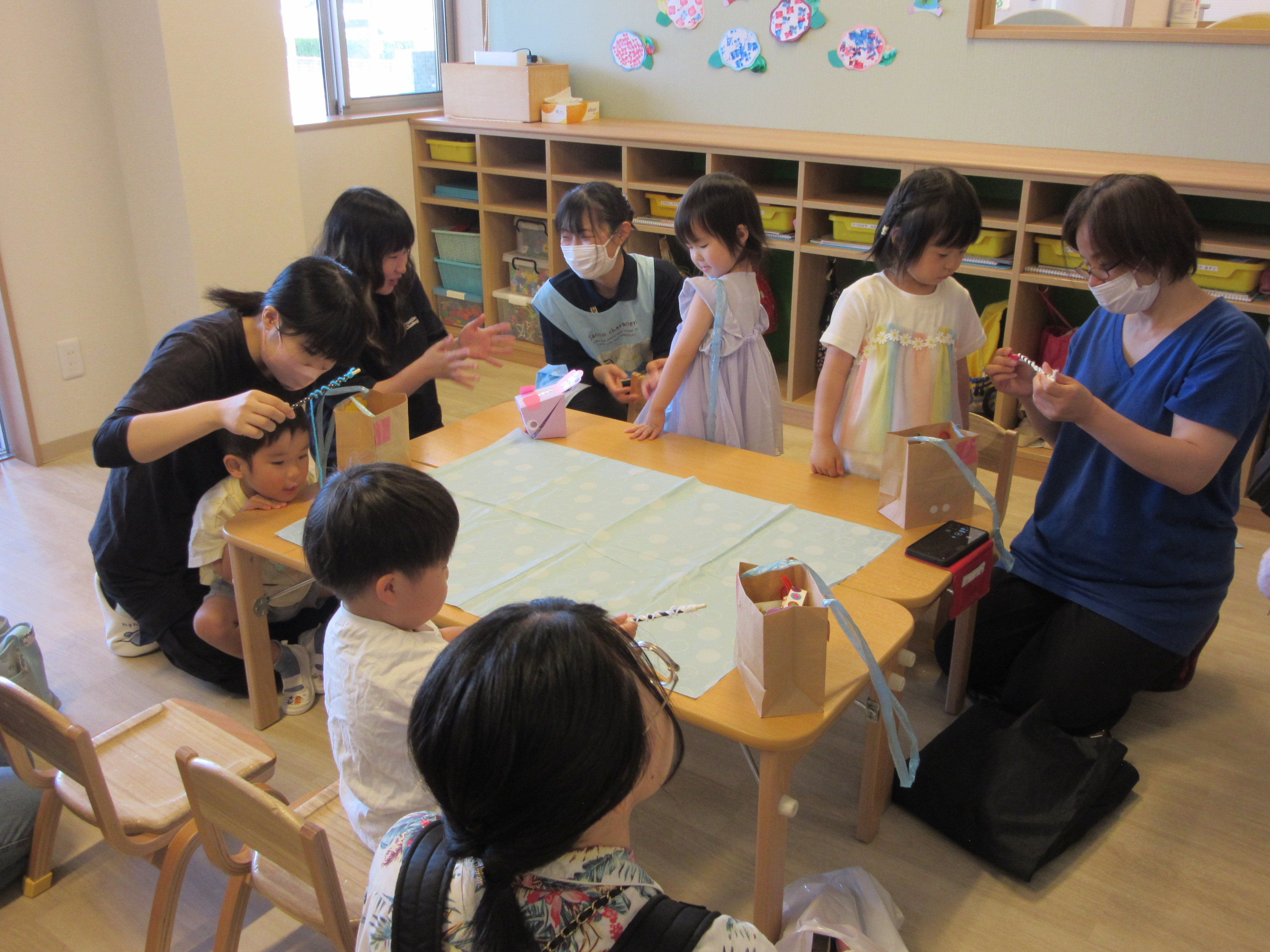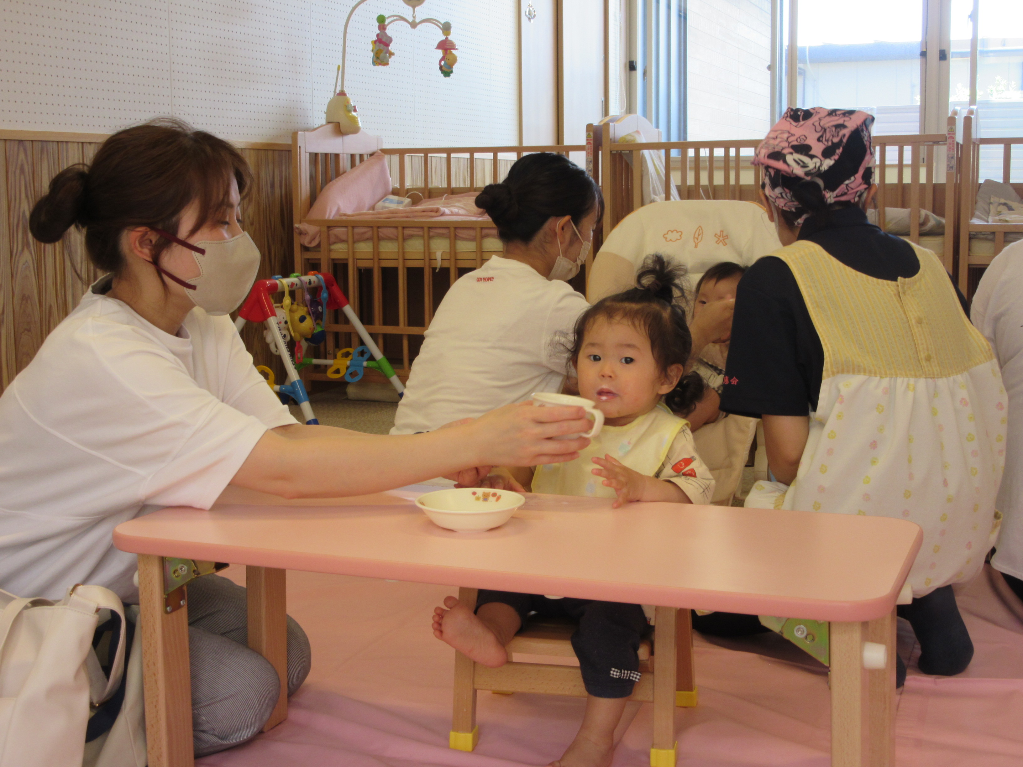 おやつ、離乳食の様子を見て頂き、その後は手作りおもちゃで遊びました。牛乳パックで作った