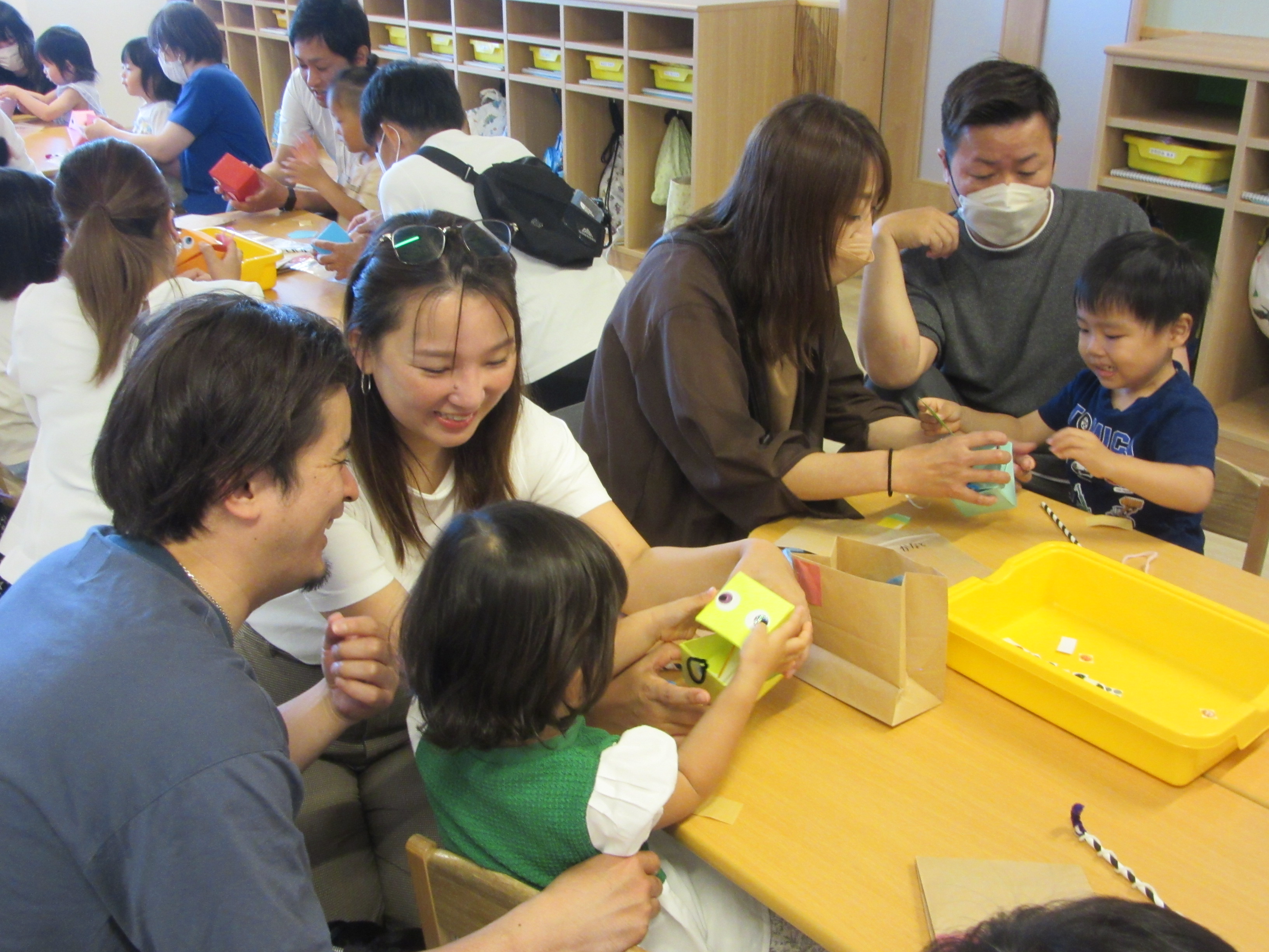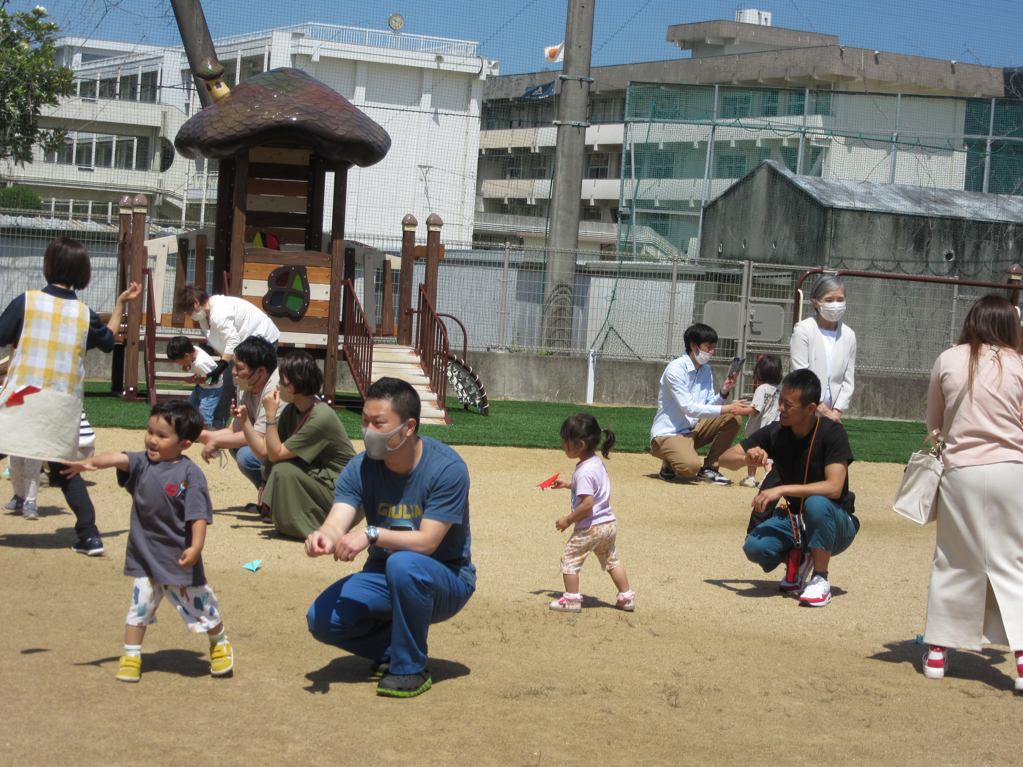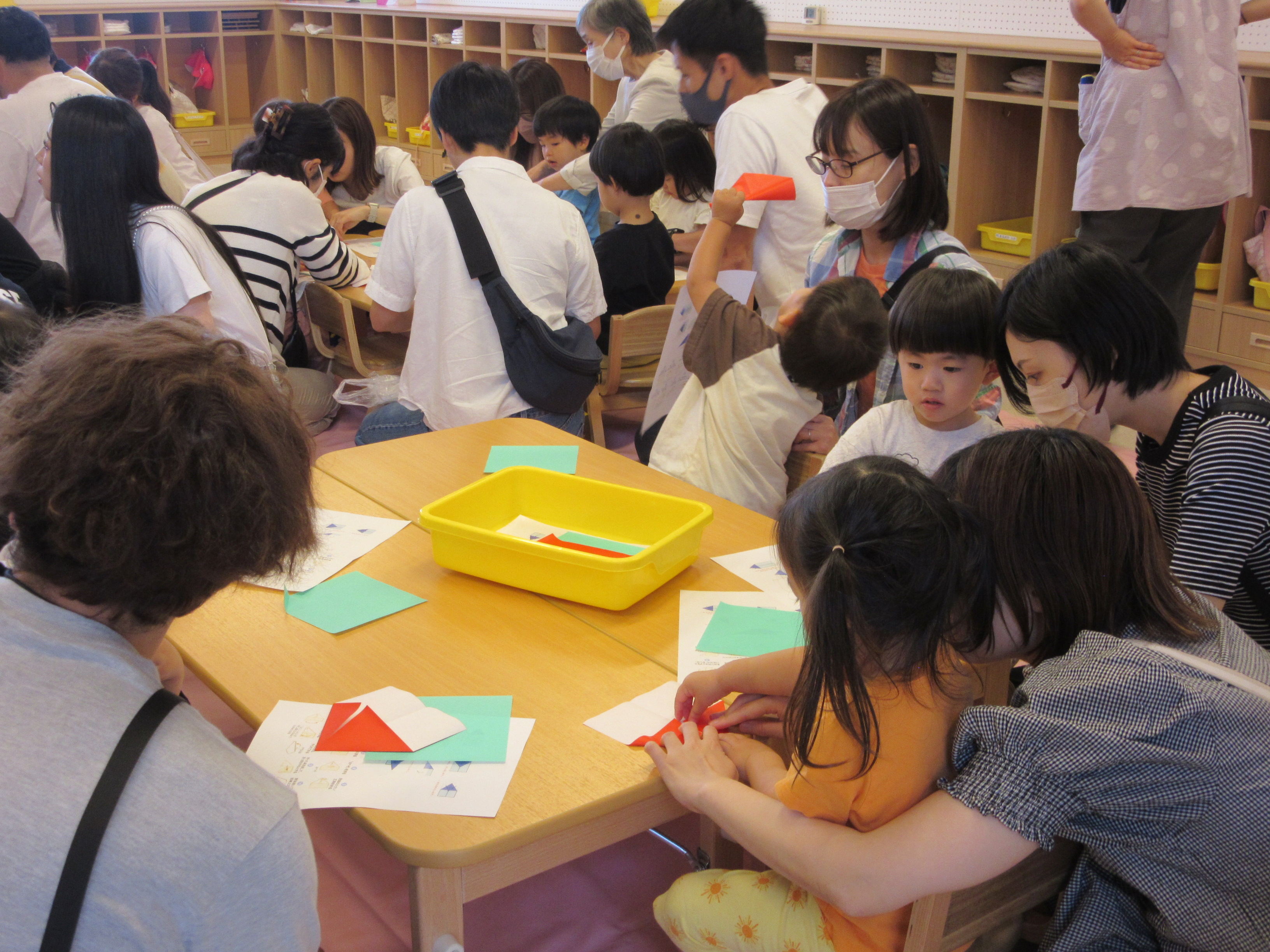 親子で一生懸命に折っています。折った後は園庭で飛ばします。「それー!!」「とんだぁ!」