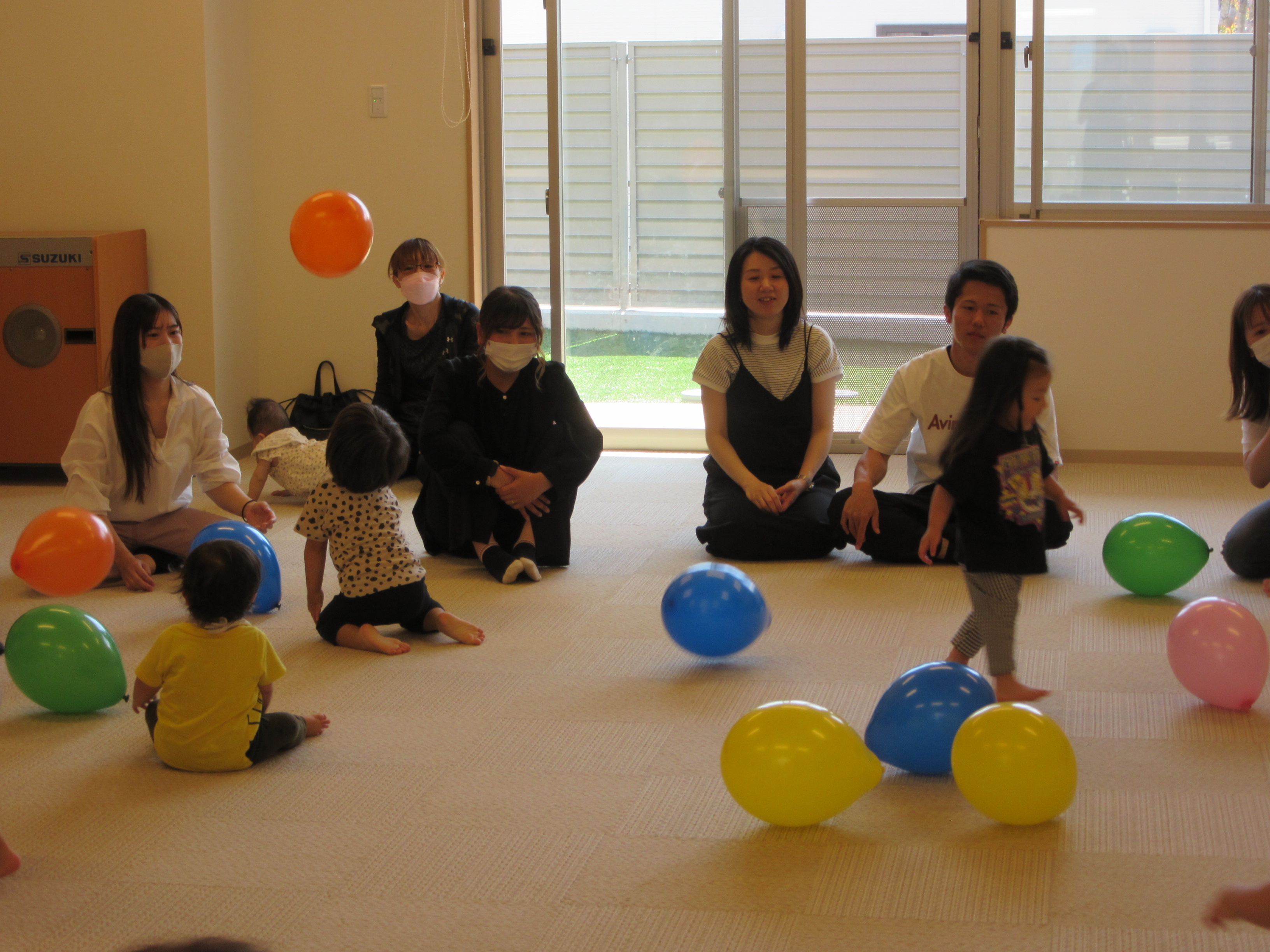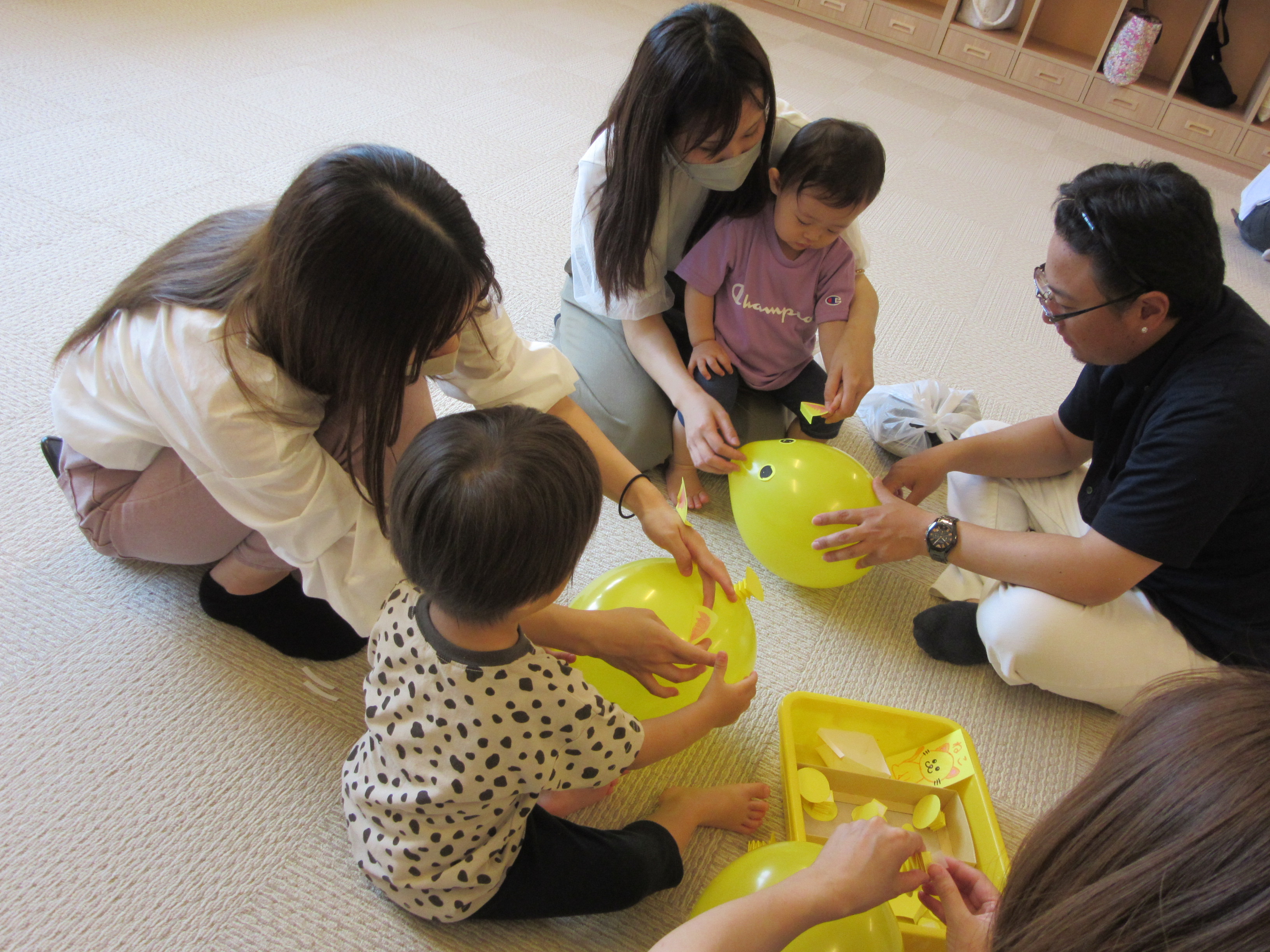 おやつの後で風船遊びをしました。遊んだ風船に親子で手足やお顔をつけて、引っ張り園舎内をお散歩しました♬