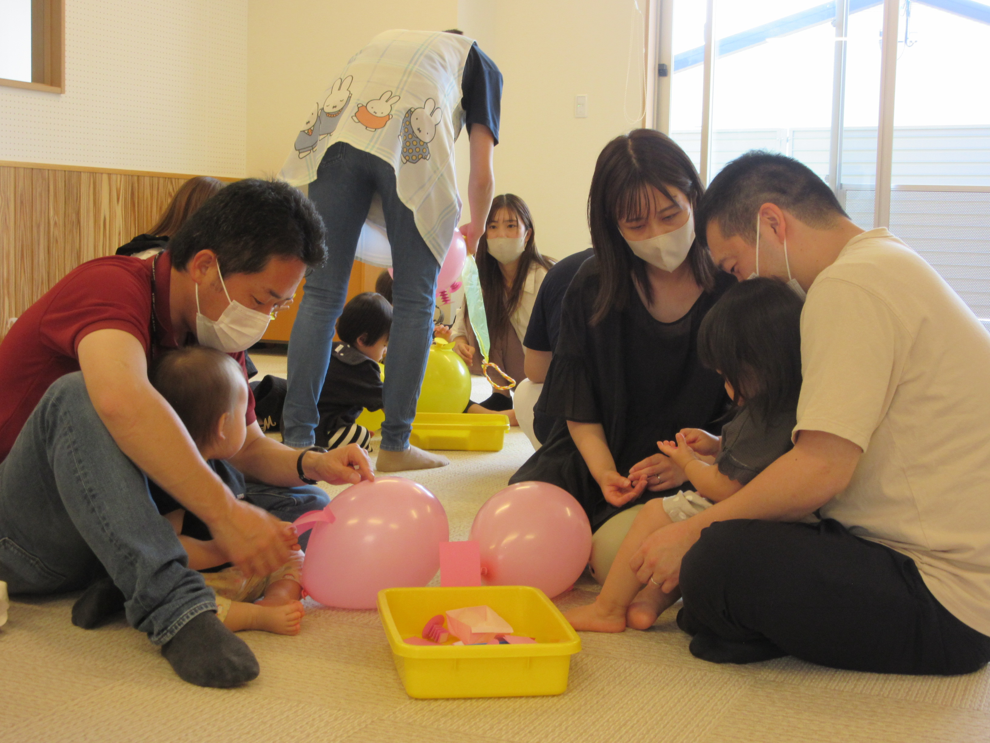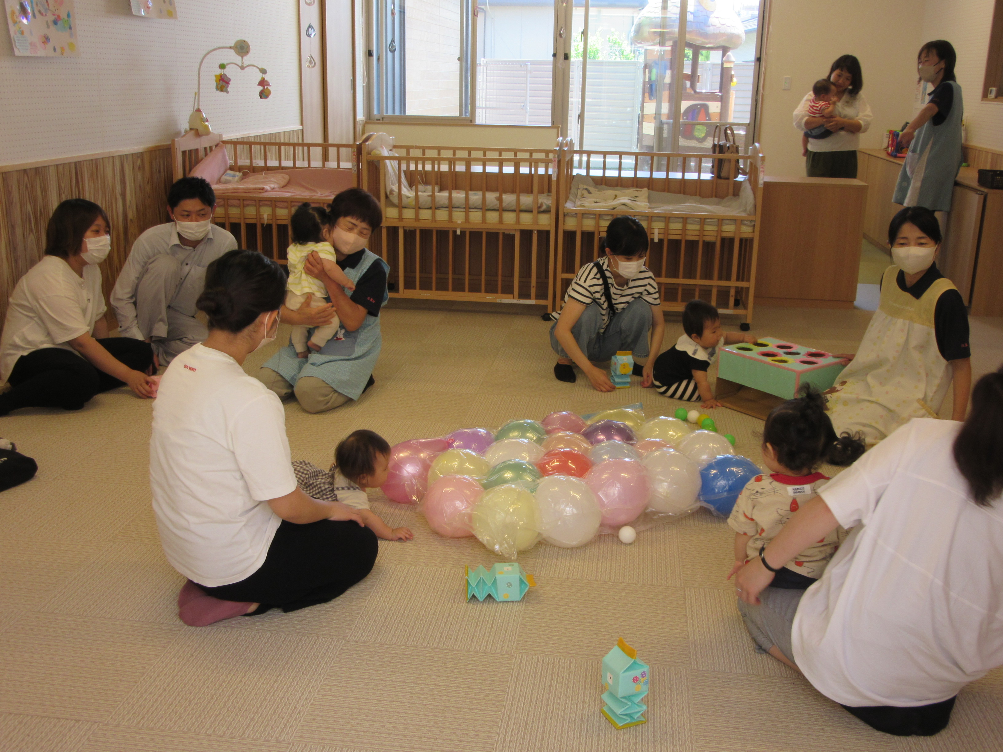 音のなるおもちゃや、風船マットに興味津々です!お母さんたちと一緒で安心した表情で遊んでいます♡