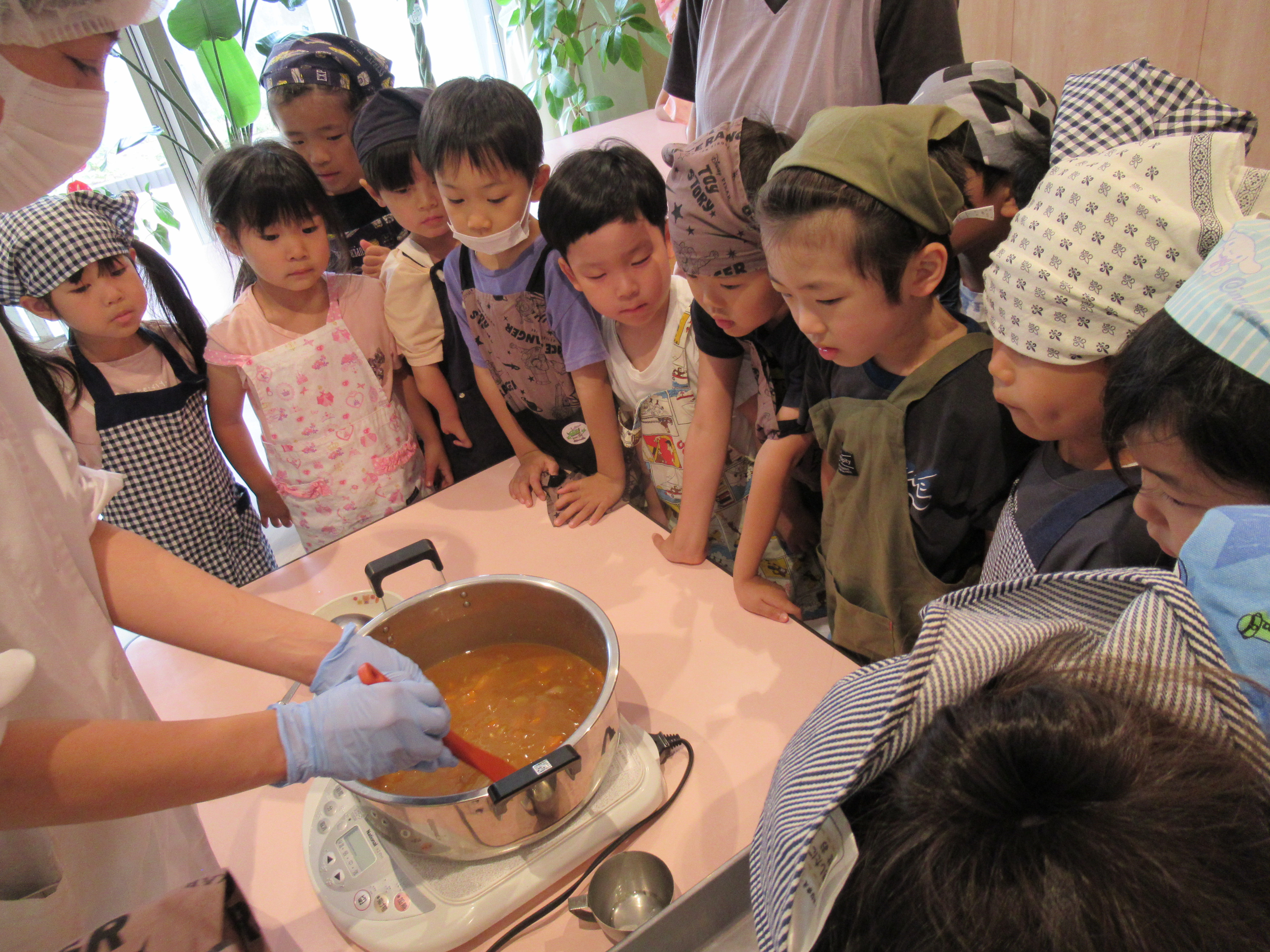 全部の野菜の下準備ができた後は、カレーが出来ていく様子を見ながら、『いいにおいしてきた♡』『おなかすいてきたね』と子どもたち。