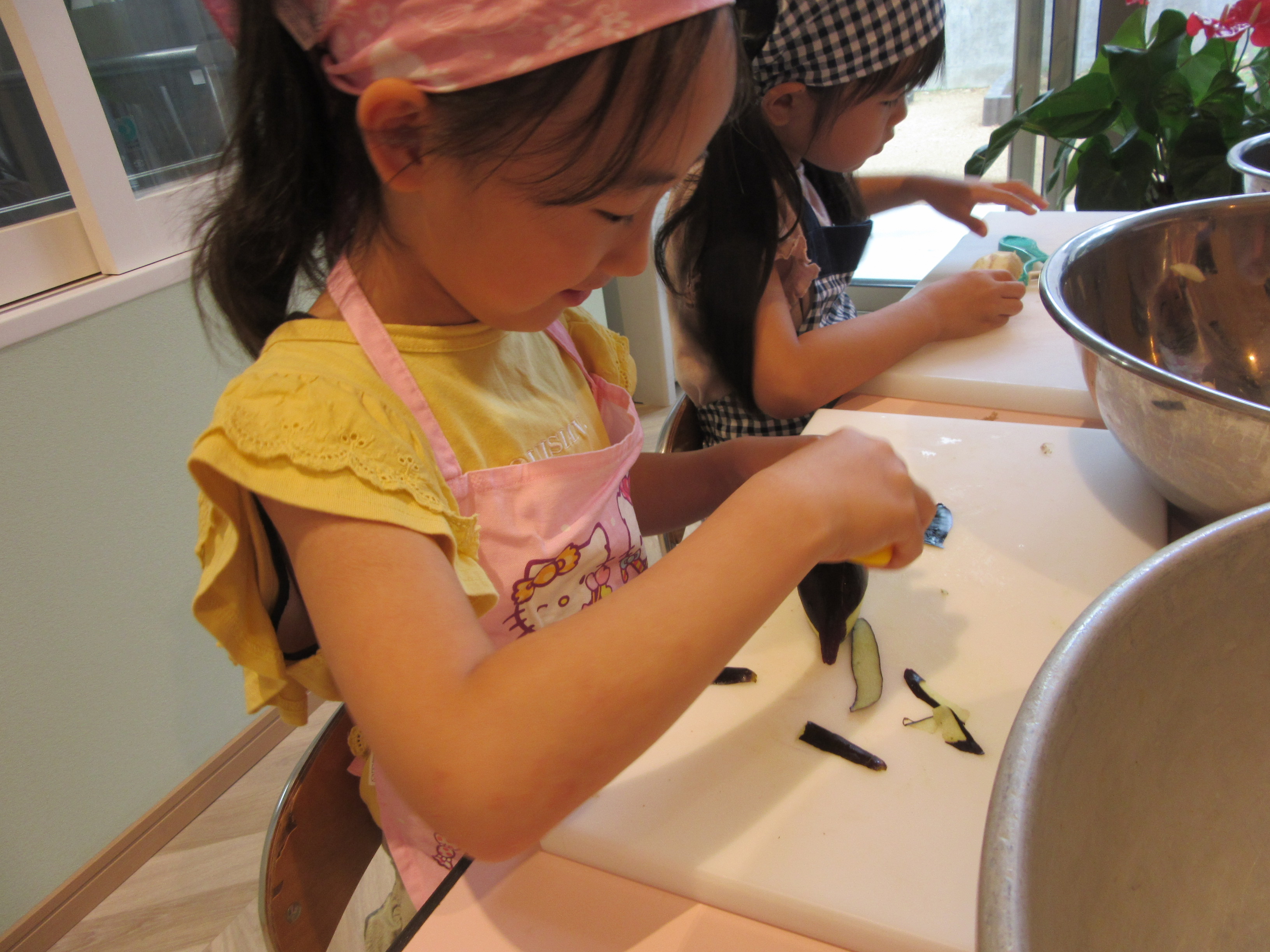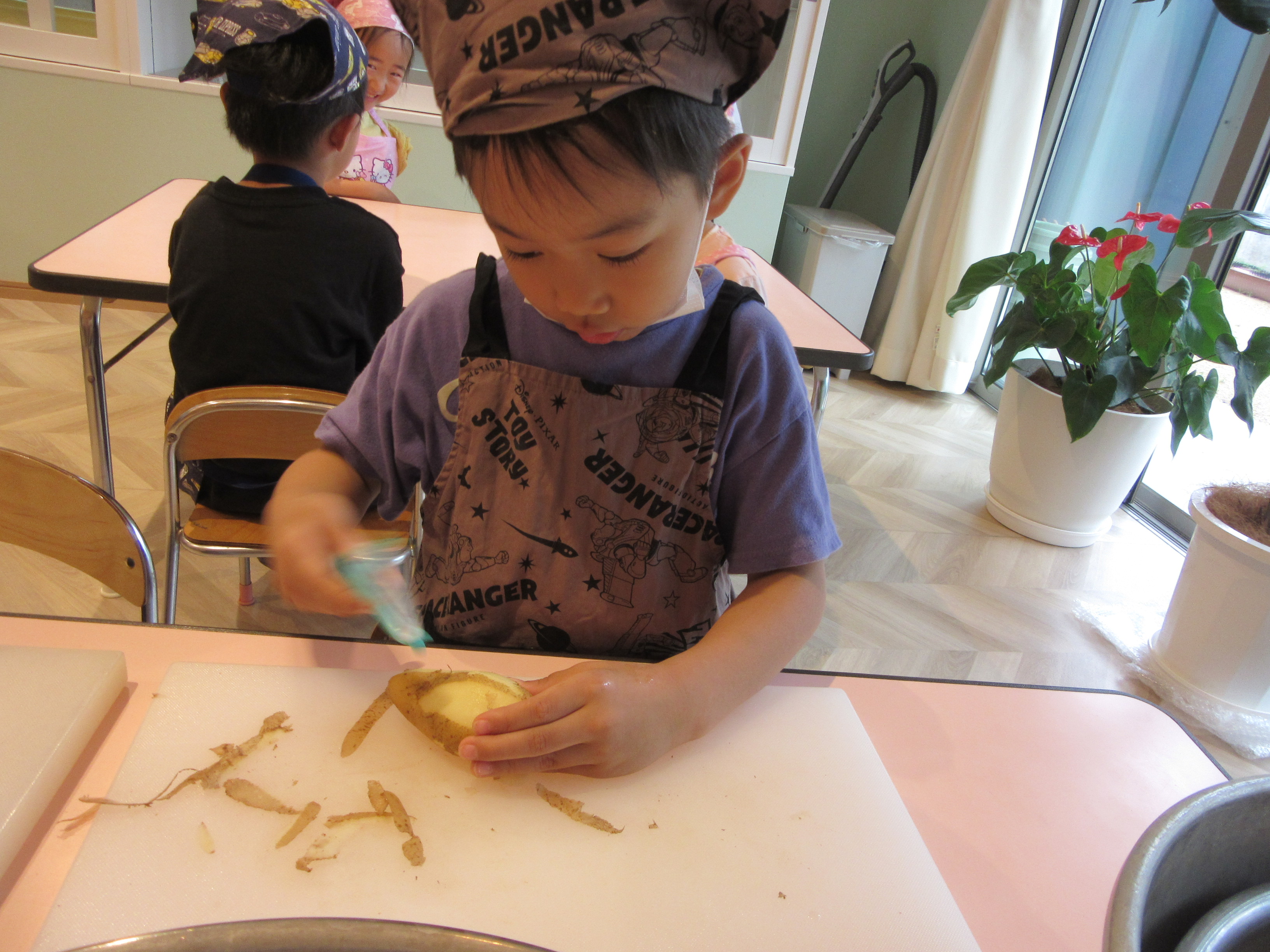 じゃがいもは転がらないようにしっかり押さえて!! 保育園でとれたなすも一緒に入れました♡