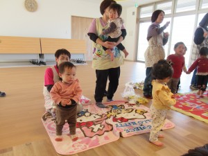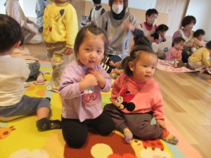 みんなが大好きな手遊びをお友達としました。手をつないだり、パチパチ合わせたりして