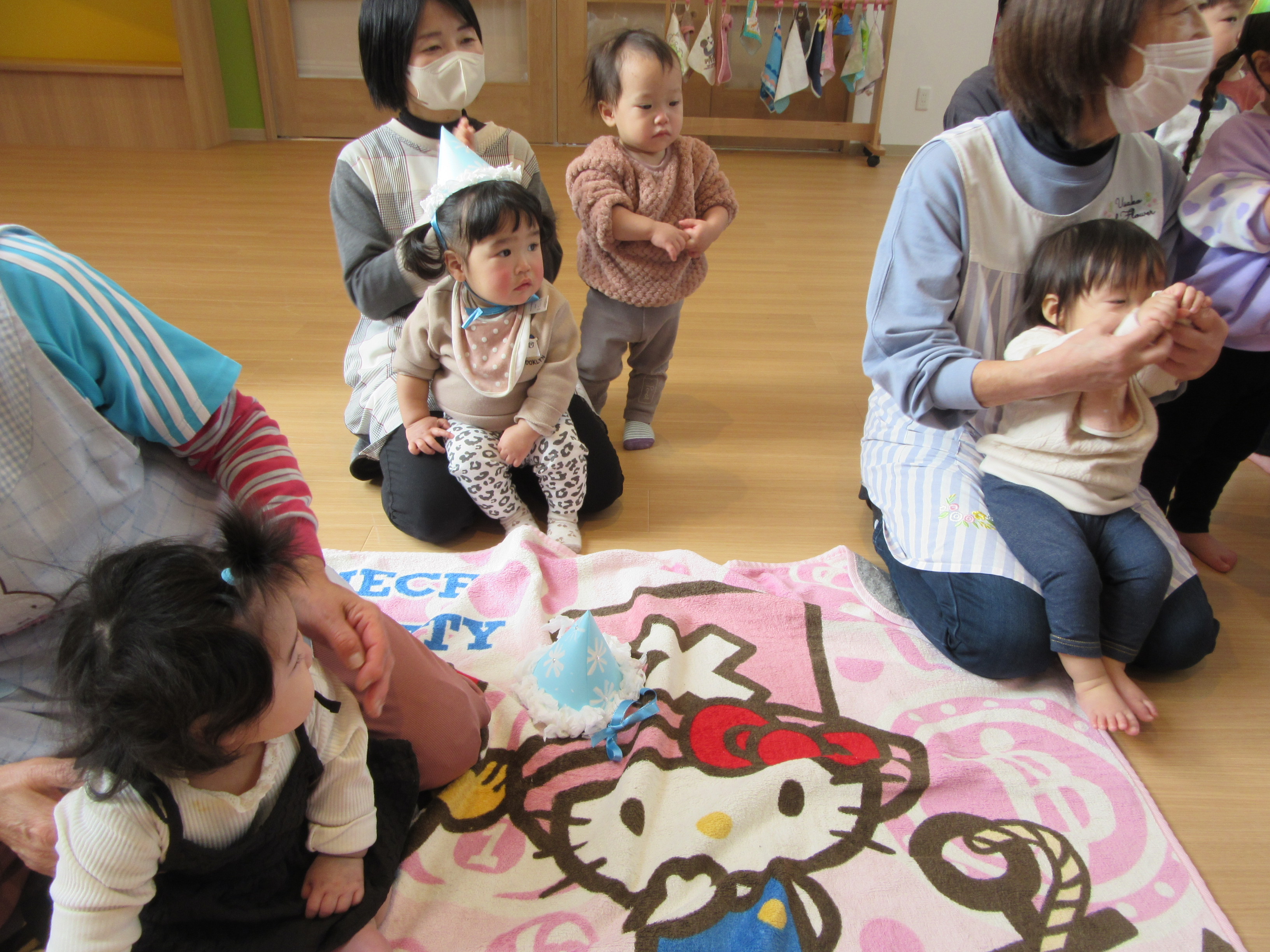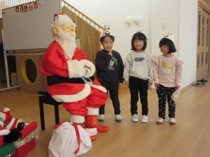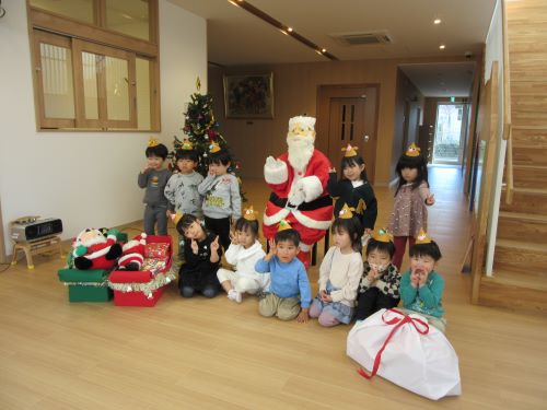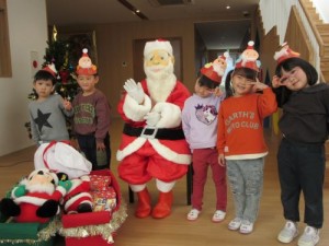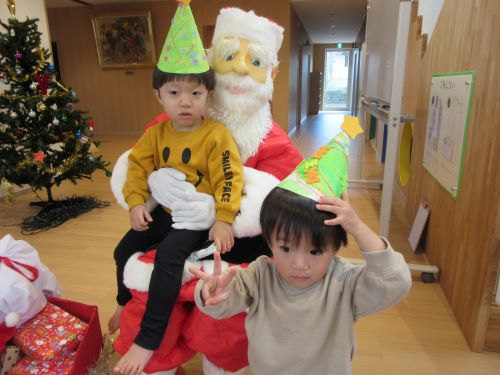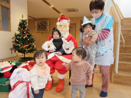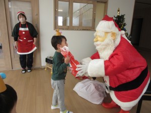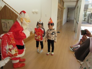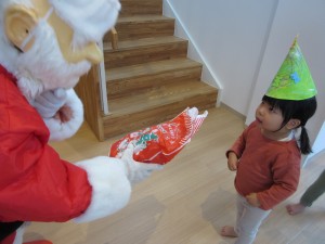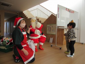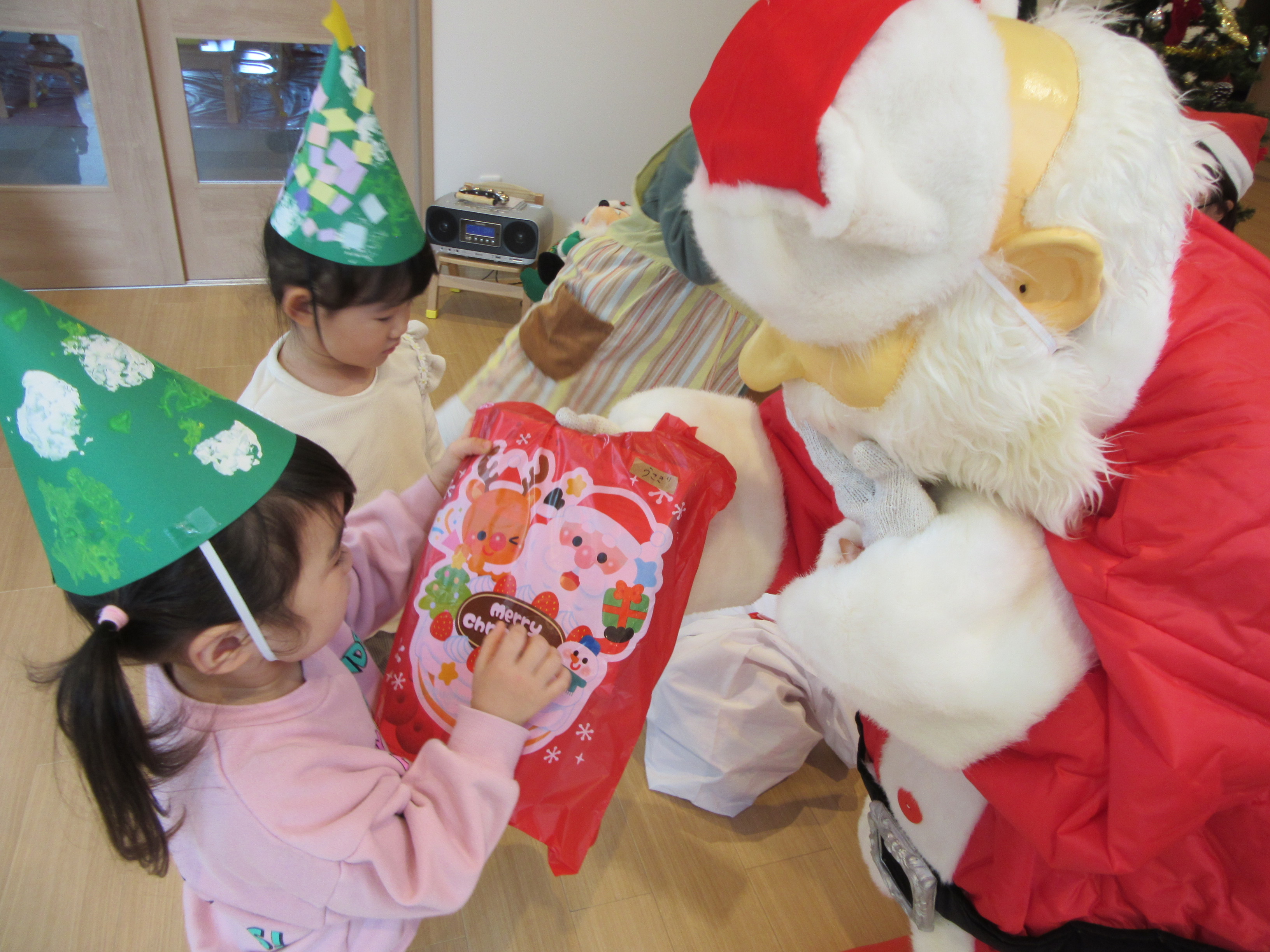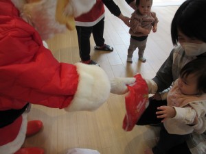 乳児さんはサンタさんに少しドキドキでしたが、しっかりプレゼントをもらい、ハイタッチ!!