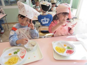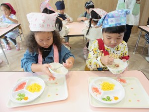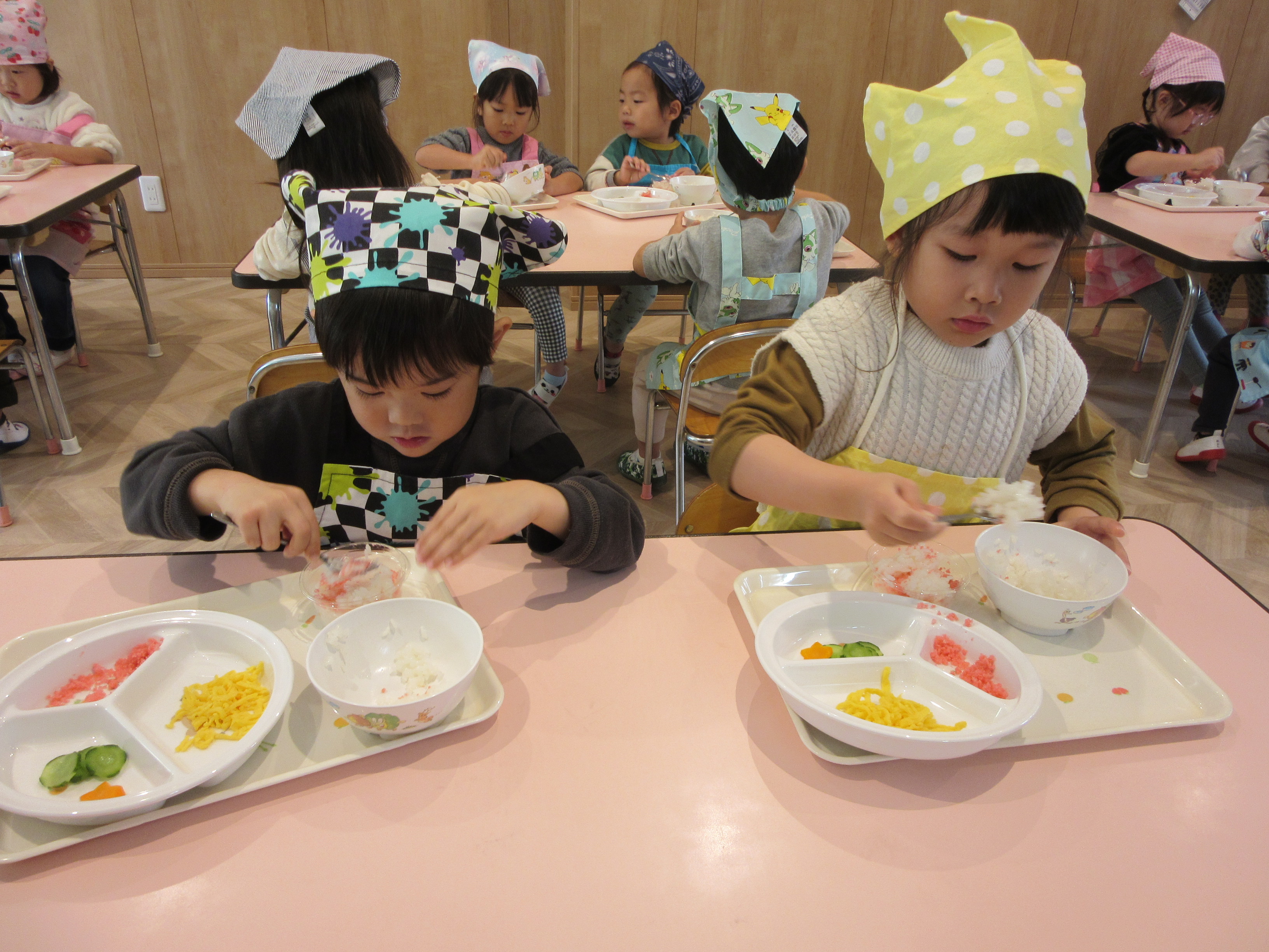 カップ寿司クッキング(11月28日実施)2024年12月27日大好きなお寿司を作りました☆ 酢飯、えびおぼろ、酢飯の順に入れて、層になるようにカップに入れていきます。 一番上には、えびおぼろ、錦糸卵、きゅうり、型抜きにんじんを自分の好きなところへ盛り付けて、一人ひとりちがった、みんなかわいいカップ寿司が完成しました♡ 自分でできたうれしい気持ちとみんなで食べる楽しい気持ちいっぱいの、食事の時間になりました!! とてもおいしかったです♬ 施設情報愛媛県新居浜市にある児童福祉施設中萩保育園あいさつのできる子 つよい体のやさしい子 話の聞ける子 自分で考えできる子児童福祉施設 中萩保育園〒792-0045愛媛県新居浜市中萩町8番1号TEL:0897-41-7233 FAX:0897-41-7209中萩保育園WEBサイト最近の記事2025年9月25日敬老の日 はがき作り児童福祉施設 中萩保育園2025年9月25日誕生会(9月5日実施)児童福祉施設 中萩保育園2025年8月25日防災集会(8月21日実施)児童福祉施設 中萩保育園2025年8月25日プール大会(8月6日実施)児童福祉施設 中萩保育園2025年8月25日誕生会(8月1日実施)児童福祉施設 中萩保育園2025年7月31日アイス屋さんごっこ(7月22日実施)児童福祉施設 中萩保育園中萩保育園の記事一覧
