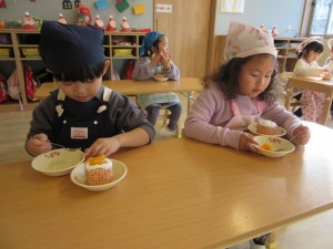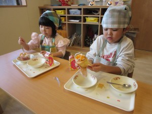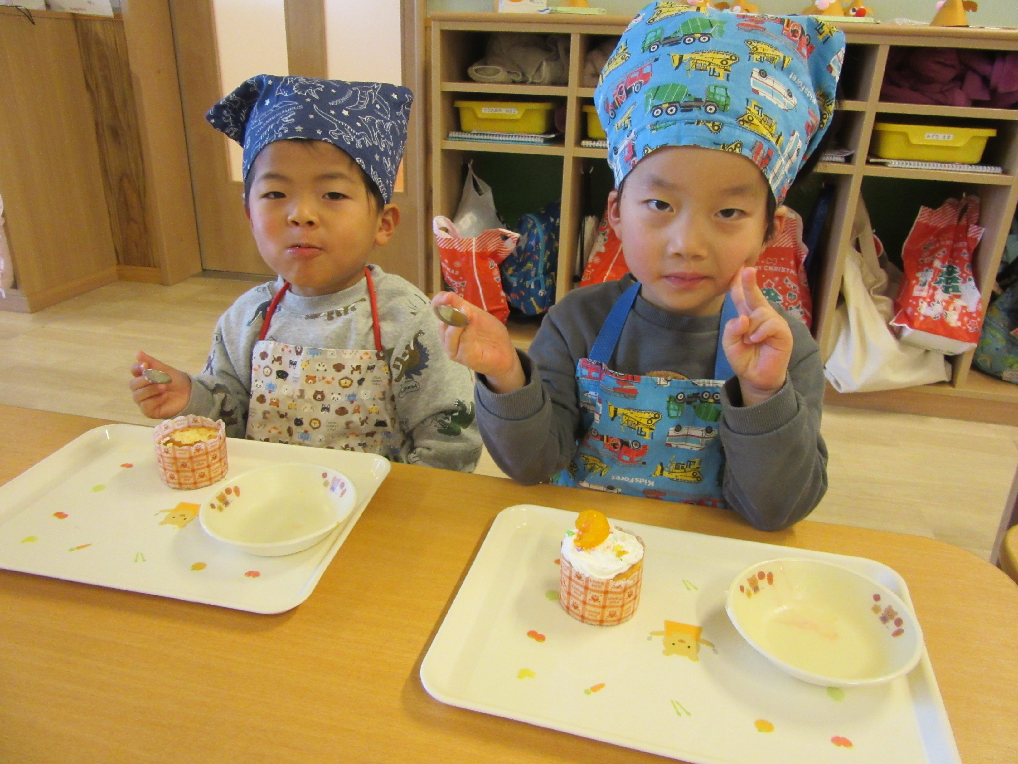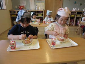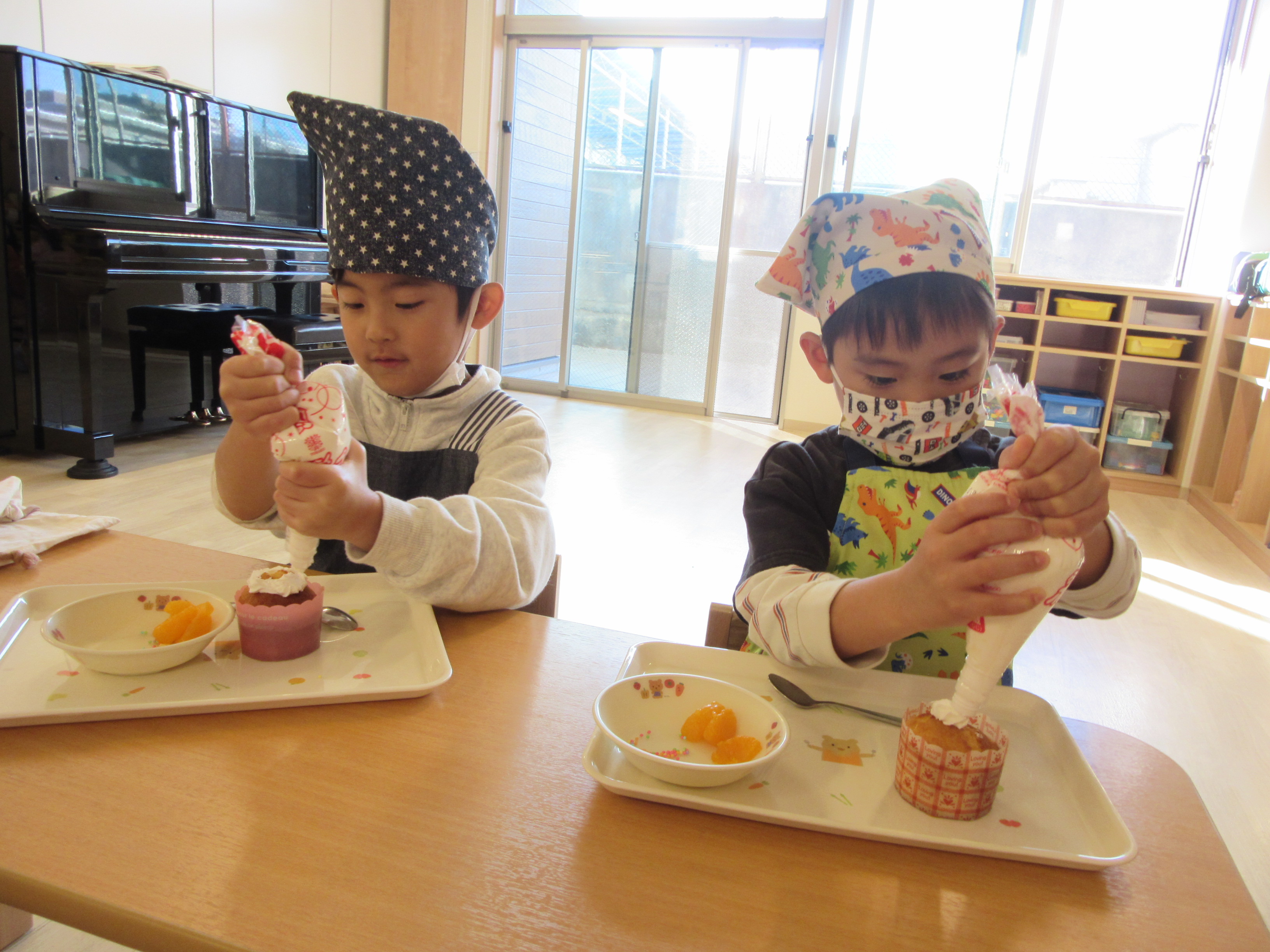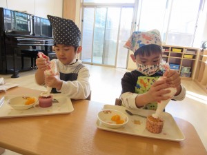 クリスマスの雰囲気の中で、おやつのカップケーキの飾りつけをしました☆