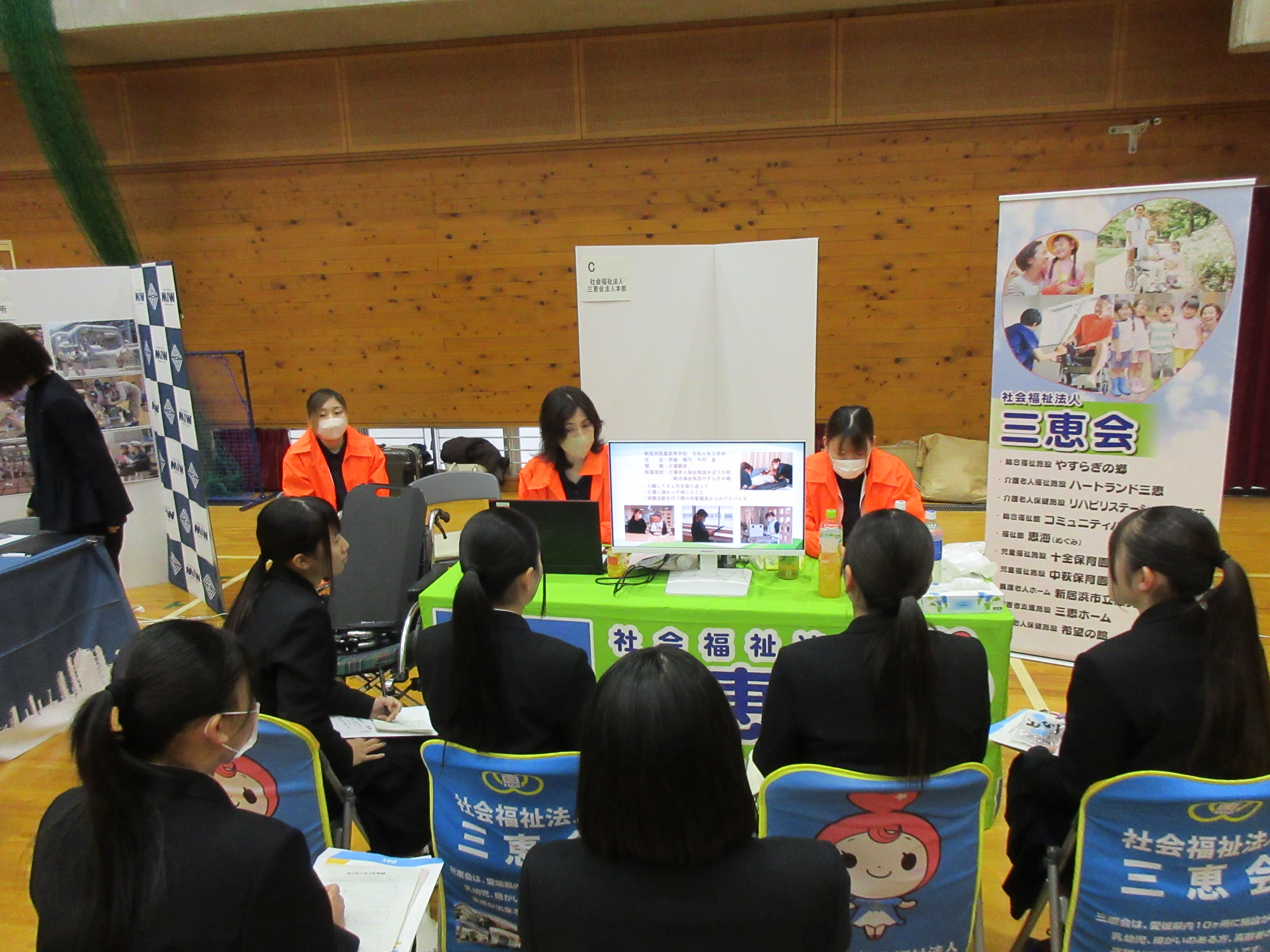 新居浜商業高等学校ワークショップに参加しました!!2024年12月19日12月18日(水) 新居浜商業高等学校で開催されたワークショップ に参加しました。 三恵会及び介護の仕事についての説明、新居浜商業高等学校を卒業し、三恵会に就職した介護職員から の話、抱えない介護体験、トロミをつけた飲み物の試飲体験を行いました。 【抱えない介護体験】 【トロミをつけた飲み物の試飲体験】 生徒の皆さん、真剣に話を聞いてくださり、積極的に介護体験や試飲体験もしていただきました。 三恵会及び介護の仕事を知ってもらえる良い機会になりました! 施設情報社会福祉法人三恵会本部三恵会は、愛媛県内10ヶ所に施設があり、乳幼児から障がいのある方、高齢者までの支援が出来る社会福祉法人です。社会福祉法人三恵会本部住所:〒792-0035 愛媛県新居浜市西の土居町2-8-12TEL(0897)31-1775 FAX(0897)31-1778三恵会本部WEBサイト最近の記事2025年10月9日「介護就職デイ」に出展します社会福祉法人 三恵会本部2025年10月7日【ひめボスNAVI】に掲載されました!社会福祉法人 三恵会本部2025年10月6日秋の採用試験情報(保育士・介護職員・生活支援員)社会福祉法人 三恵会本部2025年10月6日三恵会オリジナルキャラクター『めぐりん』です!!社会福祉法人 三恵会本部2025年10月1日児童福祉施設十全保育園大規模改修工事に係る一般競争入札のご案内社会福祉法人 三恵会本部2025年9月16日東予おしごと体験フェス2025社会福祉法人 三恵会本部三恵会本部の記事一覧