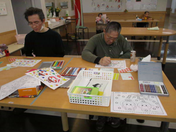 屋外の活動は難しいので、今日は塗り絵を行いました。