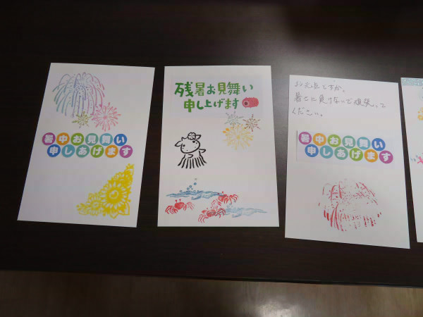7/11 作品制作(3階)2025年7月12日 ~暑中見舞いのハガキを書こう~ 家族に、友人に、大好きなあの人に暑中見舞いのハガキを書きました。 スタンプを押したり 楽しい時間です。 クリックすると写真が出ます。 R07.07.11 作品制作(3階) 施設情報愛媛県東温市にある障害者支援施設三恵ホーム明るく楽しく元気よくみんないきいき三恵ホーム障害者支援施設 三恵ホーム〒791-0311 愛媛県東温市則之内甲2819TEL:089-966-3555 FAX:089-966-3571三恵ホームWEBサイト最近の記事2025年10月14日10/11 外気浴(3階)障害者支援施設 三恵ホーム2025年10月14日10/10 給食(ステーキの日)障害者支援施設 三恵ホーム2025年10月10日10/10 作品制作(2階)障害者支援施設 三恵ホーム2025年10月8日10/8 カラオケ(3階)障害者支援施設 三恵ホーム2025年10月7日10/4 作品制作(2階)障害者支援施設 三恵ホーム2025年9月23日9/23 魚釣りゲーム(3階)障害者支援施設 三恵ホーム三恵ホームの記事一覧